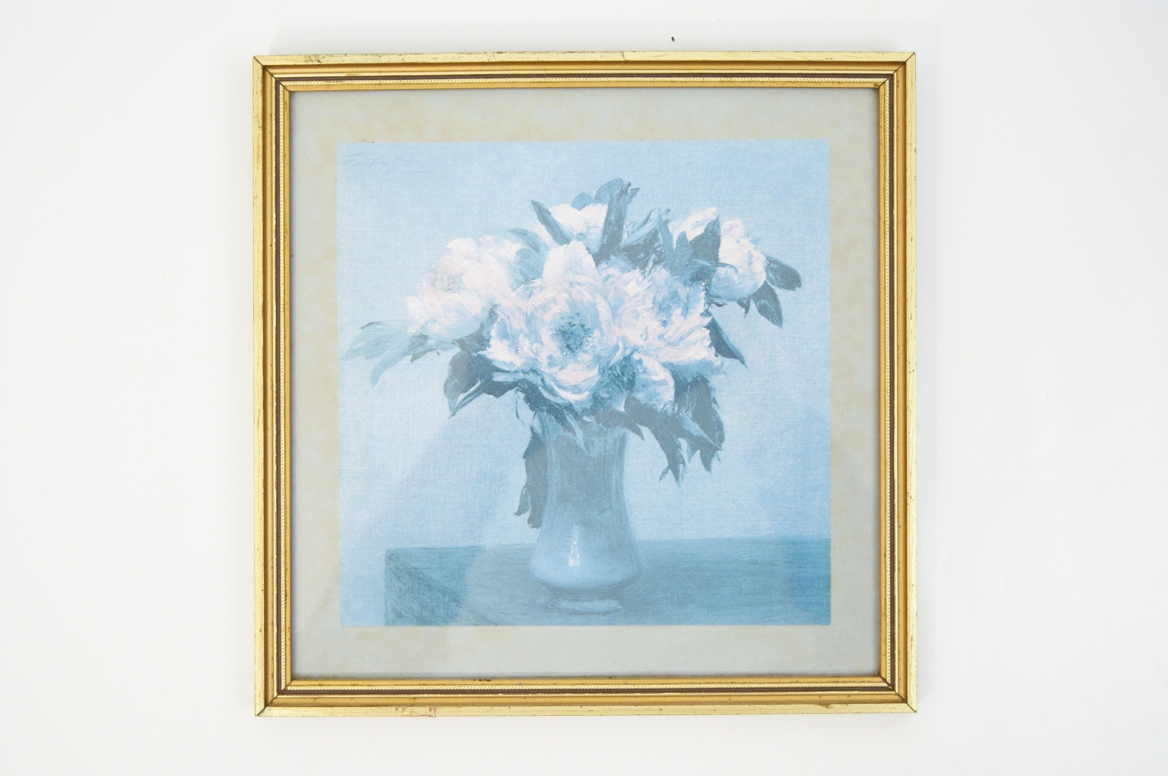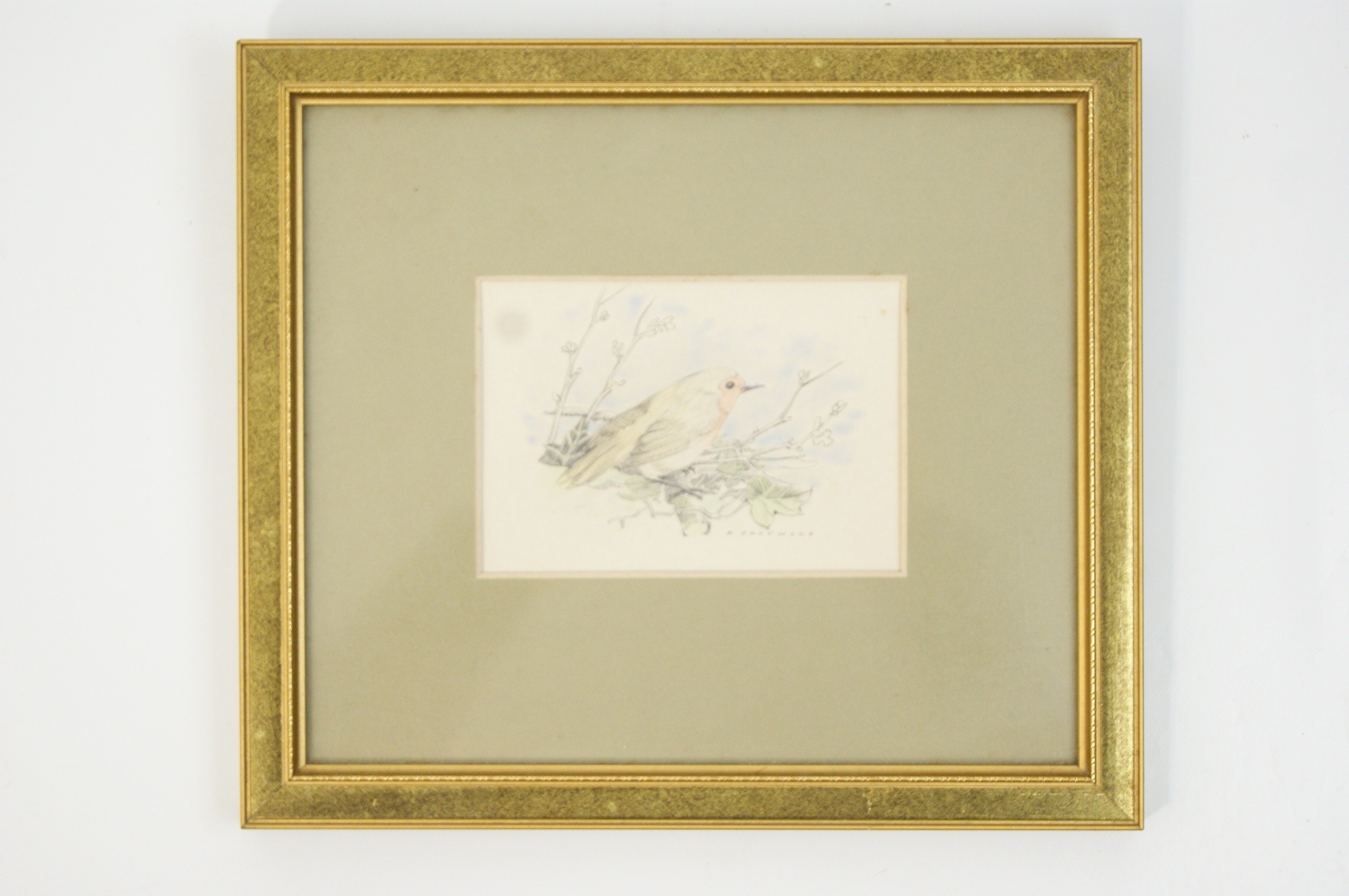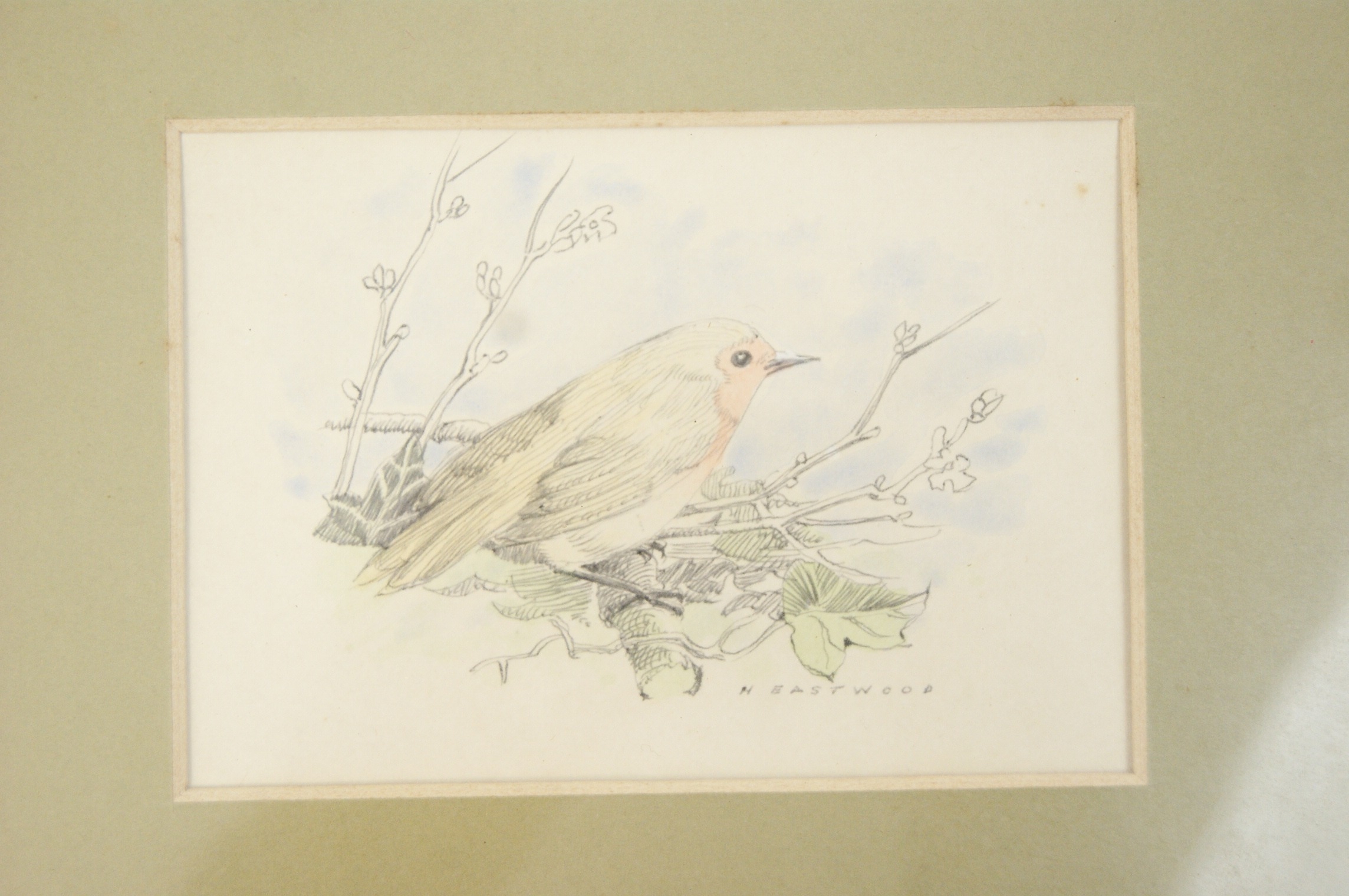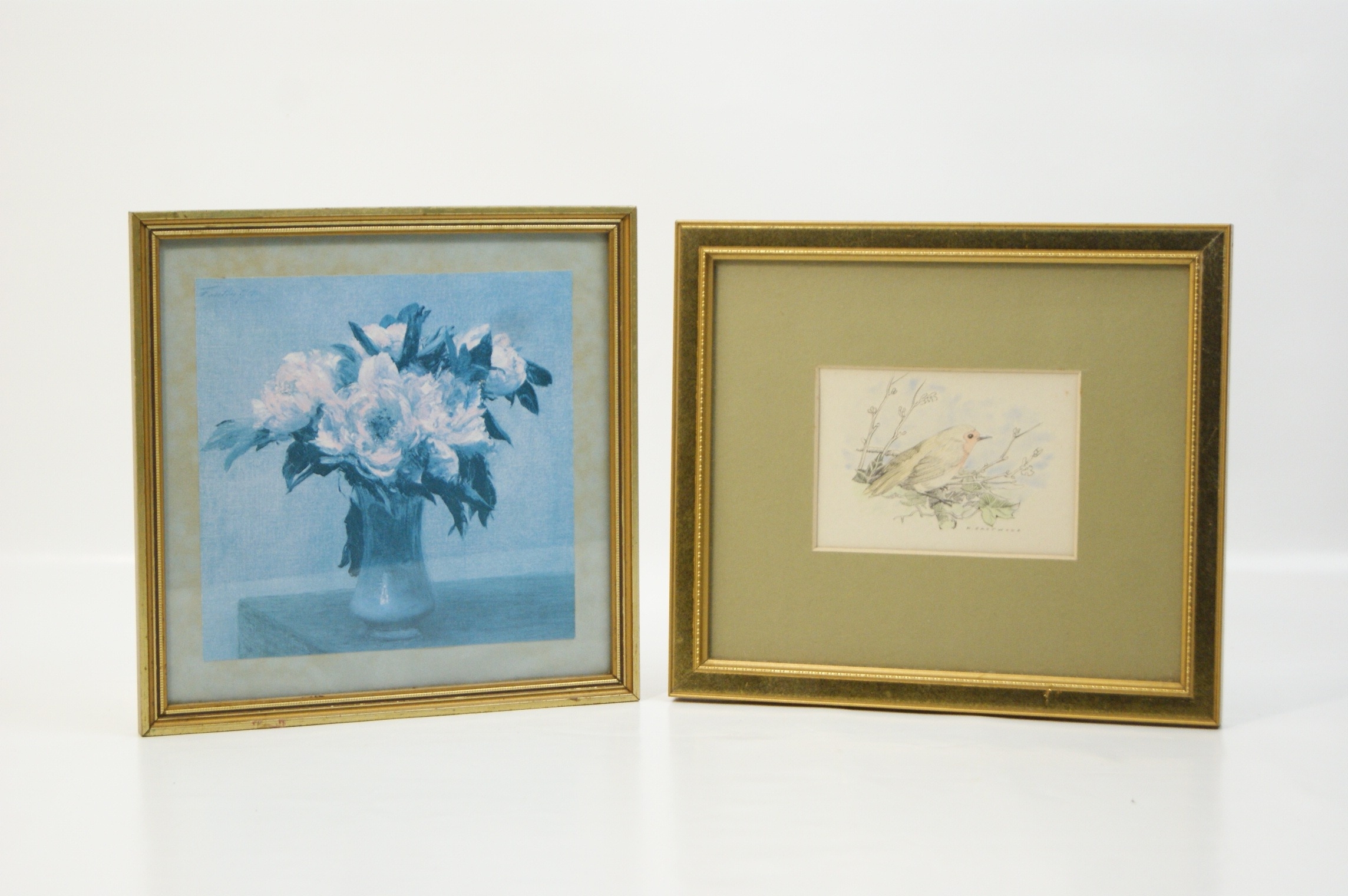 A pair of framed artworks comprising a reproduction print and an original drawing. The first work is a blue-toned reproduction print after Henri Fantin-Latour (French, 1836-1904) titled ‘Pivoines’, depicting white peonies in a glass vase. The work bears the printed mark ‘Fantin .74’ in the upper left corner. The verso of the frame features a large biographical label for Henri Fantin-Latour, providing details of the artist’s life and the original work’s provenance. The second work is a pencil and watercolour drawing on paper by H. Eastwood, depicting a robin perched on a branch. This work is signed ‘H EASTWOOD’ in the lower right. Both items are housed in matching decorative gilt frames with beaded inner borders. The floral print is presented with a light-coloured mount, while the bird study is set within a wide olive-green mount. The bird study has a plain backing with a hanging cord.