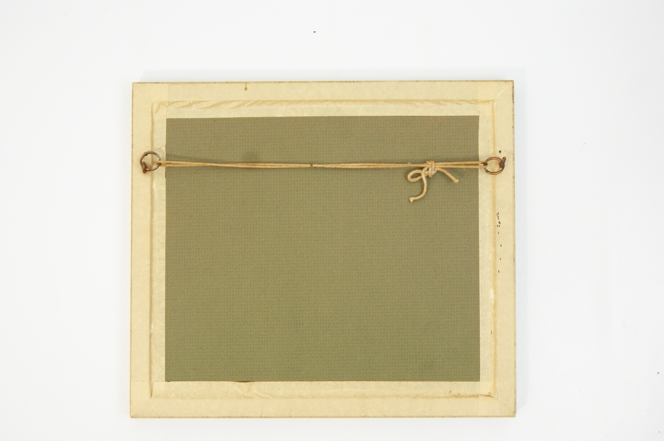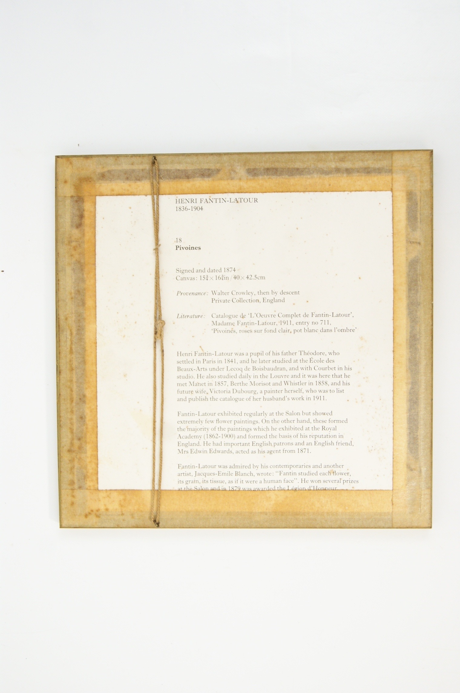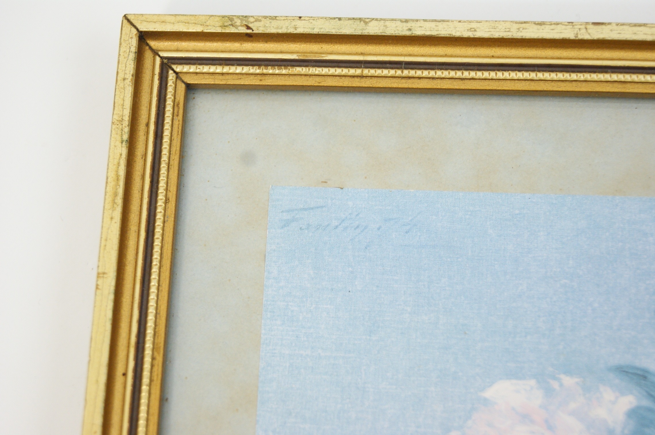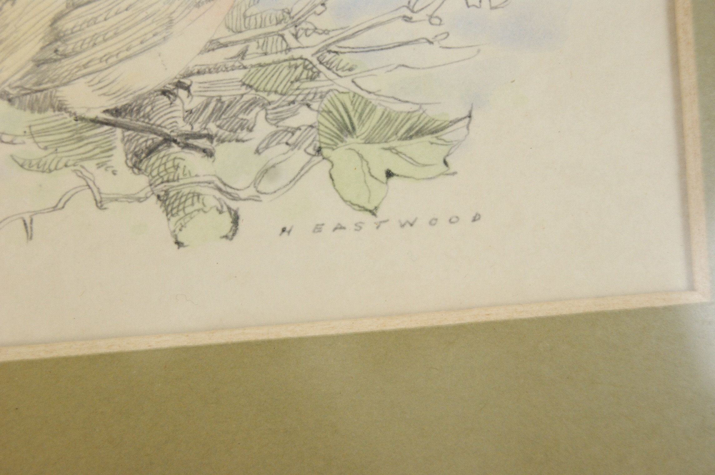 A pair of framed artworks comprising a reproduction print and an original drawing. The first work is a blue-toned reproduction print after Henri Fantin-Latour (French, 1836-1904) titled ‘Pivoines’, depicting white peonies in a glass vase. The work bears the printed mark ‘Fantin .74’ in the upper left corner. The verso of the frame features a large biographical label for Henri Fantin-Latour, providing details of the artist’s life and the original work’s provenance. The second work is a pencil and watercolour drawing on paper by H. Eastwood, depicting a robin perched on a branch. This work is signed ‘H EASTWOOD’ in the lower right. Both items are housed in matching decorative gilt frames with beaded inner borders. The floral print is presented with a light-coloured mount, while the bird study is set within a wide olive-green mount. The bird study has a plain backing with a hanging cord.