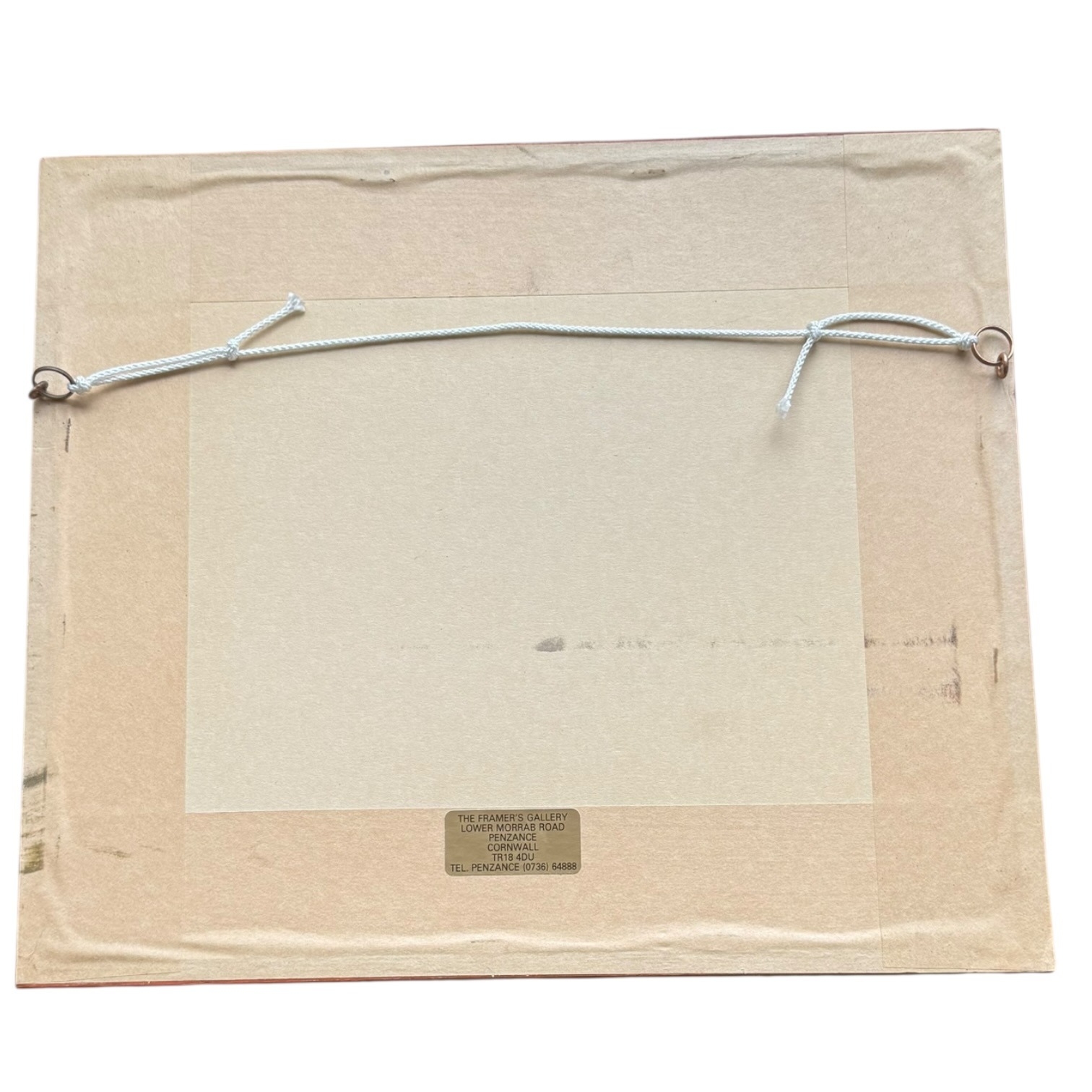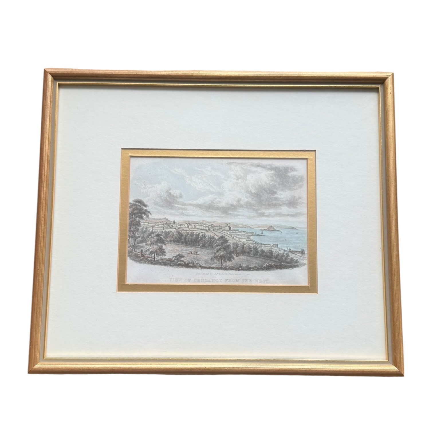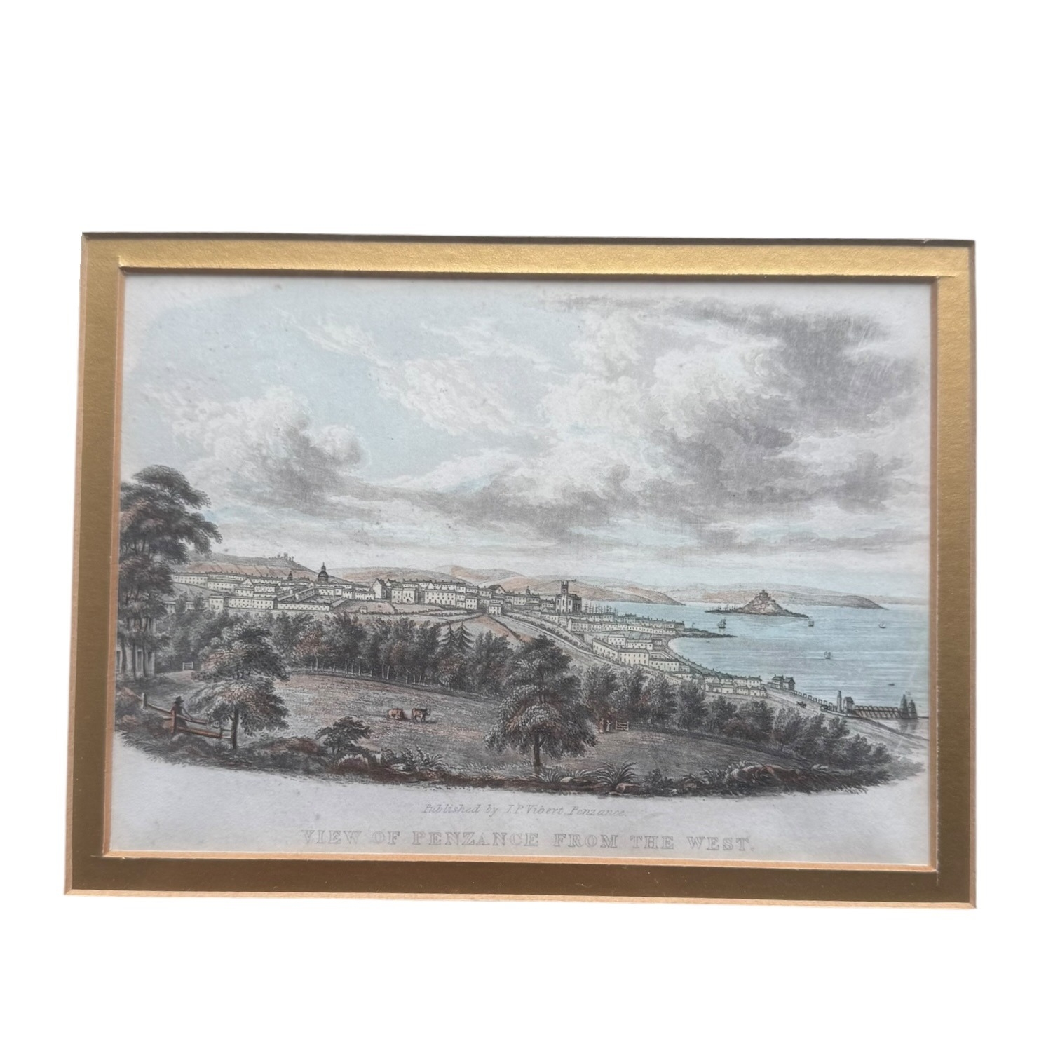 This framed likely antique topographical print depicts a panoramic landscape titled VIEW OF PENZANCE FROM THE WEST. The hand-coloured scene captures the Cornish coastal town from an elevated westerly vantage point, featuring rural fields with livestock in the foreground and St Michael’s Mount in the distance. Text along the lower margin indicates the work was Published by J.P. Vibert, Penzance. The print is presented in a modern gilt-finished frame with a wide, double-layered mount under glass. The reverse is sealed with a gallery label from The Framer’s Gallery, Penzance and is fitted with a cord for hanging.