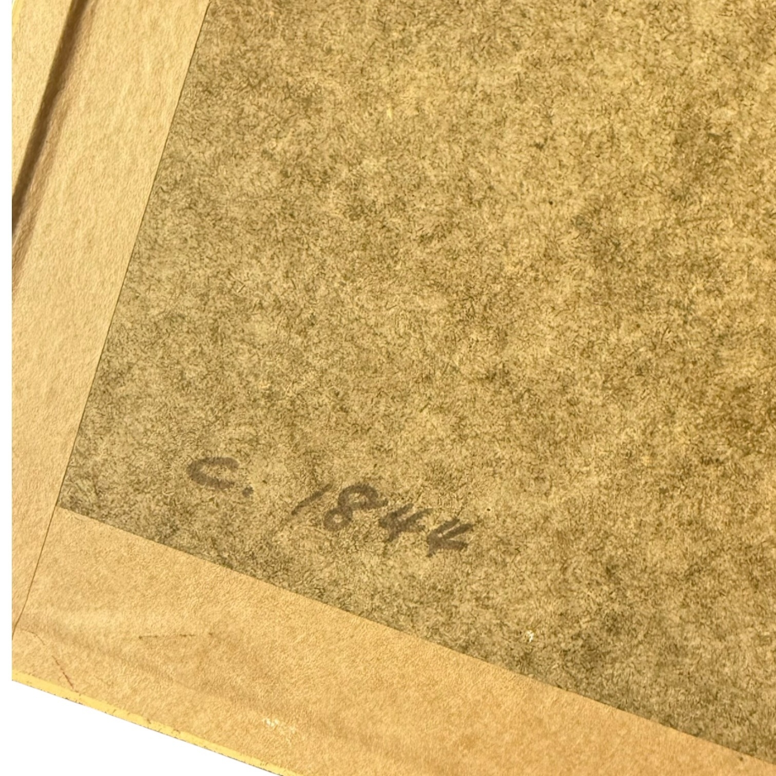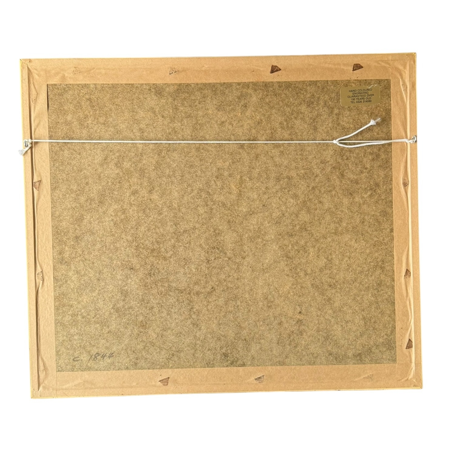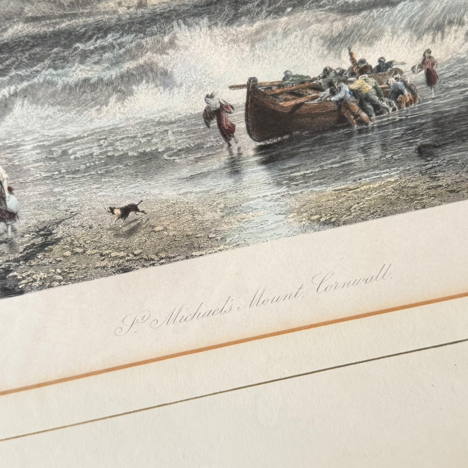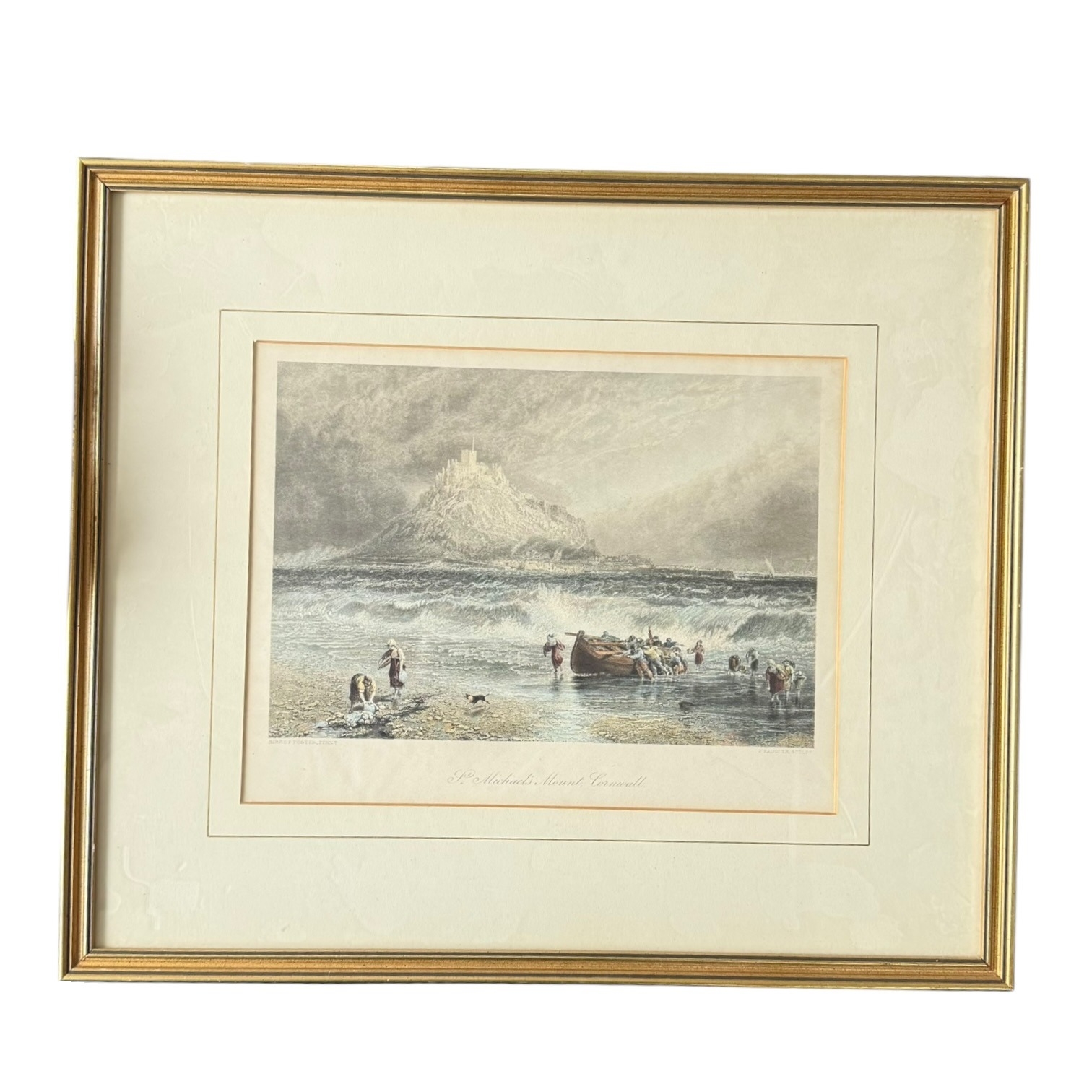 A 19th-century hand-coloured engraving titled St Michael’s Mount, Cornwall. The work is after an original by Birket Foster (pinxt) and was engraved by J. Saddler (sculp). The scene depicts a coastal landscape with several figures and a dog on a shore, assisting a boat through crashing waves, with the historic landmark of St Michael’s Mount visible in the background. The print is housed in a gold-toned frame with an off-white textured mat. The reverse of the frame features a handwritten date of c. 1844 and a gold dealer label stating the item is a hand-coloured engraving guaranteed to be over 100 years old.