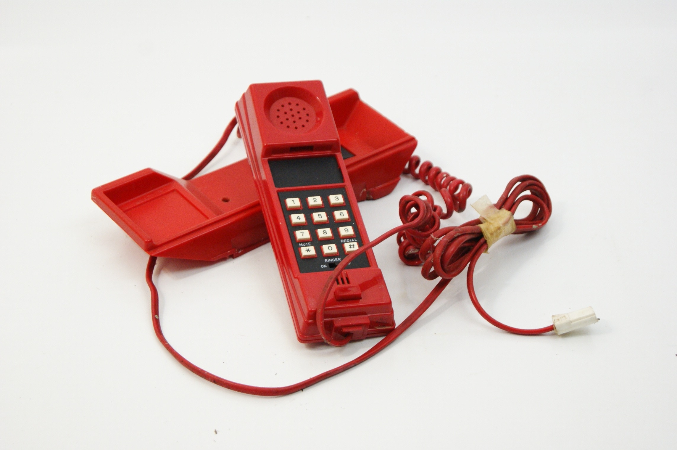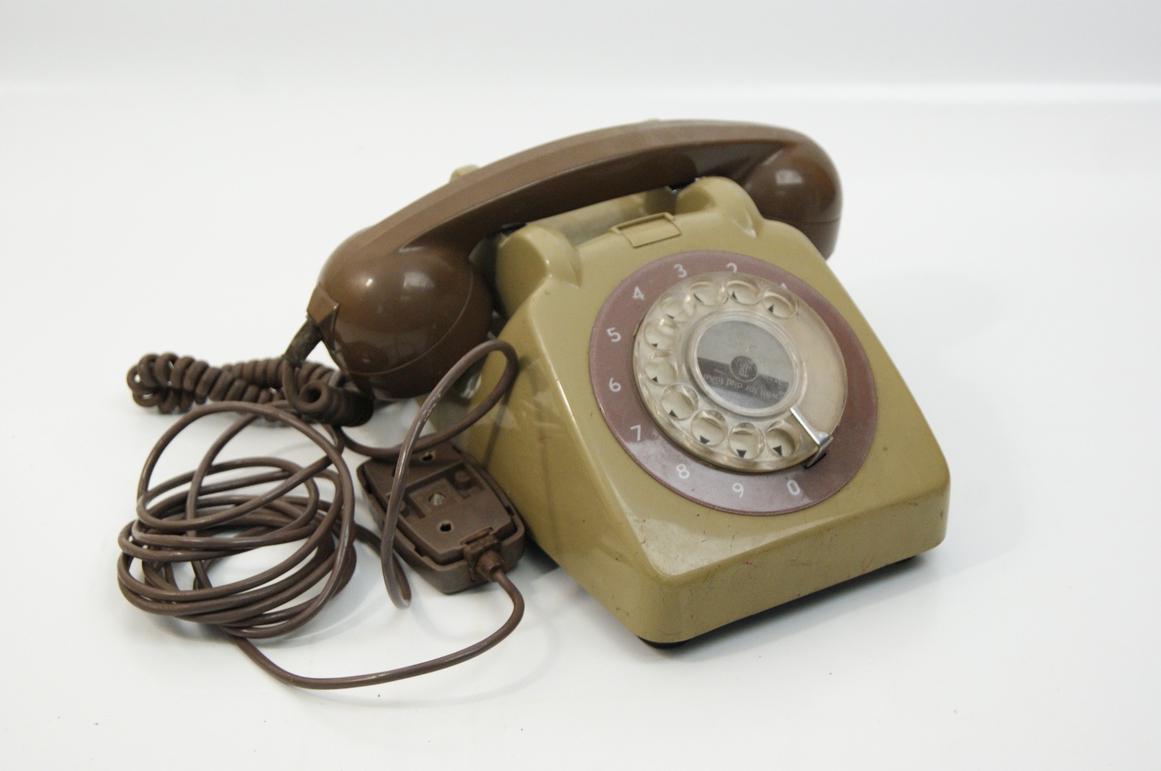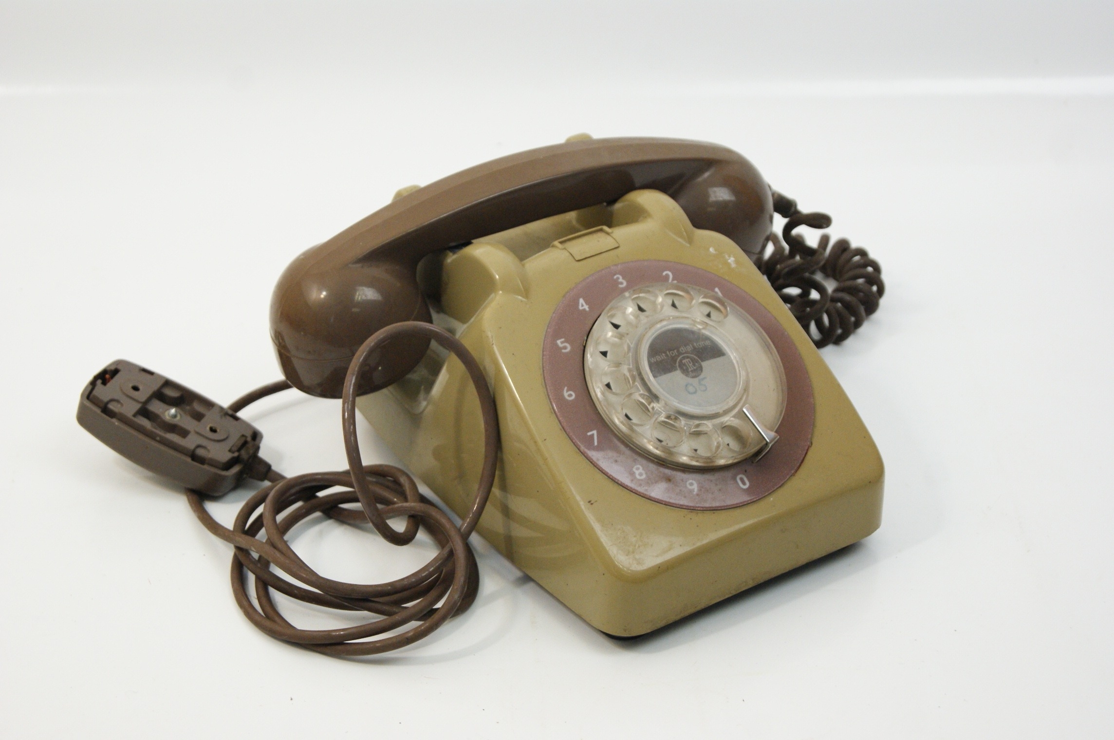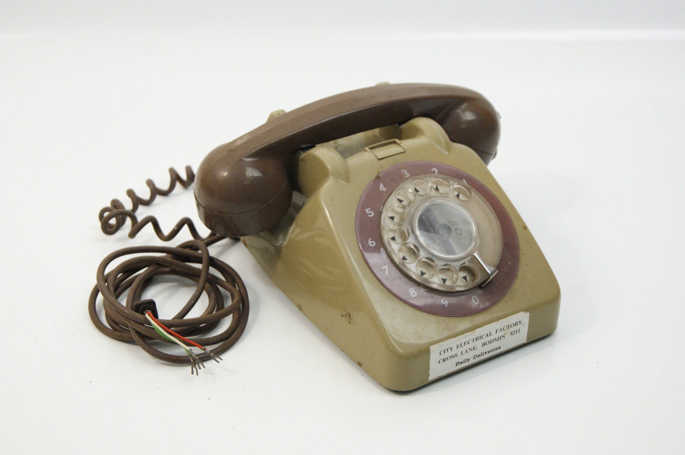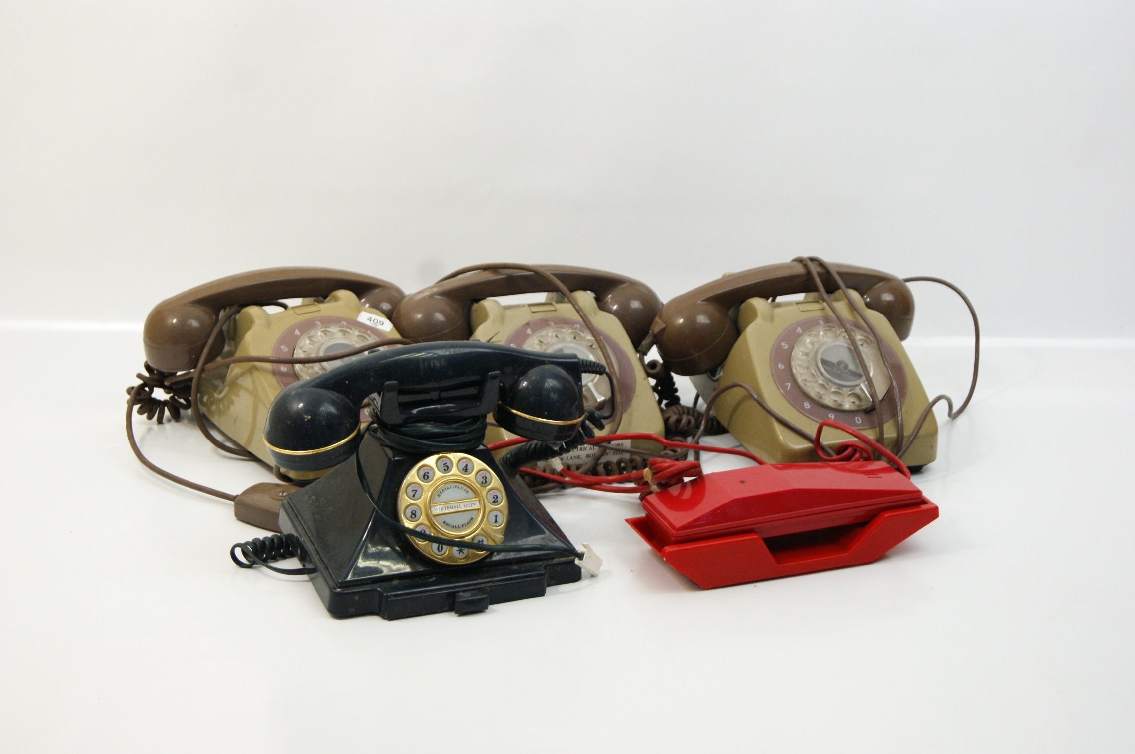 A collection of telephones comprising rotary dial models in the GPO 746 style, a reproduction pyramid style rotary telephone, and a modern push button telephone. The GPO style units feature two-tone beige and stone coloured bodies with chocolate brown handsets and coiled cords. One unit bears a paper label for City Electrical Factors, Cross Lane, Bodmin, with the telephone number 5211. The dial centres of these units contain various markings including the numbers 06 and 05. The reproduction pyramid telephone is finished in black with gold tone accents to the handset and dial; the dial face includes the text Whitehall 1212 and modern characters and functions such as redial, pause, and recall. The collection also includes a red corded telephone with a rectangular numeric keypad and additional function buttons for mute and redial. All units are equipped with various telephone line cords and plugs, including standard British types.