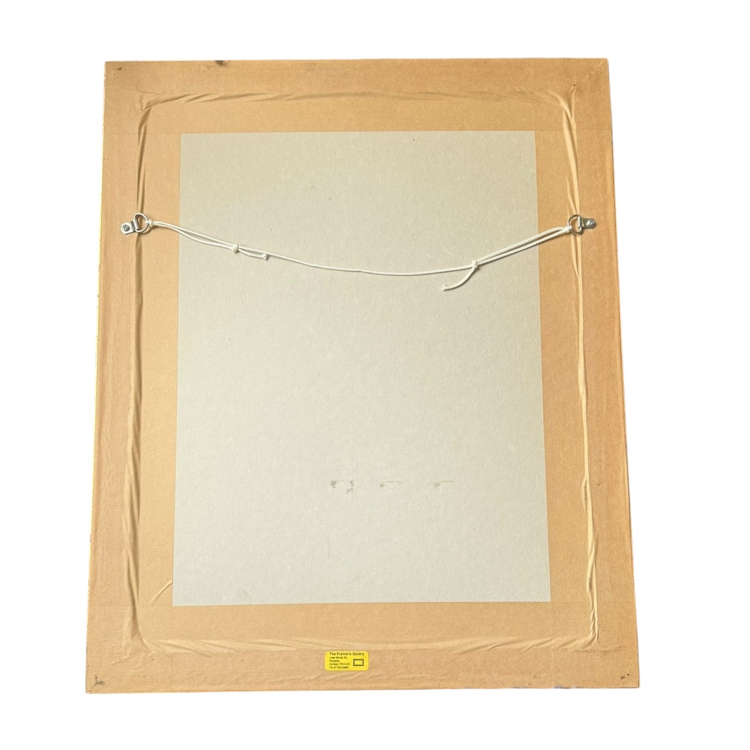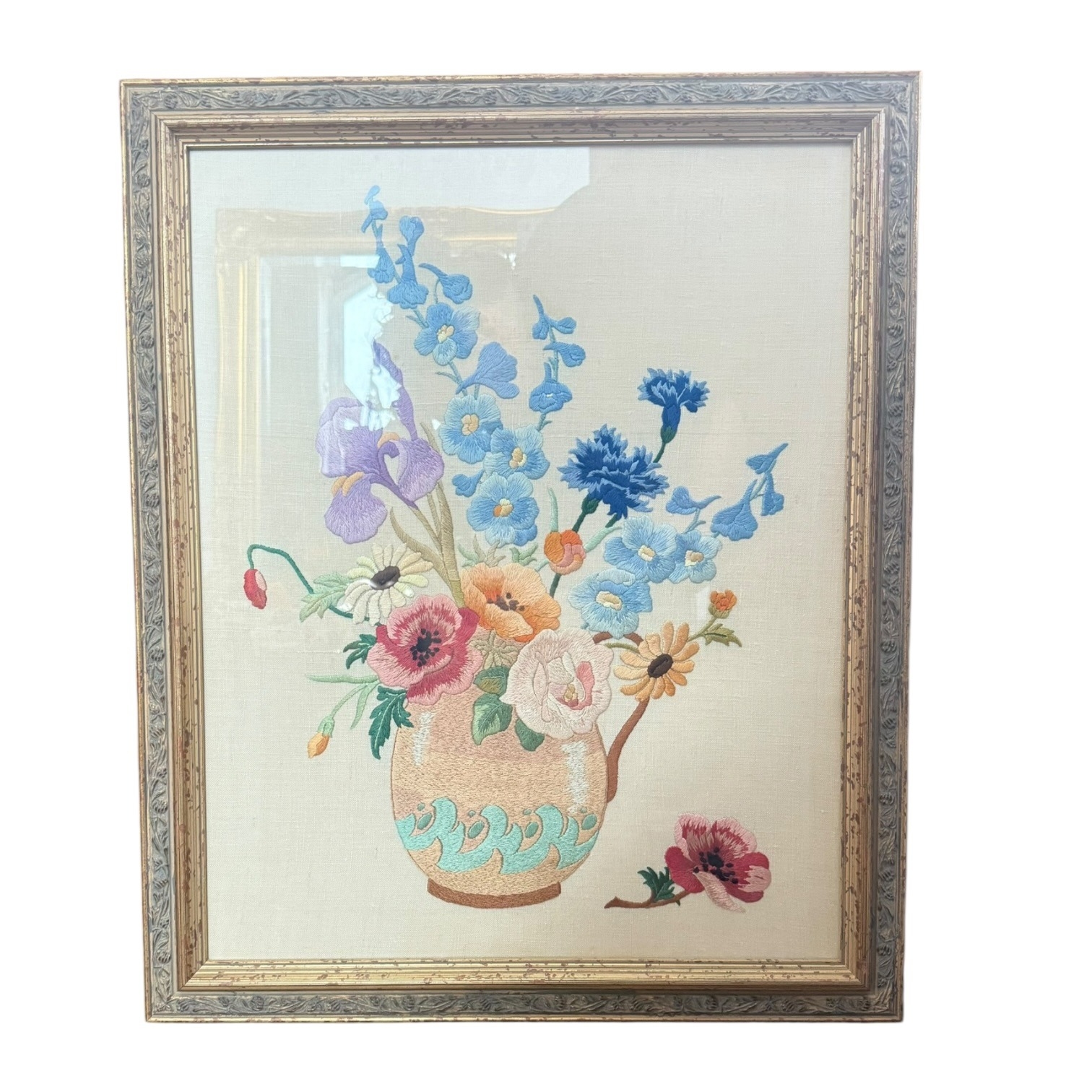 A framed needlework embroidery depicting a floral still life. The composition features a variety of flowers including irises, cornflowers, and poppies arranged within a vase decorated with a turquoise wave pattern. The work is executed in coloured threads on a neutral-toned fabric ground. The piece is housed under glass within a moulded rectangular frame with gilt and silver-toned finishes. The reverse is sealed with brown paper and retains a label for The Framer’s Gallery, Penzance, Cornwall.