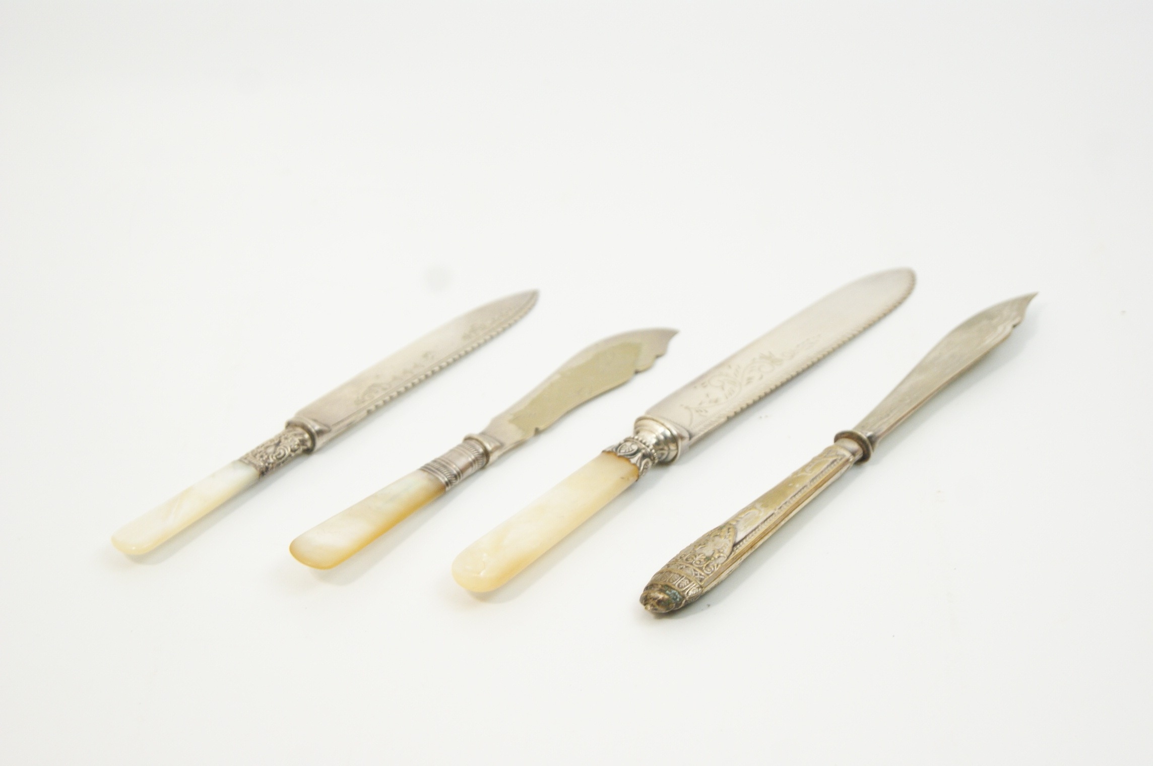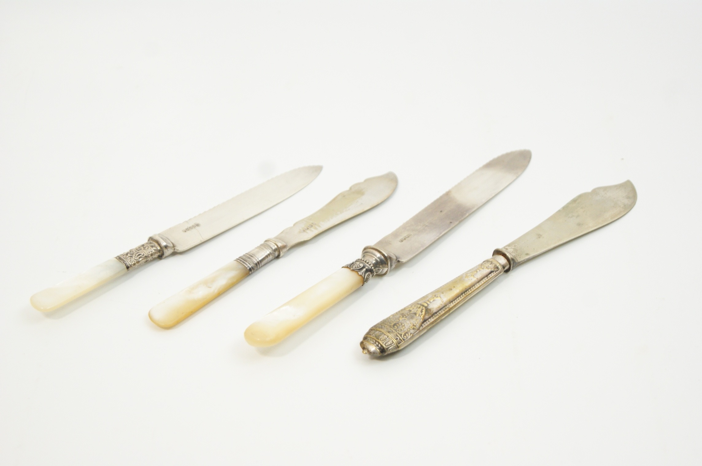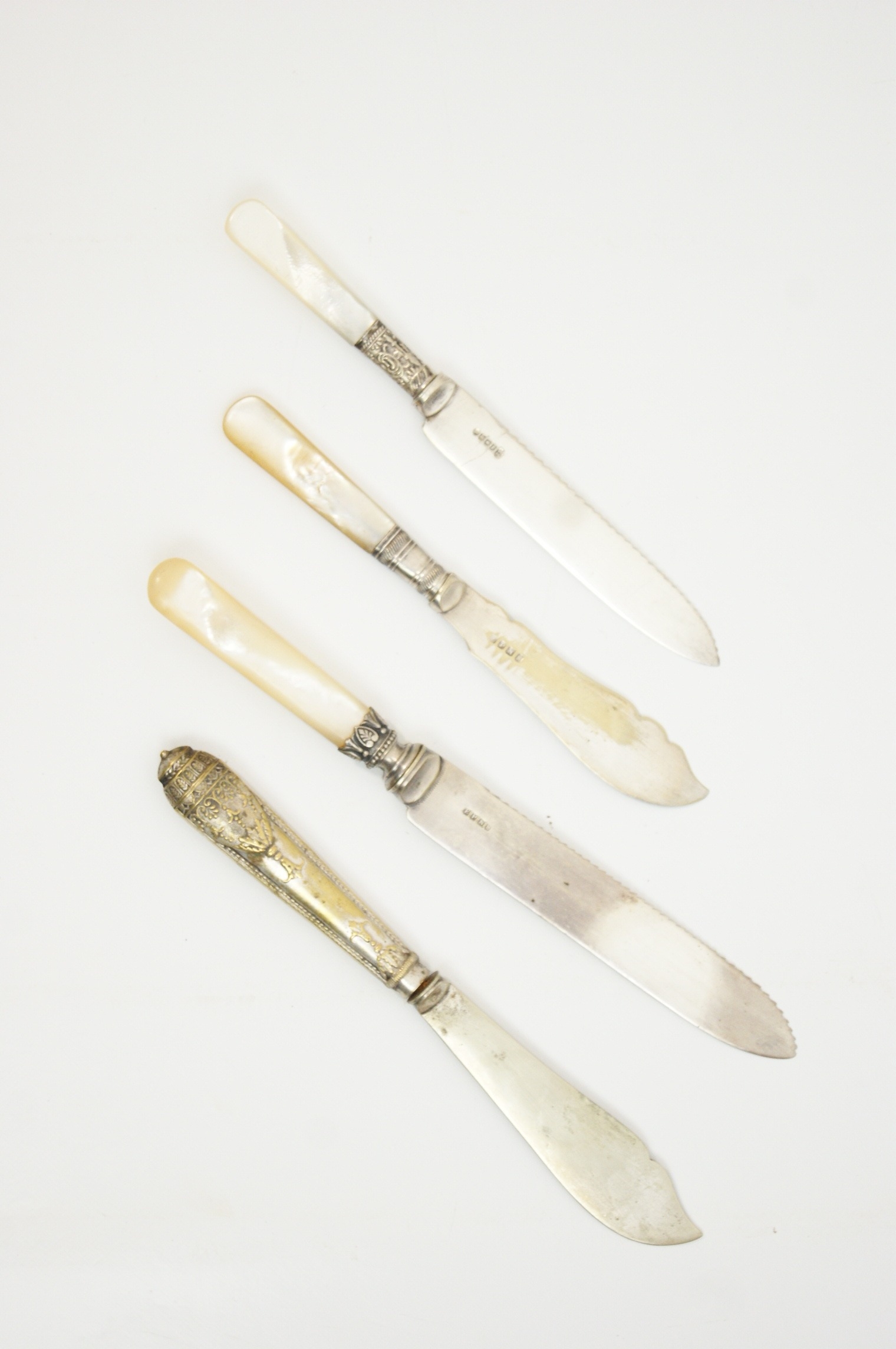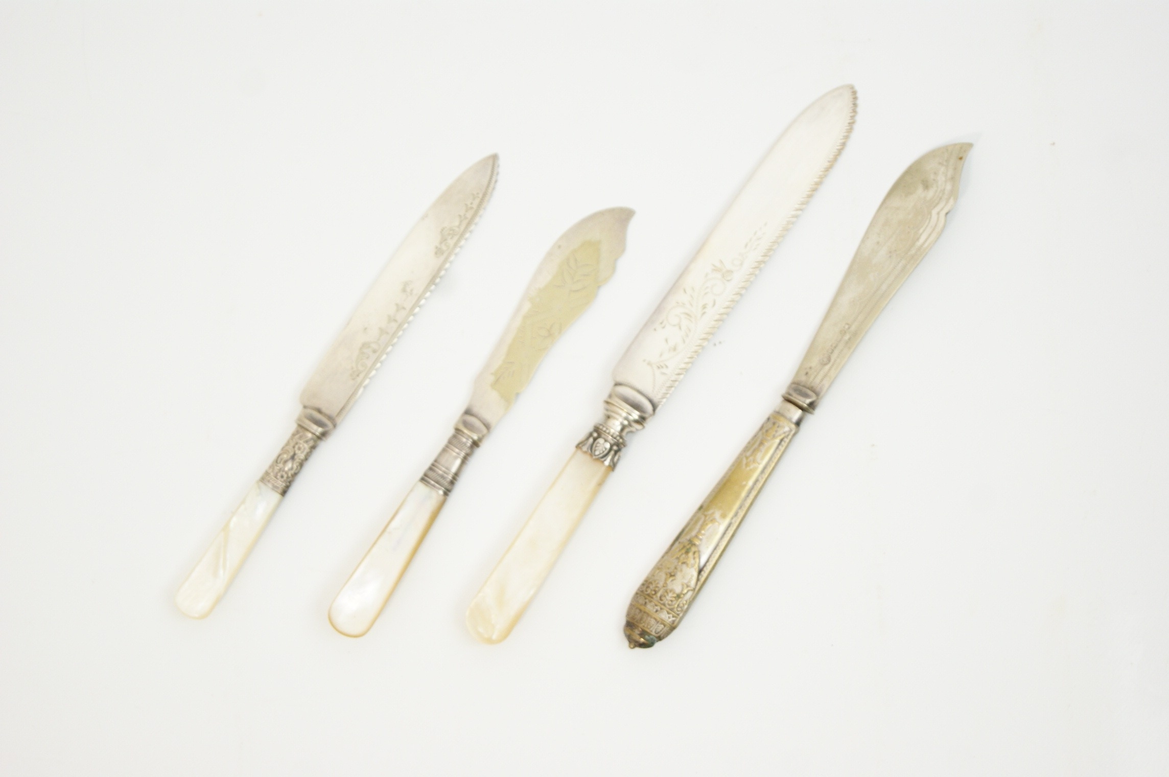 An attractive set of four antique butter and fish knives featuring elegant mother-of-pearl handles with decorative silver plated mounts and engraved blades. The knives show classic Victorian to early Edwardian styling with floral engraving, ornate collars and one particularly decorative gilt style handle.