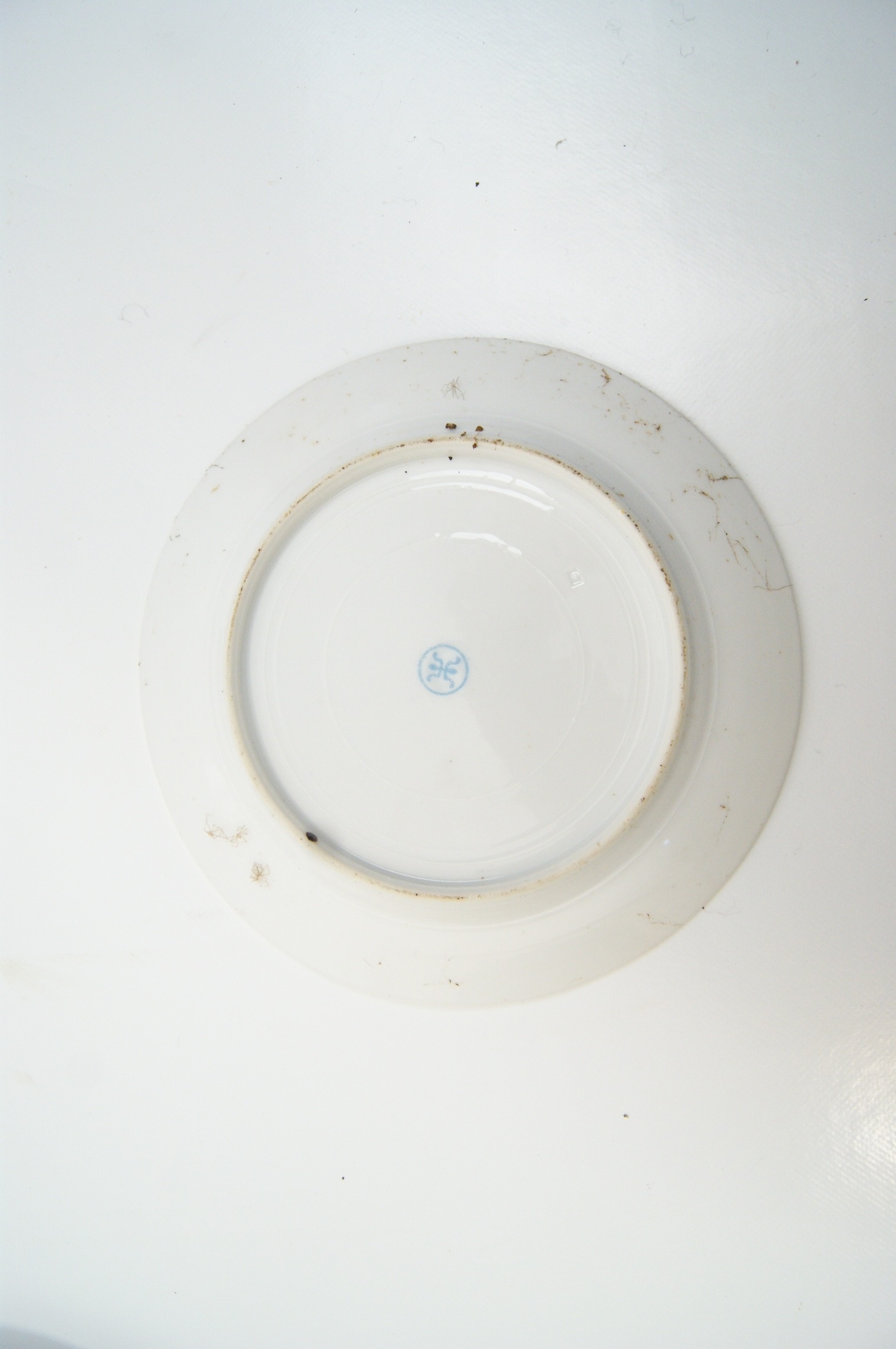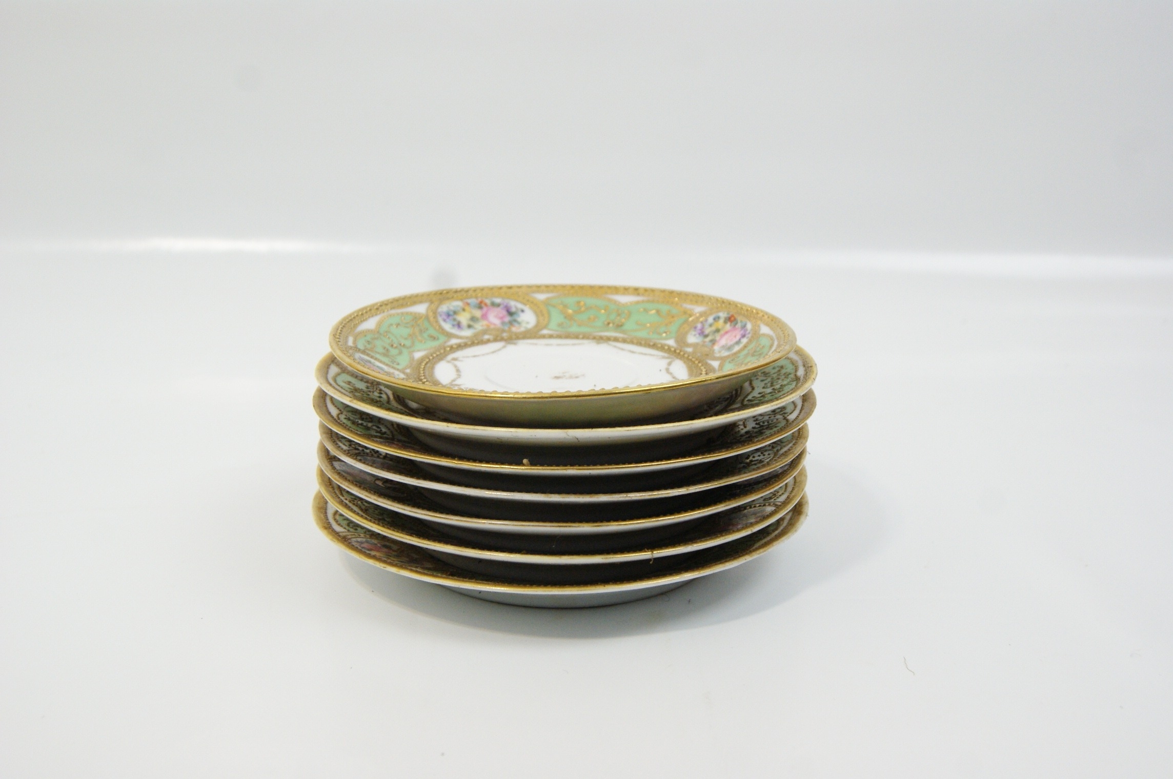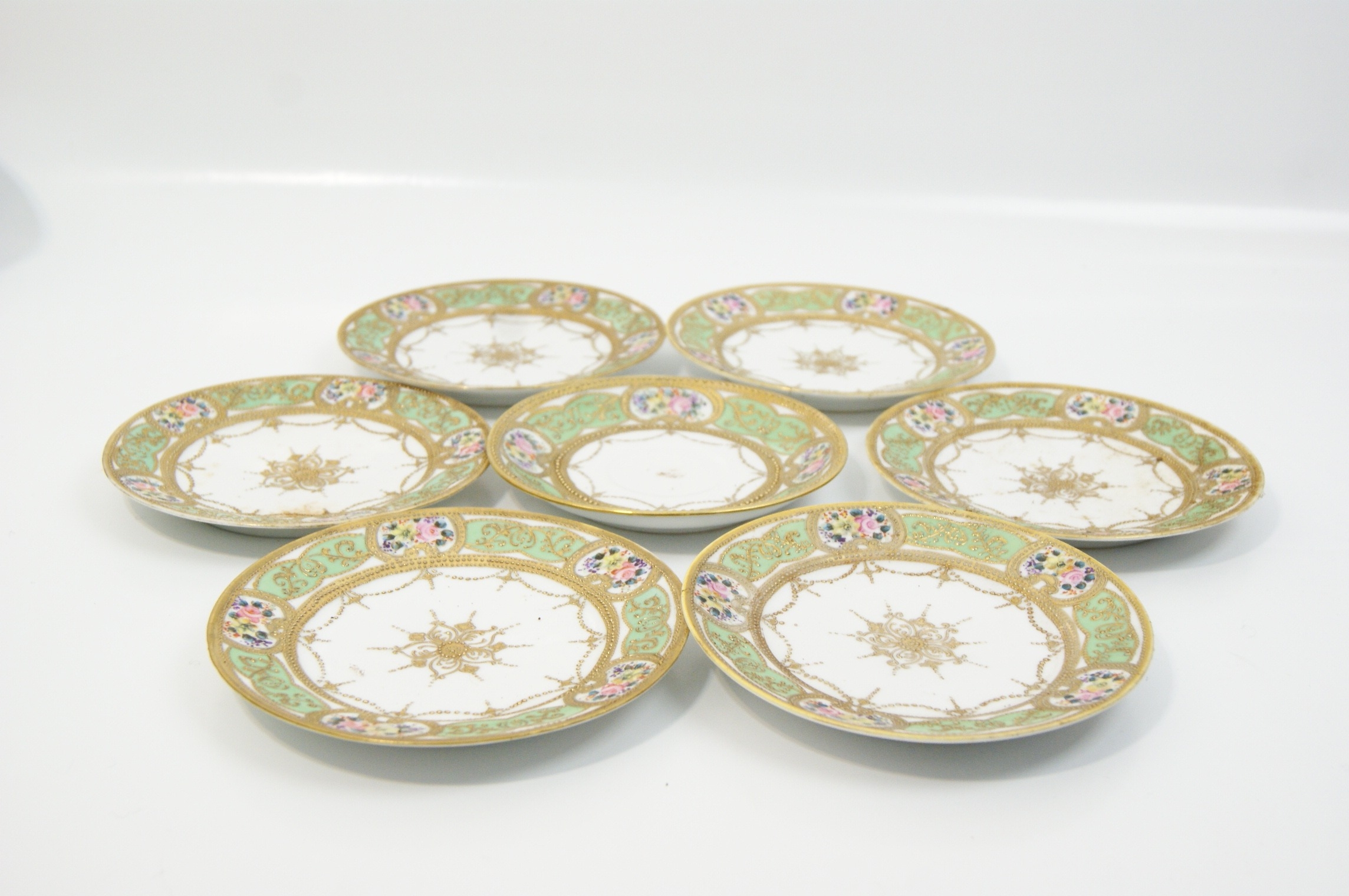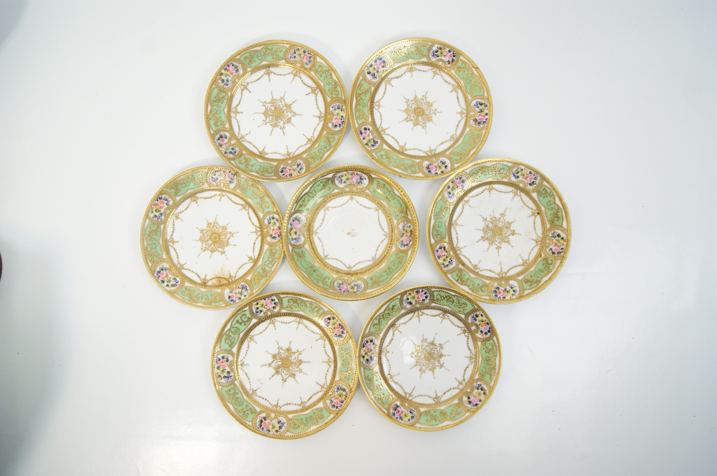 A set of seven fine porcelain plates produced by Gerard, Dufraisseix and Abbot (GDA) of Limoges, France. Each plate is decorated in a refined Neoclassical style, featuring a broad border with a pale celadon green ground, heavily embellished with raised gilded scrollwork and delicate beading. The border is punctuated by four oval cartouches, each containing a finely executed hand-painted floral bouquet including pink roses, yellow primroses, and blue forget-me-nots. The central white ground is centred with an intricate gilded starburst medallion, encircled by a delicate chain-link swag border in gold. The underside of each plate bears a blue underglaze mark with the word FRANCE curved above a circular border containing the intertwined GDA monogram. Some examples also feature a faint incised letter L. Diameter: 22 cm.