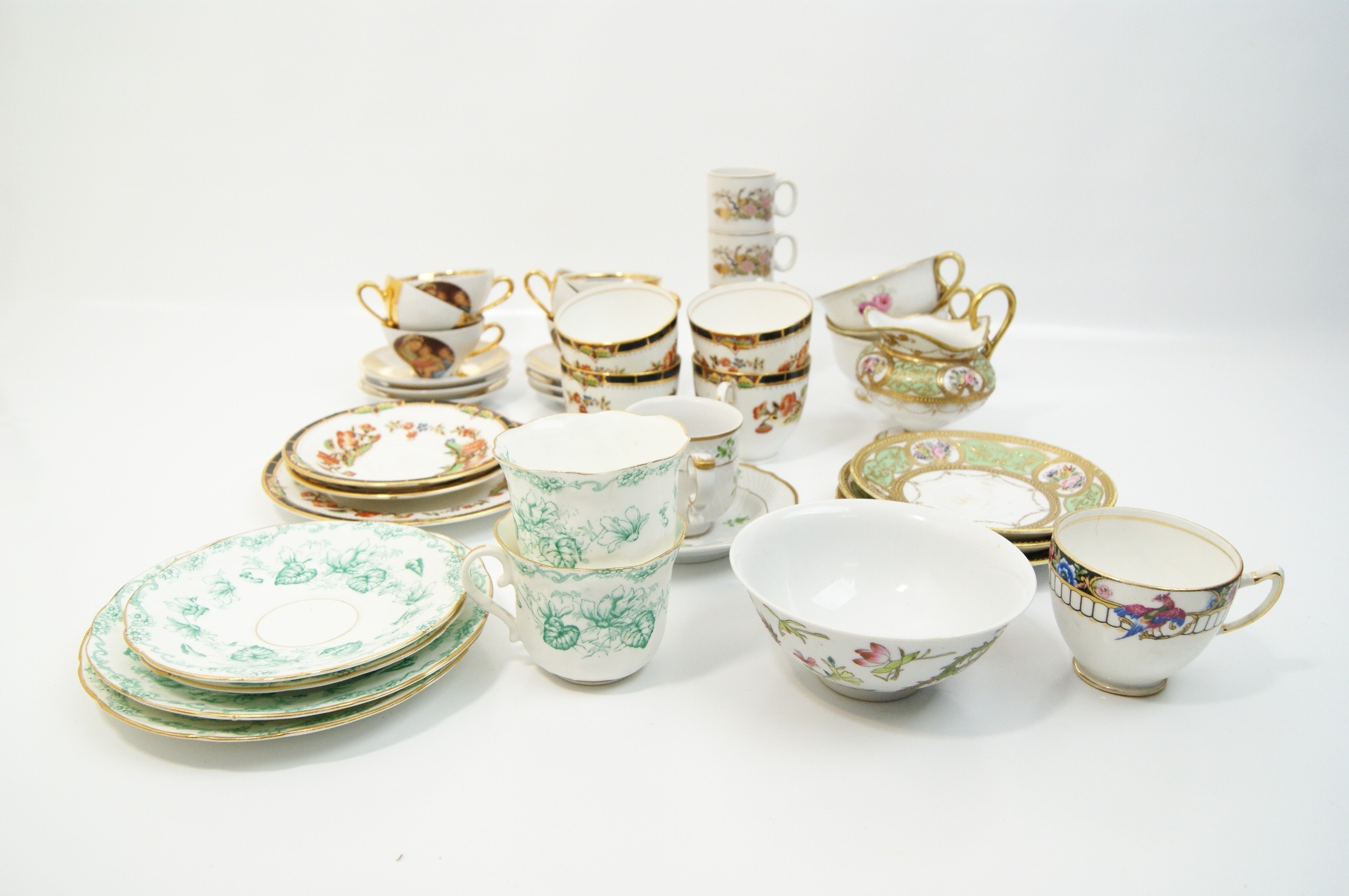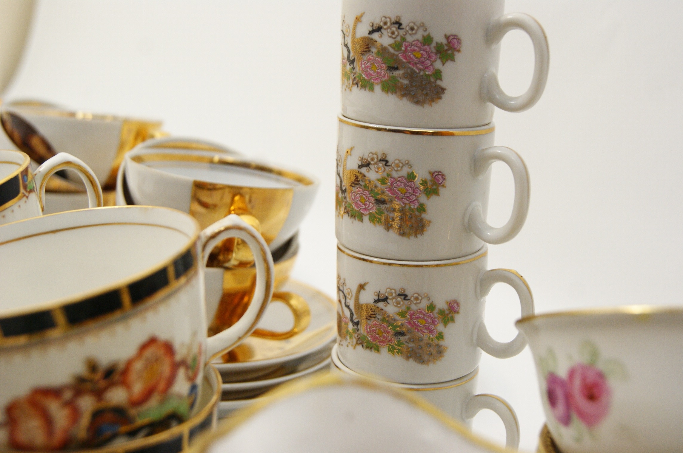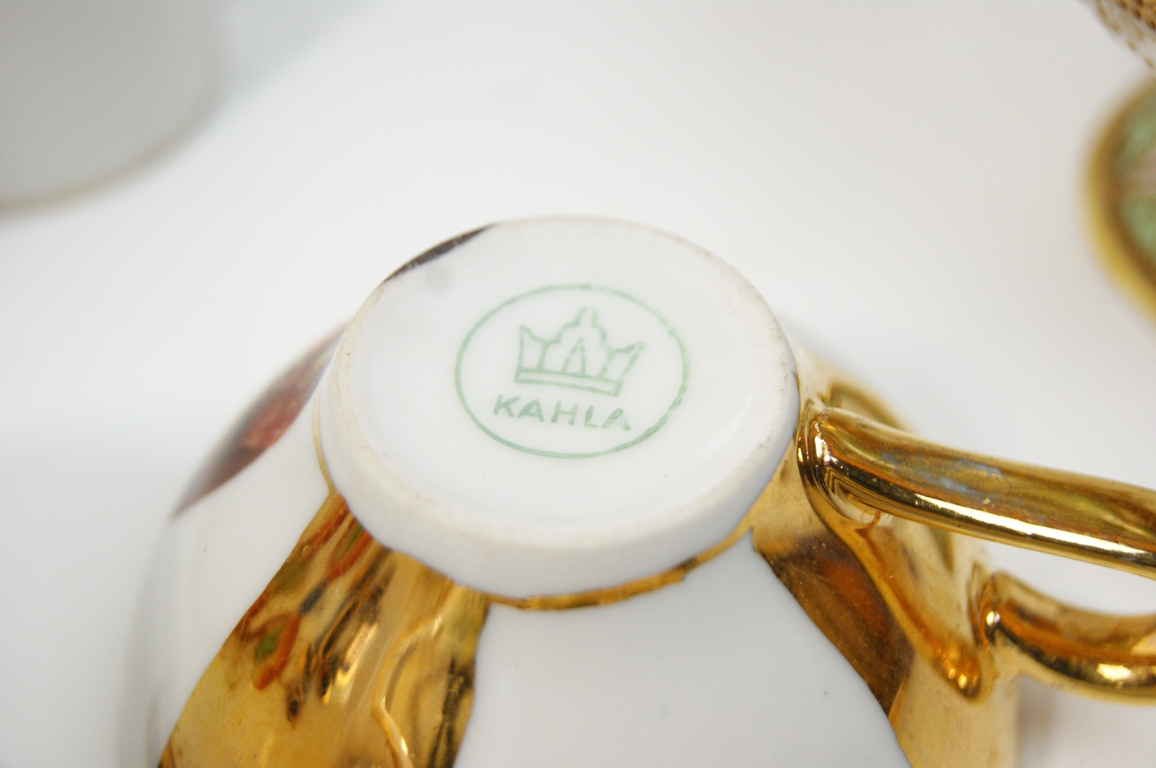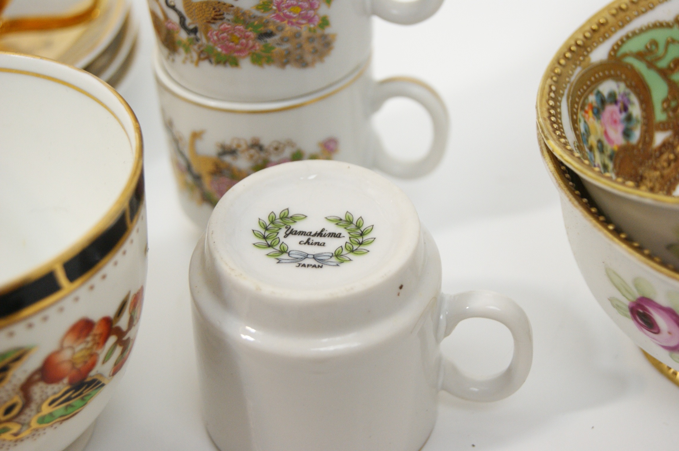 A collection of porcelain and fine bone china tea and coffee wares from various European and Asian manufacturers. The lot includes pieces by Paragon China (England), Melba China (England), Kahla (Germany), Yamashima China (Japan), and Jingdezhen (China). The assortment features several cups and saucers in an Imari-style palette of iron red, cobalt blue, and gold with floral transfer designs and hand-finished details. Also included is a set of cups and saucers decorated with monochrome green transfer-printed floral and foliate patterns. Two cups feature heavy gilding to the handles and interiors, including one by Kahla with a transfer-printed romantic figural scene on the exterior. A stack of four miniature coffee cups by Yamashima is decorated with peacock and peony motifs. The collection further contains a cream jug and matching saucers with a pale green ground, gold scrollwork, and inset floral medallions. A small footed bowl from Jingdezhen is decorated with dragons and floral sprays in a Famille Rose style palette. Marks include a red printed Jingdezhen mark with Made in China, a black printed Paragon China star mark with hand-painted pattern number 5969, a green printed Yamashima China wreath mark, a gold printed Melba China crown and banner mark, and a green printed Kahla crown mark. One white cup features an unidentified blue printed circular mark with scrolling characters.