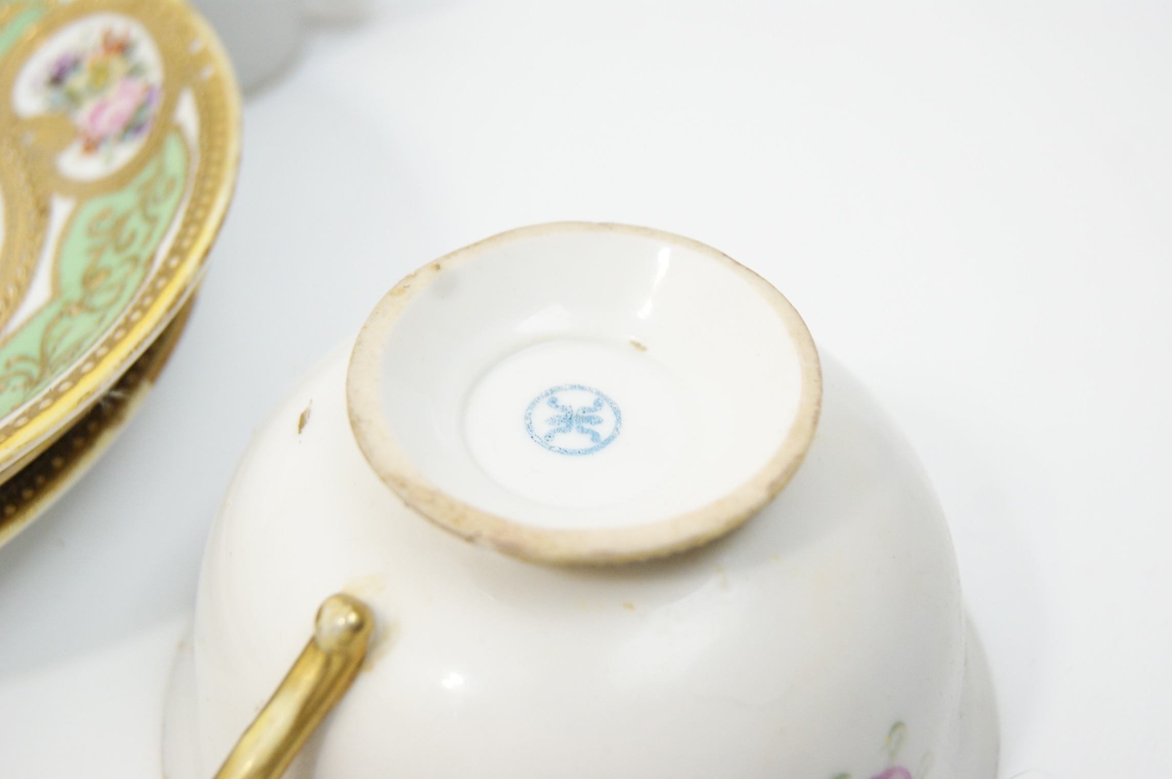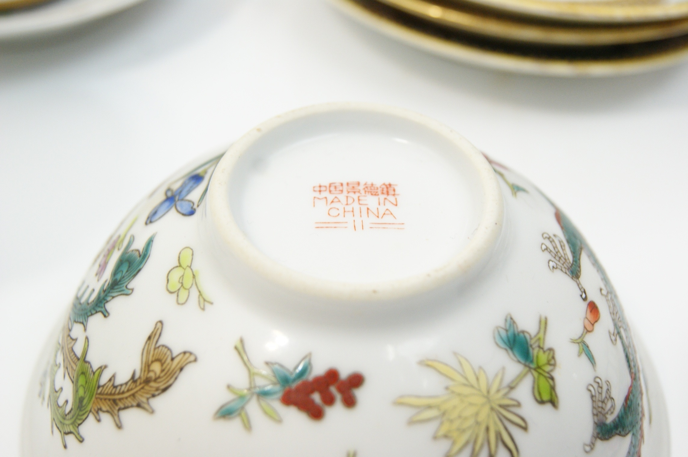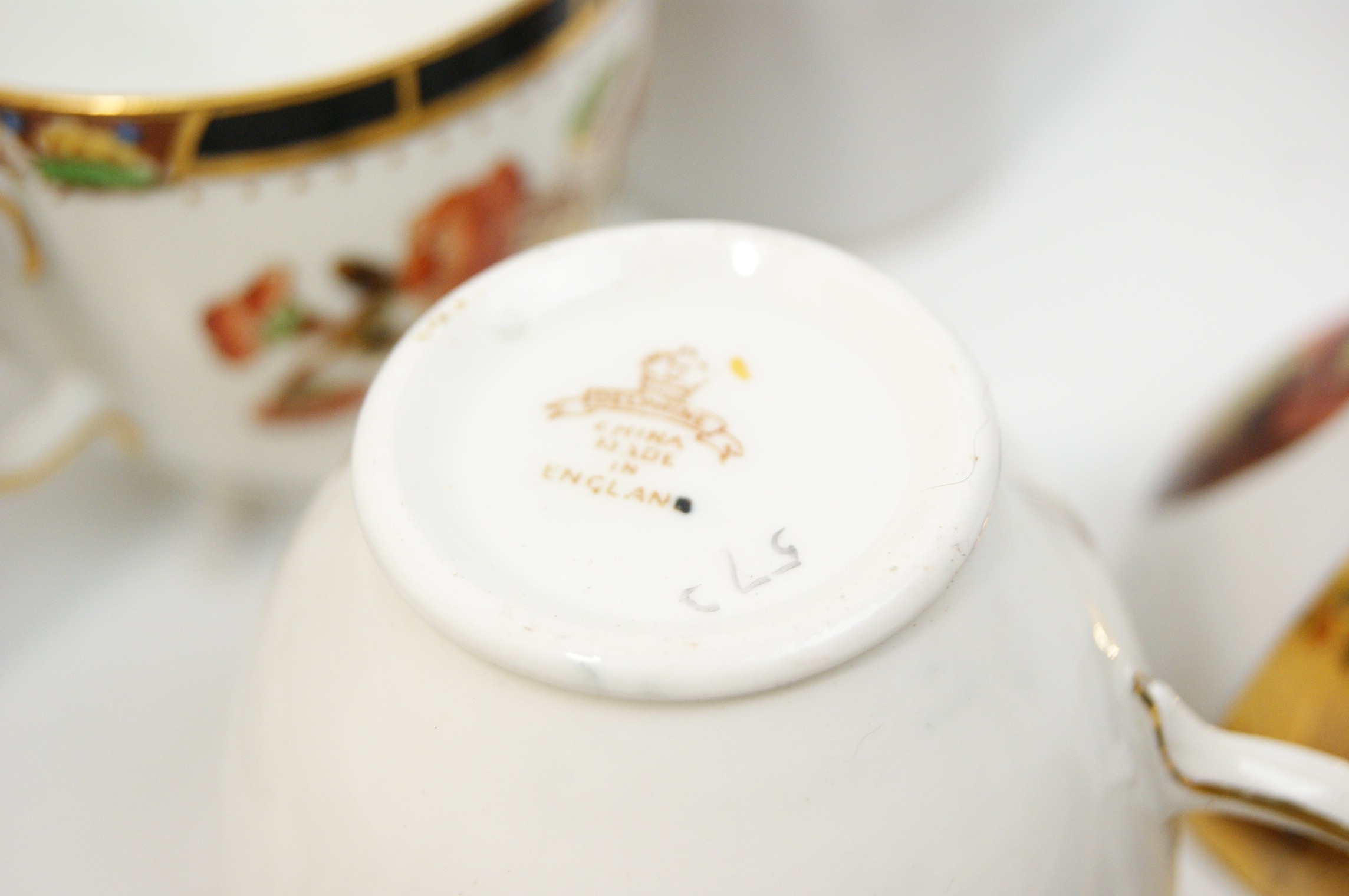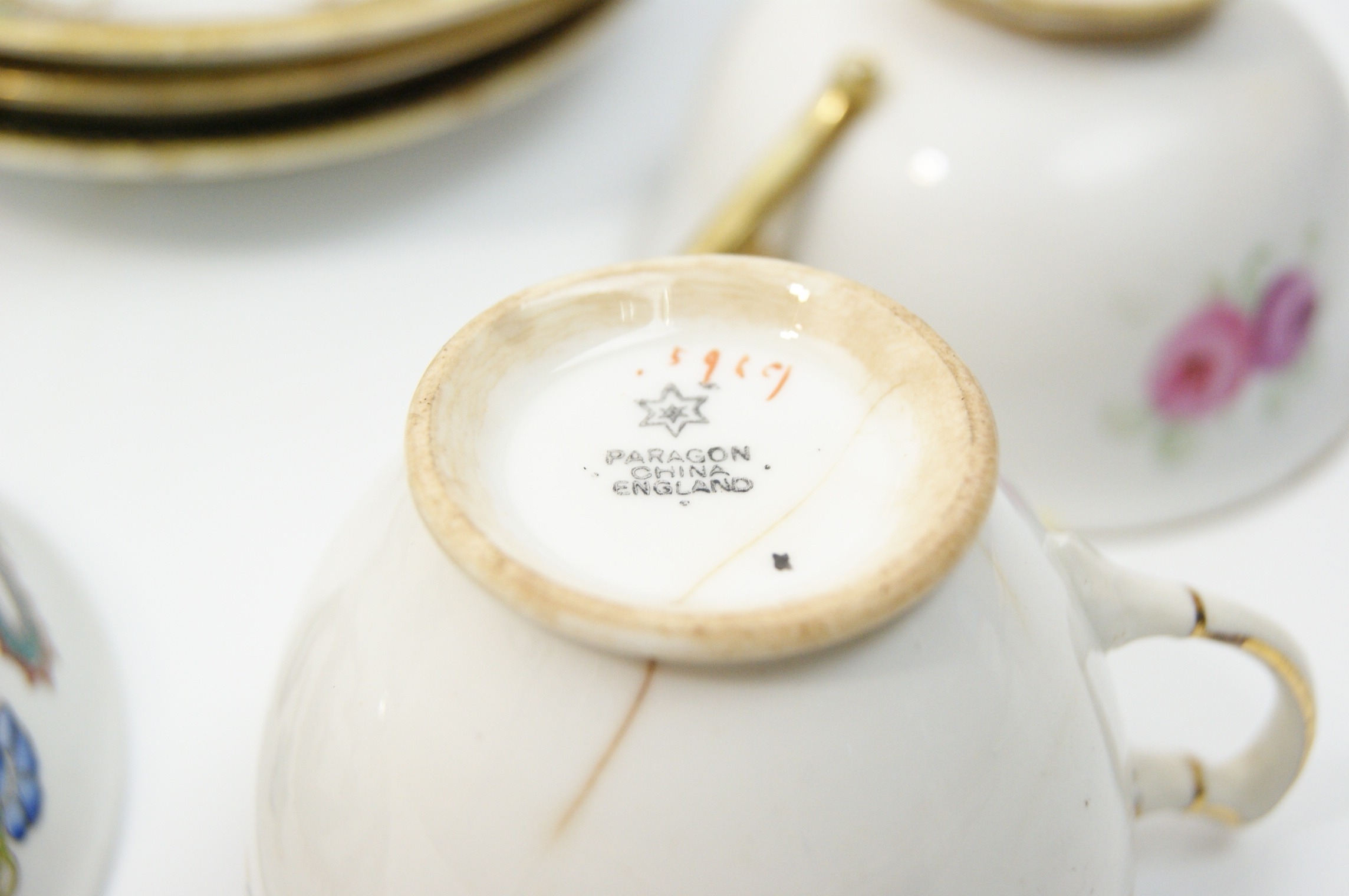A collection of porcelain and fine bone china tea and coffee wares from various European and Asian manufacturers. The lot includes pieces by Paragon China (England), Melba China (England), Kahla (Germany), Yamashima China (Japan), and Jingdezhen (China). The assortment features several cups and saucers in an Imari-style palette of iron red, cobalt blue, and gold with floral transfer designs and hand-finished details. Also included is a set of cups and saucers decorated with monochrome green transfer-printed floral and foliate patterns. Two cups feature heavy gilding to the handles and interiors, including one by Kahla with a transfer-printed romantic figural scene on the exterior. A stack of four miniature coffee cups by Yamashima is decorated with peacock and peony motifs. The collection further contains a cream jug and matching saucers with a pale green ground, gold scrollwork, and inset floral medallions. A small footed bowl from Jingdezhen is decorated with dragons and floral sprays in a Famille Rose style palette. Marks include a red printed Jingdezhen mark with Made in China, a black printed Paragon China star mark with hand-painted pattern number 5969, a green printed Yamashima China wreath mark, a gold printed Melba China crown and banner mark, and a green printed Kahla crown mark. One white cup features an unidentified blue printed circular mark with scrolling characters.
