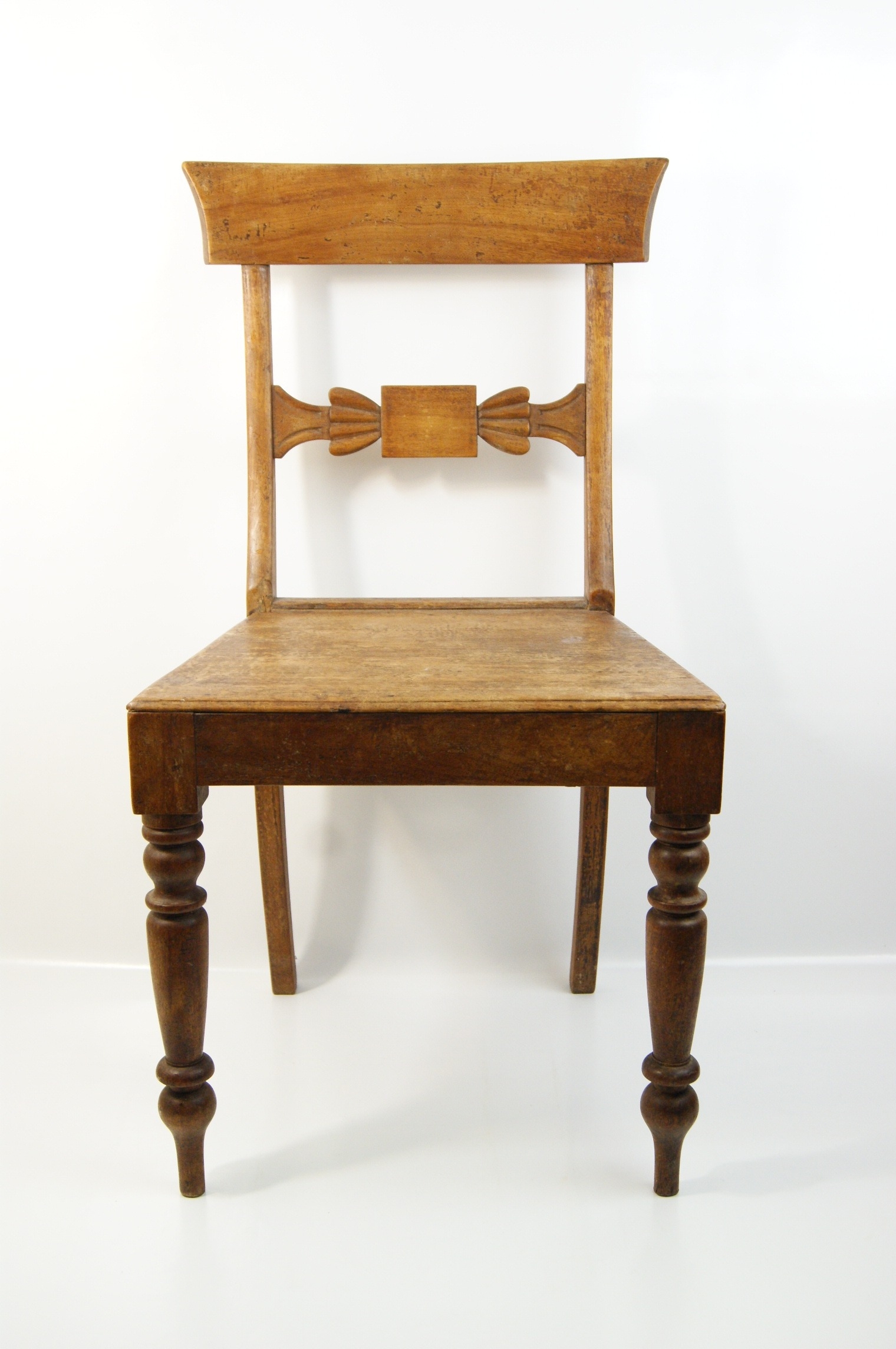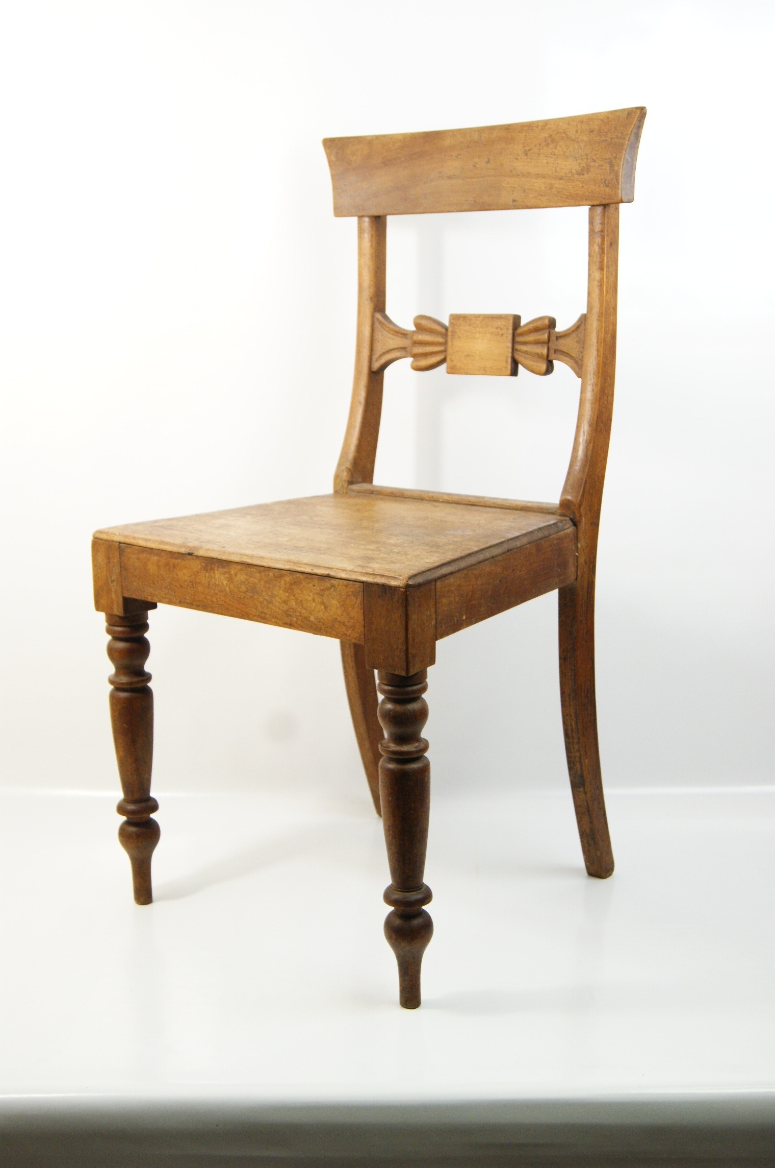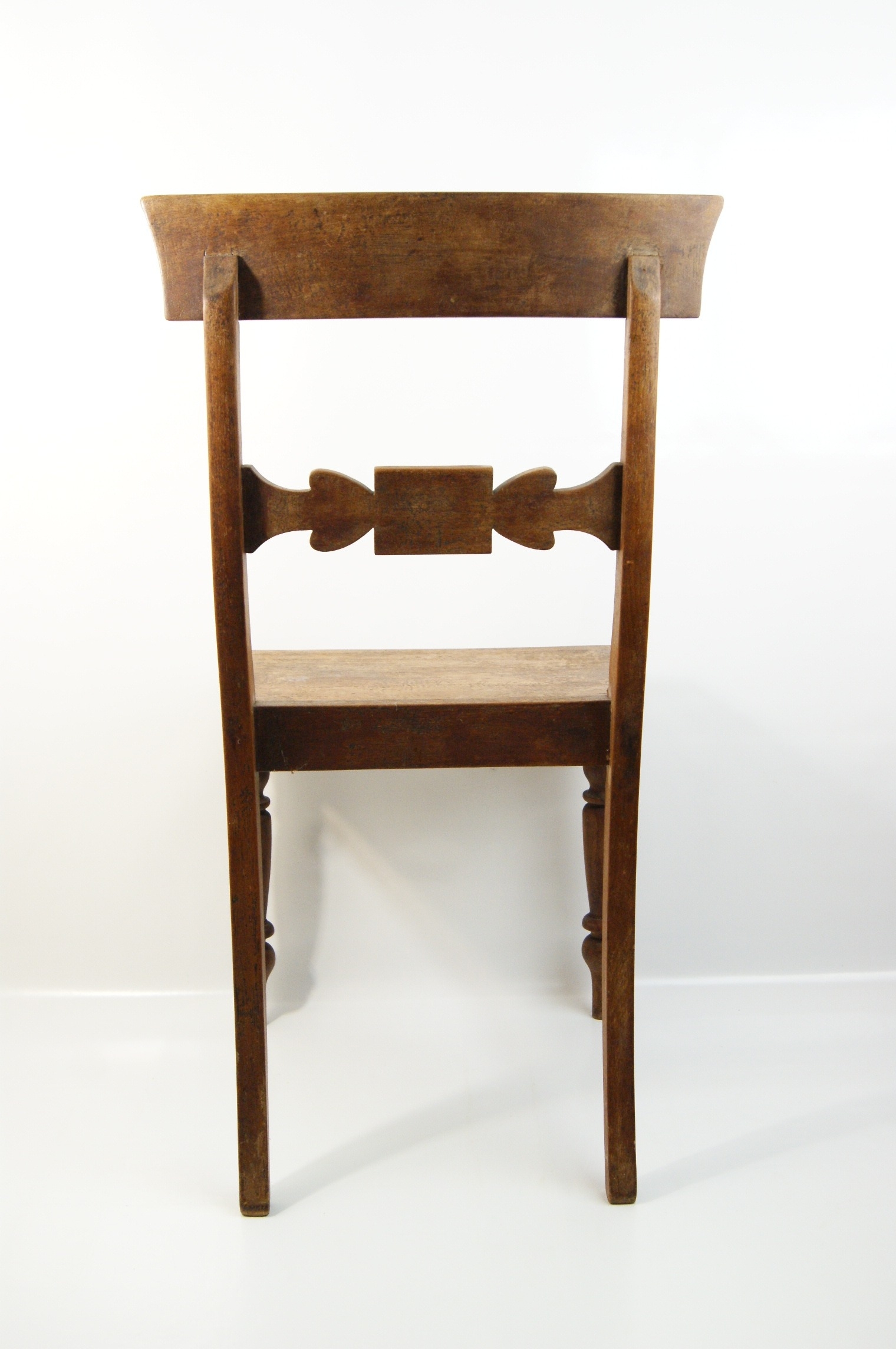A 19th century provincial hall chair constructed from a light-toned hardwood, possibly fruitwood or oak. The chair features a curved tablet-shaped top rail supported by upright stiles. The central decorative splat is carved with lobed elements flanking a central rectangular boss. It has a solid panelled plank seat. The front legs are ring-turned and tapered, while the rear legs are of square-section swept sabre form. The construction utilises visible mortise and tenon joinery. No maker’s marks are visible on the frame or underside.