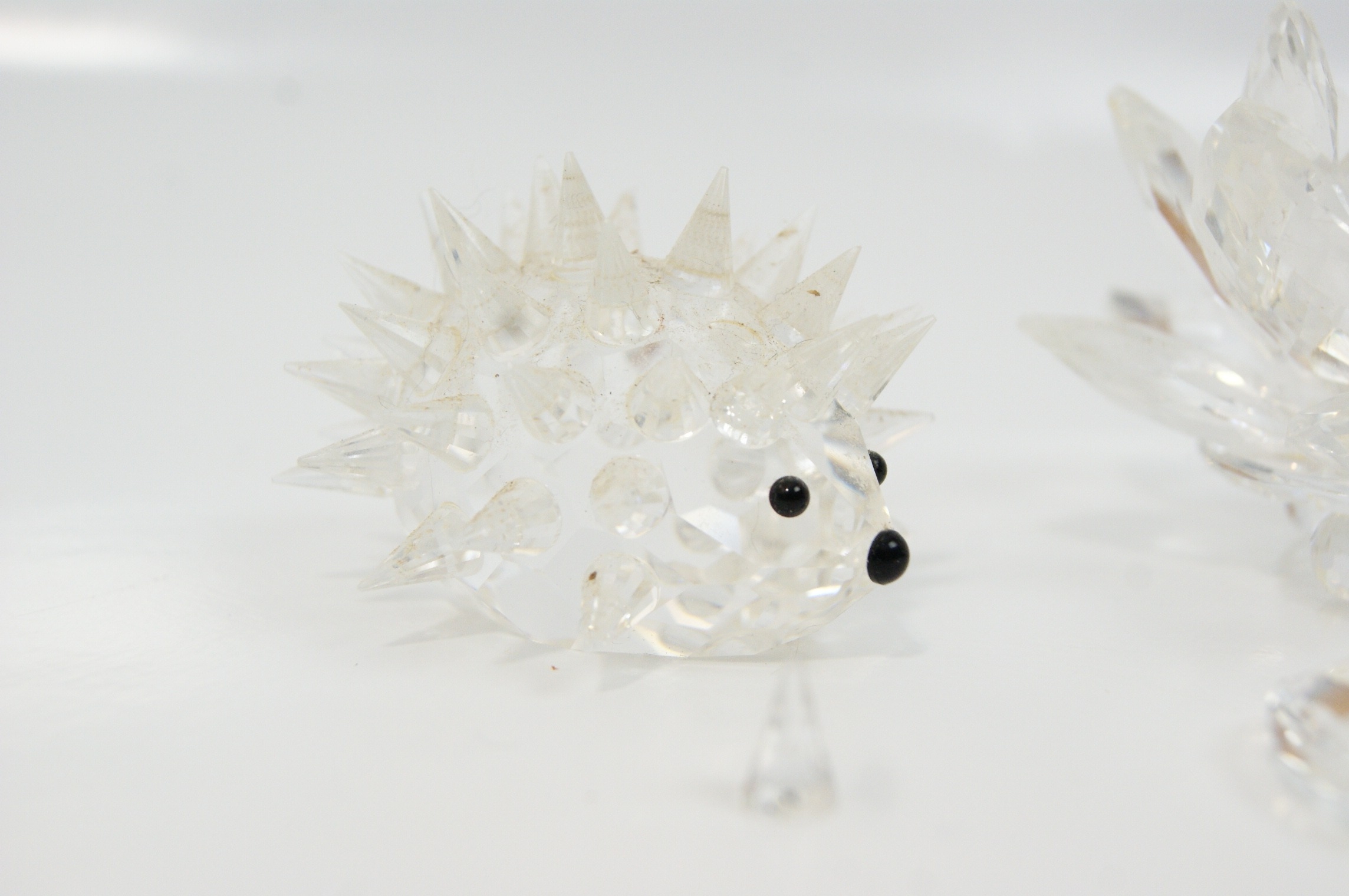 A collection of two faceted clear crystal decorative items. The first is a Swarovski hedgehog figurine, featuring a rounded body with numerous pointed crystal spines and three black bead accents for the eyes and nose. This piece is marked with the Swarovski swan logo and name on the base. The second item is a lotus flower or water lily figurine, constructed with multiple tiers of pointed petals surrounding a central faceted sphere, resting on three spherical crystal feet. This item is in the style of Swarovski but lacks a visible maker’s mark. Height of hedgehog 4.5cm, lotus 5.5cm.