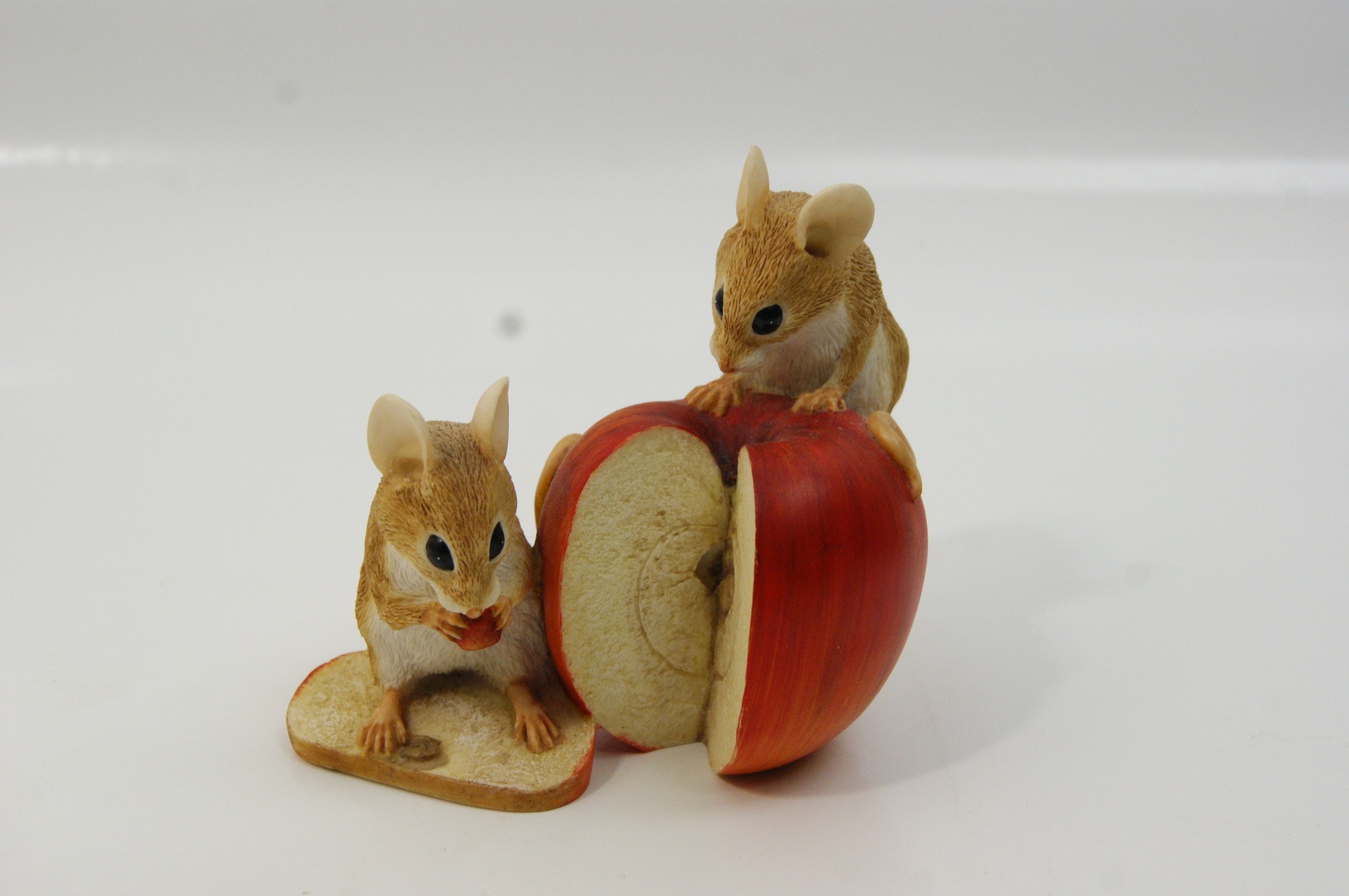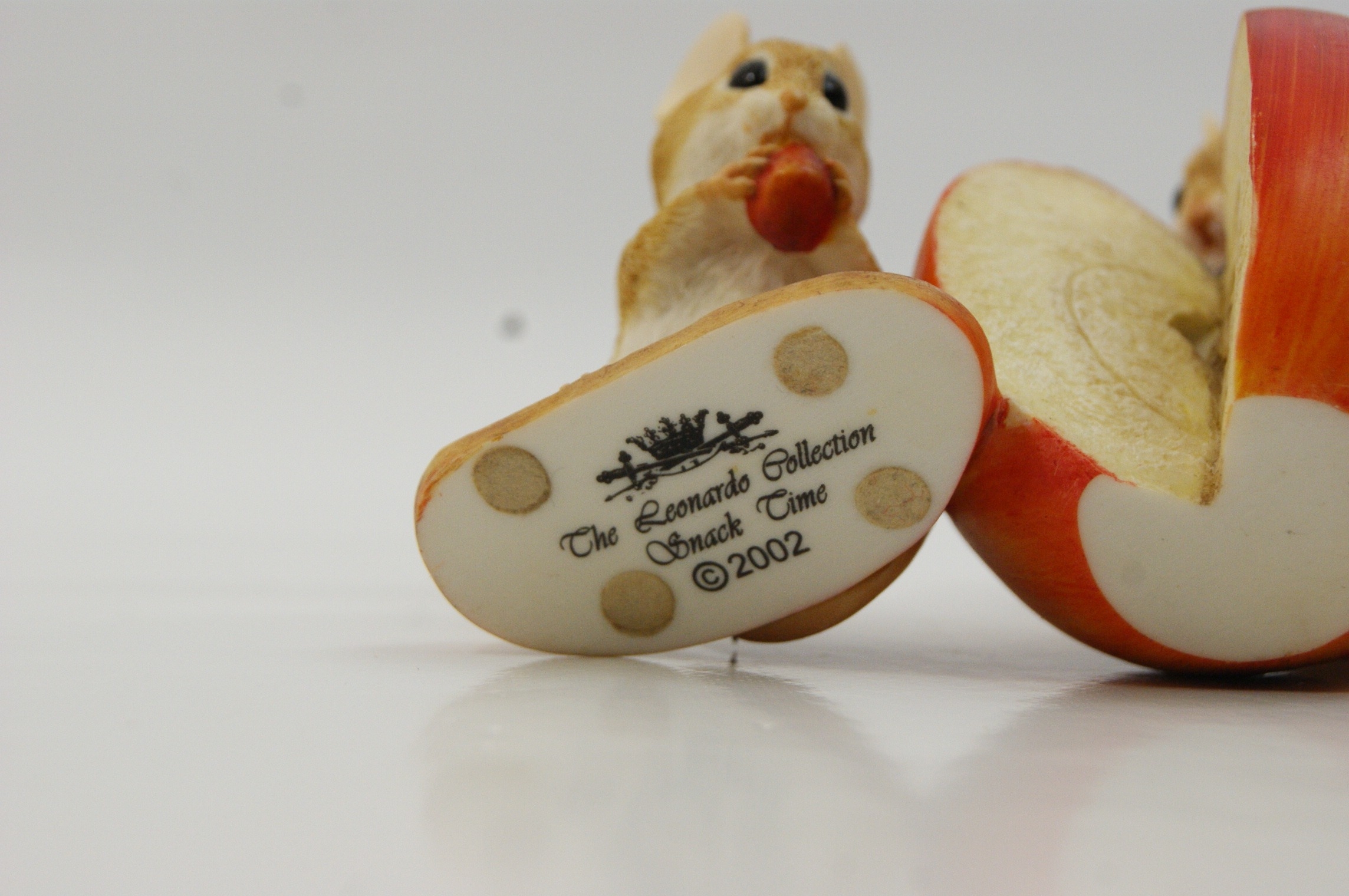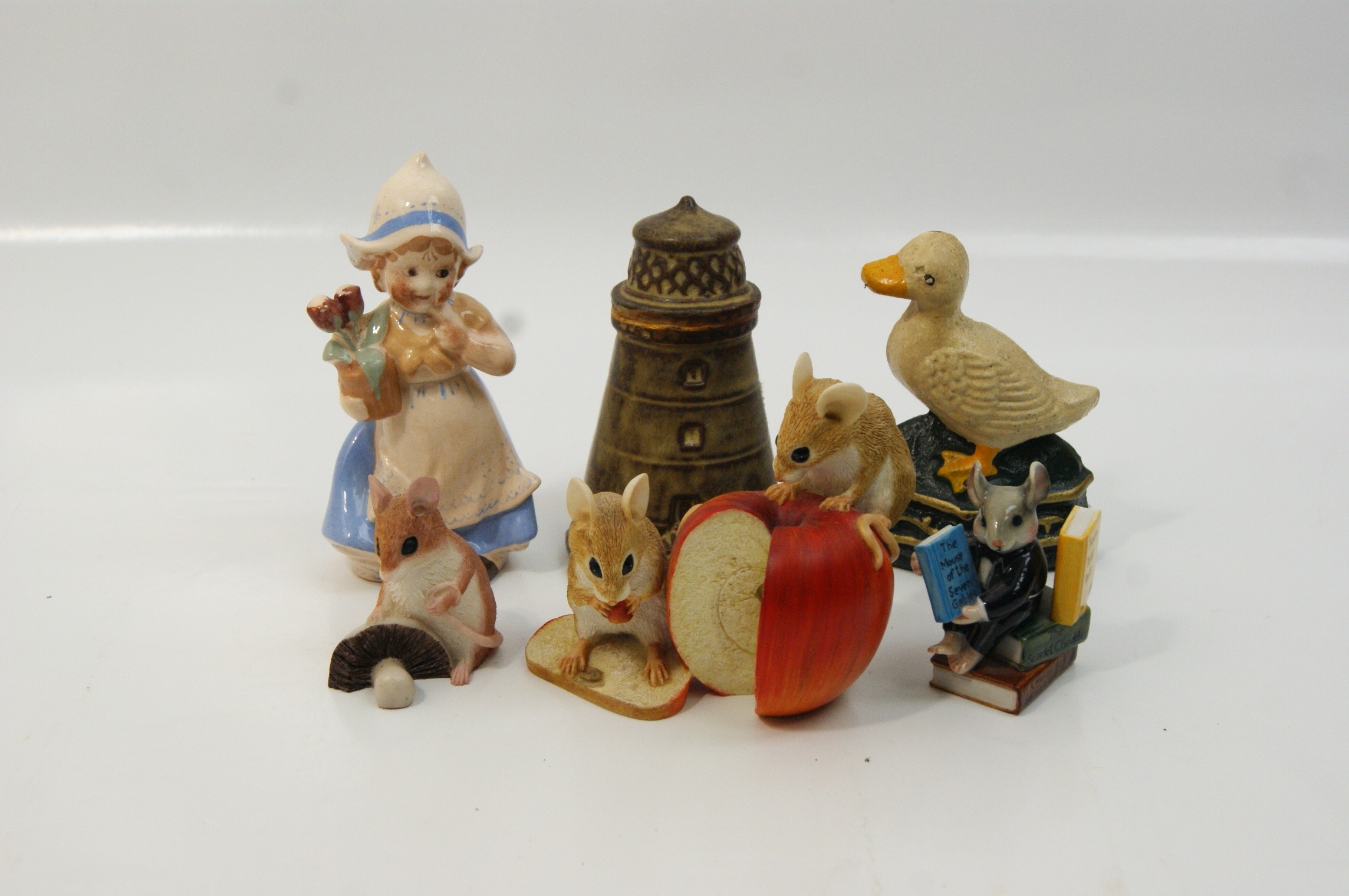 A collection of decorative figurines and ornaments in various materials including stoneware, ceramic, and painted resin. The lot features a salt-glazed stoneware lighthouse by Plymouth Pottery, designed with a tapered body, horizontal banding, and an embossed circular mark to the base. Also included is a painted resin figurine from The Leonardo Collection titled Snack Time, dated 2002, depicting two mice with a large red apple. The group further comprises a glazed ceramic figurine of a girl in traditional Dutch dress holding a pot of tulips, in the style of Goebel Hummel. Additional pieces include a whimsical resin figurine of a mouse in formal attire seated on a stack of books with titles parodying Nathaniel Hawthorne works, including The Scarlet Cheddar and Twice Told Tails, a small resin mouse with a mushroom, and a painted duck figure on a rocky base.