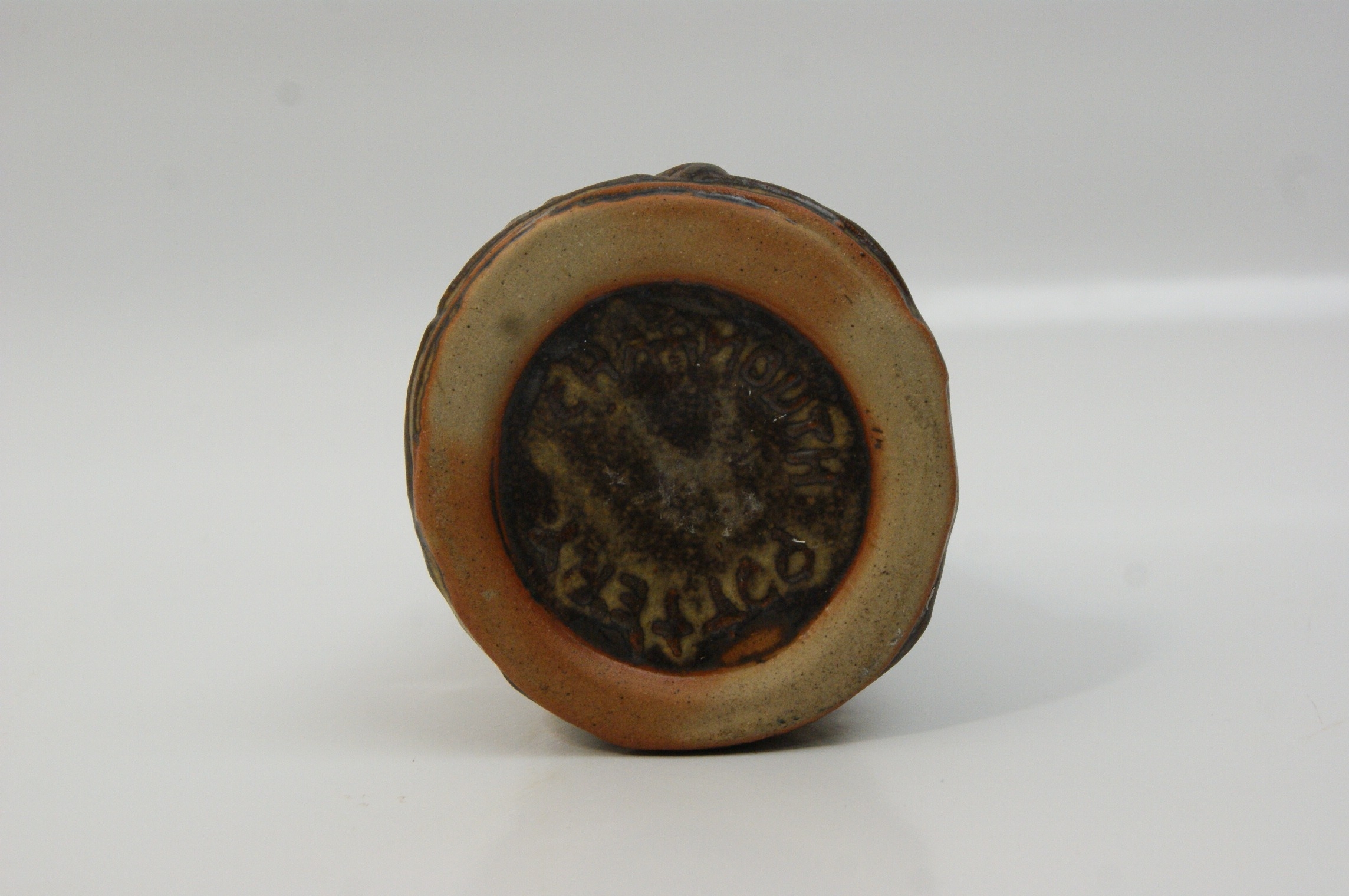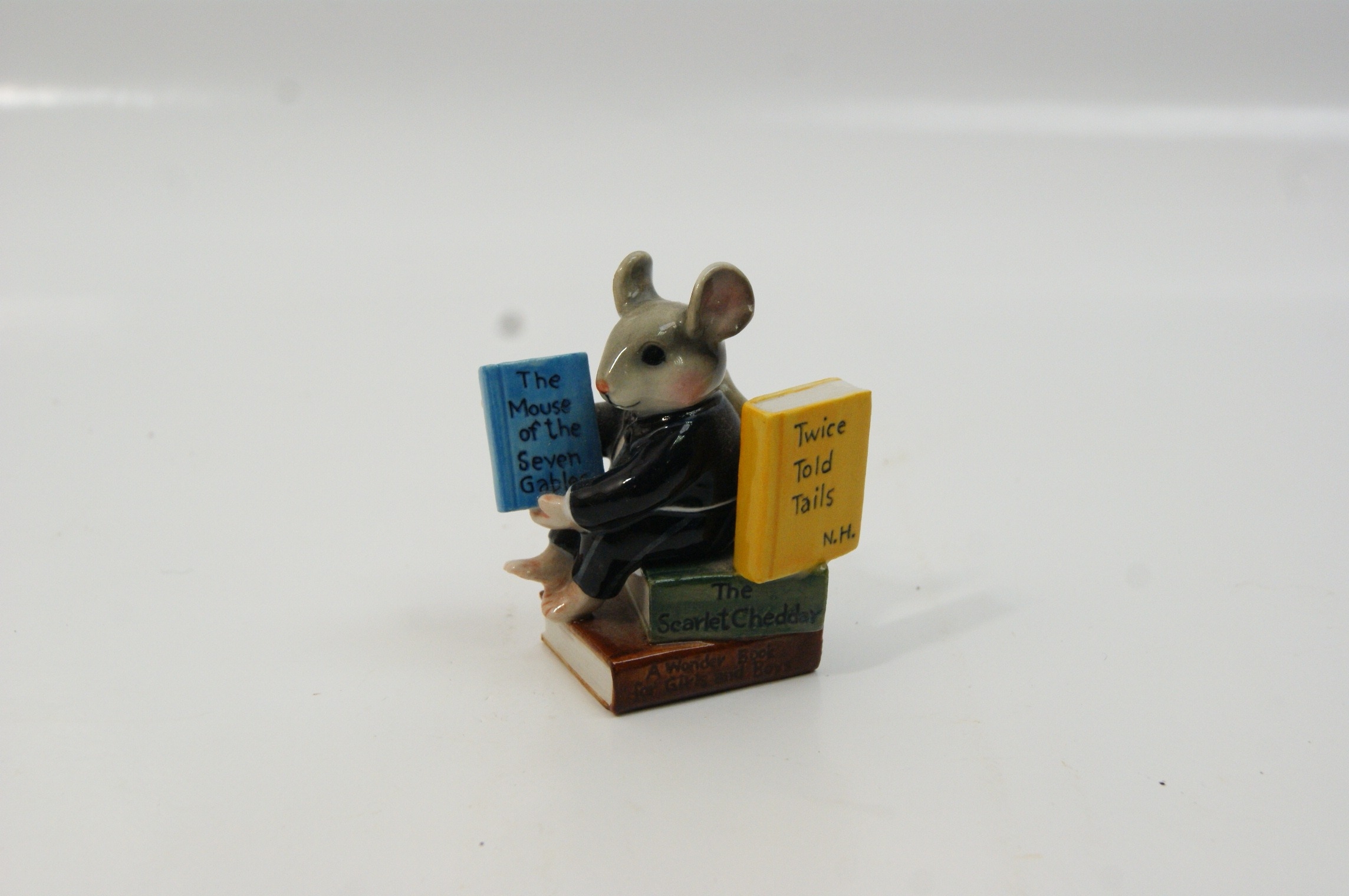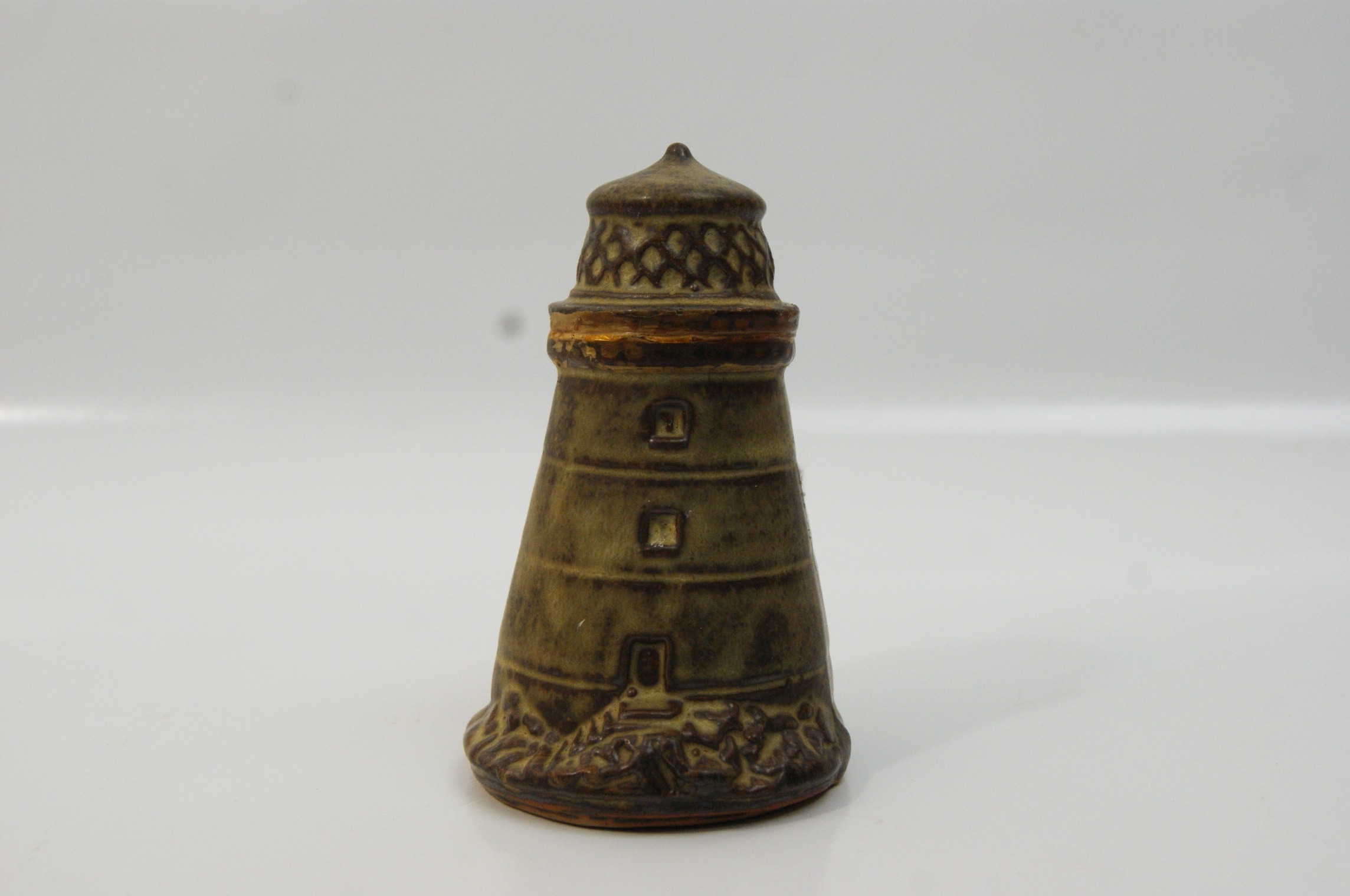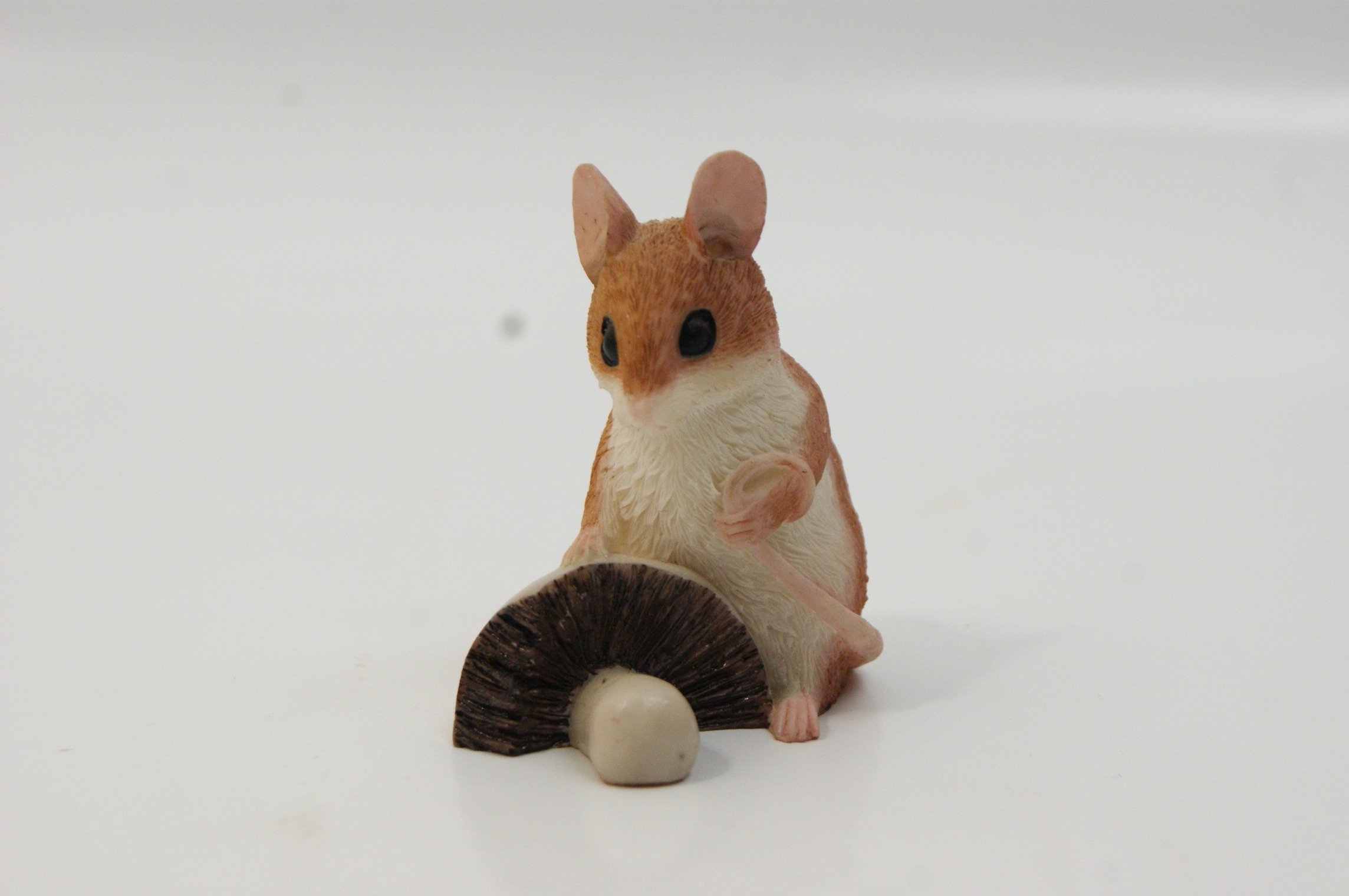 A collection of decorative figurines and ornaments in various materials including stoneware, ceramic, and painted resin. The lot features a salt-glazed stoneware lighthouse by Plymouth Pottery, designed with a tapered body, horizontal banding, and an embossed circular mark to the base. Also included is a painted resin figurine from The Leonardo Collection titled Snack Time, dated 2002, depicting two mice with a large red apple. The group further comprises a glazed ceramic figurine of a girl in traditional Dutch dress holding a pot of tulips, in the style of Goebel Hummel. Additional pieces include a whimsical resin figurine of a mouse in formal attire seated on a stack of books with titles parodying Nathaniel Hawthorne works, including The Scarlet Cheddar and Twice Told Tails, a small resin mouse with a mushroom, and a painted duck figure on a rocky base.