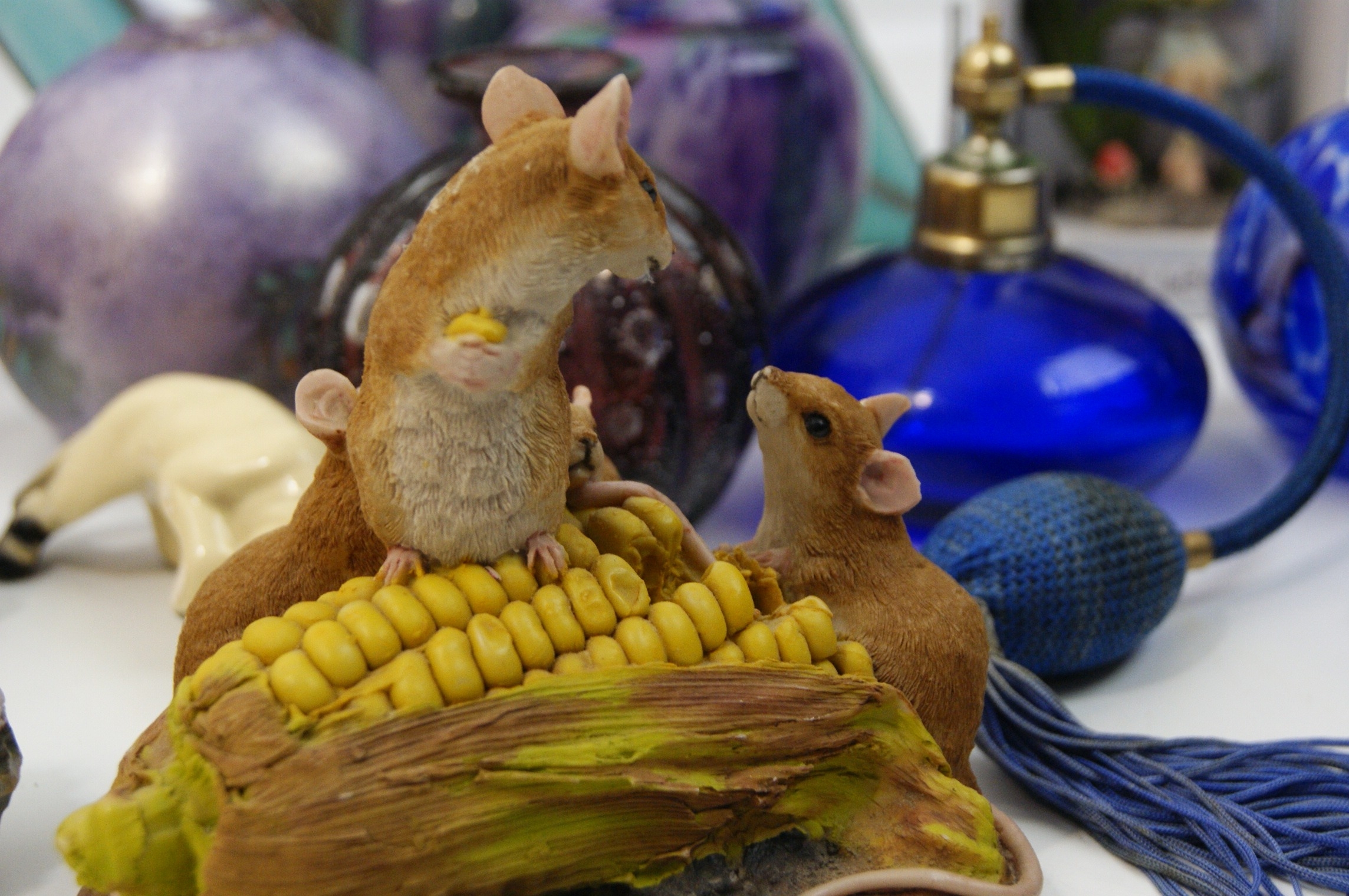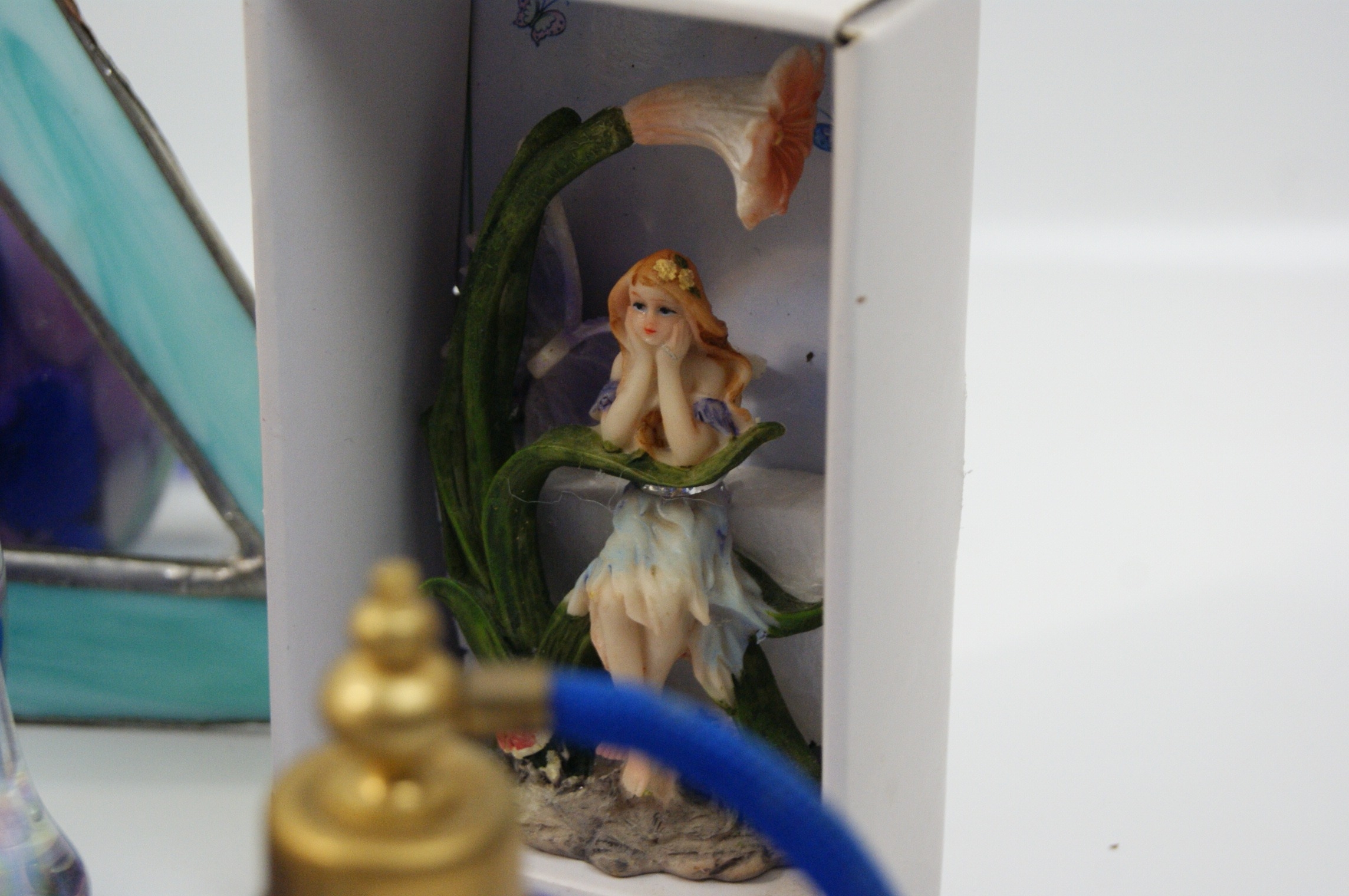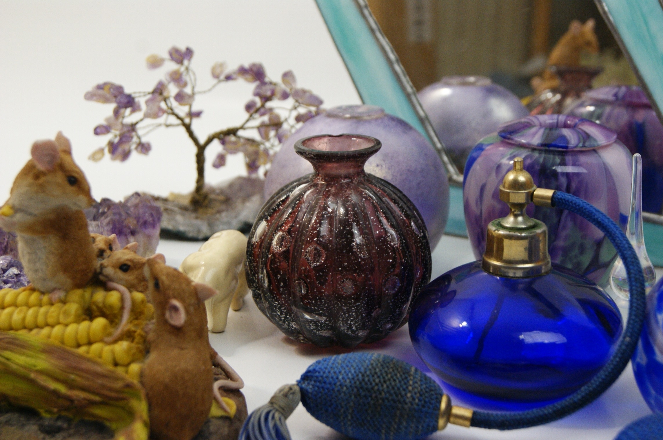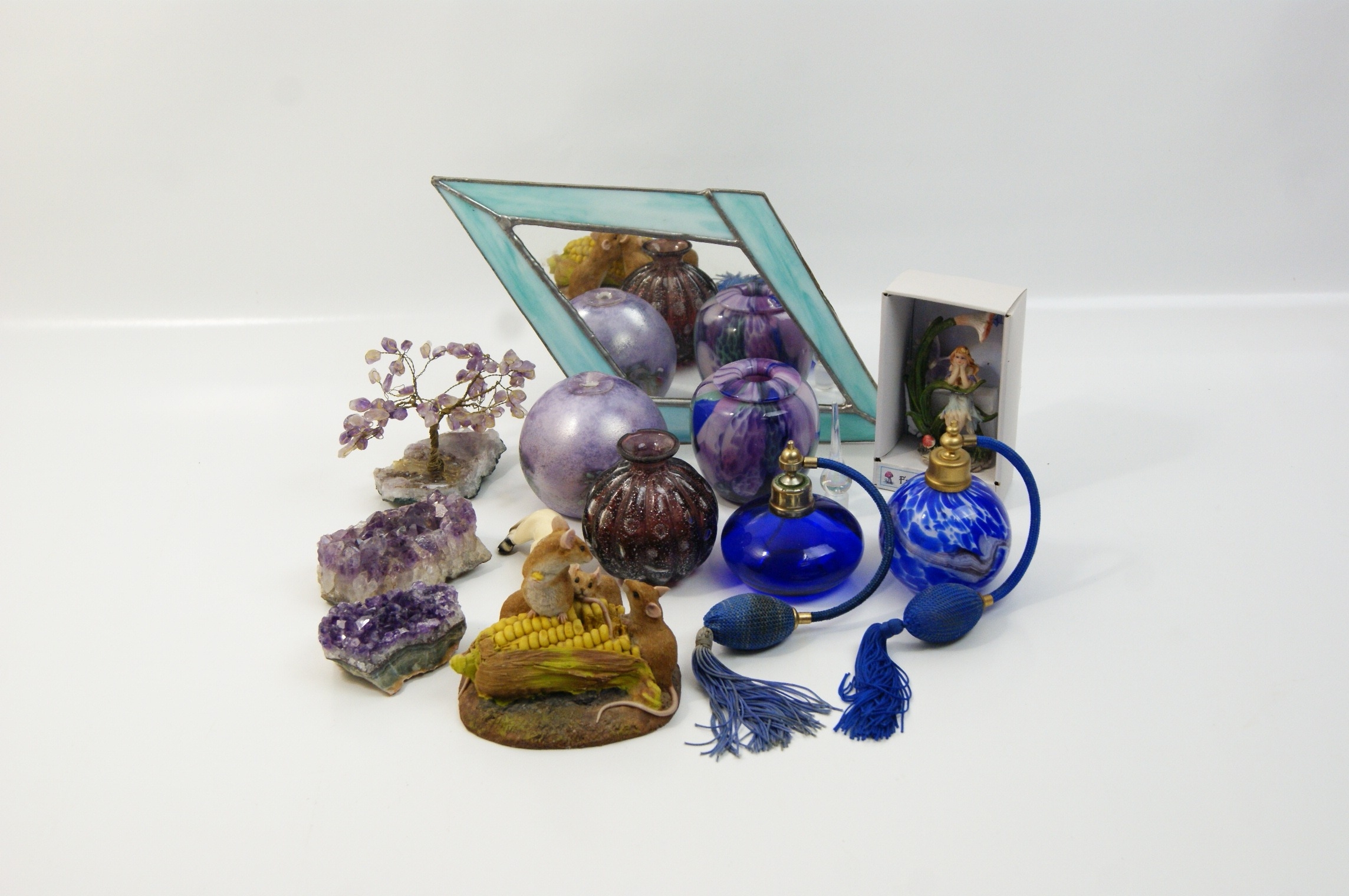 A collection of decorative objects comprising art glass, mineral specimens, and resin figurines. The glass items include two perfume atomisers, one featuring a solid cobalt blue blown glass reservoir and the other decorated with blue and white marbled patterns, both fitted with brass-toned metal hardware and blue fabric-wrapped squeeze bulbs with matching tassels. The lot further includes three small blown glass vases: a globular form with a narrow flaring neck in deep purple with mottled silver-toned iridescence, a mottled lilac glass orb, and a small vase with swirled blue and purple patterns. A diamond-shaped wall mirror is constructed from turquoise-coloured glass panels joined with lead cames. The mineral specimens consist of three natural amethyst druse clusters and a decorative gem tree featuring twisted gold-toned wire branches with amethyst chip foliage mounted on a mineral base. Figurines include a cast resin group of three field mice on an ear of corn, a painted resin fairy resting under a bell-shaped flower in its original retail box, and a small cream-coloured glazed ceramic quadruped, possibly a polar bear or pig. No maker’s marks or signatures are present on the items.