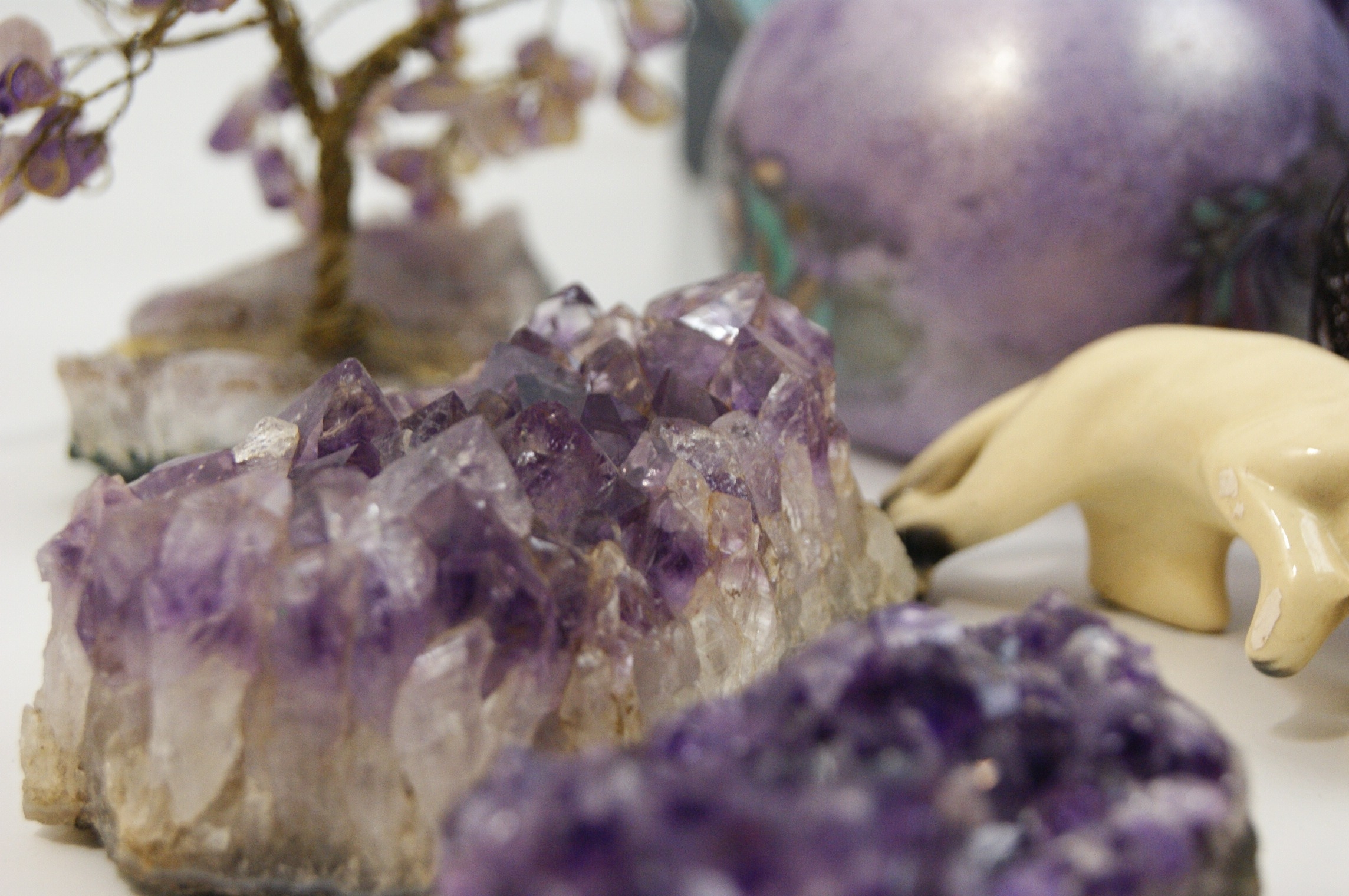 An Assortment of Decorative Art Glass, Atomisers, Amethyst Mineral Specimens, and Figurines