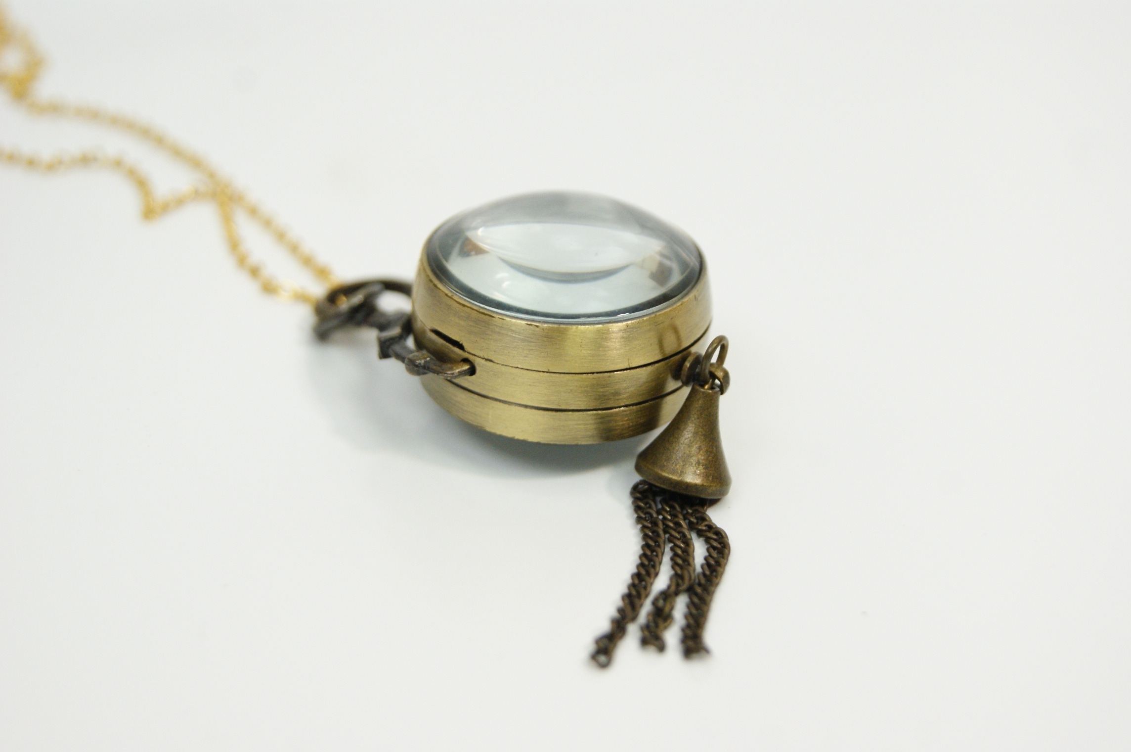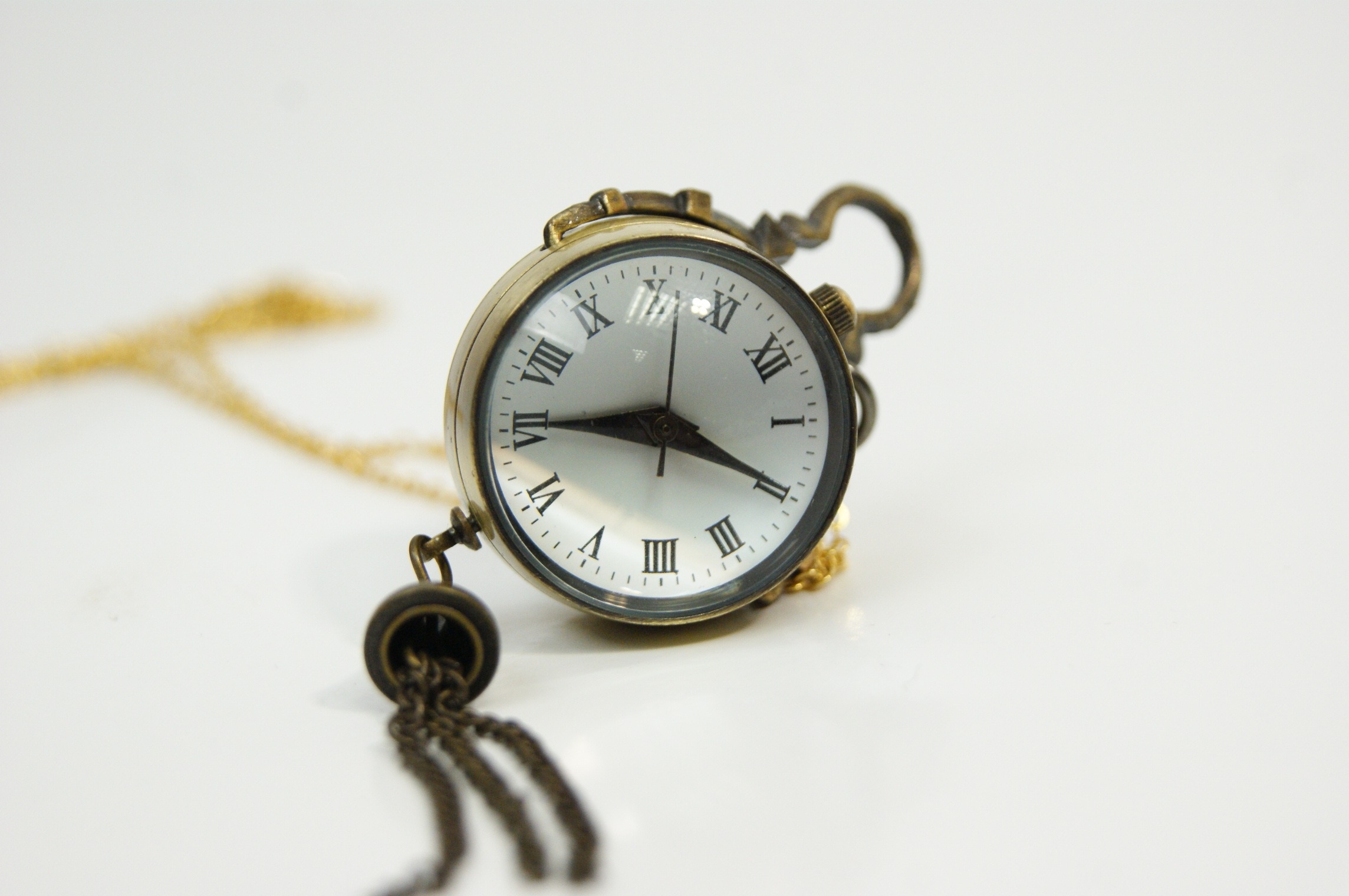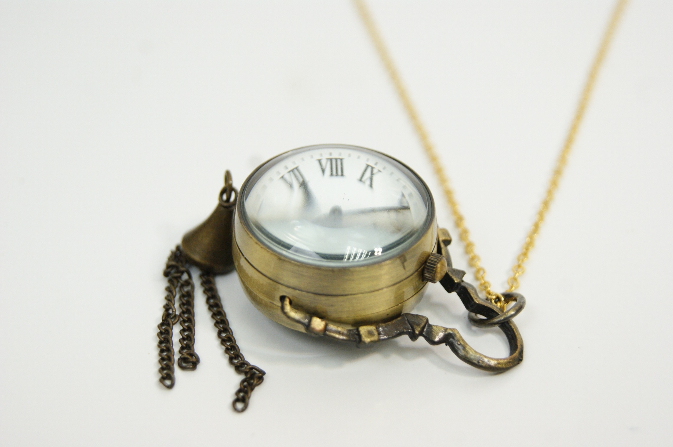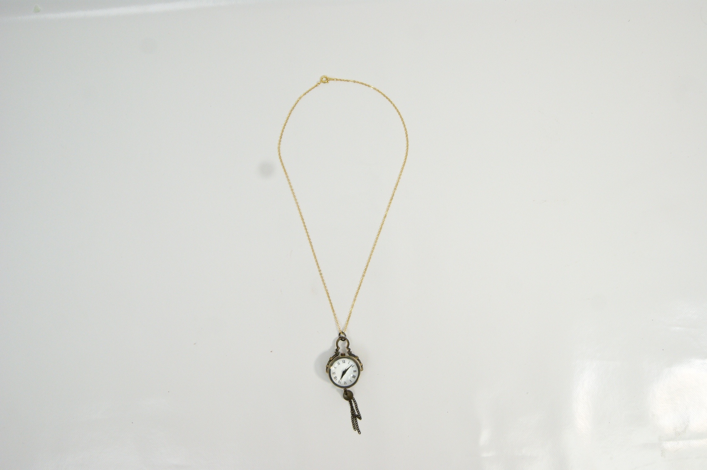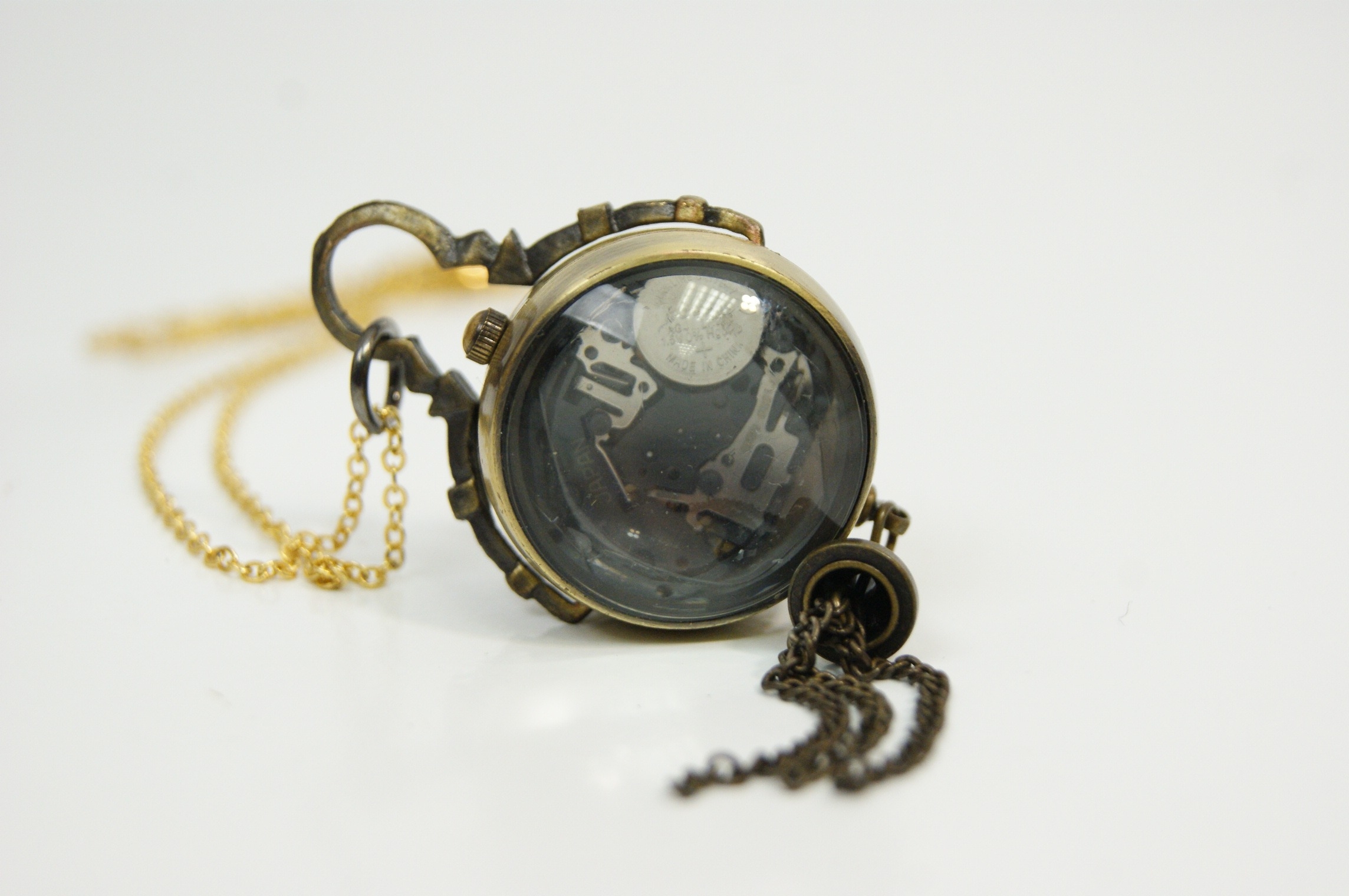 A decorative pendant necklace featuring a miniature pocket watch housed in a brass-tone case and suspended from a fine chain. The watch has a white dial with Roman numeral hour markers beneath a domed glass crystal, while the reverse reveals the quartz movement through a transparent case back, marked “Japanese Movt.” The case is mounted within a stylised frame with small chain tassel detail, giving the piece a distinctive steampunk-inspired appearance.Case size approximately 25mm.