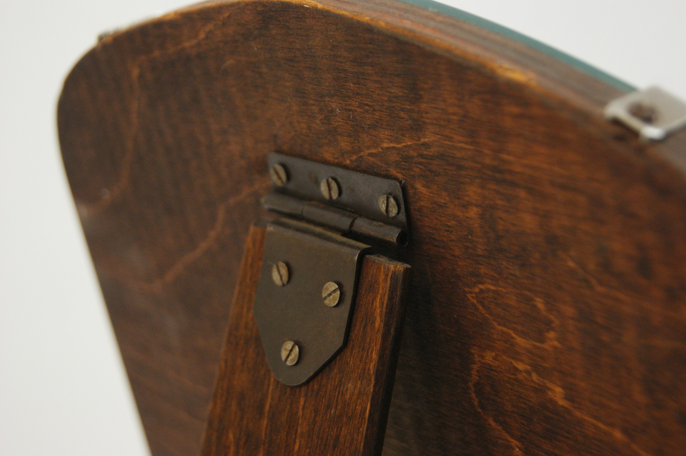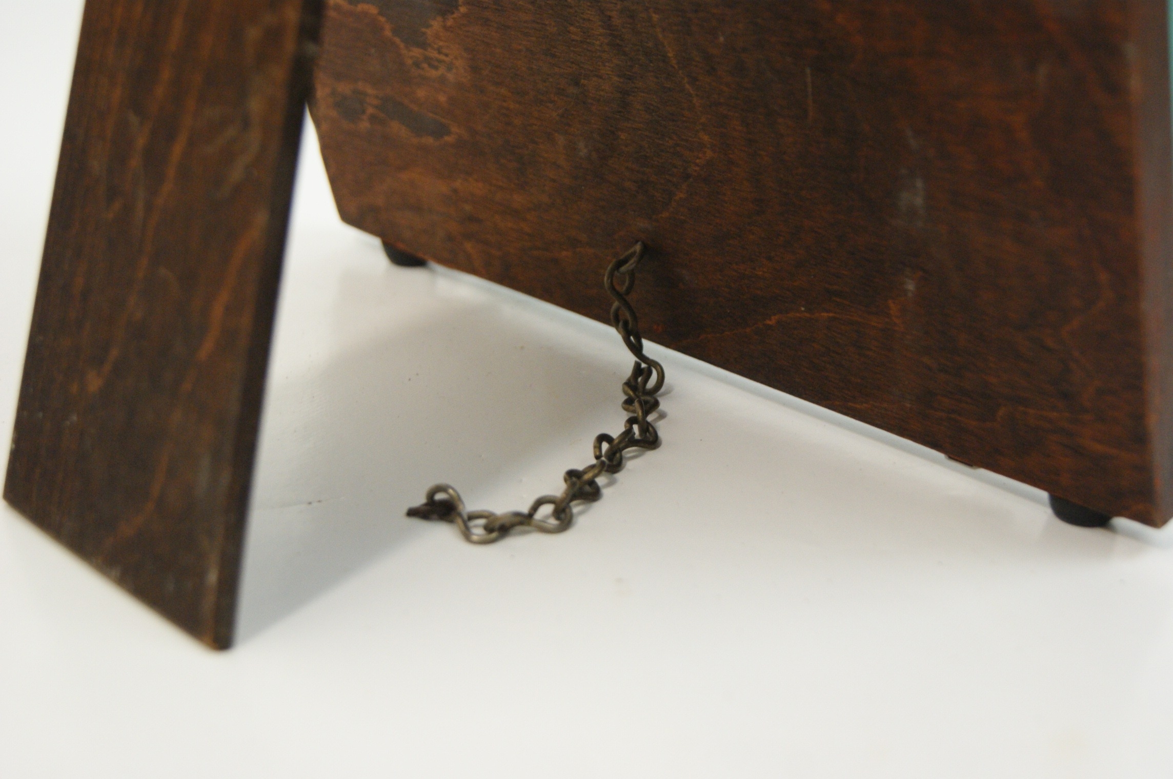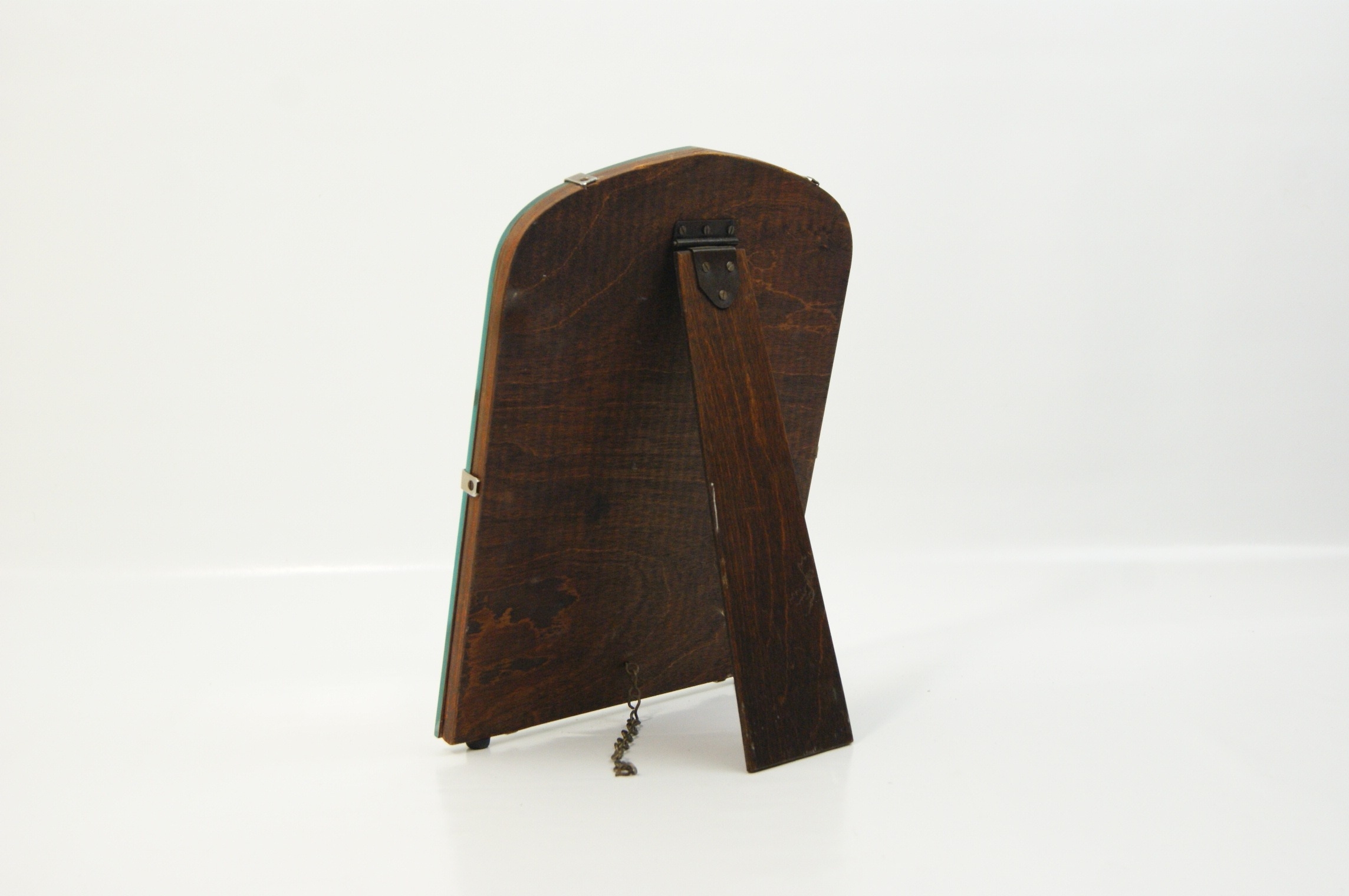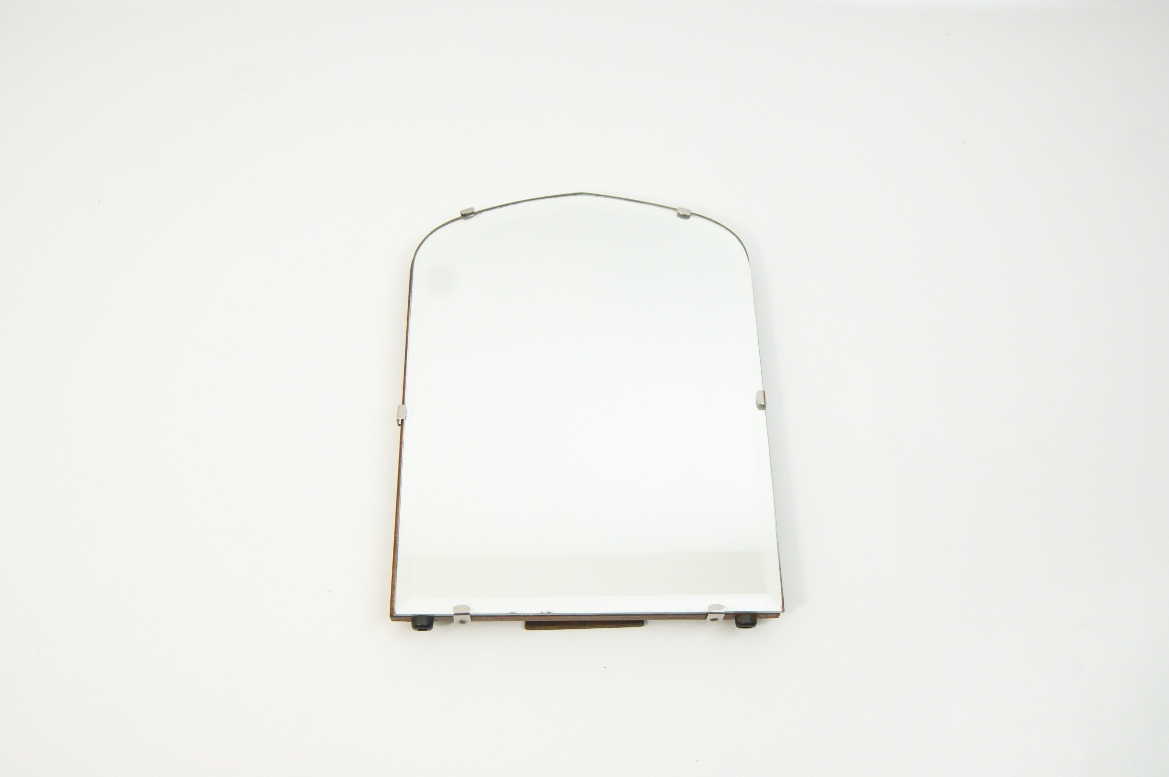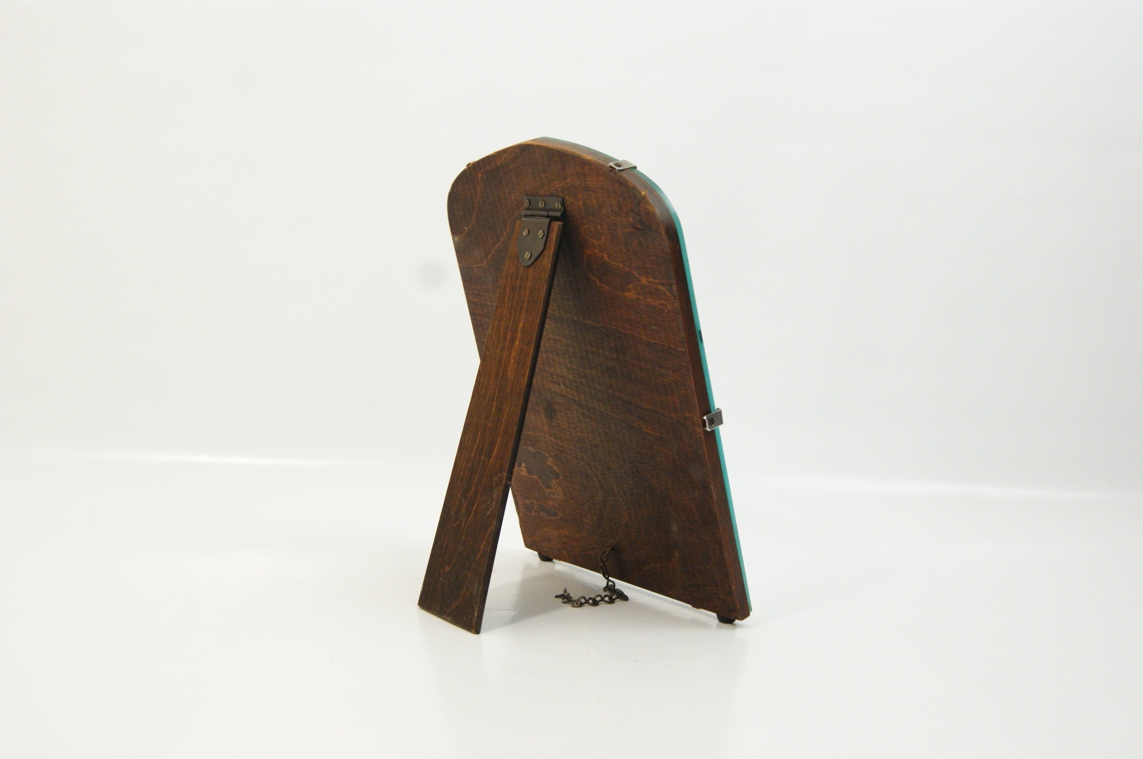 This is an early 20th-century Art Deco style easel-back dressing table mirror. The frameless design features a bevelled glass plate secured by six chrome-plated metal clips to a shaped wooden backboard. The backboard and its integrated easel-style support are constructed from dark-stained wood, likely oak or an oak-veneered plywood. The support is attached via a metal hinge and includes a small metal stay chain. No maker marks, symbols, or factory attributions are visible on the base, back, or body of the item.