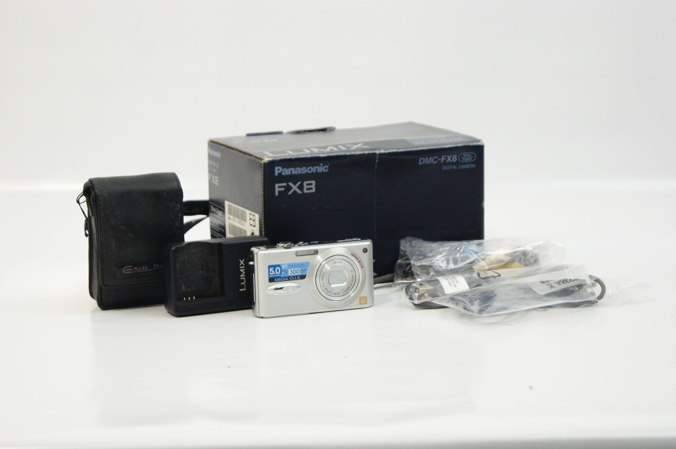 A collection comprising a Panasonic Lumix DMC-FX8 digital camera and associated accessories. The camera body is finished in silver and features a 5.0-megapixel sensor, 3x optical zoom, and Mega O.I.S. stabilisation technology. The lens housing is marked Leica DC Vario-Elmarit. Included in the lot is a Panasonic battery charger, model DE-A12A, bearing serial number C6045589DC. The collection further includes several connection cables in original plastic wrapping and a black soft carry case marked Exilim with a Casio branded strap. The original retail box is present, featuring bilingual English and French text.