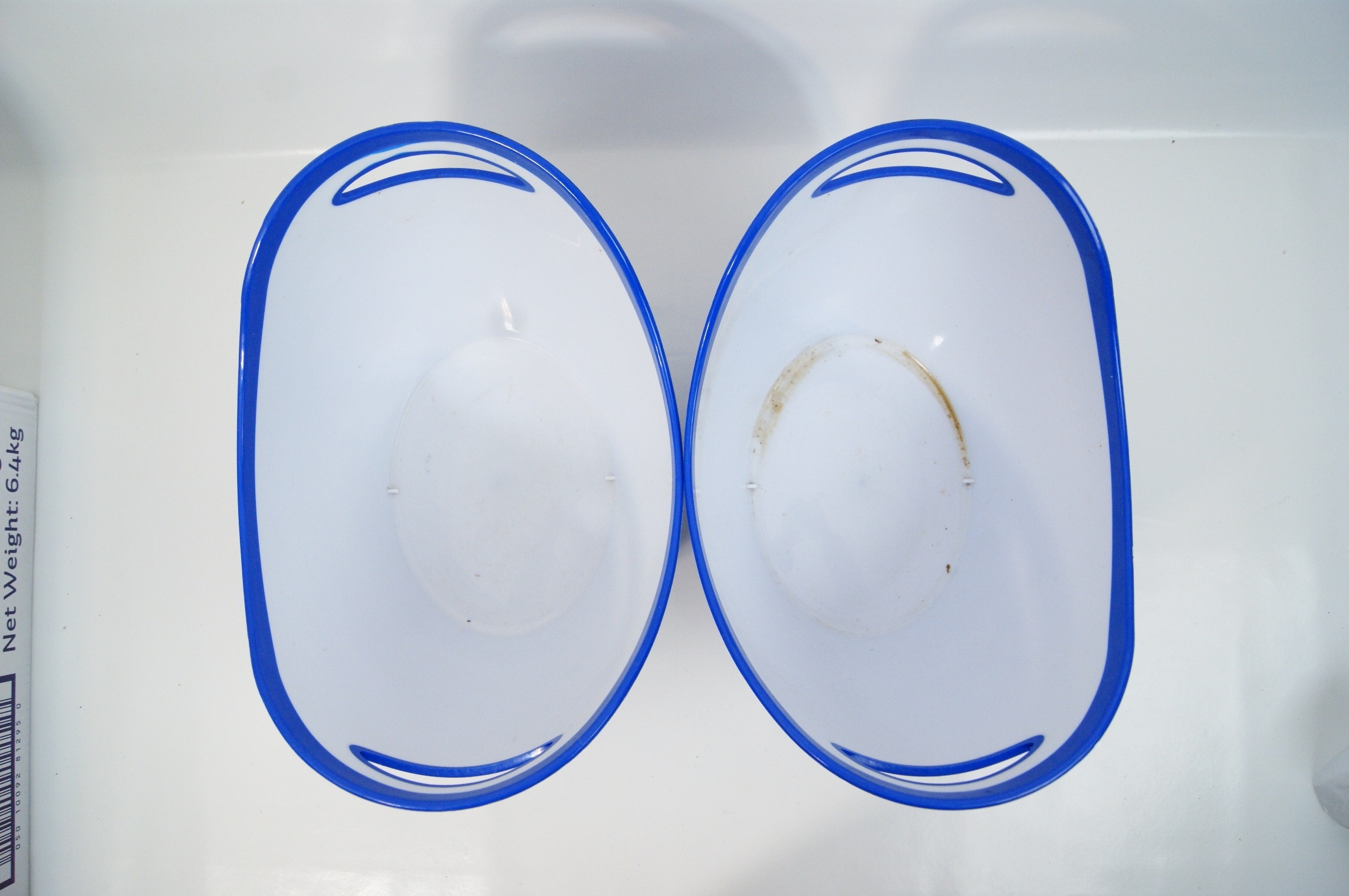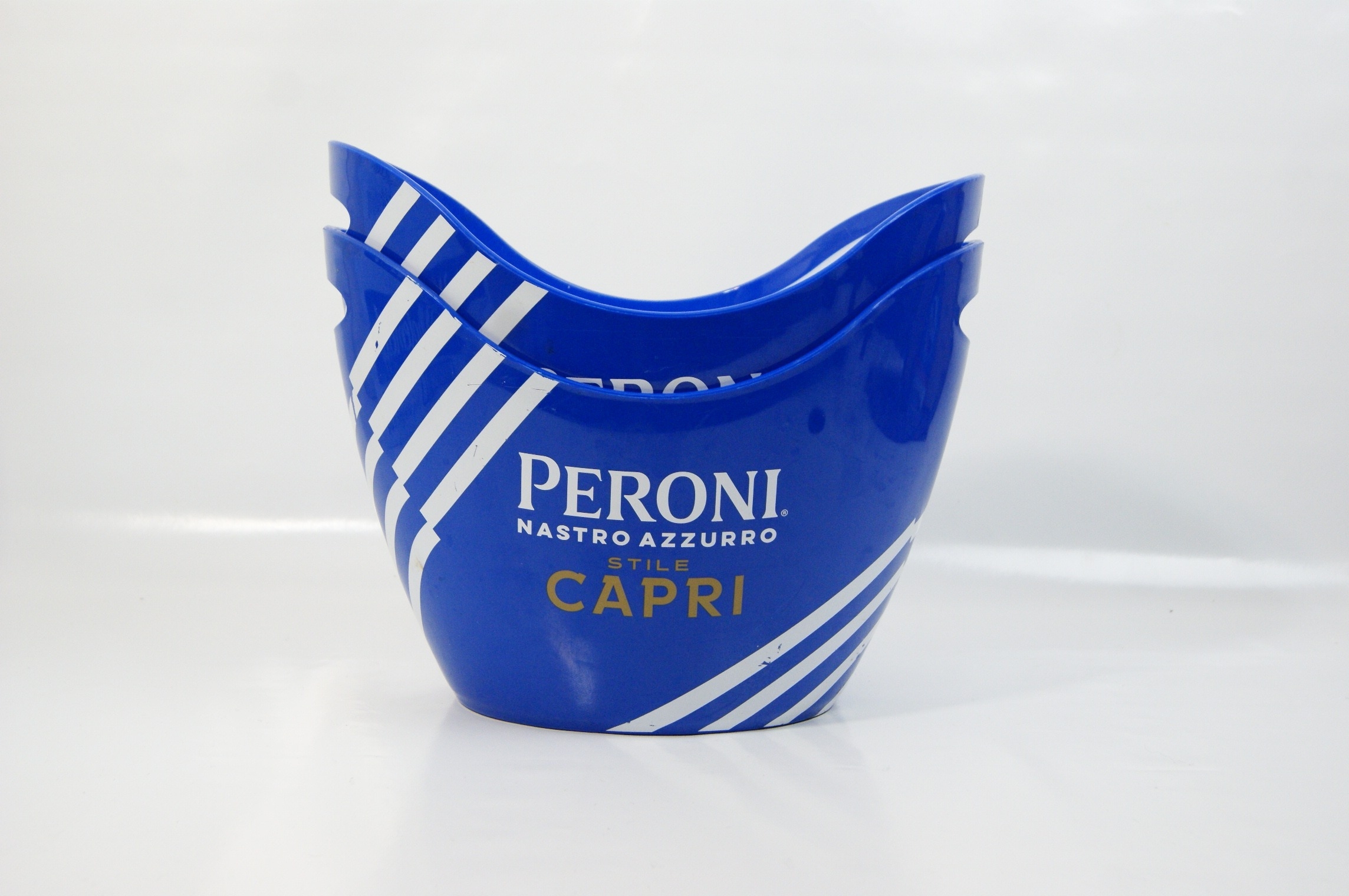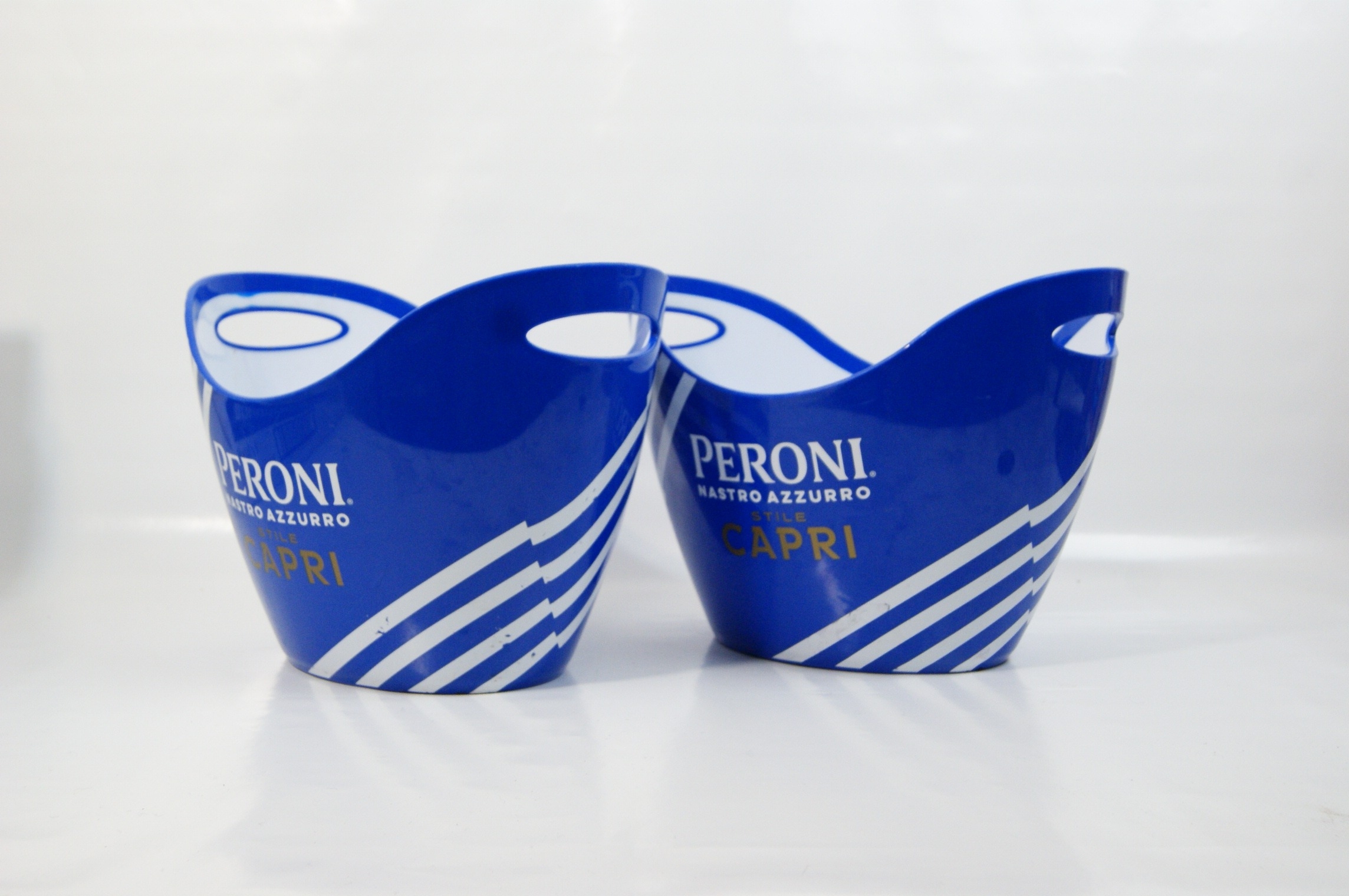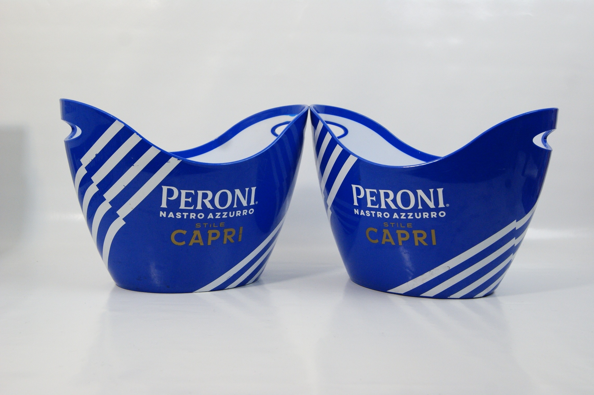 A pair of contemporary promotional ice buckets for the Peroni Nastro Azzurro Stile Capri lager line. These buckets are constructed from durable blue moulded plastic with a contrasting white interior. The design, attributed to the agency Outlaw, features a distinctive undulating wavy top rim with integrated handle cutouts. The exterior is decorated with the Peroni Nastro Azzurro logo in white and Stile Capri in gold-tone lettering. The sides are accented with four diagonal white racing stripes that wrap around the body. These items were produced as commercial point-of-sale barware to accompany the 2023 launch of the Mediterranean-inspired Stile Capri variety. Approximately 22cm x 30cm x 20cm.