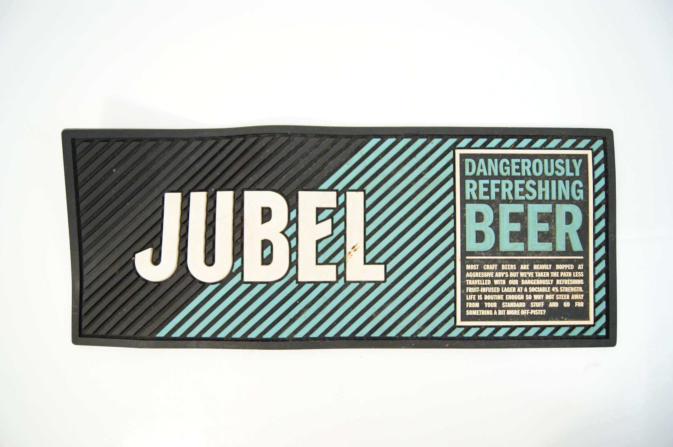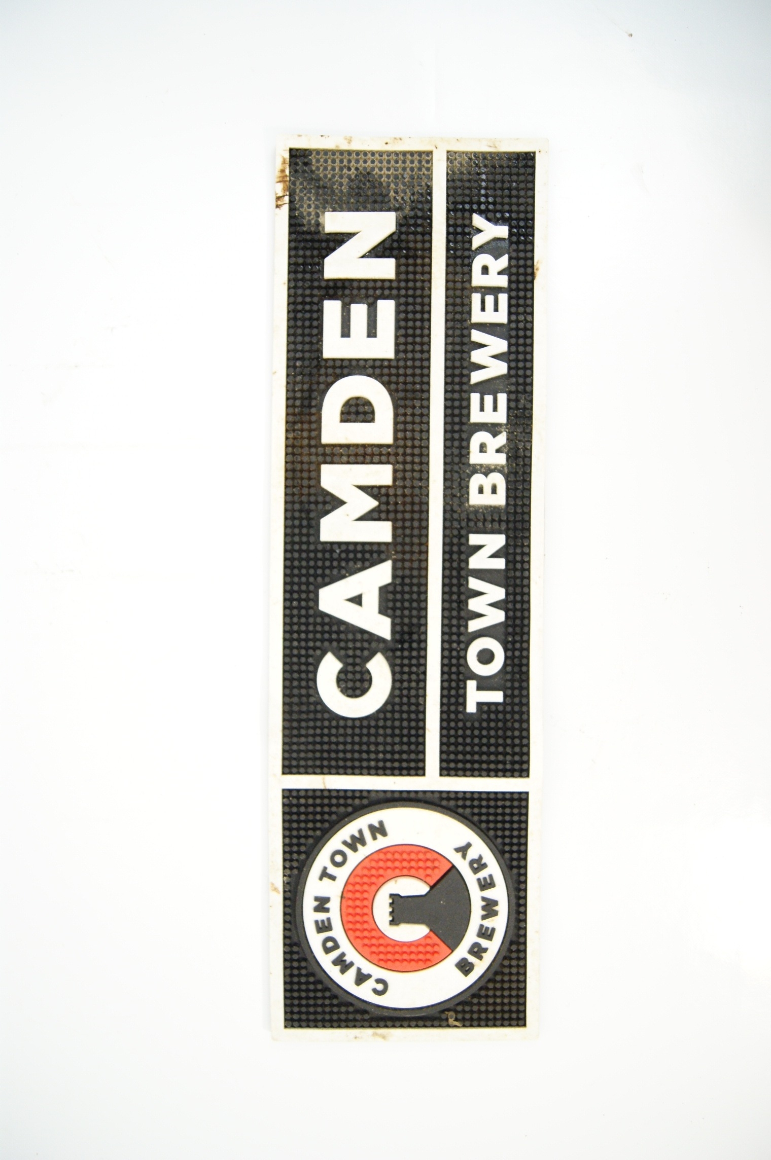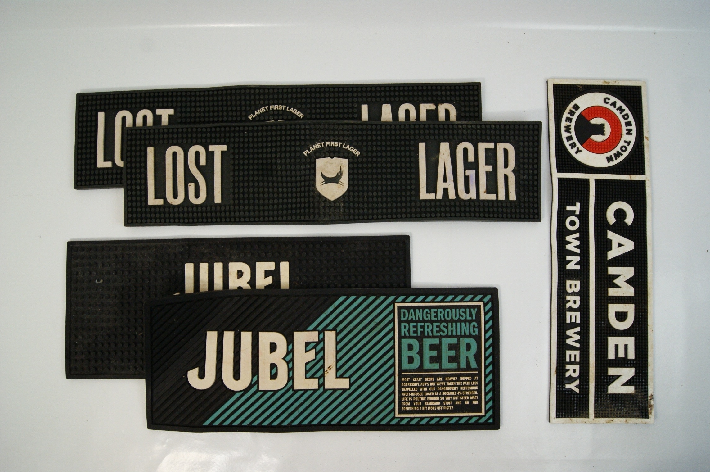 A collection of five commercial-grade bar runners from prominent UK craft breweries, including Camden Town Brewery, BrewDog, and Jubel. The lot comprises one Camden Town Brewery mat featuring the circular castle logo and raised white lettering; two BrewDog Lost Lager mats with the Planet First Lager shield logo and bold branding; and two Jubel Beer mats, one featuring The Apres Beer tagline and the other a graphic teal-striped design with descriptive marketing copy. All items are constructed from heavy-duty moulded PVC or rubber with studded surfaces designed for glassware protection and moisture collection. Contemporary. Dimensions: Largest approx. 60cm x 12cm, Smallest approx. 50cm x 12cm.