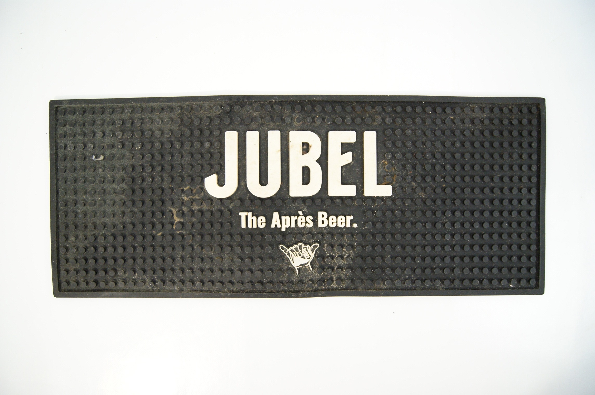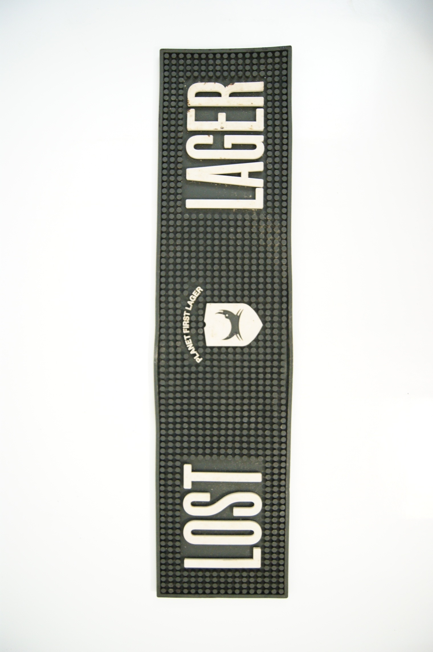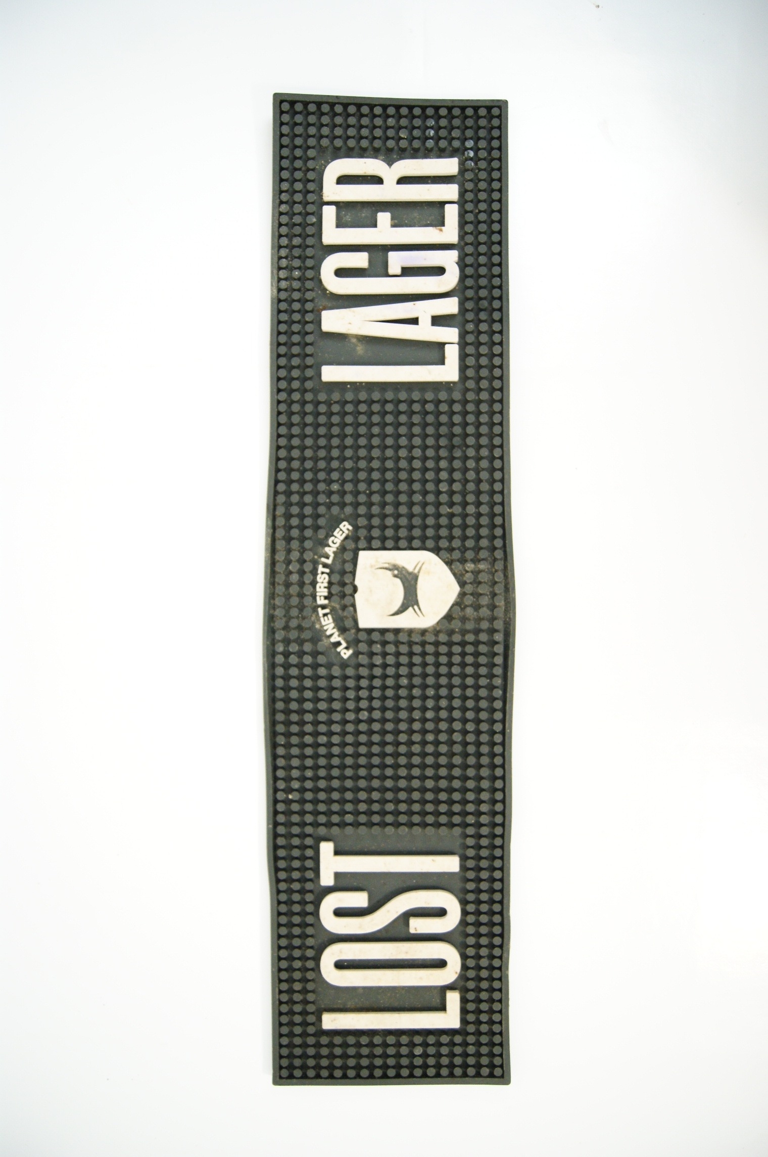 A collection of five commercial-grade bar runners from prominent UK craft breweries, including Camden Town Brewery, BrewDog, and Jubel. The lot comprises one Camden Town Brewery mat featuring the circular castle logo and raised white lettering; two BrewDog Lost Lager mats with the Planet First Lager shield logo and bold branding; and two Jubel Beer mats, one featuring The Apres Beer tagline and the other a graphic teal-striped design with descriptive marketing copy. All items are constructed from heavy-duty moulded PVC or rubber with studded surfaces designed for glassware protection and moisture collection. Contemporary. Dimensions: Largest approx. 60cm x 12cm, Smallest approx. 50cm x 12cm.
