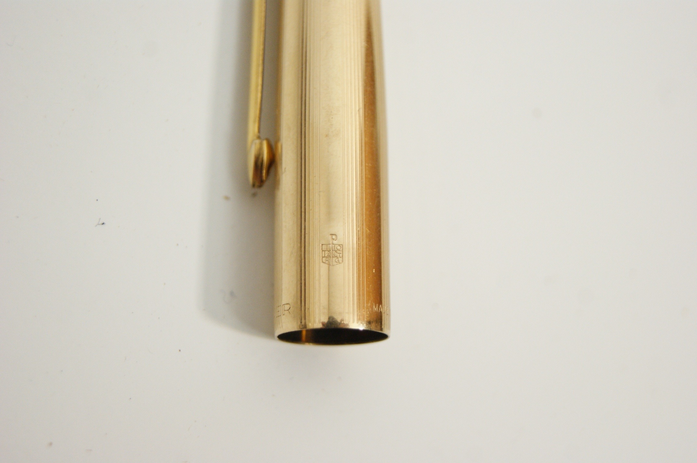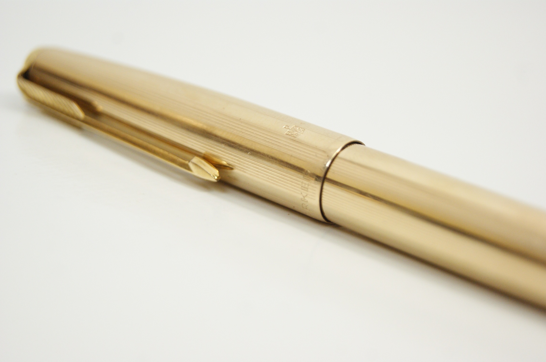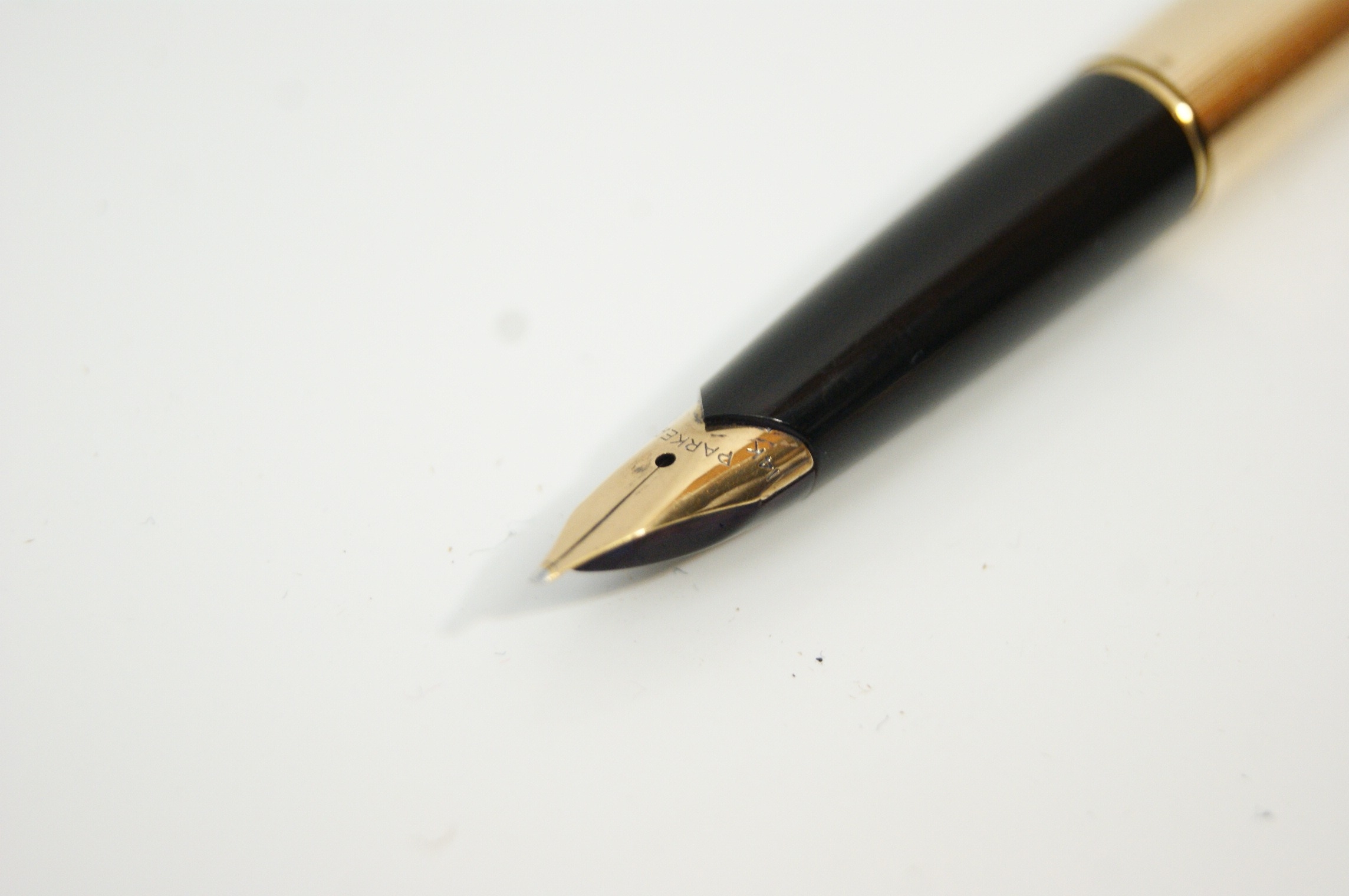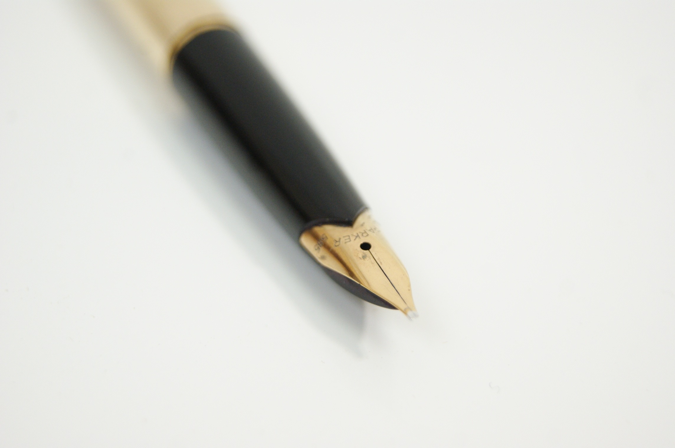 Vintage Parker fountain pen with rolled gold plated cap and black barrel. Marked Parker on the nib and cap. Supplied in original Parker box. Classic mid-century writing instrument made in England. Good vintage condition with light signs of use. A nice collectible Parker pen.