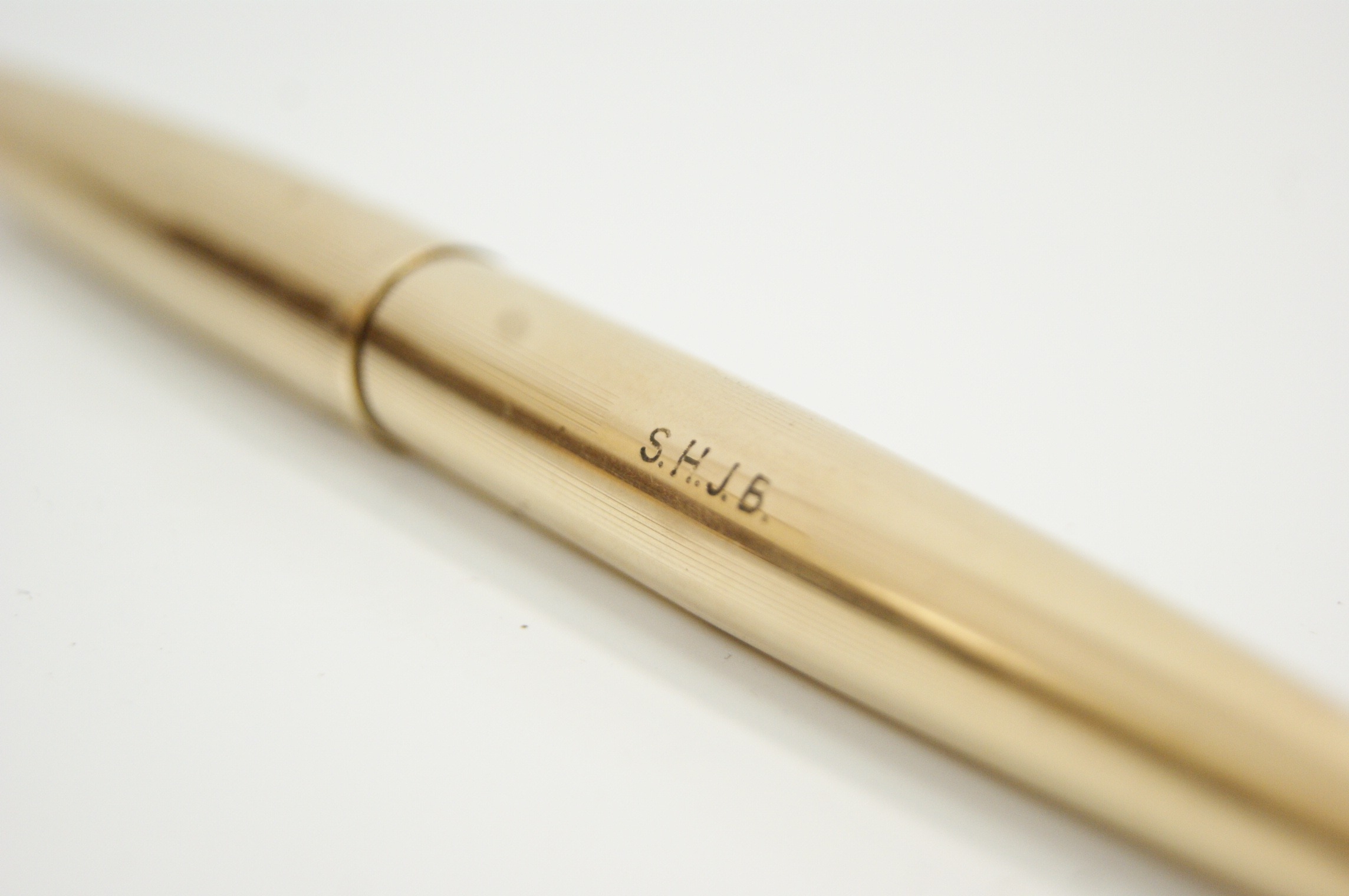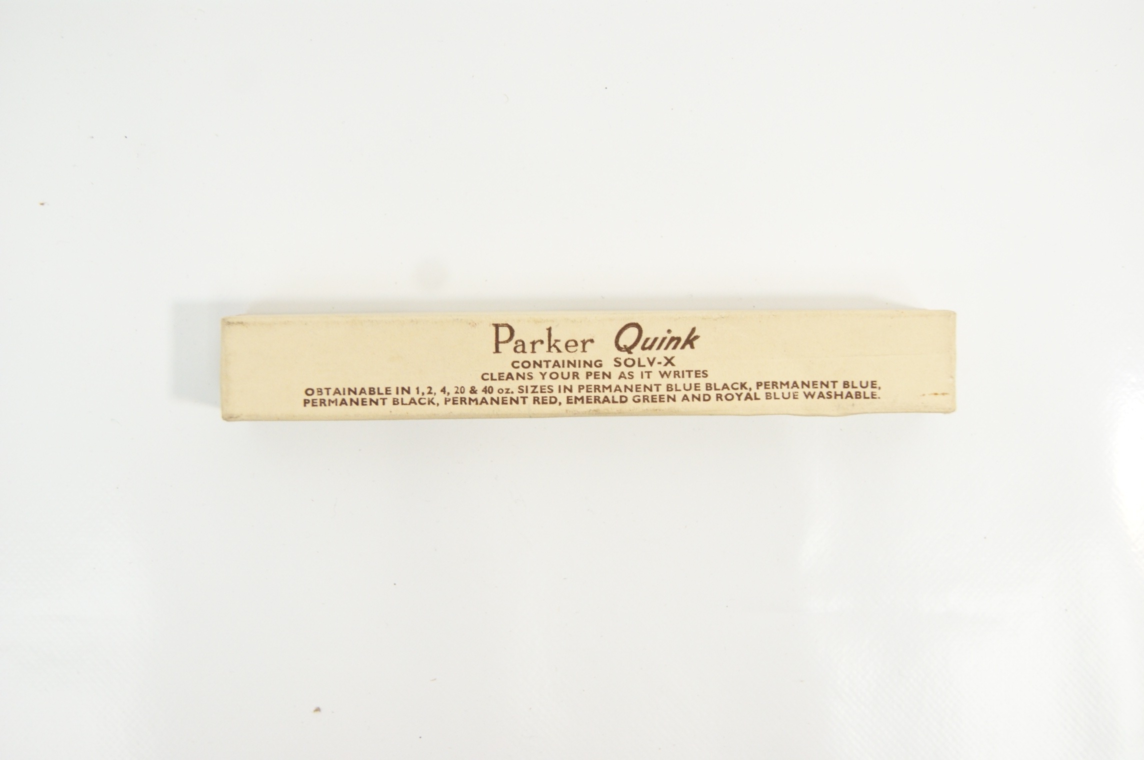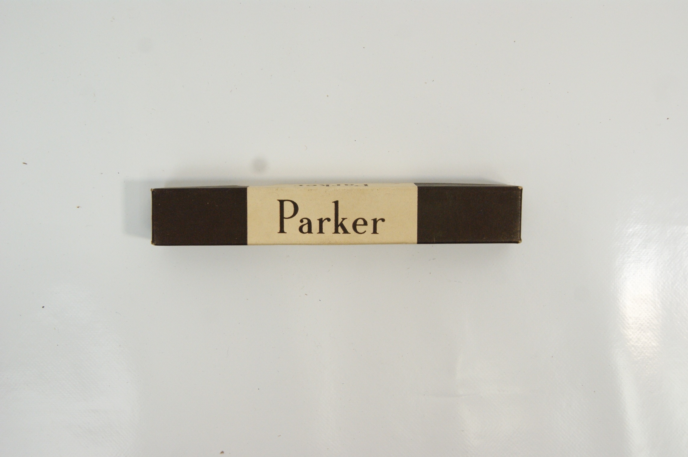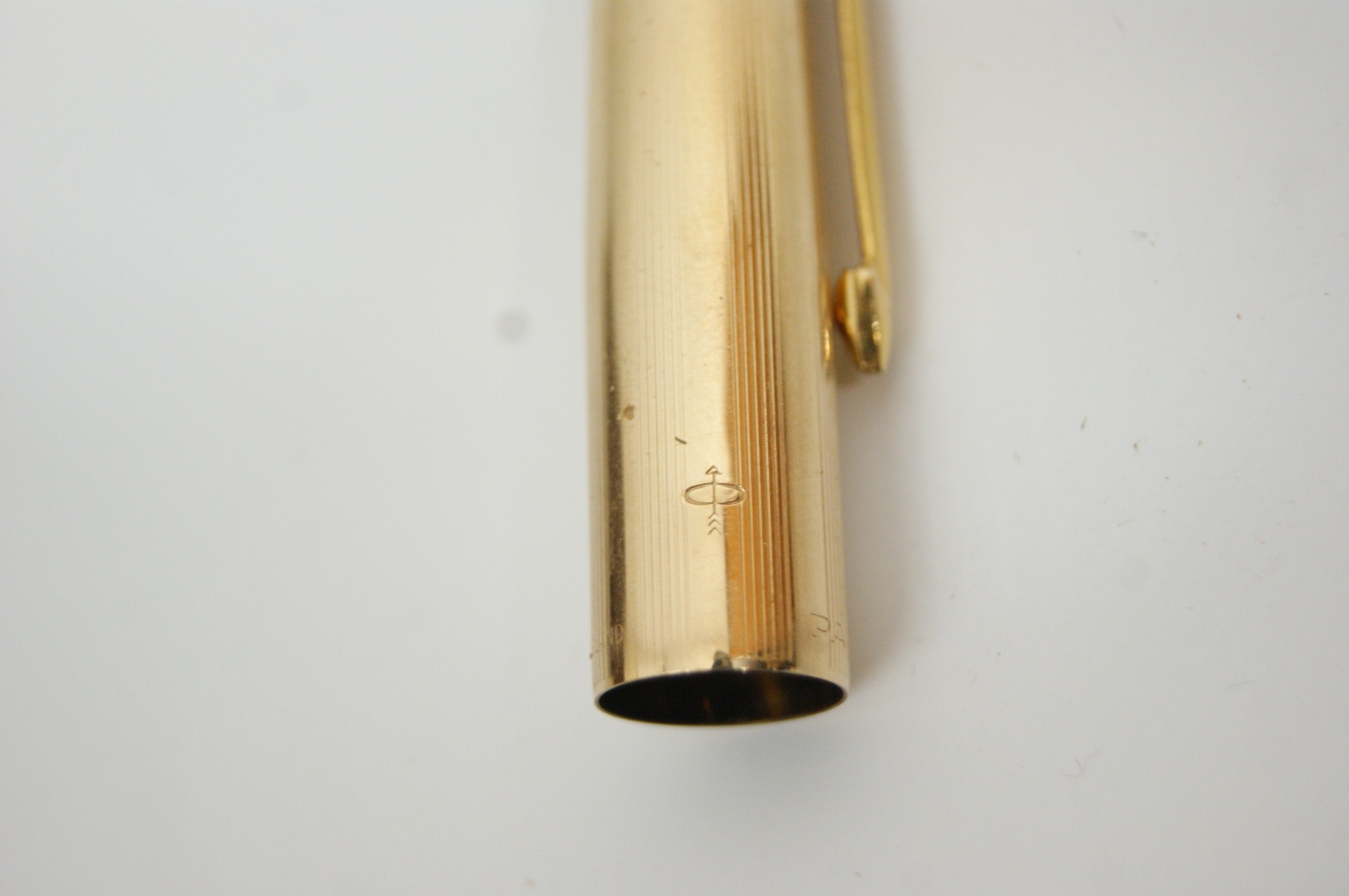 Vintage Parker fountain pen with rolled gold plated cap and black barrel. Marked Parker on the nib and cap. Supplied in original Parker box. Classic mid-century writing instrument made in England. Good vintage condition with light signs of use. A nice collectible Parker pen.