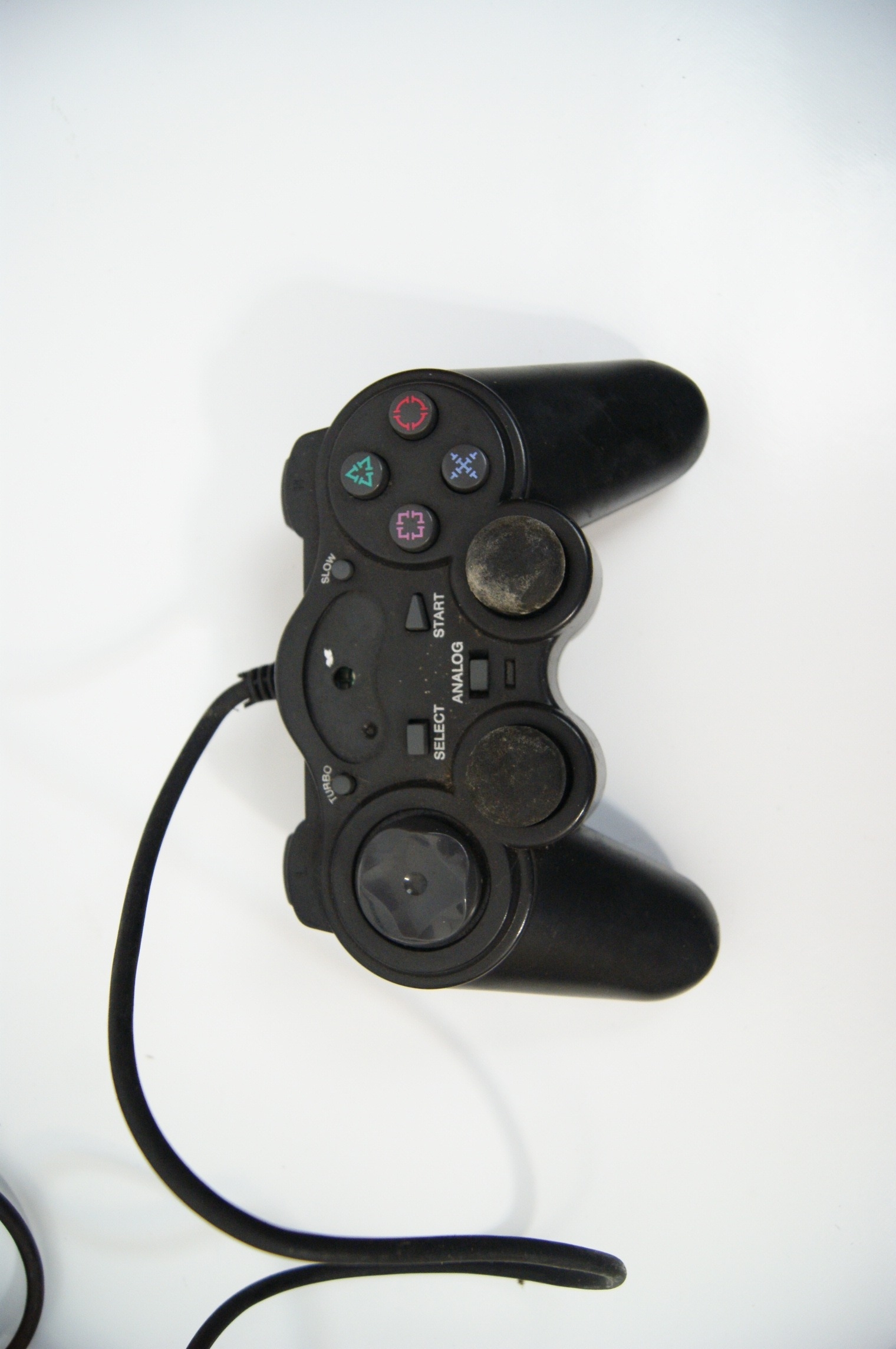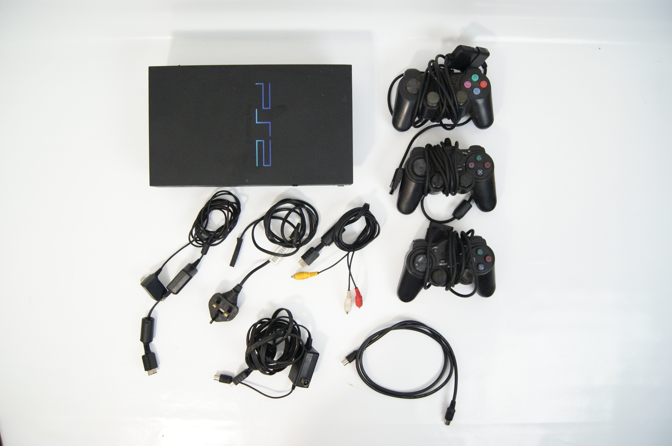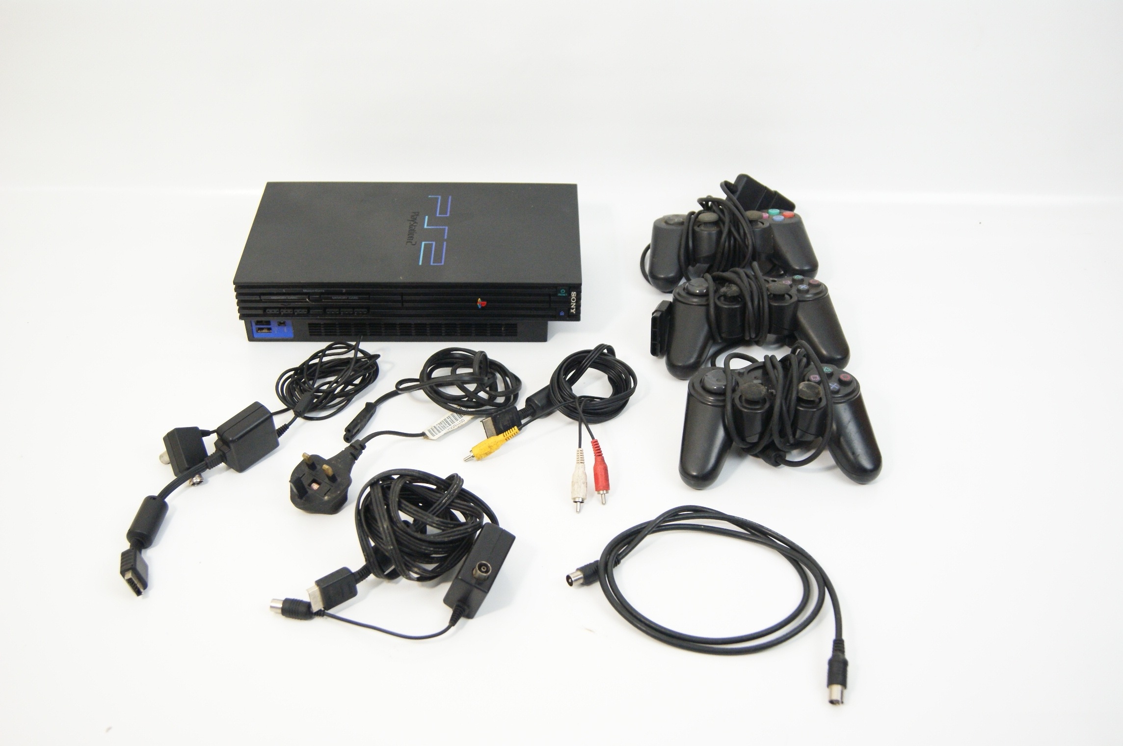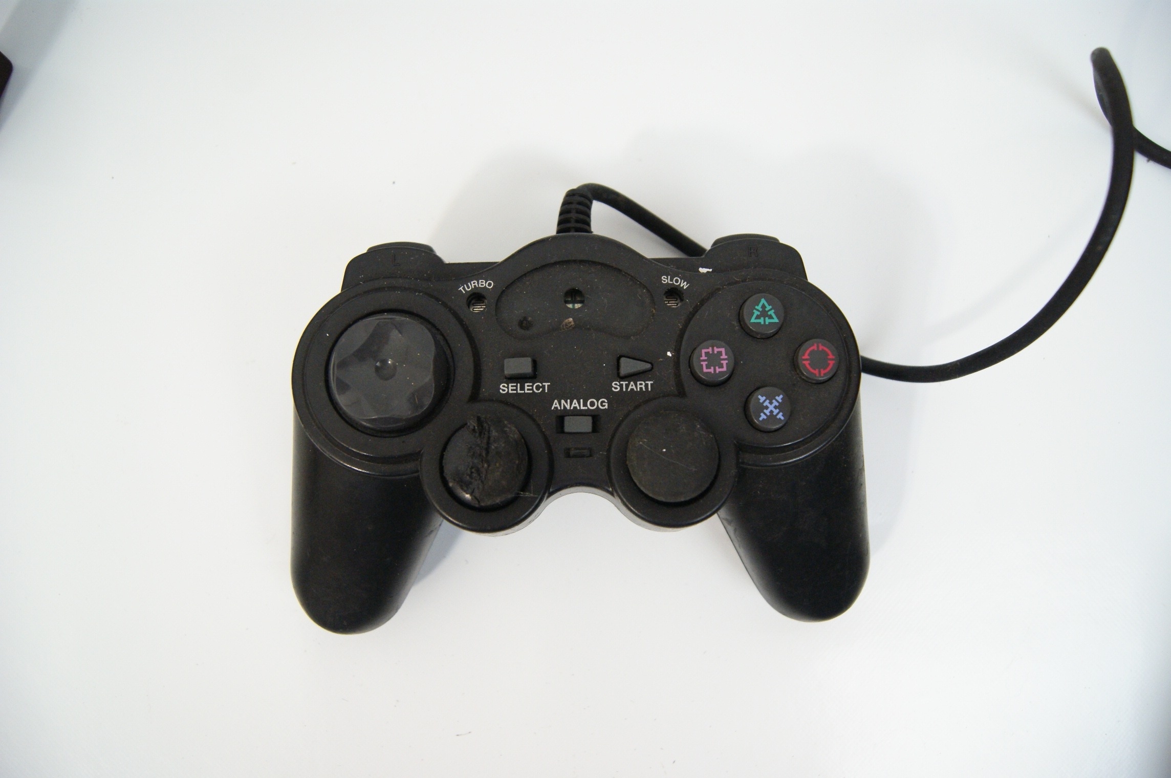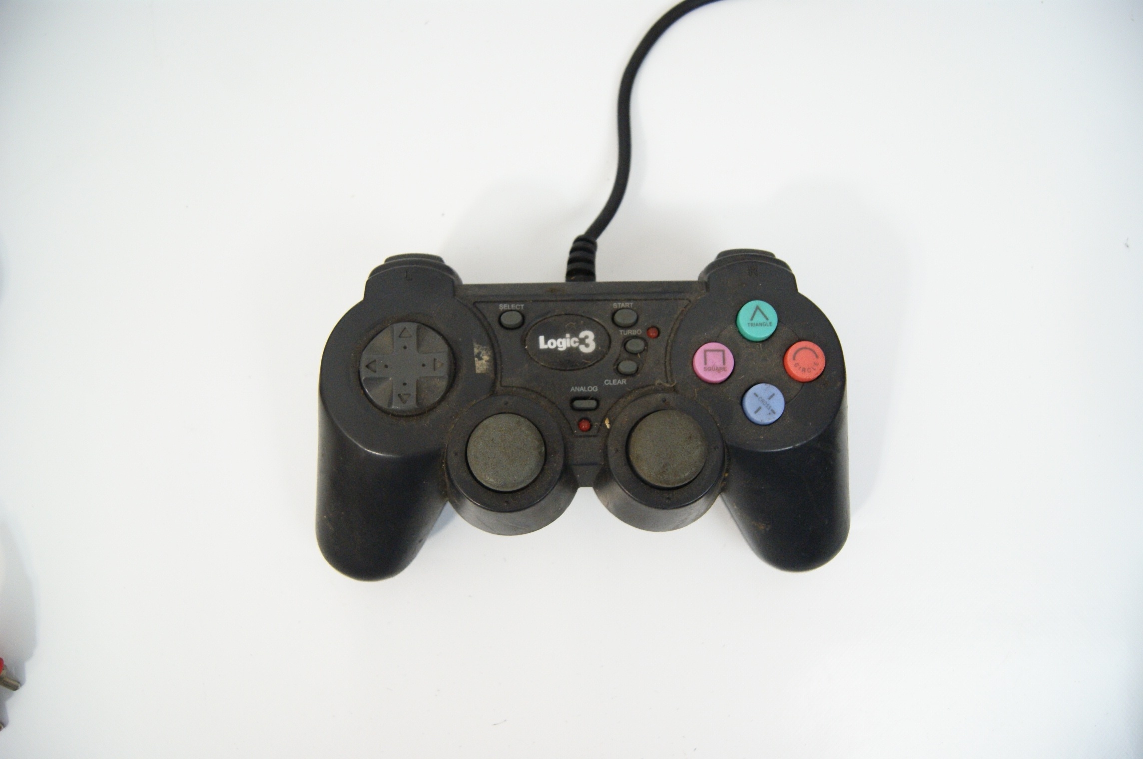Manufacturer: Sony. Model: PlayStation 2 (SCPH-30003, PAL region). Serial Number: B1312276 (Barcode: S01-1312276-8). Processor: Emotion Engine @ 294.912 MHz. RAM: 32 MB Direct RDRAM. Storage: Expansion bay for optional HDD; requires external Memory Cards for gameplay (not included). Accessories: Three third-party wired controllers including one Logic3 controller and two generic "Turbo/Slow" controllers; one AC power cable with UK 3-pin plug; one Sony RFU Adaptor (Model SCPH-1122); one composite AV cable (Red, White, Yellow RCA); and various RF/Coaxial connecting cables.
