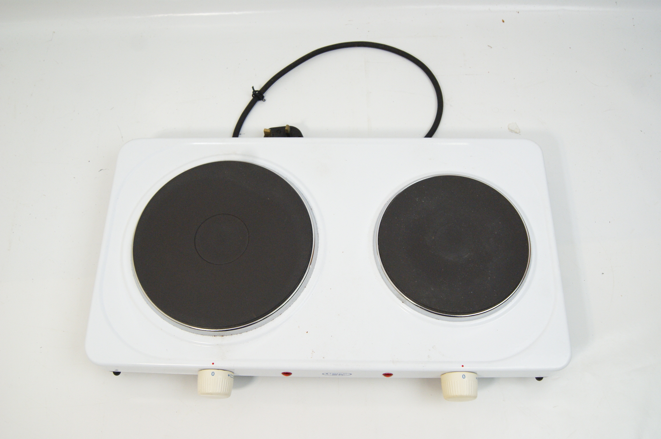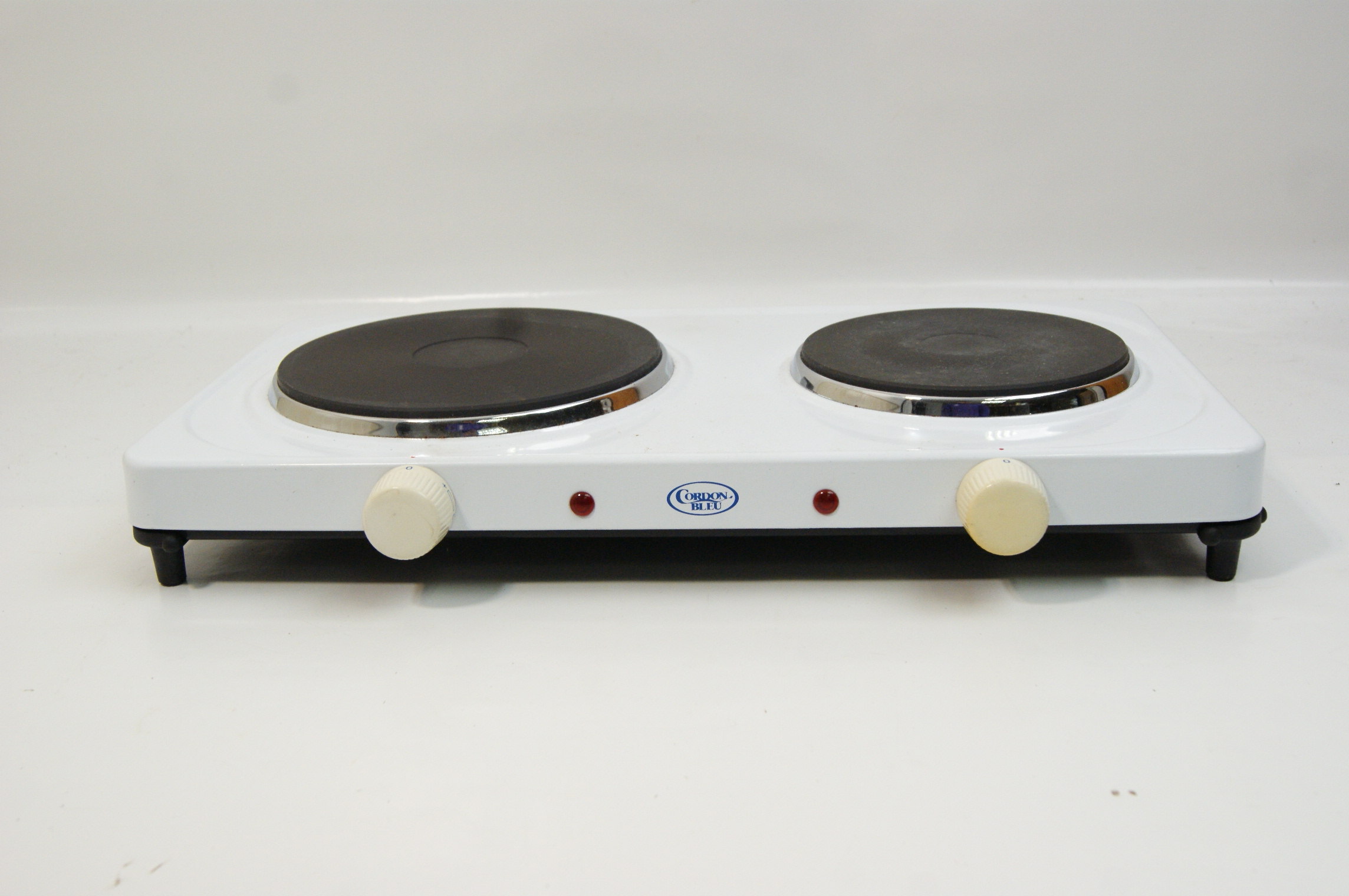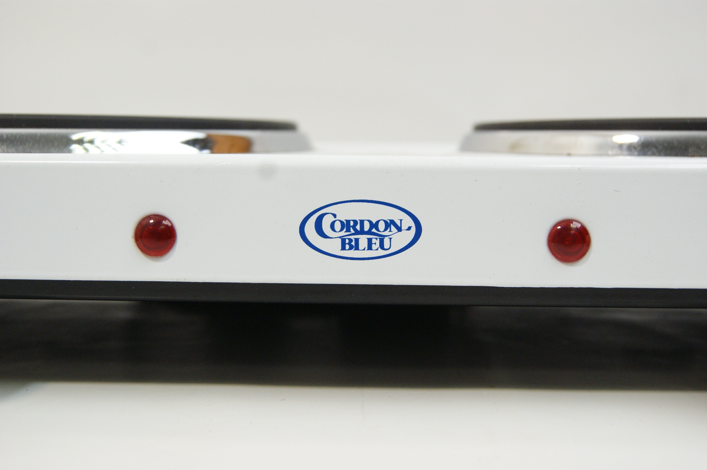 A Cordon Bleu portable double electric hot plate featuring a twin-burner design with a 2000W power capacity. The appliance is constructed with a white enamel-finished metal housing and two sealed cast iron heating elements of unequal diameters. The front control panel includes two variable temperature control knobs with numerical settings and two red power indicator lamps. The unit is mounted on four black plastic feet and is fitted with a black power cable and a standard UK three-pin plug.