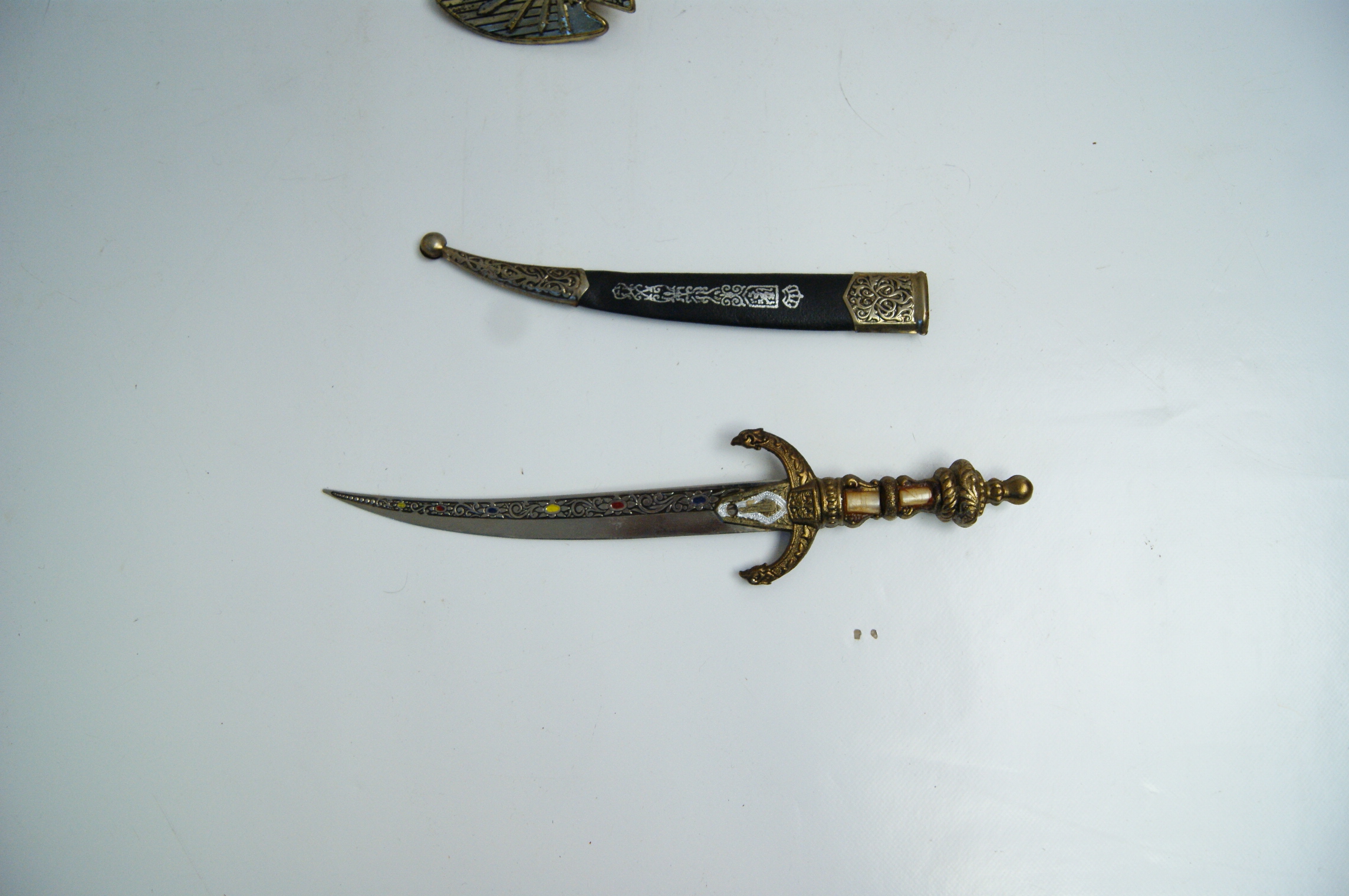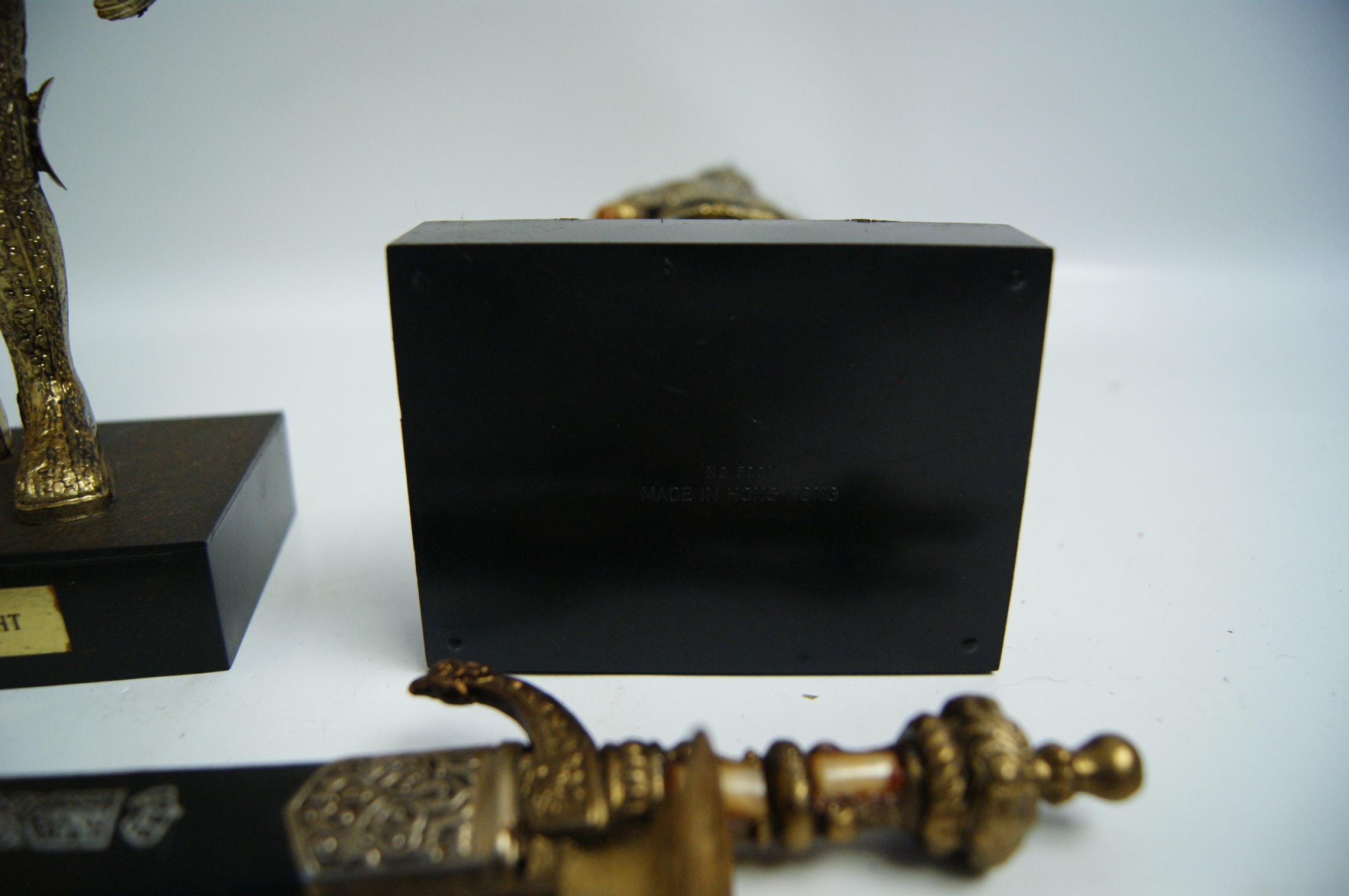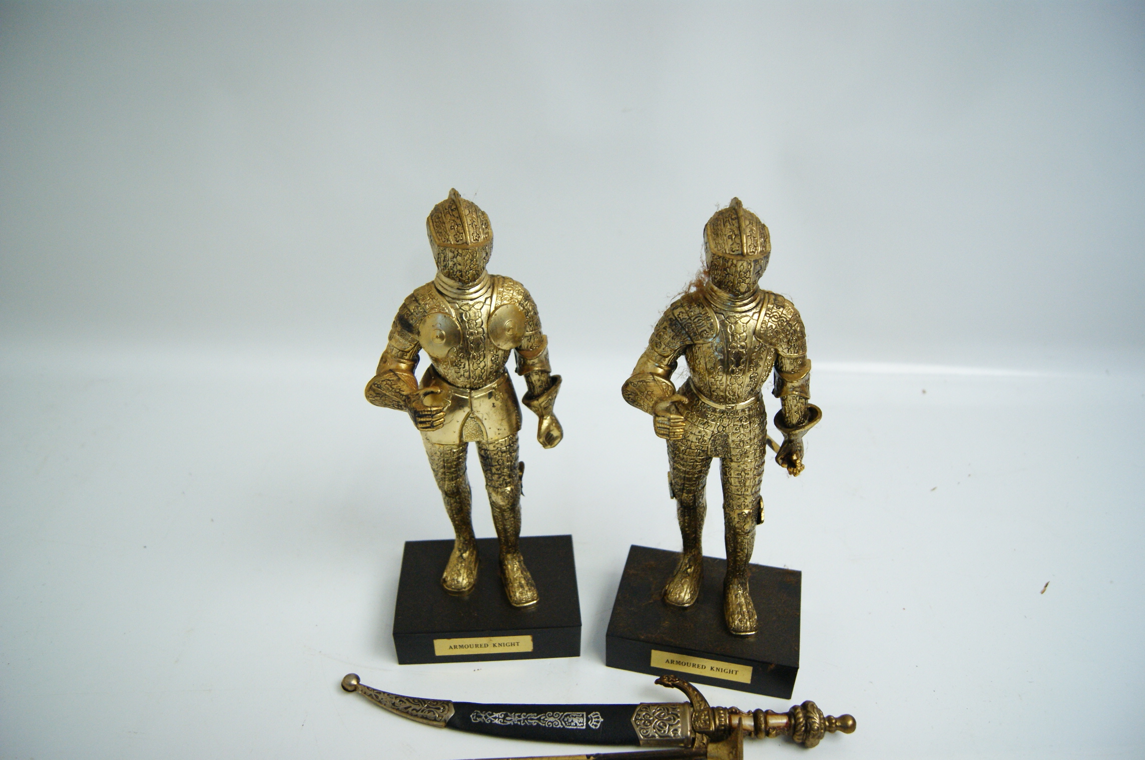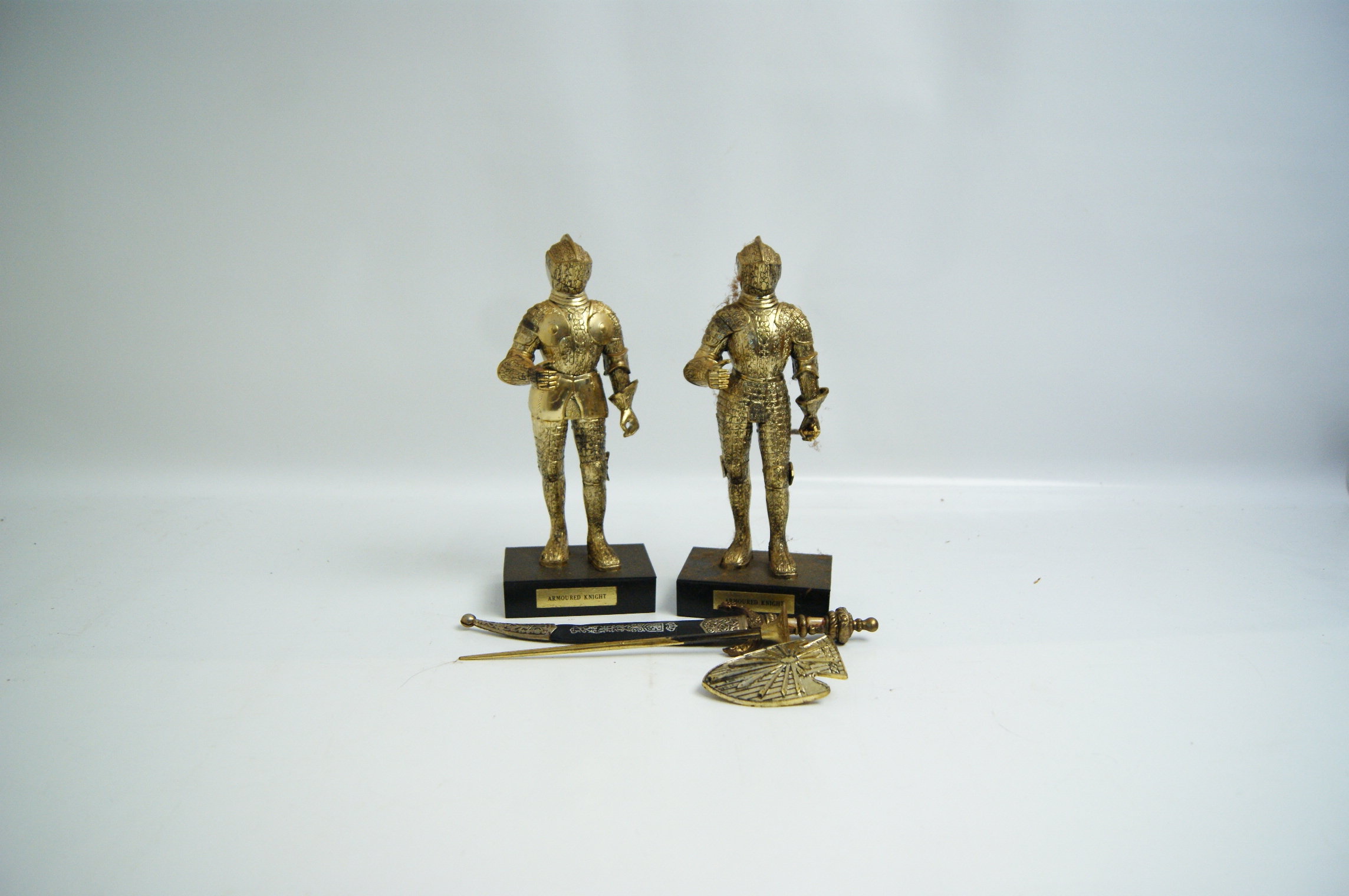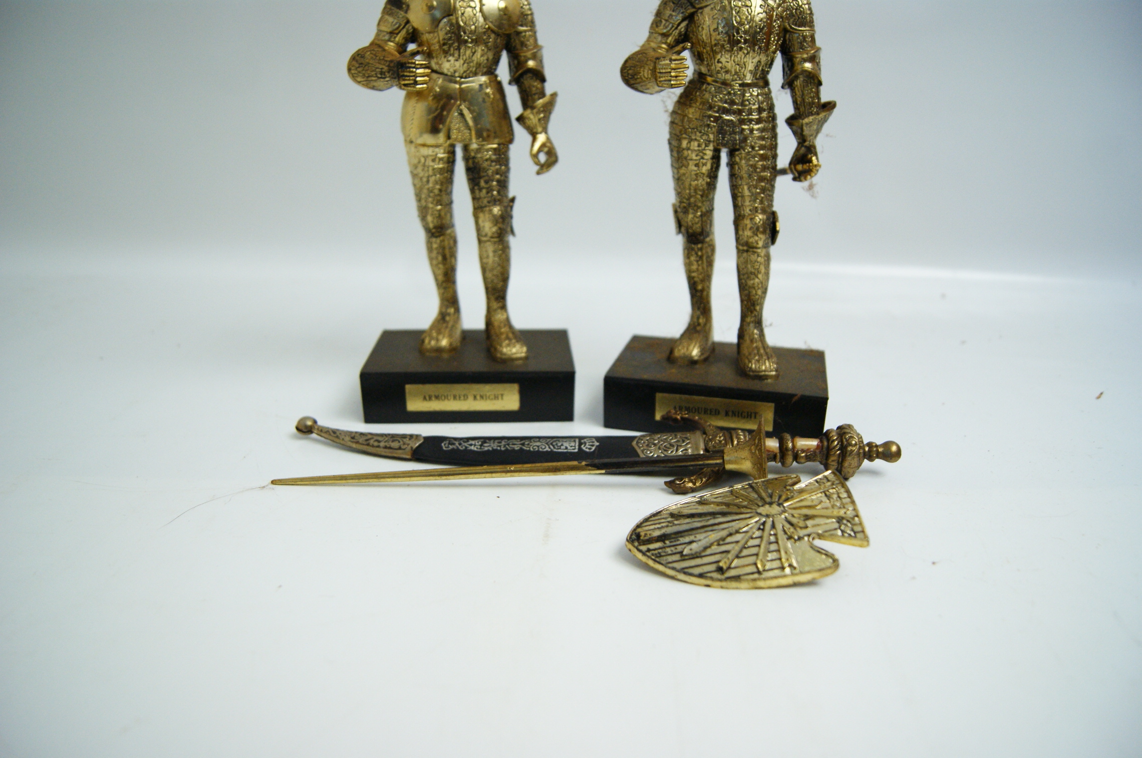 This collection consists of decorative novelty and souvenir items themed around medieval and historical weaponry, including a miniature dagger letter opener attributed to Du Marco. The lot includes two figurines depicting knights in full plate armour with a gold-toned metallic finish. These are mounted on black rectangular plastic bases, each featuring a small gilt label reading ARMOURED KNIGHT. The underside of one base is stamped with NO. 5001 and MADE IN HONG KONG. The decorative miniature curved dagger is styled after a Middle Eastern jambiya. The blade is single-edged with etched scrollwork decoration and small inset spots of red, yellow, and blue enamel-like pigment. The hilt is cast gold-toned metal with an ornate crossguard and pommel, while the grip features banded segments of a cream-coloured composite material. The accompanying black scabbard features a gold-toned cast metal locket and chape with scrolled openwork and a terminal ball. The collection also contains a small gold-toned decorative shield featuring a radial sunburst design and a thin gold-toned metal rod representing a miniature spear or pike.