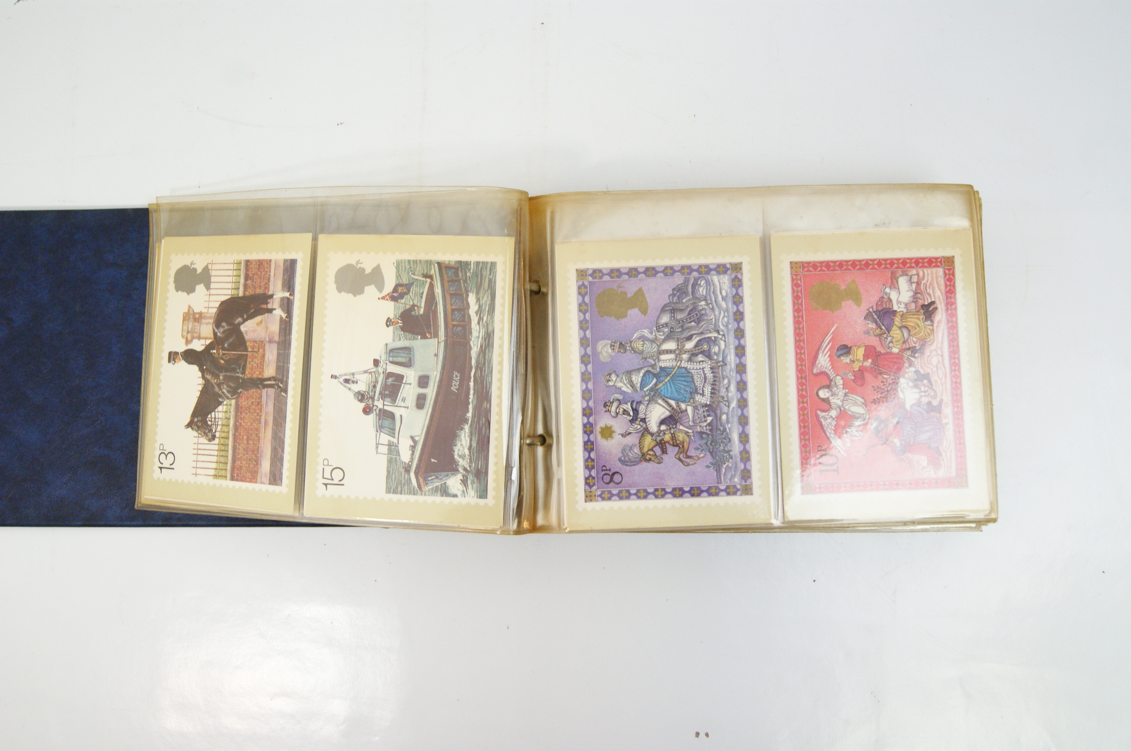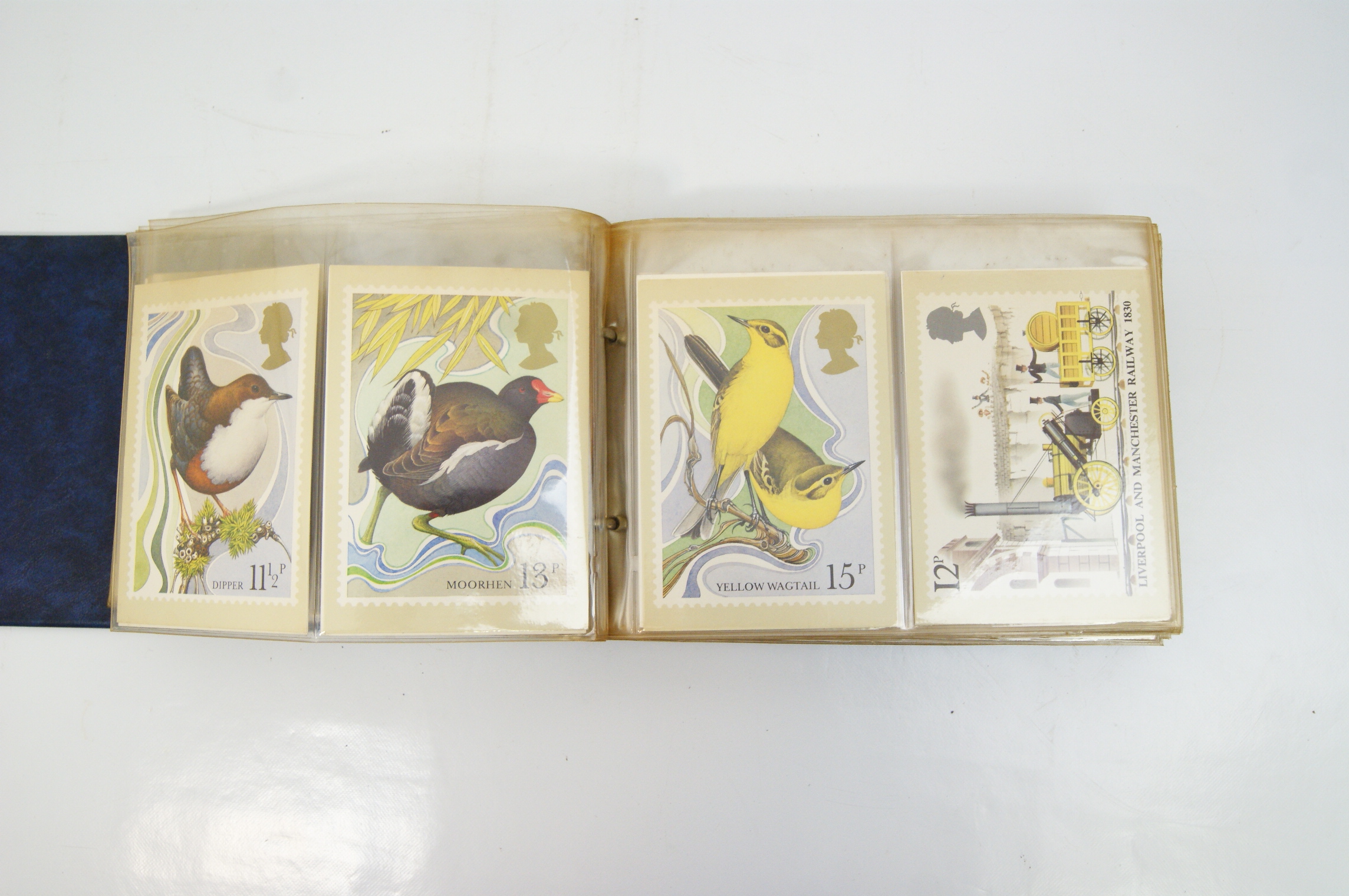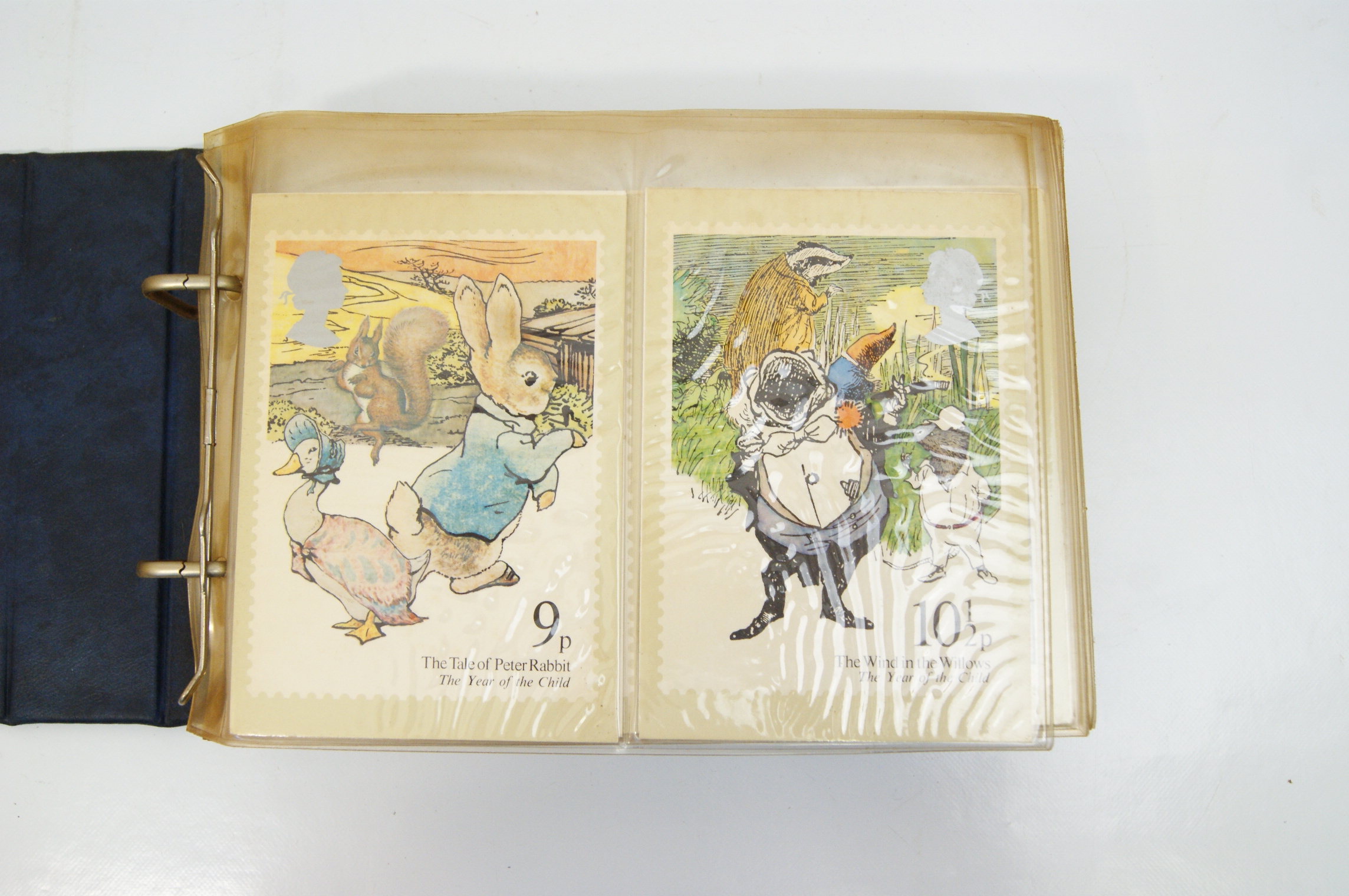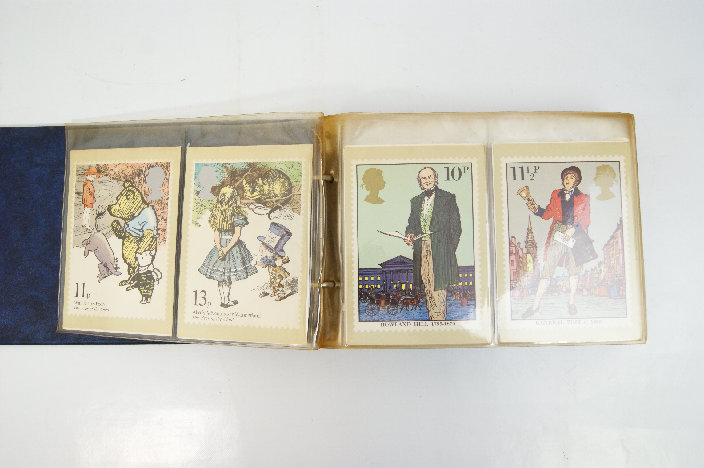 A collection of British Post Office PHQ (Picture Card) postcards presented in a blue Stanley Gibbons British Post Office Picture Card Album. The binder features gilt lettering and the SG logo on the spine. The contents consist of multiple multicoloured cards reproducing Royal Mail commemorative stamp designs from the late 1970s and early 1980s. Notable series identified include the 1979 Year of the Child featuring characters from Peter Rabbit and Alice in Wonderland, the 1980 British Birds set, the 1980 Liverpool and Manchester Railway issue, the 1981 British Customs series, and the 1981 Royal Wedding of Prince Charles and Lady Diana Spencer. Each card depicts a single stamp design with printed simulated perforations and the silhouette of Queen Elizabeth II. The cards are housed in clear plastic protective sleeves within a ring-bound mechanism. These cards were issued by the Royal Mail to provide collectors with large-scale reproductions of the artwork used for commemorative stamp releases.