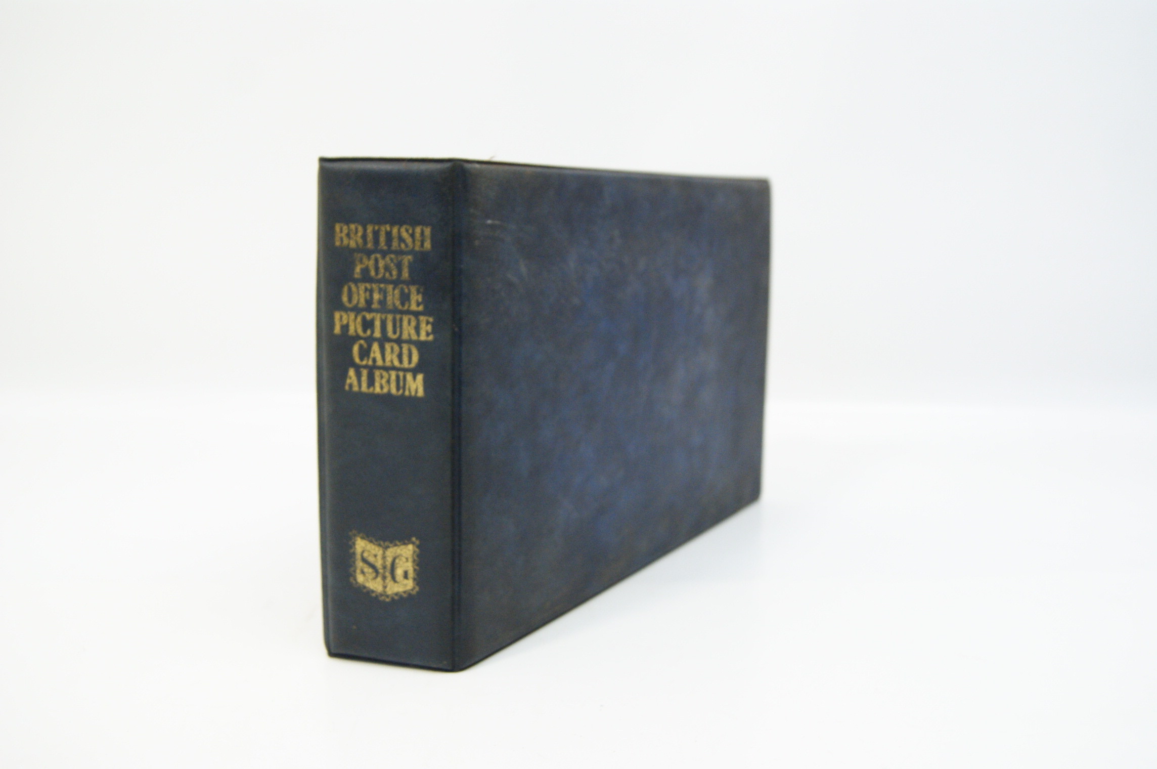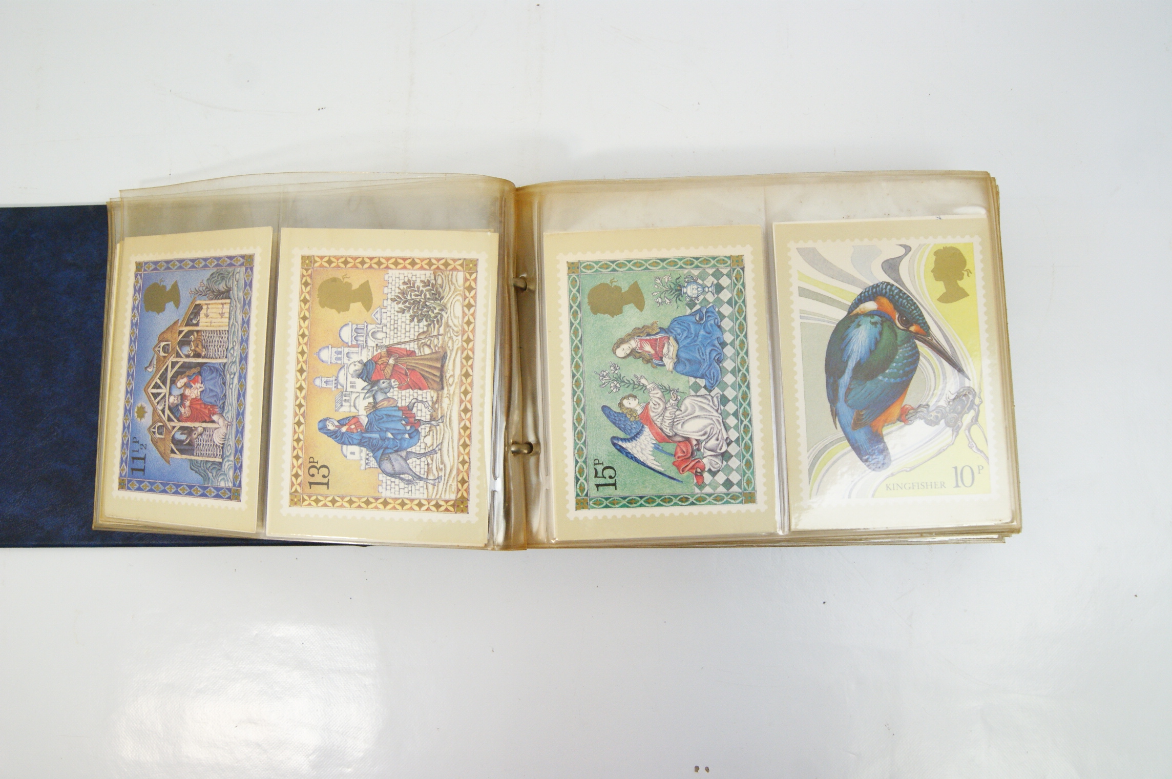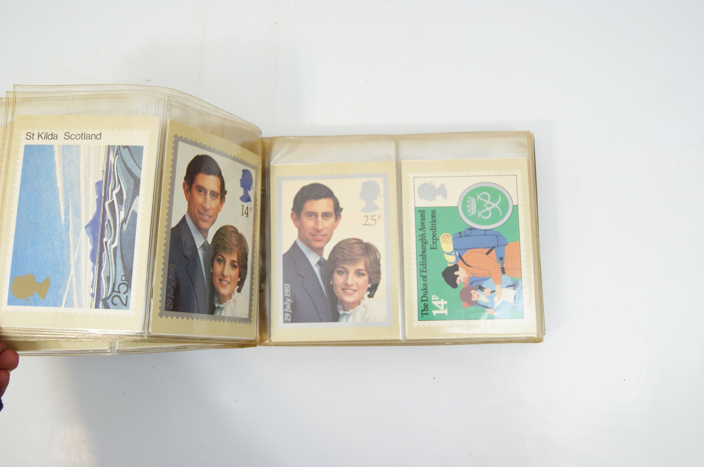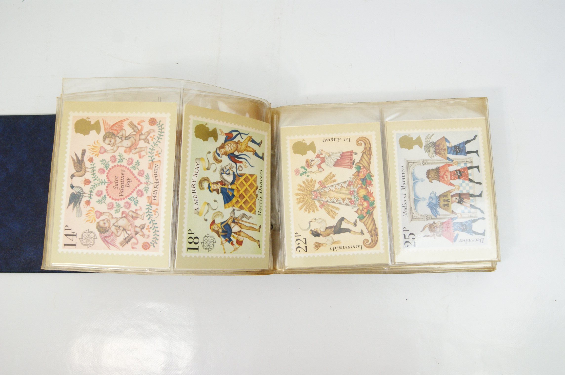A collection of British Post Office PHQ (Picture Card) postcards presented in a blue Stanley Gibbons British Post Office Picture Card Album. The binder features gilt lettering and the SG logo on the spine. The contents consist of multiple multicoloured cards reproducing Royal Mail commemorative stamp designs from the late 1970s and early 1980s. Notable series identified include the 1979 Year of the Child featuring characters from Peter Rabbit and Alice in Wonderland, the 1980 British Birds set, the 1980 Liverpool and Manchester Railway issue, the 1981 British Customs series, and the 1981 Royal Wedding of Prince Charles and Lady Diana Spencer. Each card depicts a single stamp design with printed simulated perforations and the silhouette of Queen Elizabeth II. The cards are housed in clear plastic protective sleeves within a ring-bound mechanism. These cards were issued by the Royal Mail to provide collectors with large-scale reproductions of the artwork used for commemorative stamp releases.