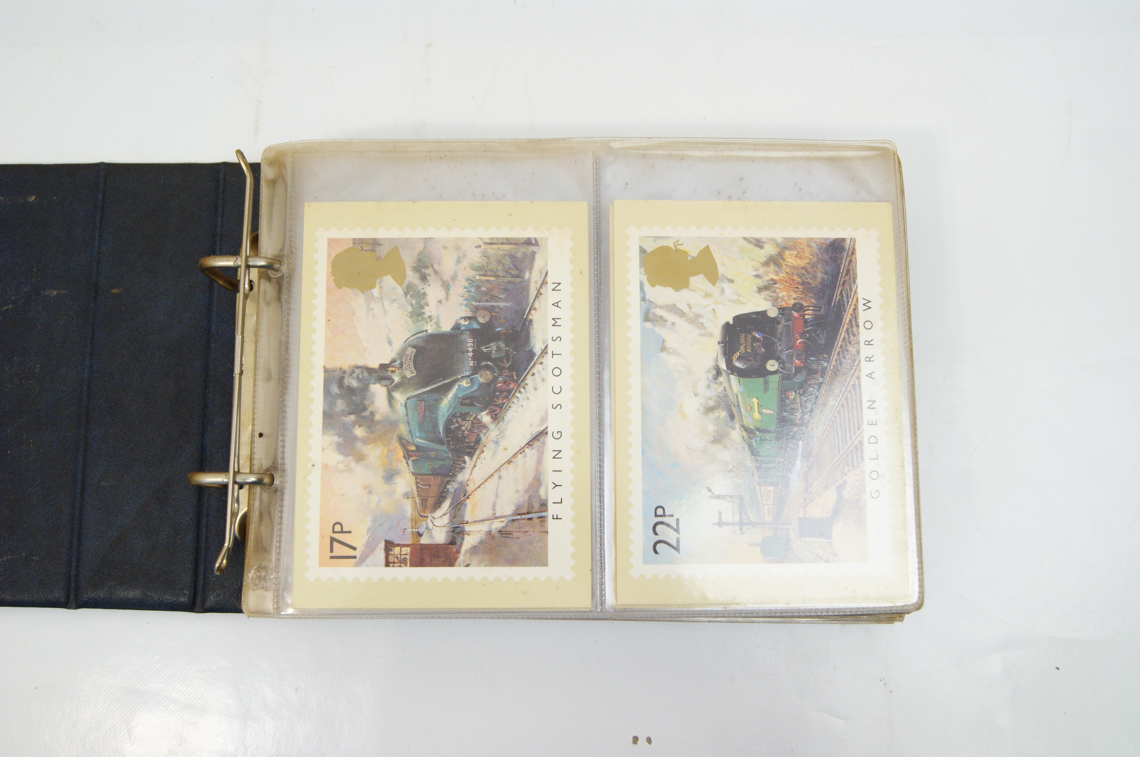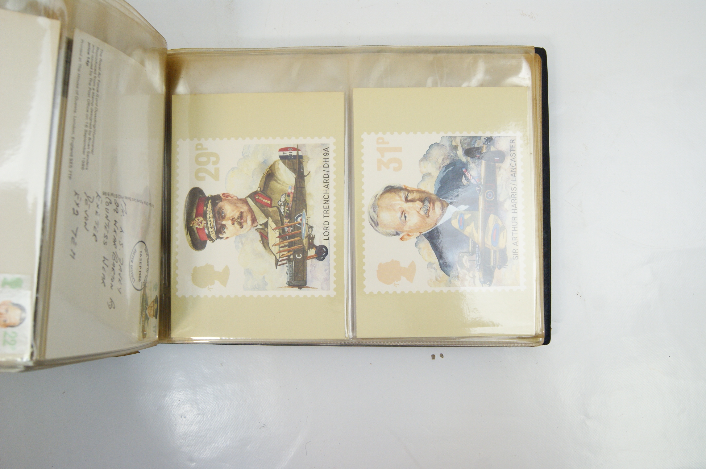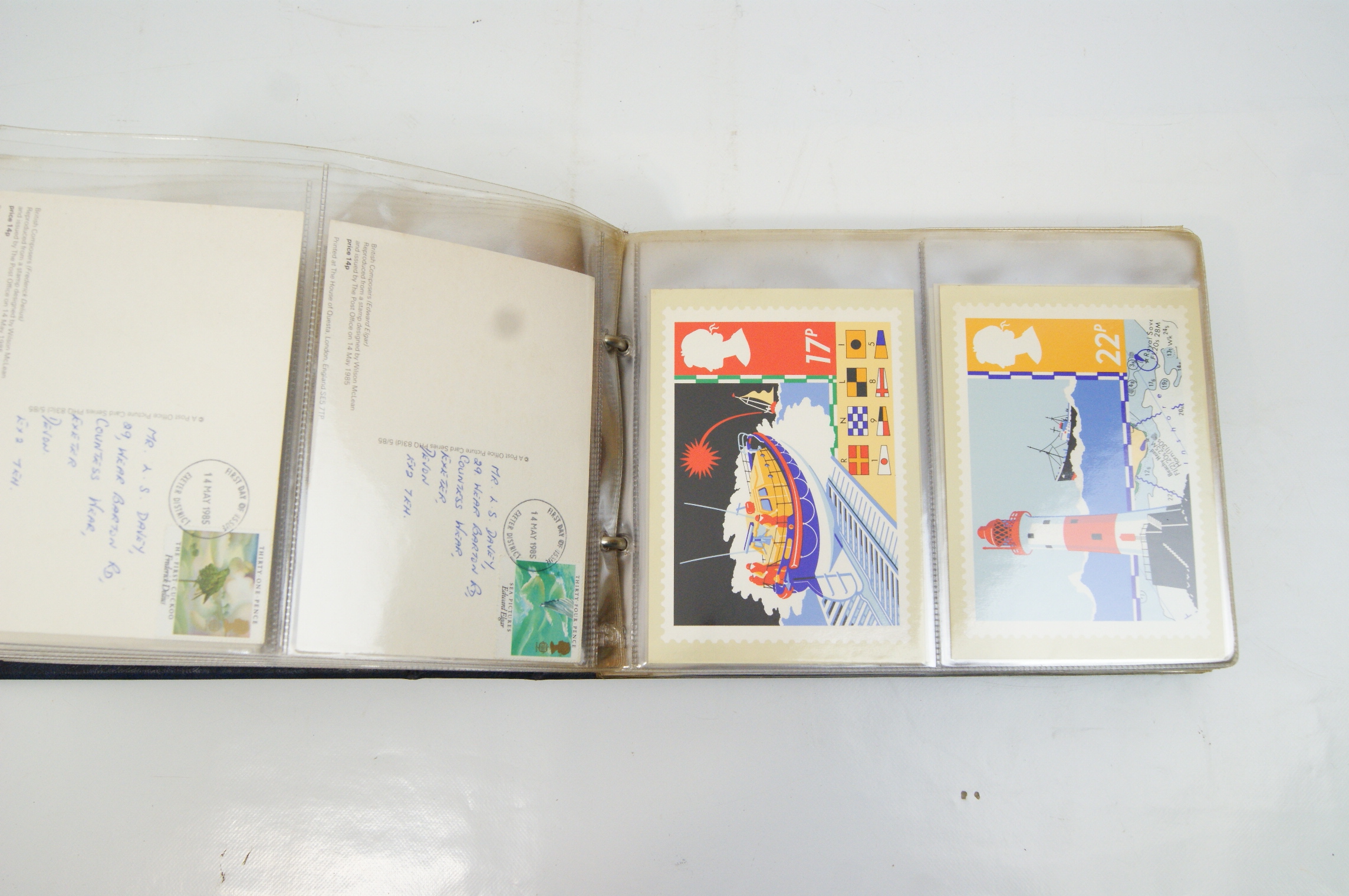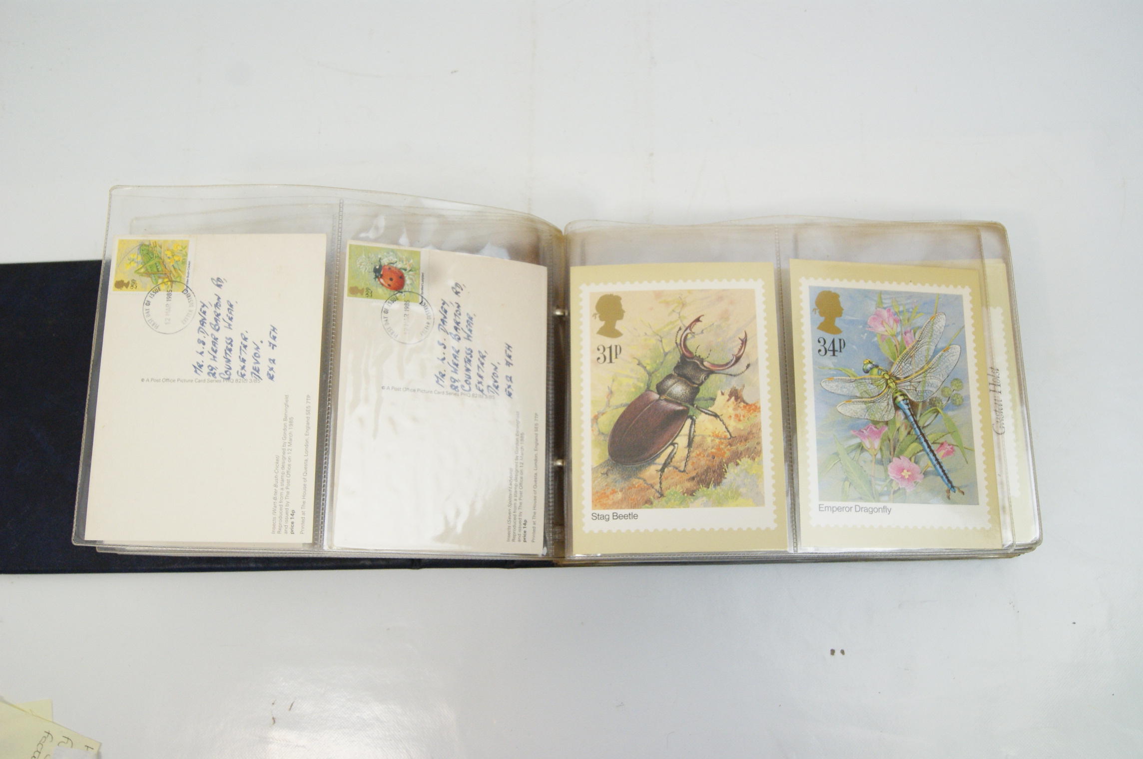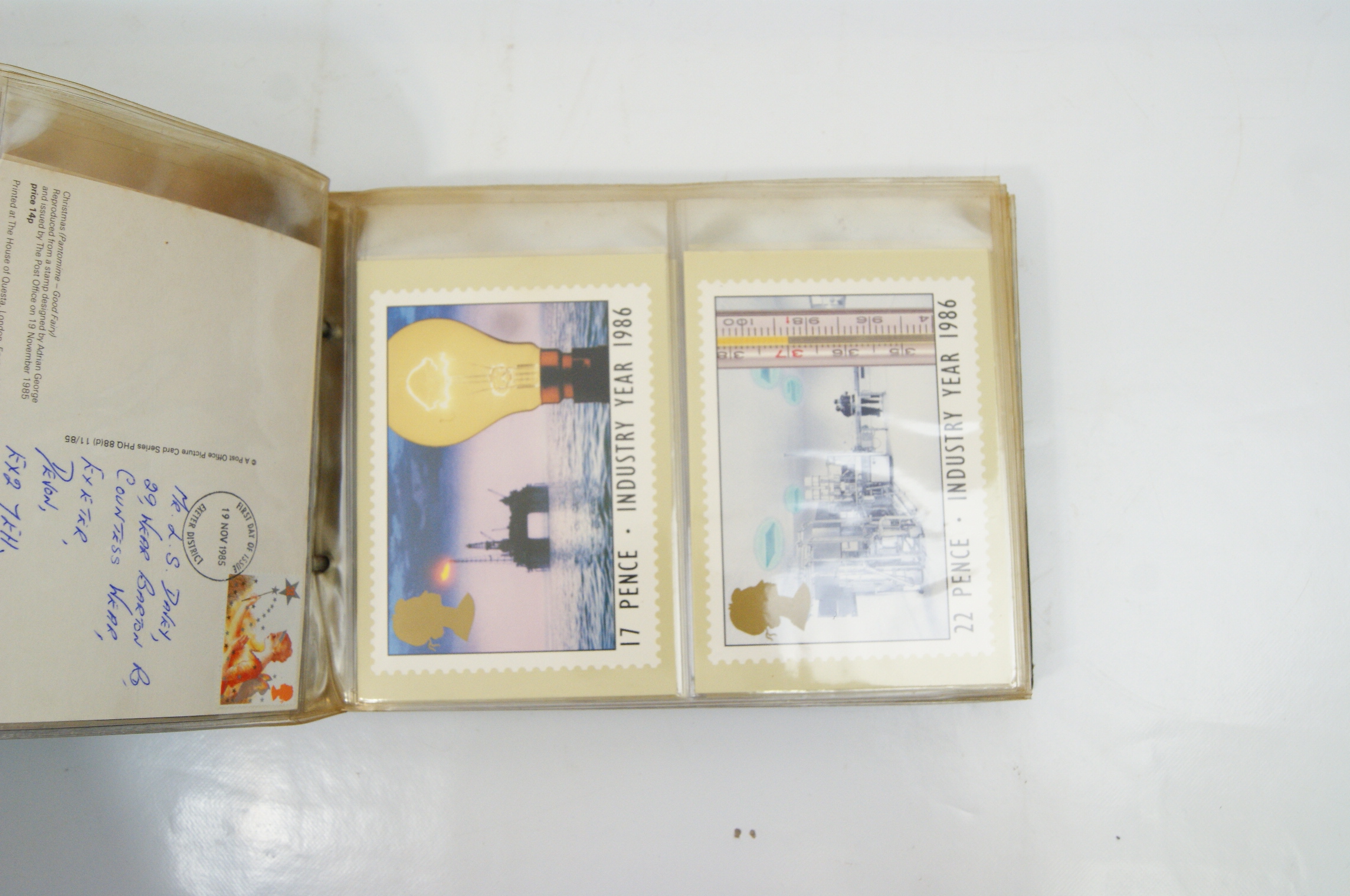 A collection of British Post Office Picture Cards (PHQ cards) and maximum cards housed in a dedicated black ring-bound album with gold-toned lettering on the spine. The collection includes various commemorative issues from 1985 and 1986, featuring subjects such as Industry Year 1986, British Insects, Famous Trains, and Royal Air Force leaders and aircraft. Several items are prepared as maximum cards with corresponding postage stamps affixed to the design side and cancelled with First Day of Issue circular date stamps from the Exeter District. Cancellation dates include 12 MAR 1985, 14 MAY 1985, 19 NOV 1985, and 16 SEP 1986. The cards are printed in multi-colour photogravure, with many bearing the imprint of The House of Questa, London. Some cards are postally travelled with handwritten addresses to a recipient in Exeter, Devon. The items are stored in clear plastic sleeves.