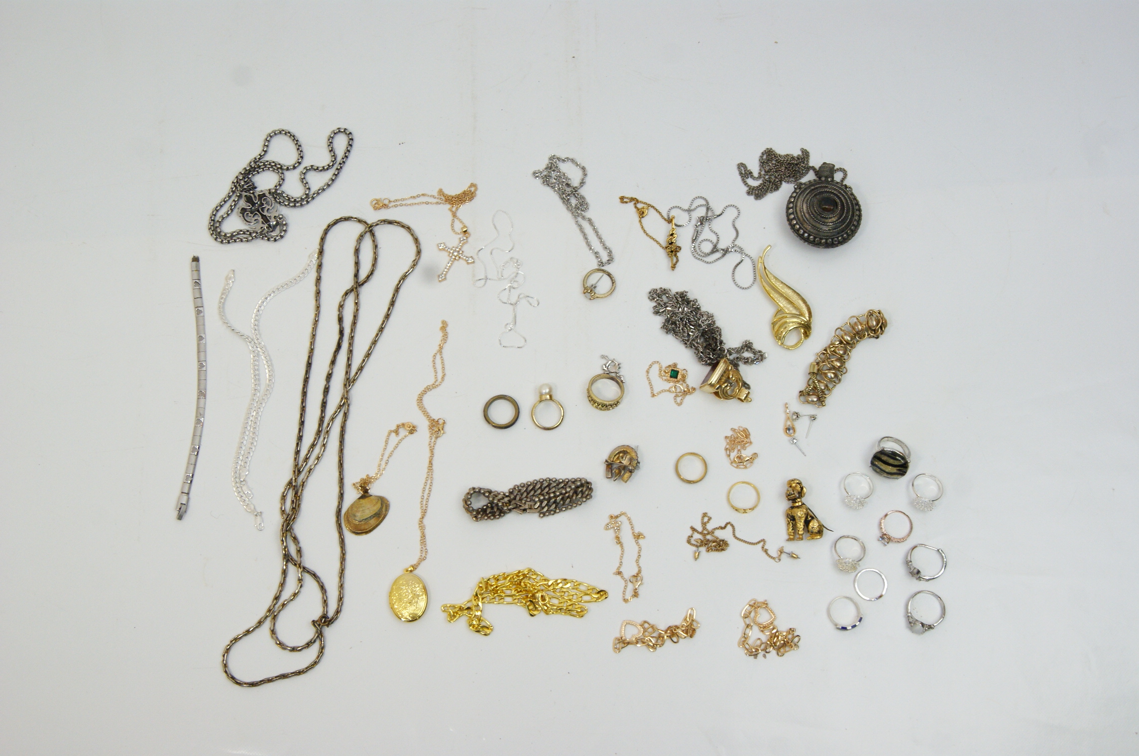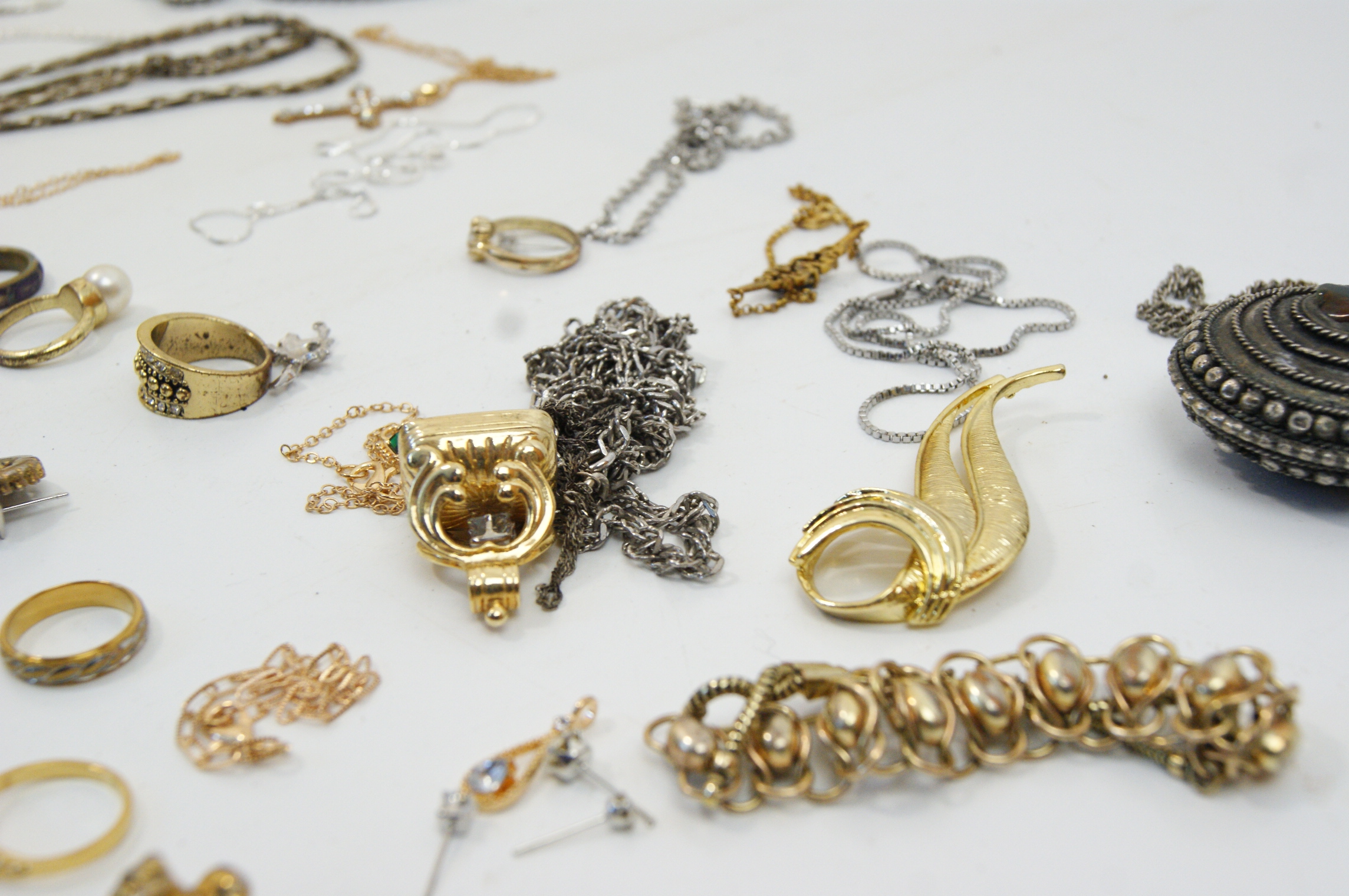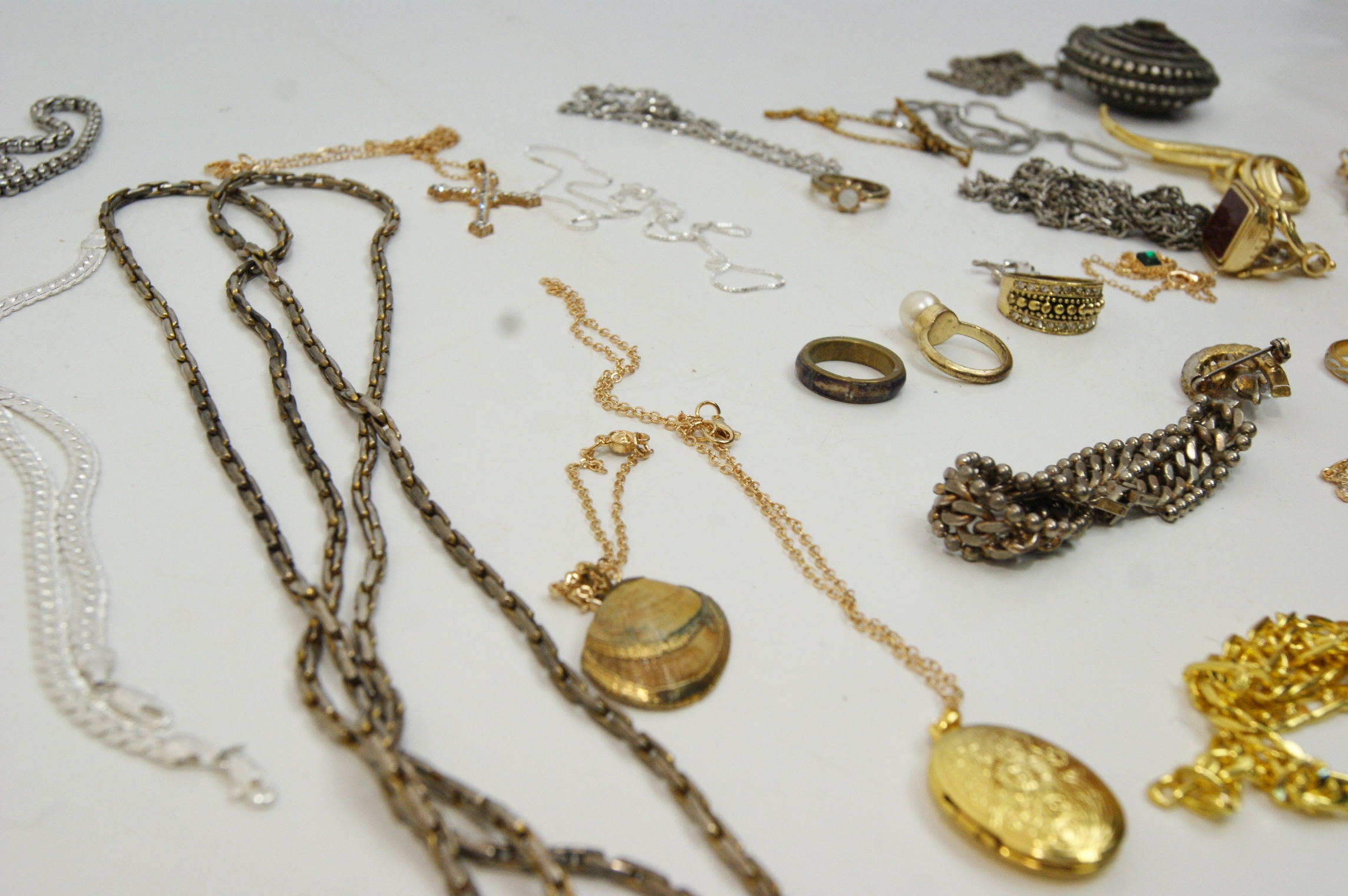 A collection of costume jewellery and fashion accessories comprising necklaces, pendants, rings, brooches, bracelets, and earrings. The lot includes a gold-tone oval etched locket, a rhinestone-set cross pendant on a fine chain, and a natural polished shell pendant with a gold-tone rim. Rings include a large circular design with a black and gold glitter zebra pattern, a gold-tone ring set with a single faux pearl, several rhinestone-encrusted bands, and a band with a blue and silver-tone geometric enamel pattern. Brooches feature a stylized gold-tone wing or leaf shape and a small seated dog figure. Bracelets include a chunky gold-tone segmented bead design and a silver-tone articulated link bracelet. The collection is constructed from gold-tone and silver-tone base metals with settings including clear and coloured rhinestones, faux pearls, and enamel. Indentations and stamps are present on some ring interiors and necklace findings but are not legible for specific maker attribution.