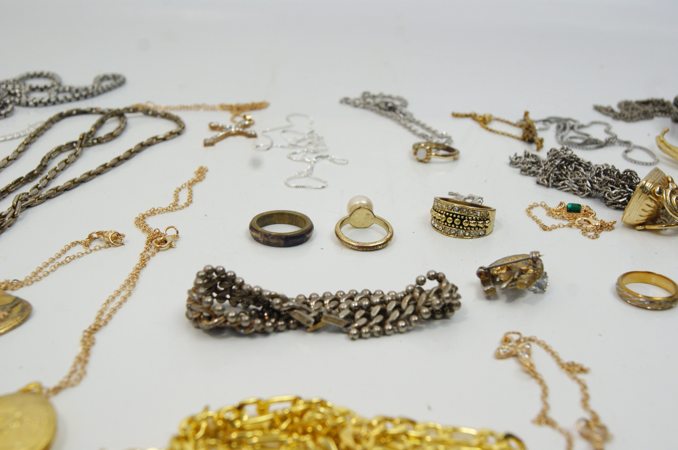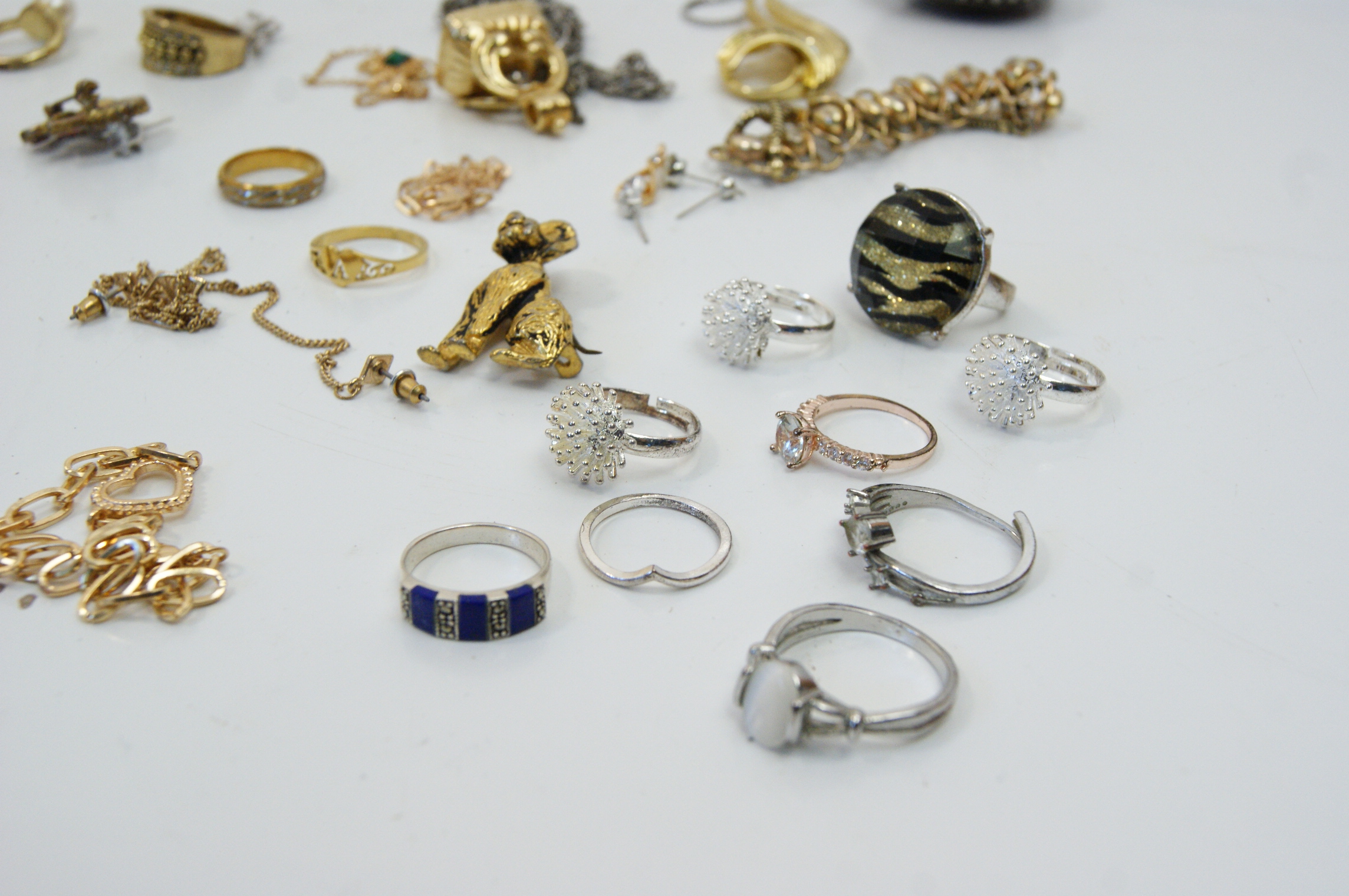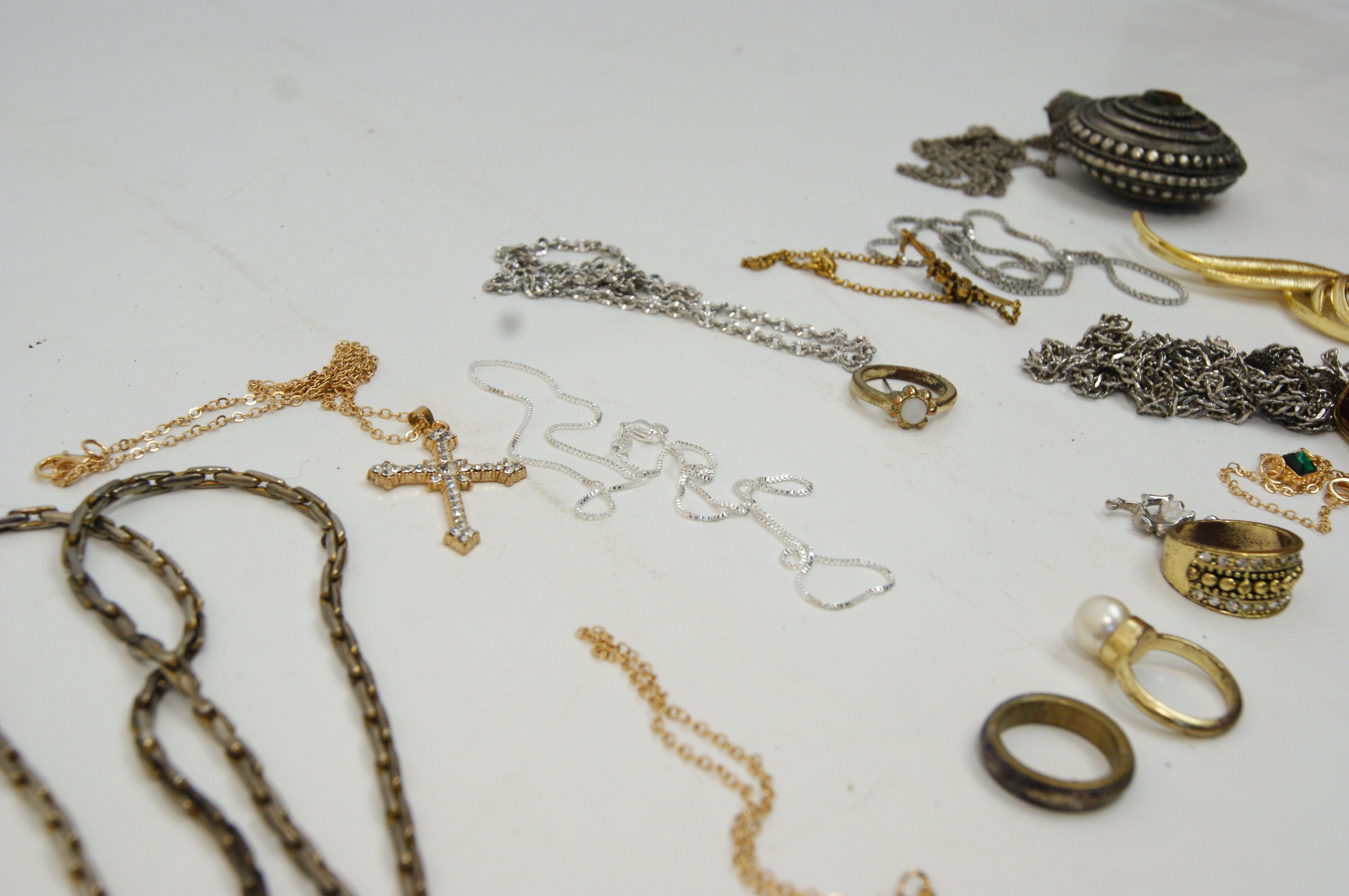 A collection of costume jewellery and fashion accessories comprising necklaces, pendants, rings, brooches, bracelets, and earrings. The lot includes a gold-tone oval etched locket, a rhinestone-set cross pendant on a fine chain, and a natural polished shell pendant with a gold-tone rim. Rings include a large circular design with a black and gold glitter zebra pattern, a gold-tone ring set with a single faux pearl, several rhinestone-encrusted bands, and a band with a blue and silver-tone geometric enamel pattern. Brooches feature a stylized gold-tone wing or leaf shape and a small seated dog figure. Bracelets include a chunky gold-tone segmented bead design and a silver-tone articulated link bracelet. The collection is constructed from gold-tone and silver-tone base metals with settings including clear and coloured rhinestones, faux pearls, and enamel. Indentations and stamps are present on some ring interiors and necklace findings but are not legible for specific maker attribution.