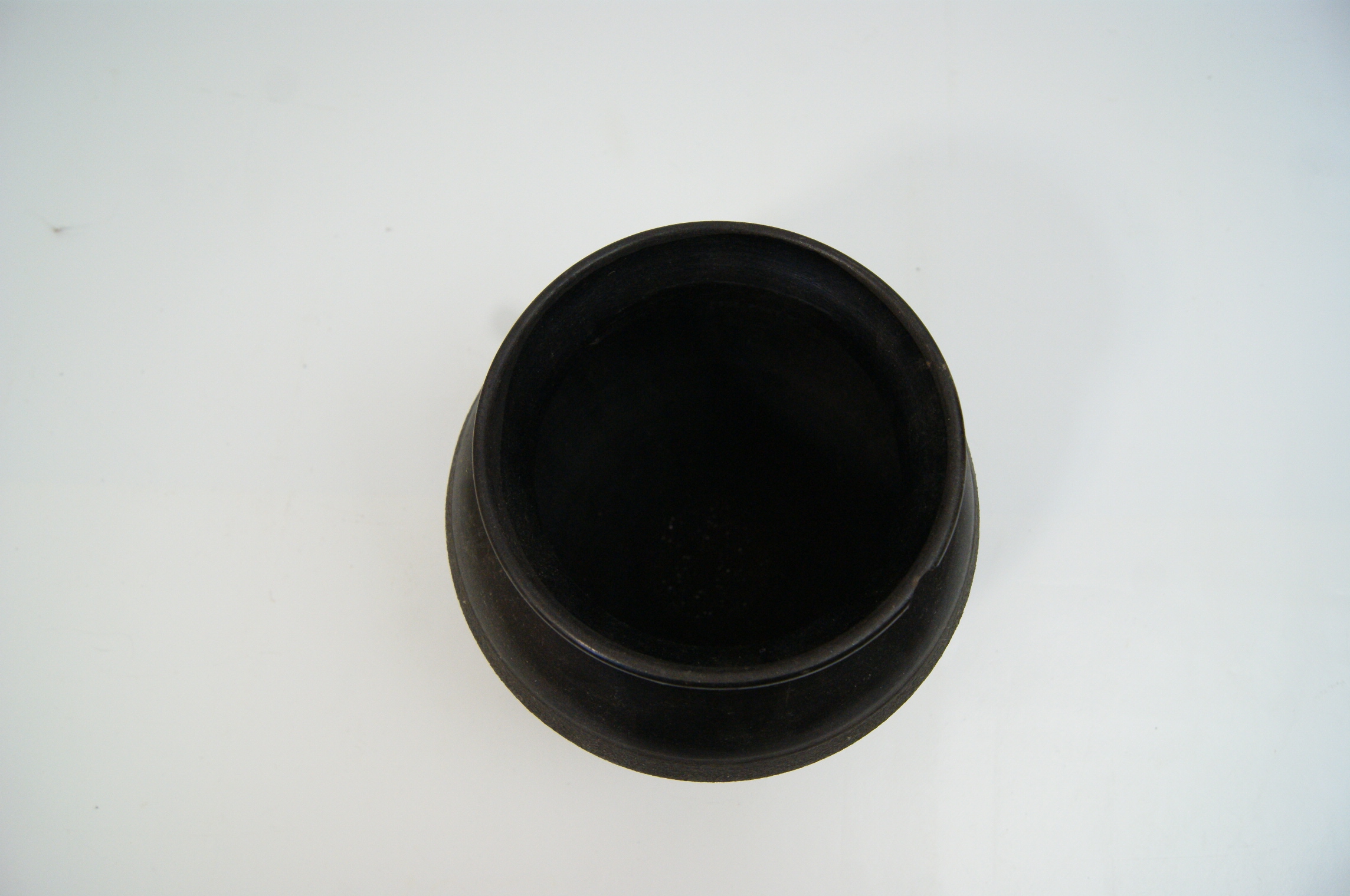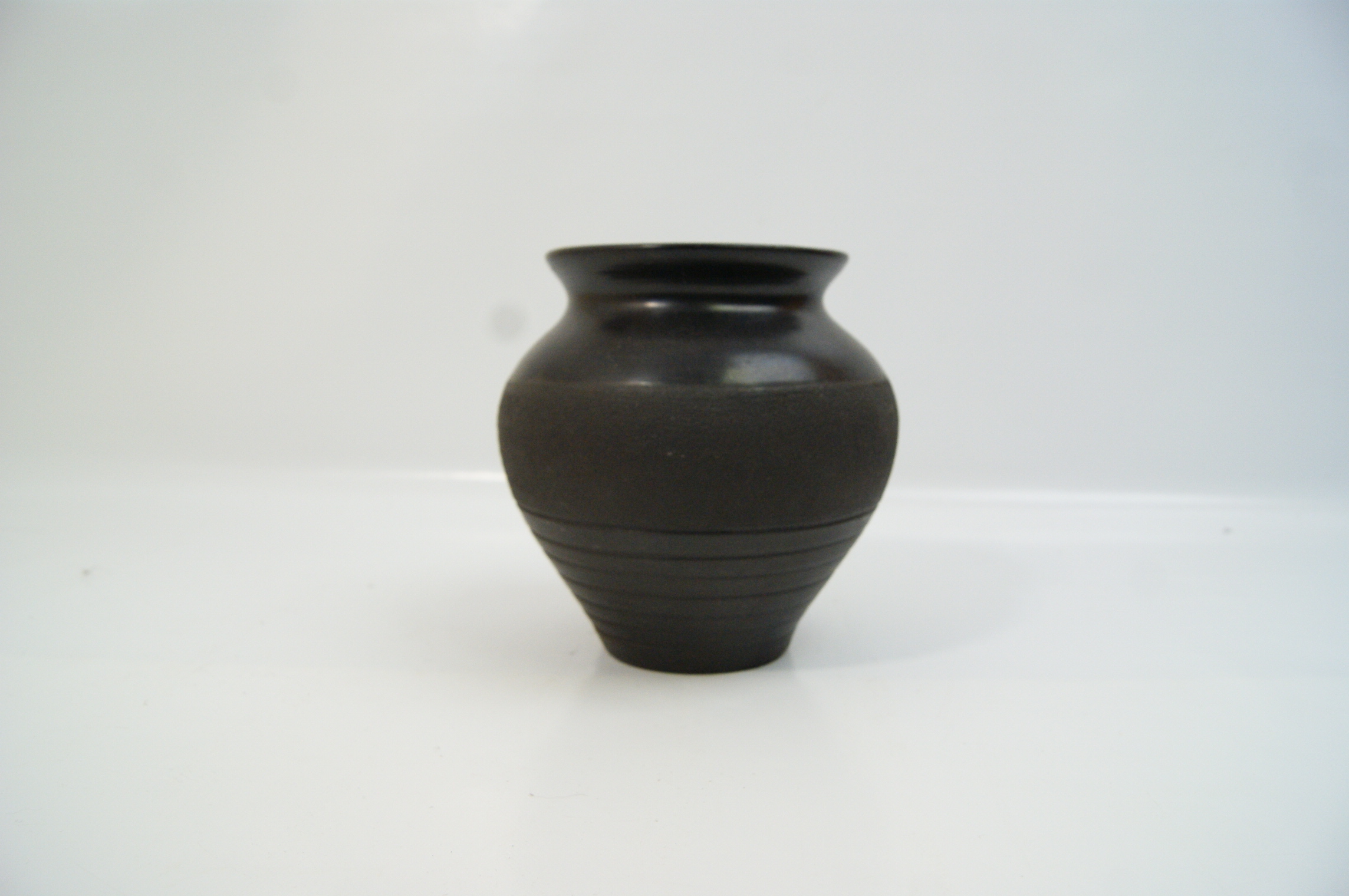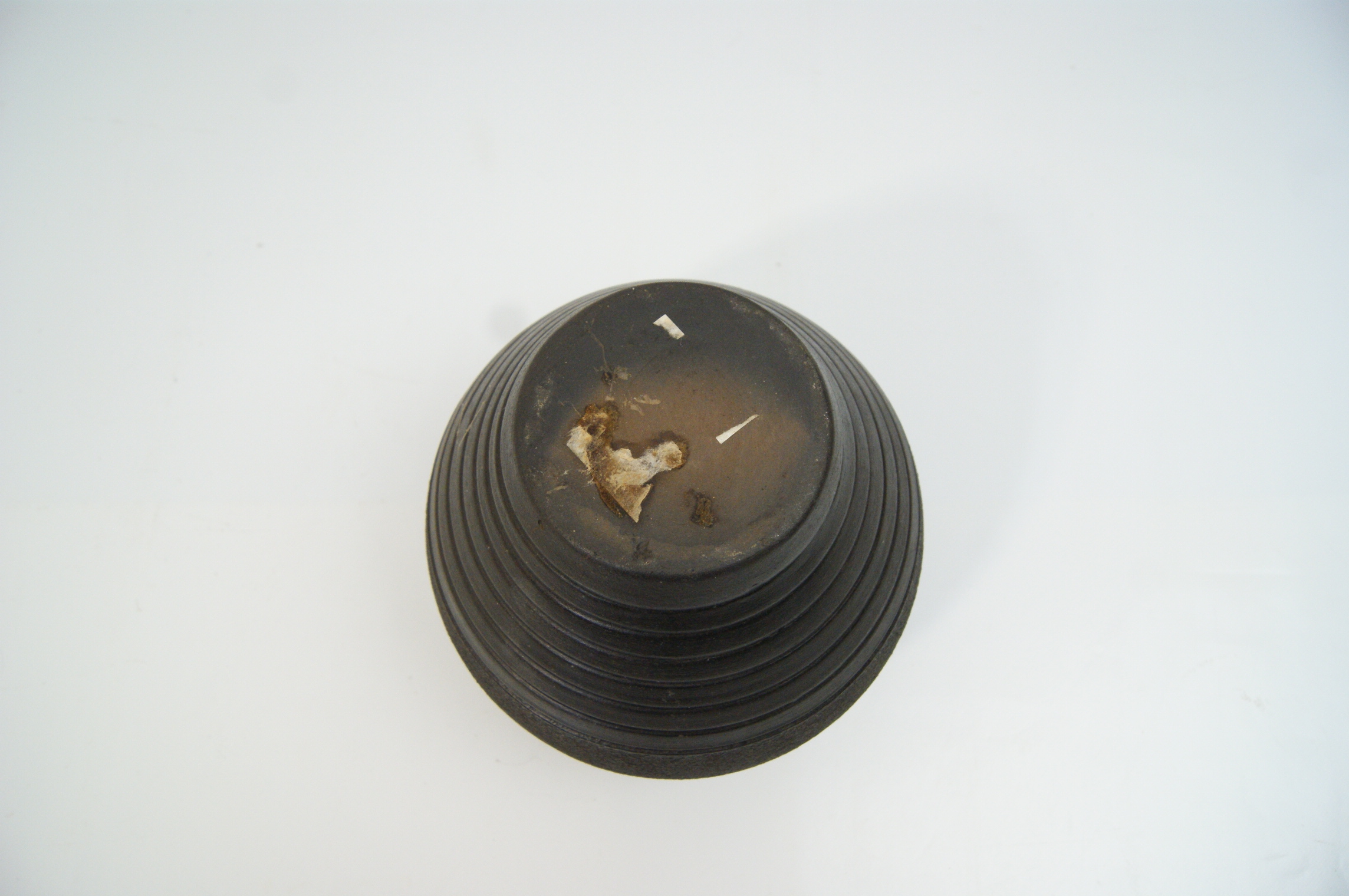A small black stoneware vase featuring a bulbous body tapering to a narrow base, topped with a short neck and a flared rim. The piece exhibits a dual-textured finish, with a high-gloss black glaze applied to the upper shoulder and rim, while the mid-section and lower body feature a matte, slightly textured surface. The lower portion of the vessel is decorated with a series of finely incised horizontal concentric bands. The form and finish are characteristic of contemporary decorative earthenware or traditional unglazed vessels, such as those produced for curd storage in the Indian subcontinent. No maker’s marks or factory stamps are visible on the base, which retains significant adhesive residue and fragments of a white paper label from previous pricing or identification.