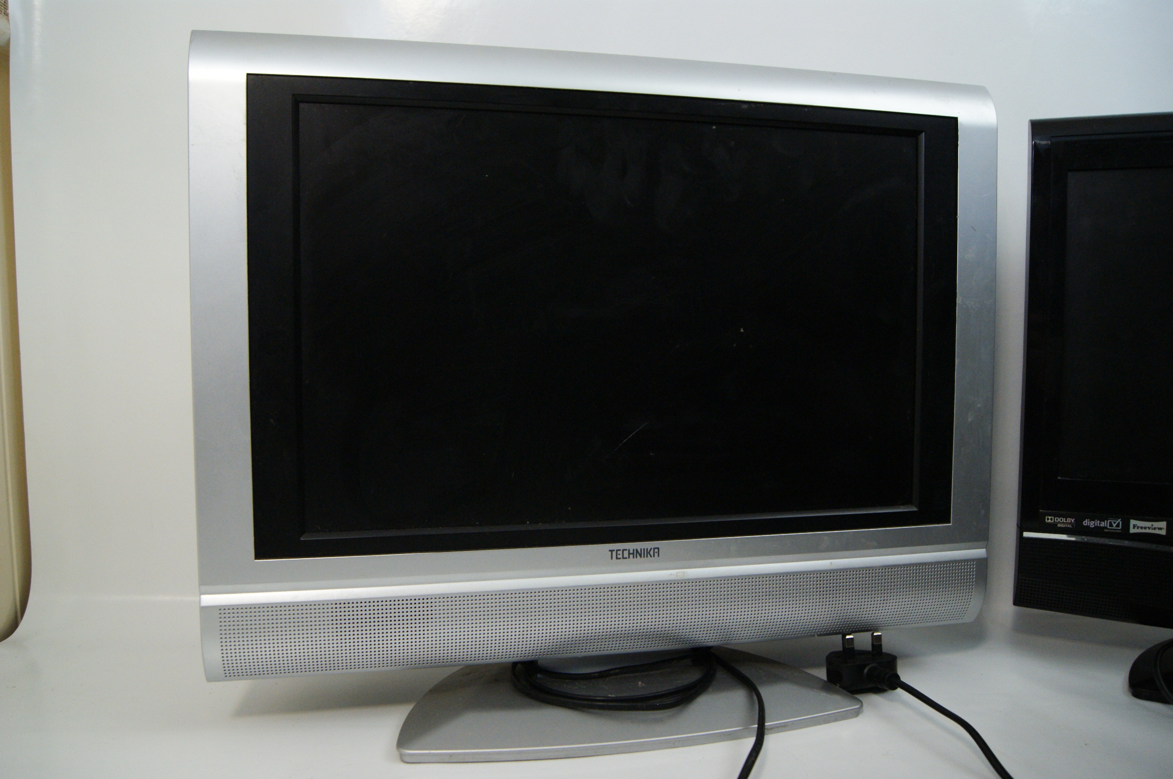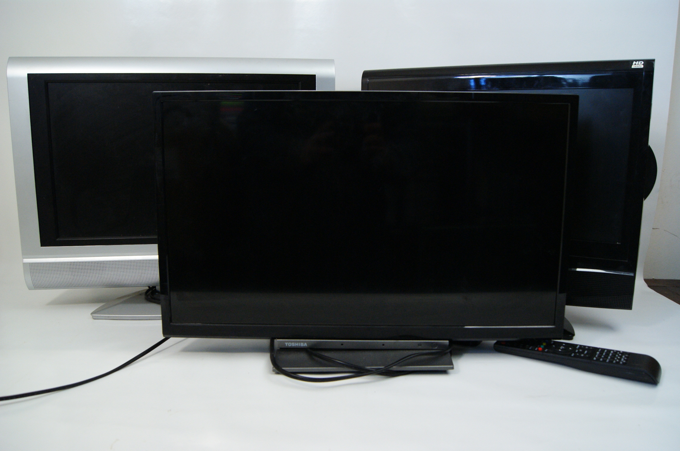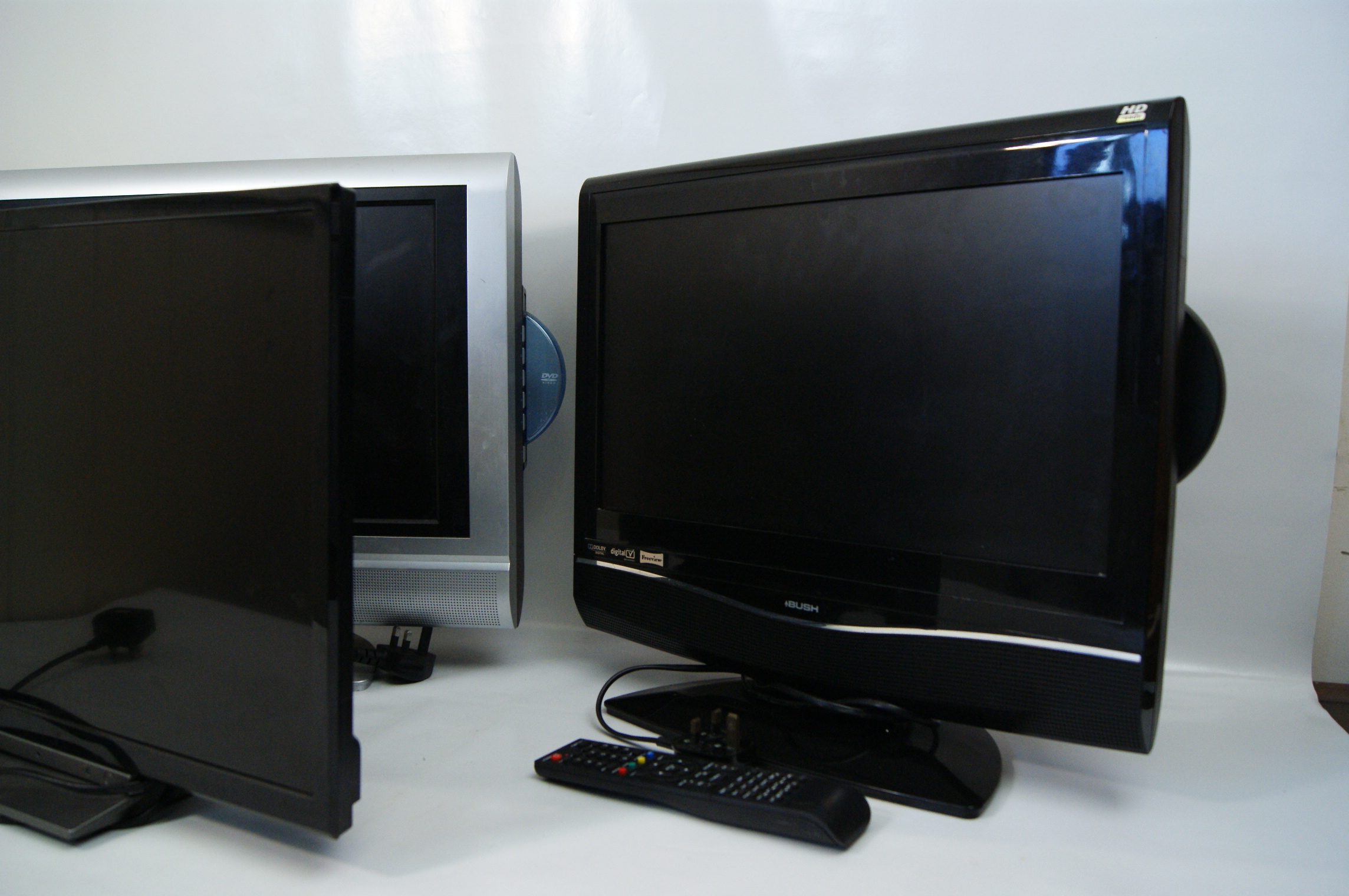 A trio of flat-panel televisions comprising models by Toshiba, Technika, and Bush. The Toshiba unit features a black bezel and is estimated at 19 to 24 inches in screen size. The Technika unit features a silver-tone bezel, lower speaker grille, and an integrated side-loading DVD player, with an estimated screen size of 22 to 26 inches. The Bush unit features a glossy black bezel and is labelled as HD Ready with Freeview and Dolby Digital, with an estimated screen size of 22 to 26 inches. All units are mounted on desktop stands and fitted with UK three-pin power plugs. One remote control is included in the lot.