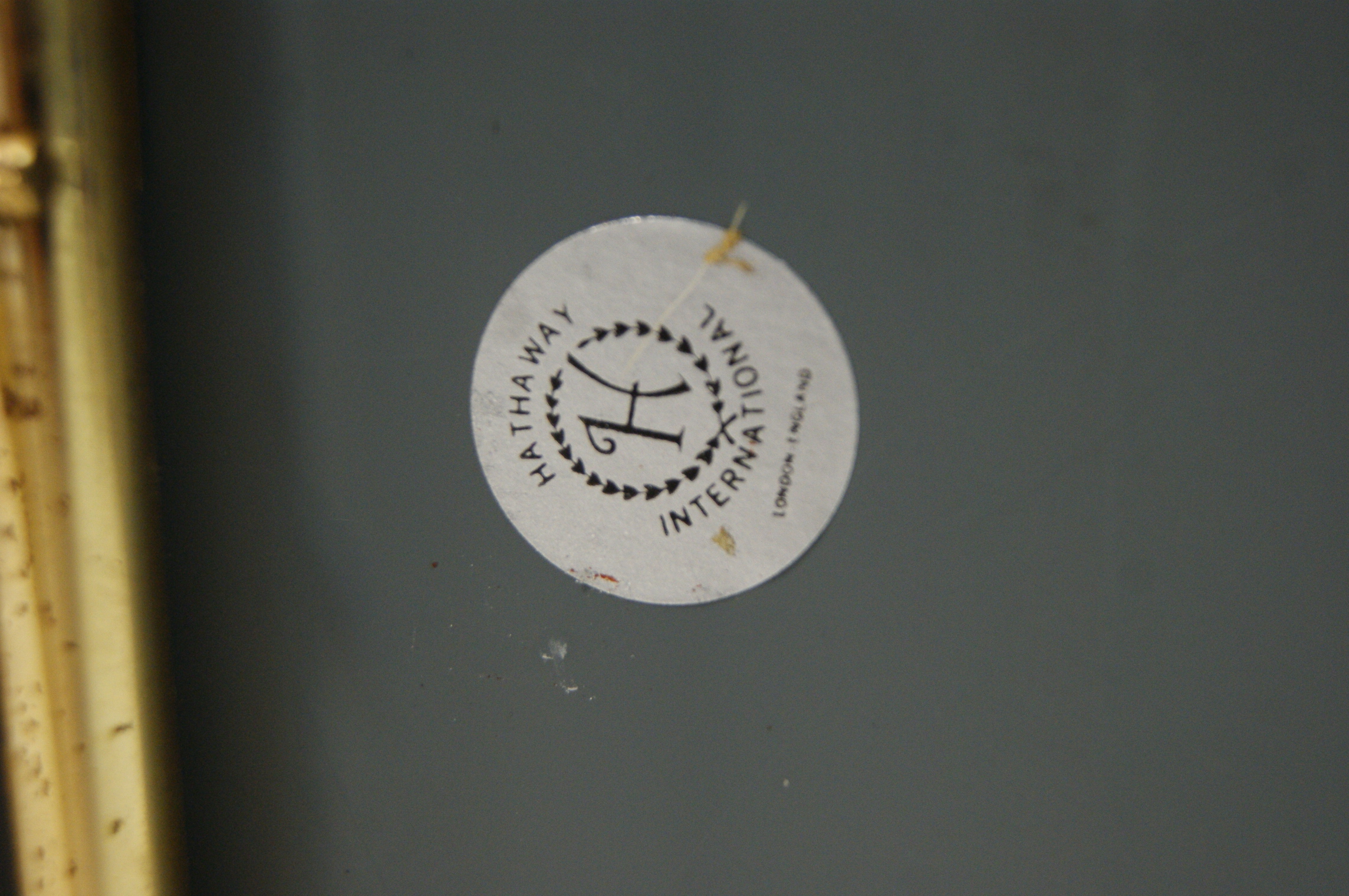 A decorative metal relief plaque produced by Hathaway International, London. The central silver-toned relief depicts a rustic landscape scene featuring a cottage with a thatched-style roof, a mature tree, and a stream crossed by a simple bridge where a horse or donkey is shown drinking at the water’s edge. The relief is mounted onto a rectangular bevelled glass panel with a grey-blue tinted mirrored backing. The assembly is presented on a small brass-toned metal display easel. The reverse of the glass panel bears a circular paper label with the text Hathaway International London England arranged around a central stylised letter H enclosed within a laurel wreath.