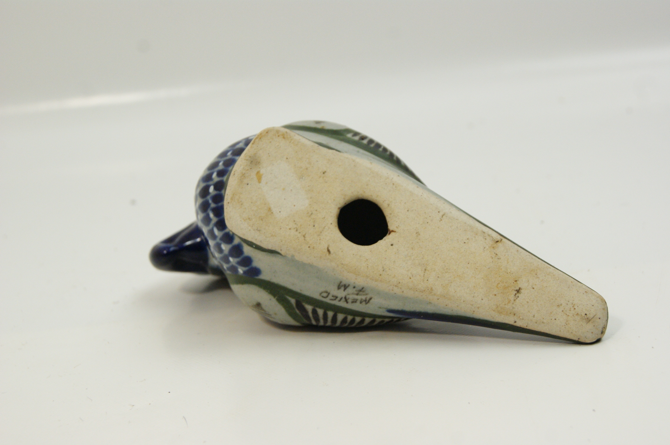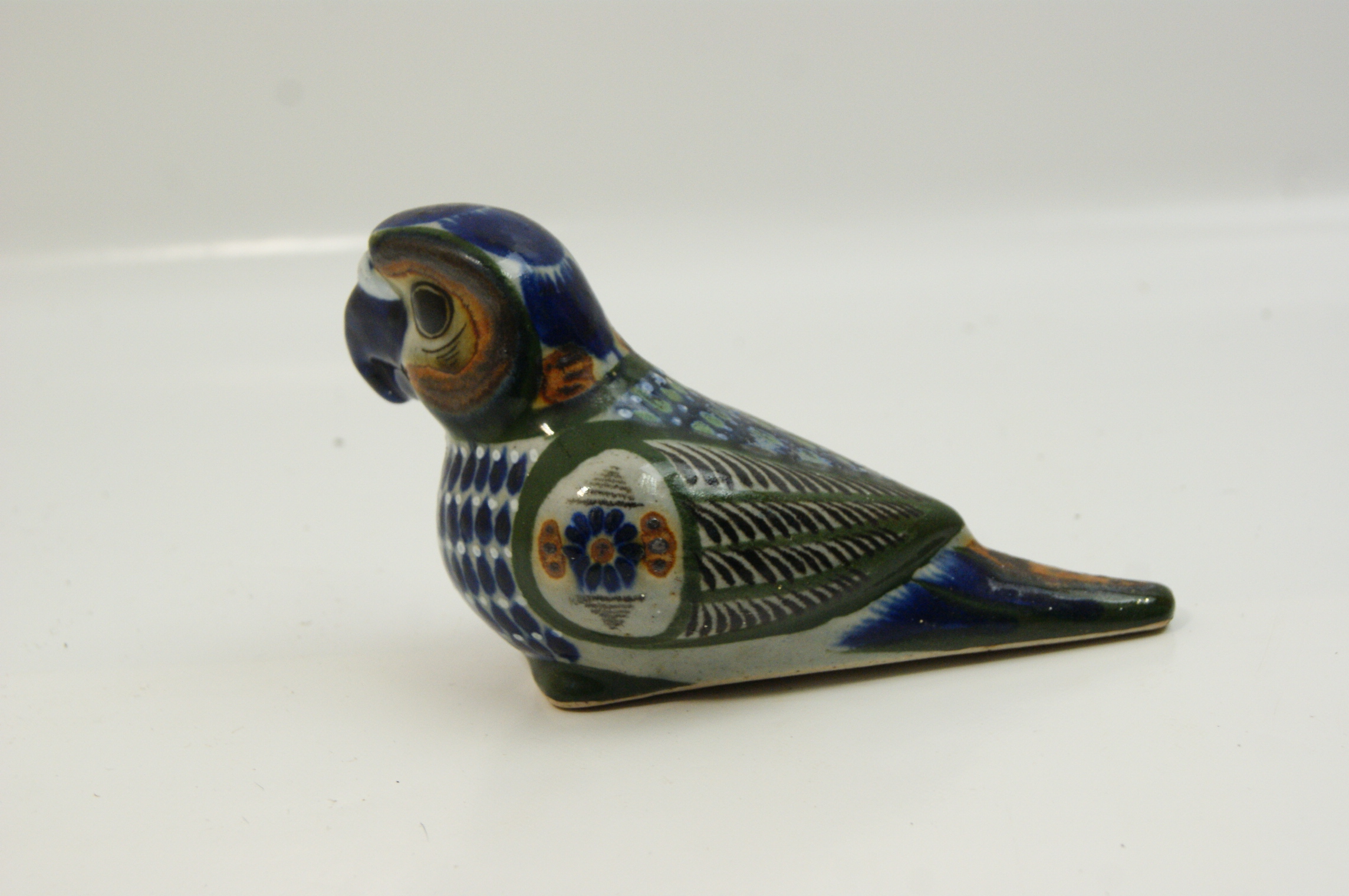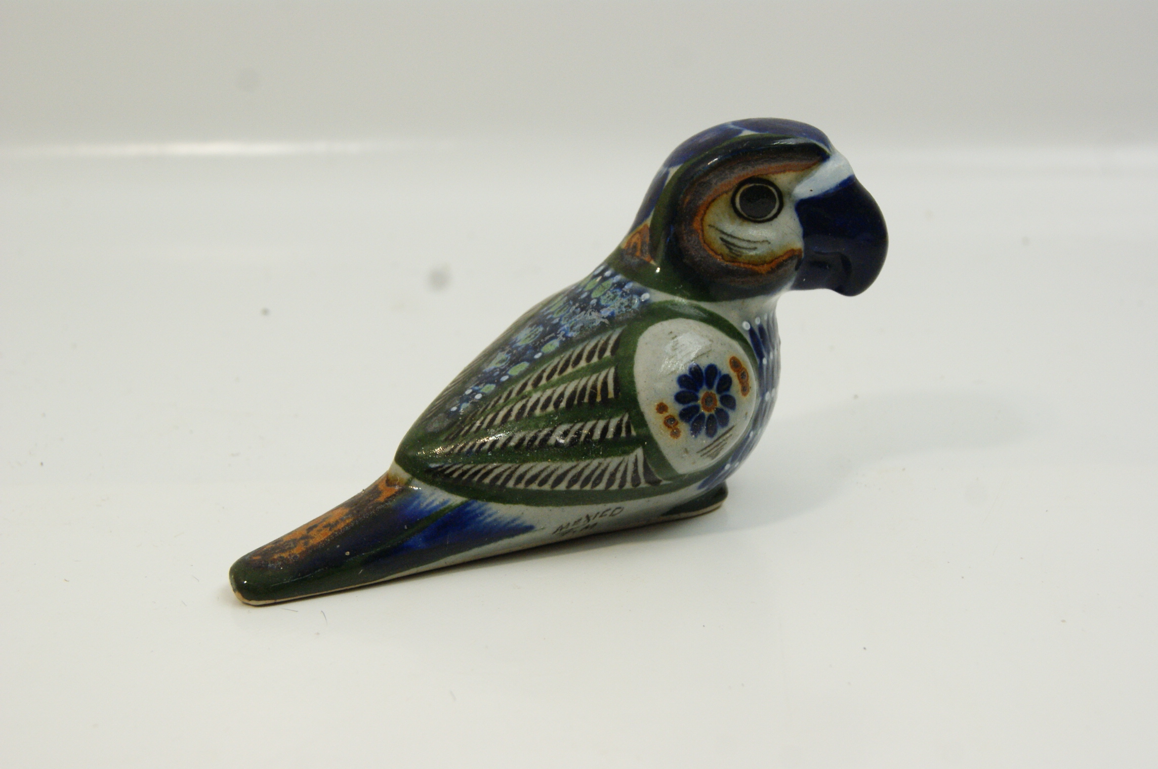 A hand-painted ceramic figurine of a parrot or macaw in the Tonala folk art style of Jalisco, Mexico. The piece features a seated posture with a colour palette of cobalt blue, forest green, and ochre on a speckled greyish-white ground. The decoration includes stylized floral medallions on the shoulders and intricate feather patterns on the wings and tail. The underside of the body near the tail is hand-marked MEXICO F.M. The base is unglazed and features a central circular aperture. This style is characteristic of mid-to-late 20th-century workshops in the Tonala region, often associated with the tradition of artists such as Ken Edwards.