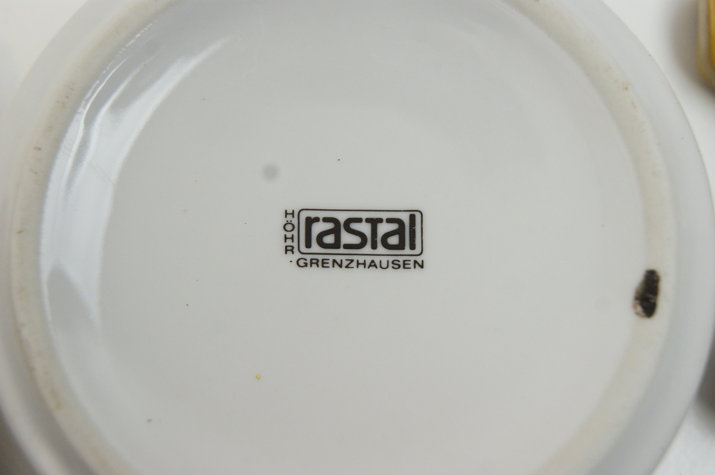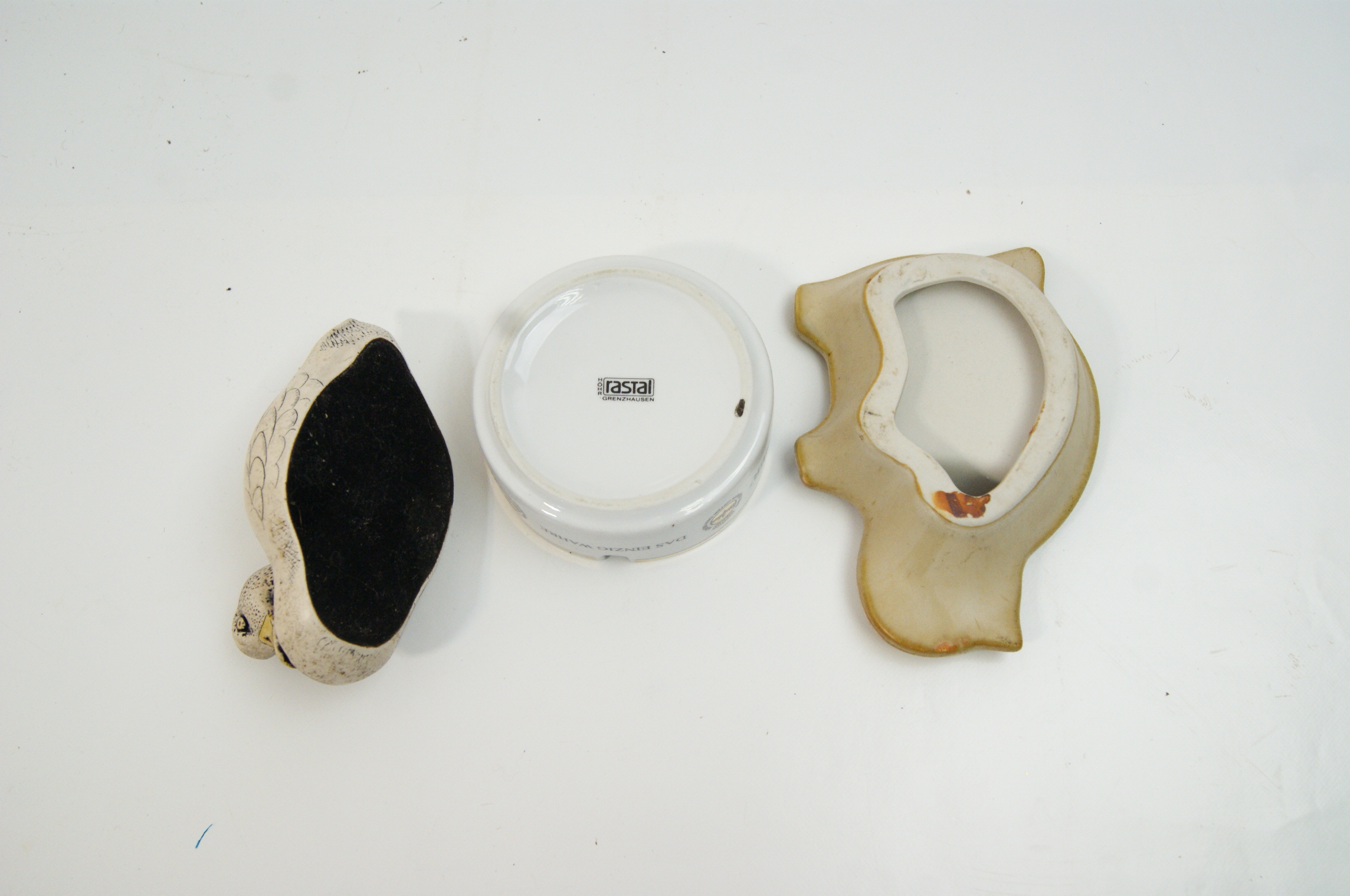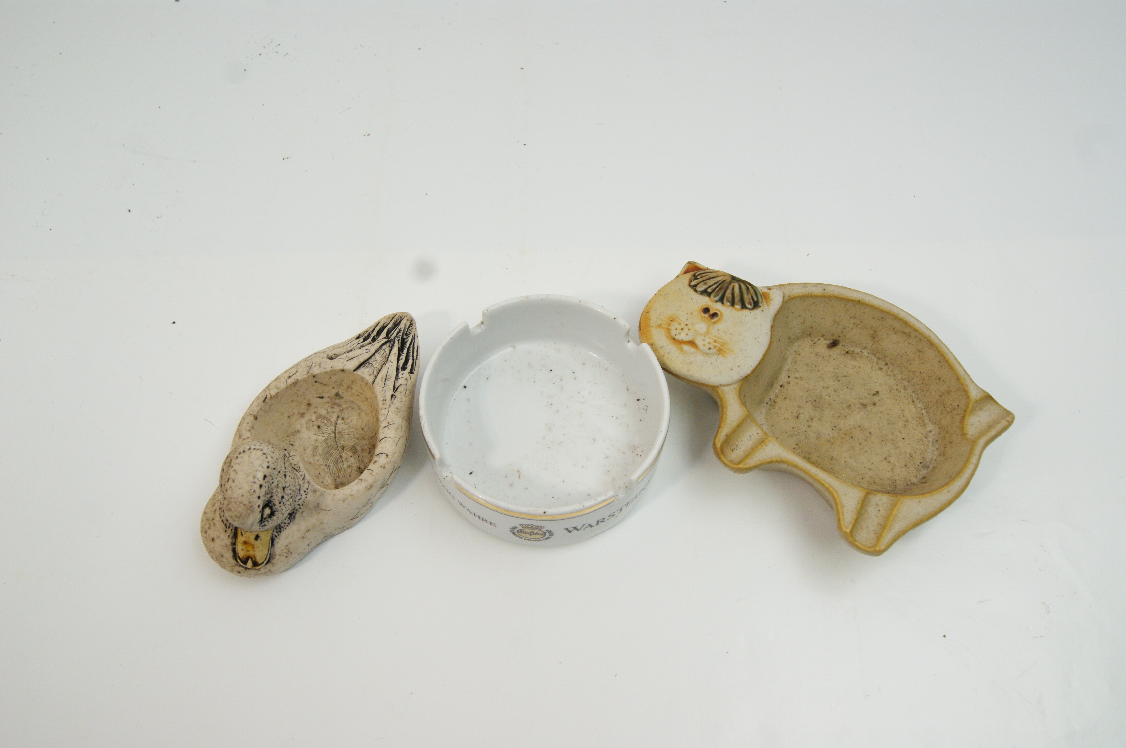 This lot consists of three ceramic ashtrays, featuring one branded advertising piece and two figural designs. The first is a circular porcelain advertising ashtray manufactured by Rastal for the German brewery Warsteiner. The exterior is decorated with transfer-printed branding including the Warsteiner name, the slogan Das Einzig Wahre, and the company logo featuring a crown with the text Eine Königin unter den Bieren. The piece features three cigarette rests and a gilded rim. The base bears the transfer-printed maker mark for Rastal, Höhr-Grenzhausen.