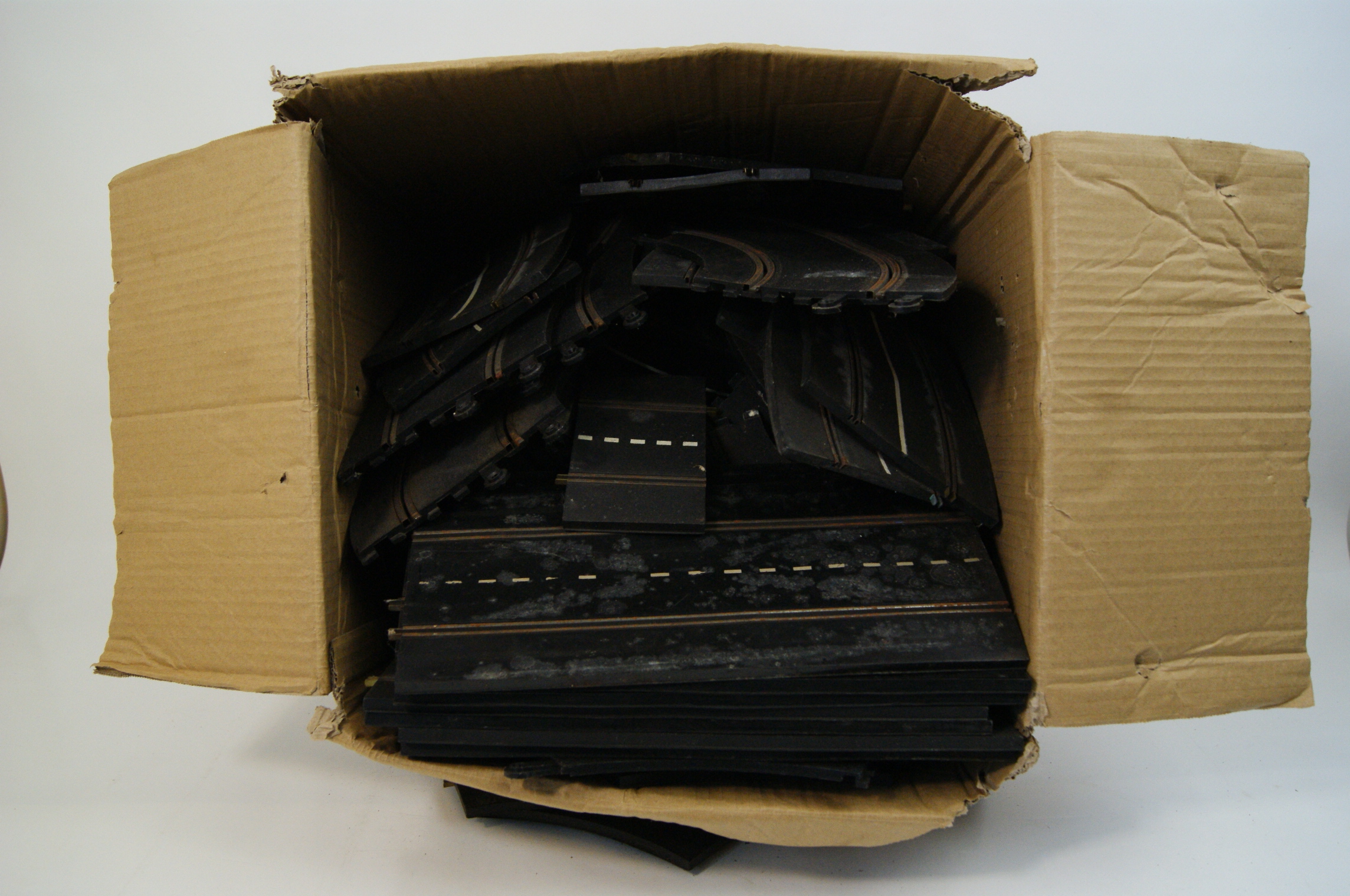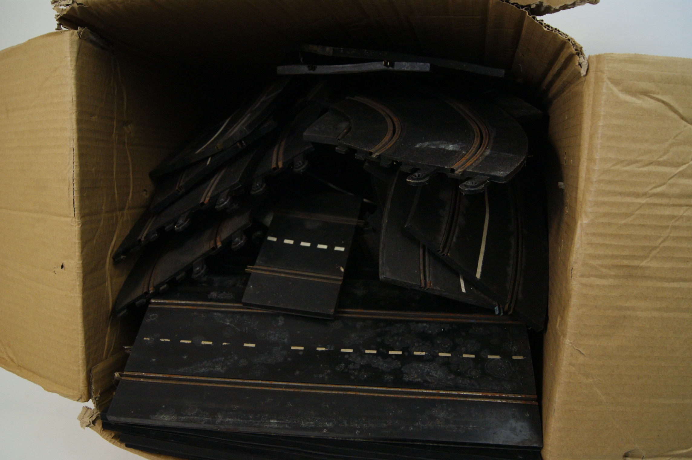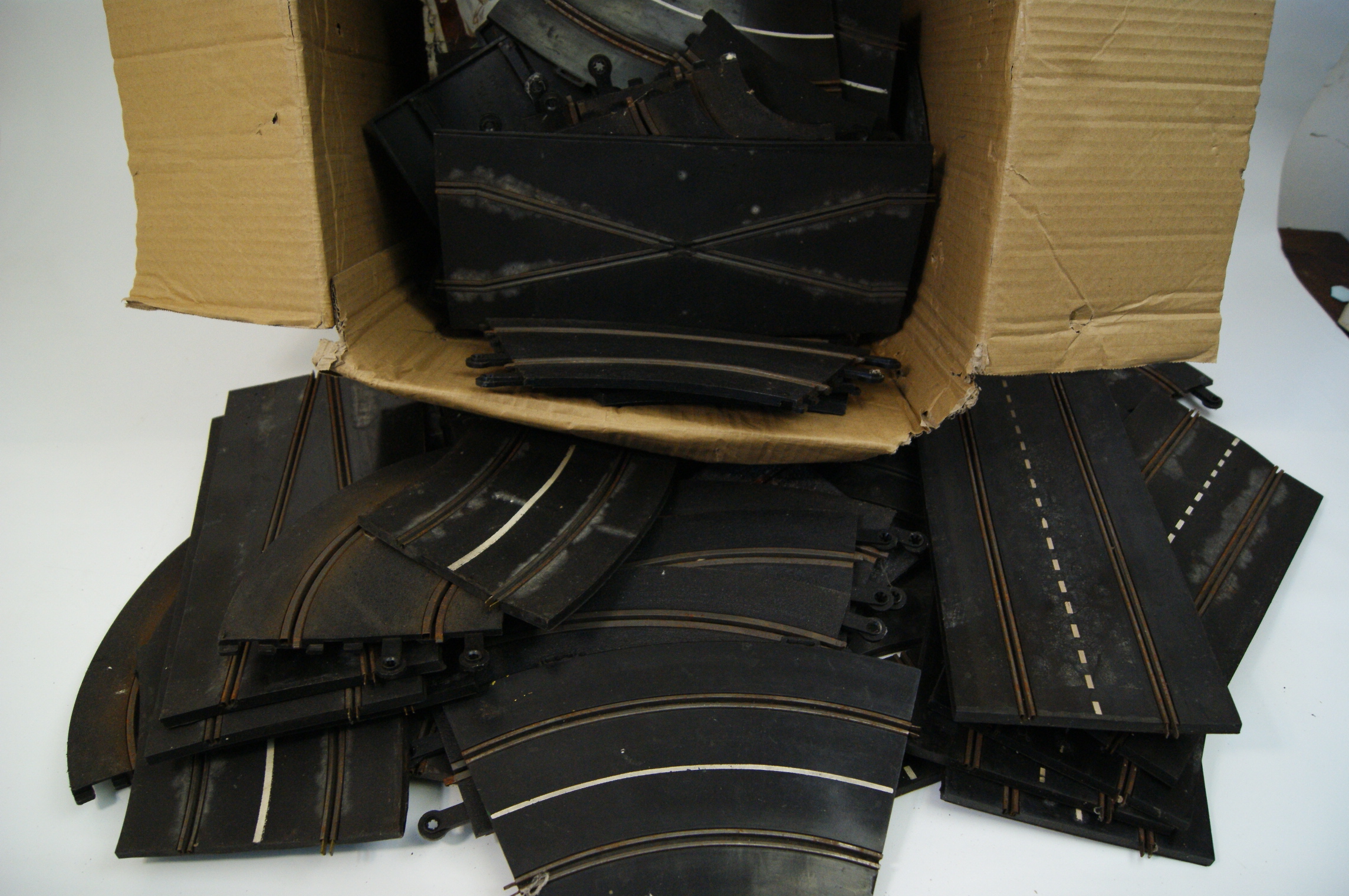A collection of vintage slot car racing track components, designed in the style of classic Scalextric systems. The sections are constructed from moulded black plastic and feature integrated twin metal power rails. The pieces utilize a ring-and-tab connector system for assembly. The assortment includes multiple lengths of straight track, some of which feature printed dashed white lane markings, alongside various curved sections and a crossover section. The lot is housed in a non-original, plain brown corrugated cardboard storage box.