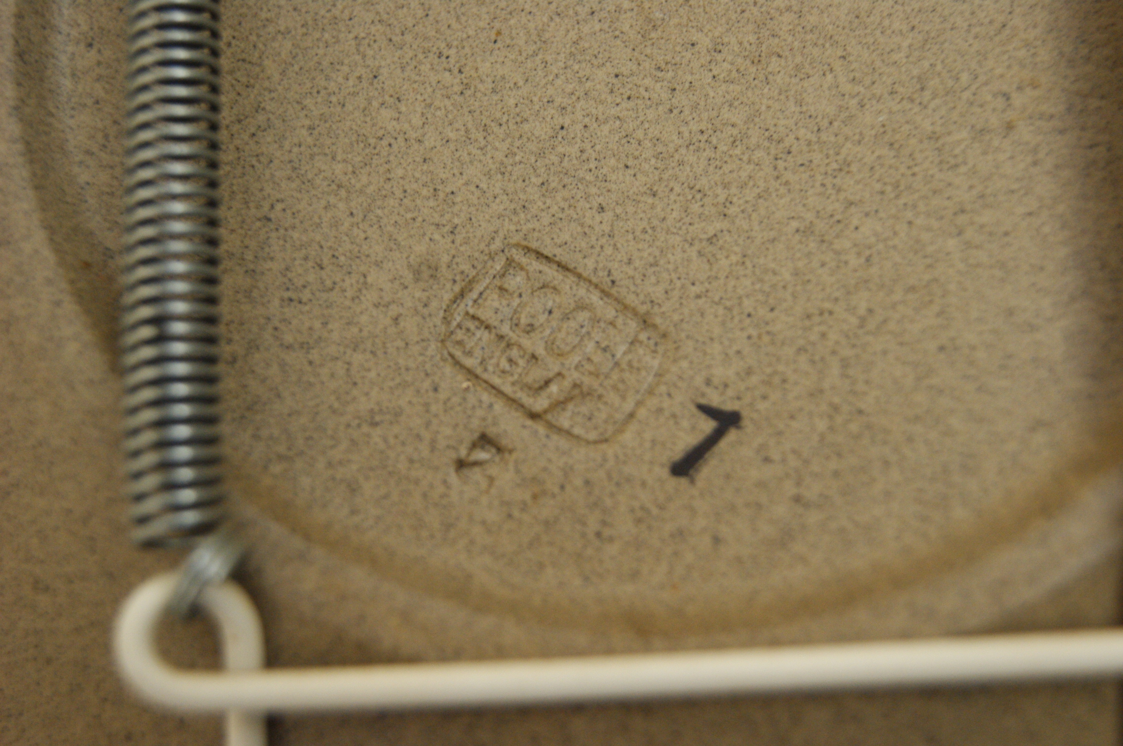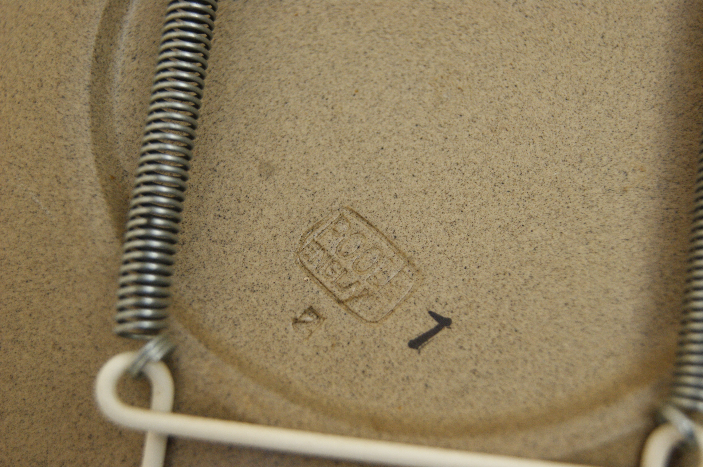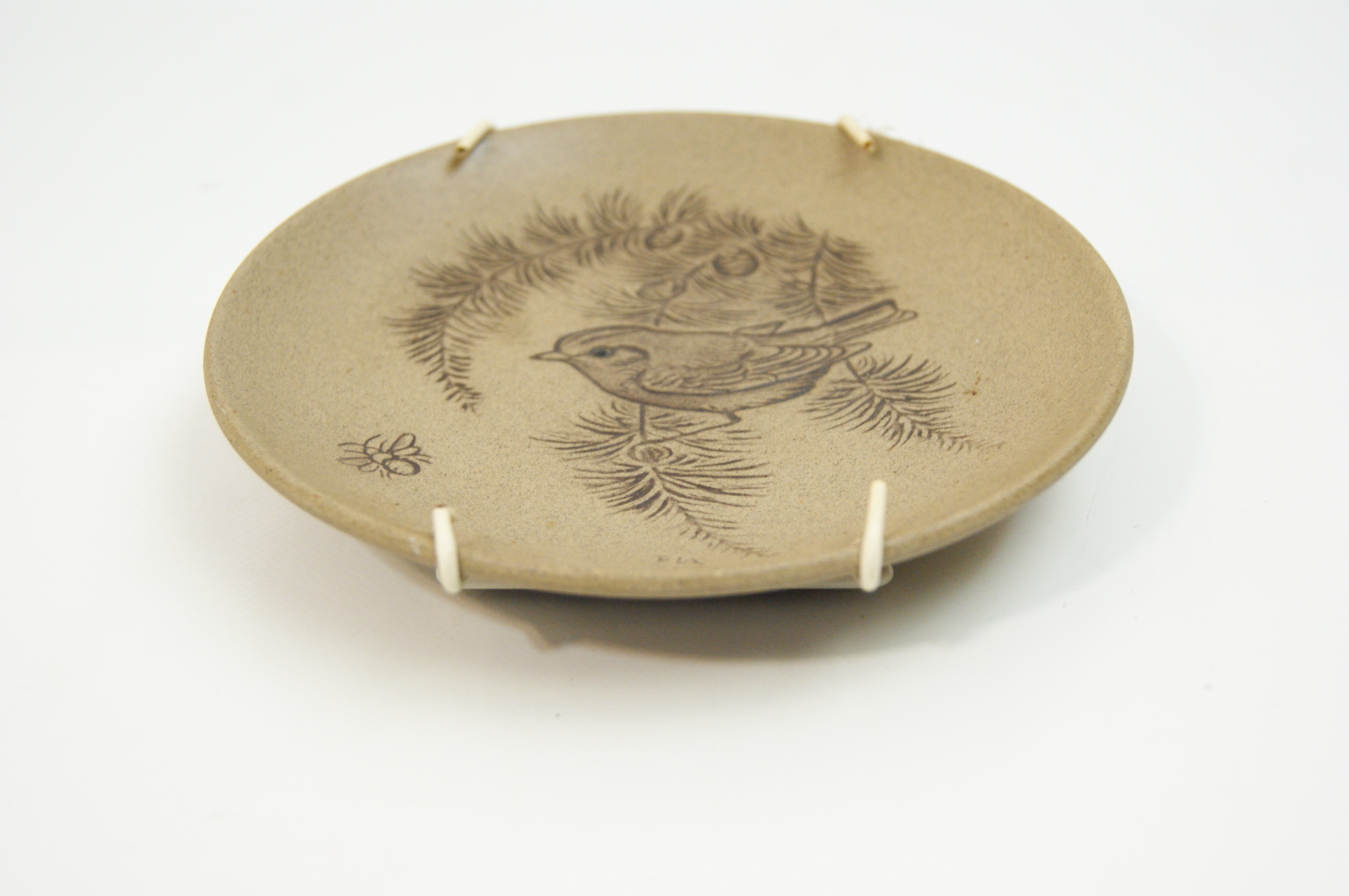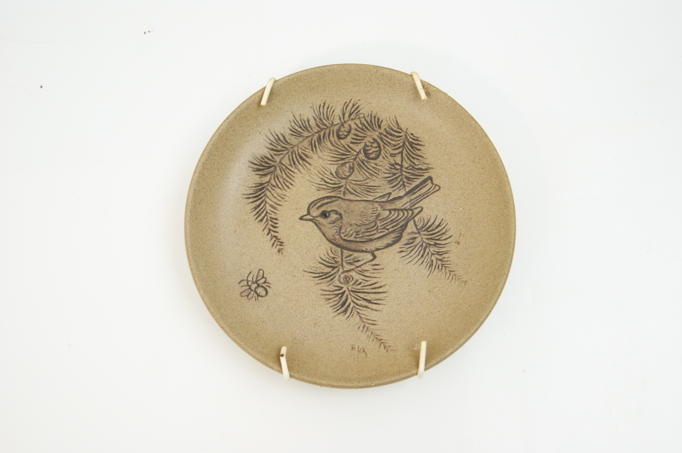 A Poole Pottery stoneware display plate from the wildlife series designed by Barbara Linley-Adams. The circular plate is constructed from stoneware with a matt, speckled buff glaze. The face is decorated with a sepia-toned transfer-printed illustration of a bird, possibly a Goldcrest, perched upon a coniferous branch with pine cones, with a small bee depicted to the left. The lower centre of the decoration features the hand-painted monogram BLA for the artist Barbara Linley-Adams. The reverse of the plate bears an impressed rectangular mark containing the words POOLE over ENGLAND, alongside an incised stylised character A and a hand-painted numeral 7 in black. The item is fitted with a metal wire spring-type plate hanger.
