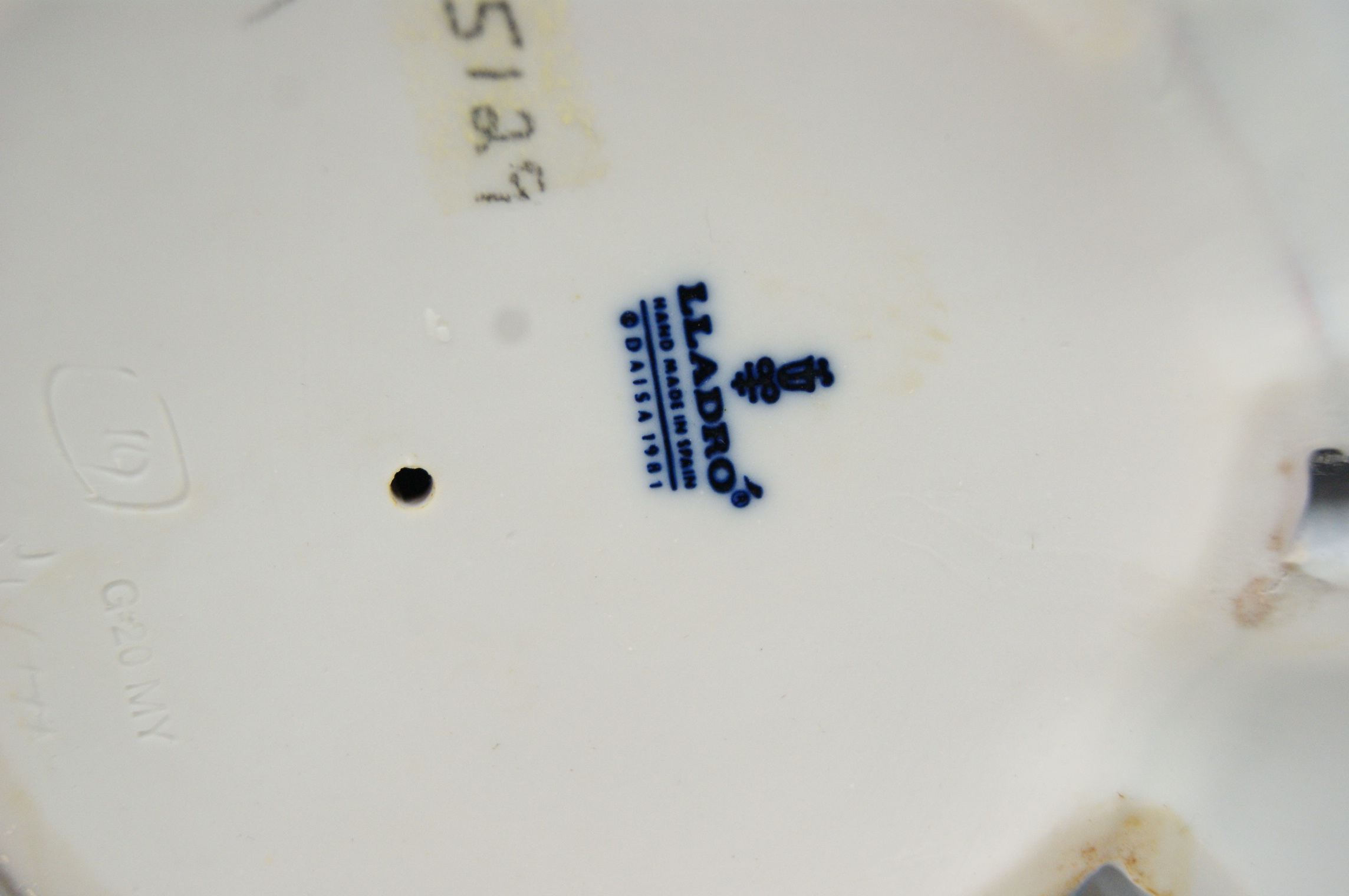 A glazed porcelain bust of a pensive clown, designed by Jose Puche for Lladro. The figure is depicted with a melancholy expression, resting his chin on both hands. The clown features light blue hair, a white face with a single painted black eyebrow, and a red mouth. He wears a cream-coloured cone-shaped party hat with a brown textured pom-pom and a wide, pleated ruff collar in a muted greyish-lavender tone. The base bears a blue printed factory mark featuring a stylised bellflower above the text LLADRO, HAND MADE IN SPAIN, and copyright DAISA 1981. Incised marks include a flower-like symbol within a rounded square and the alphanumeric code G-20 MY. A piece of tape on the base is inscribed with the model number 5139.