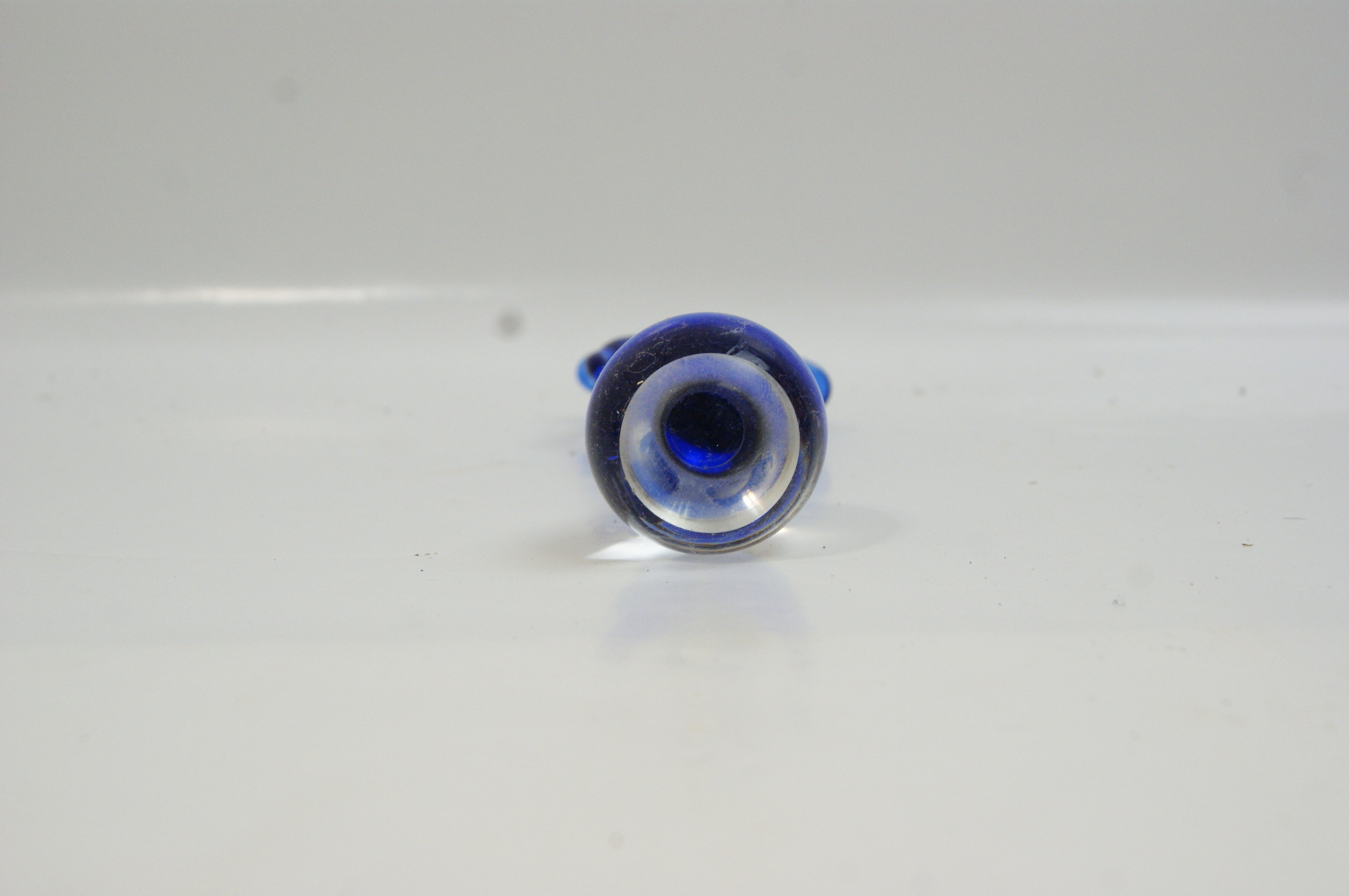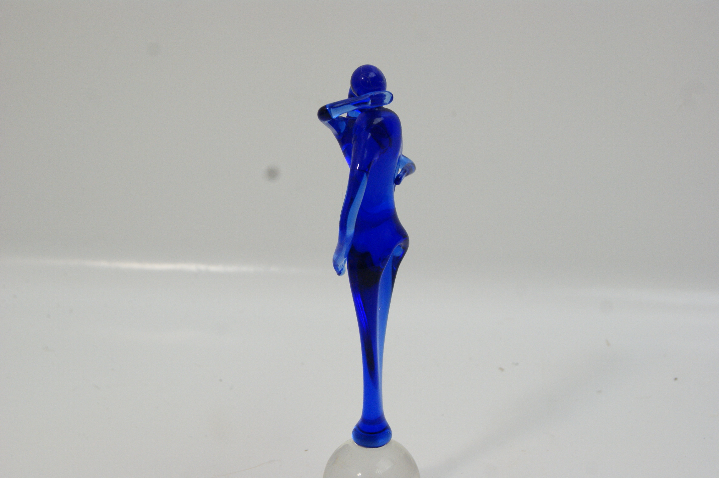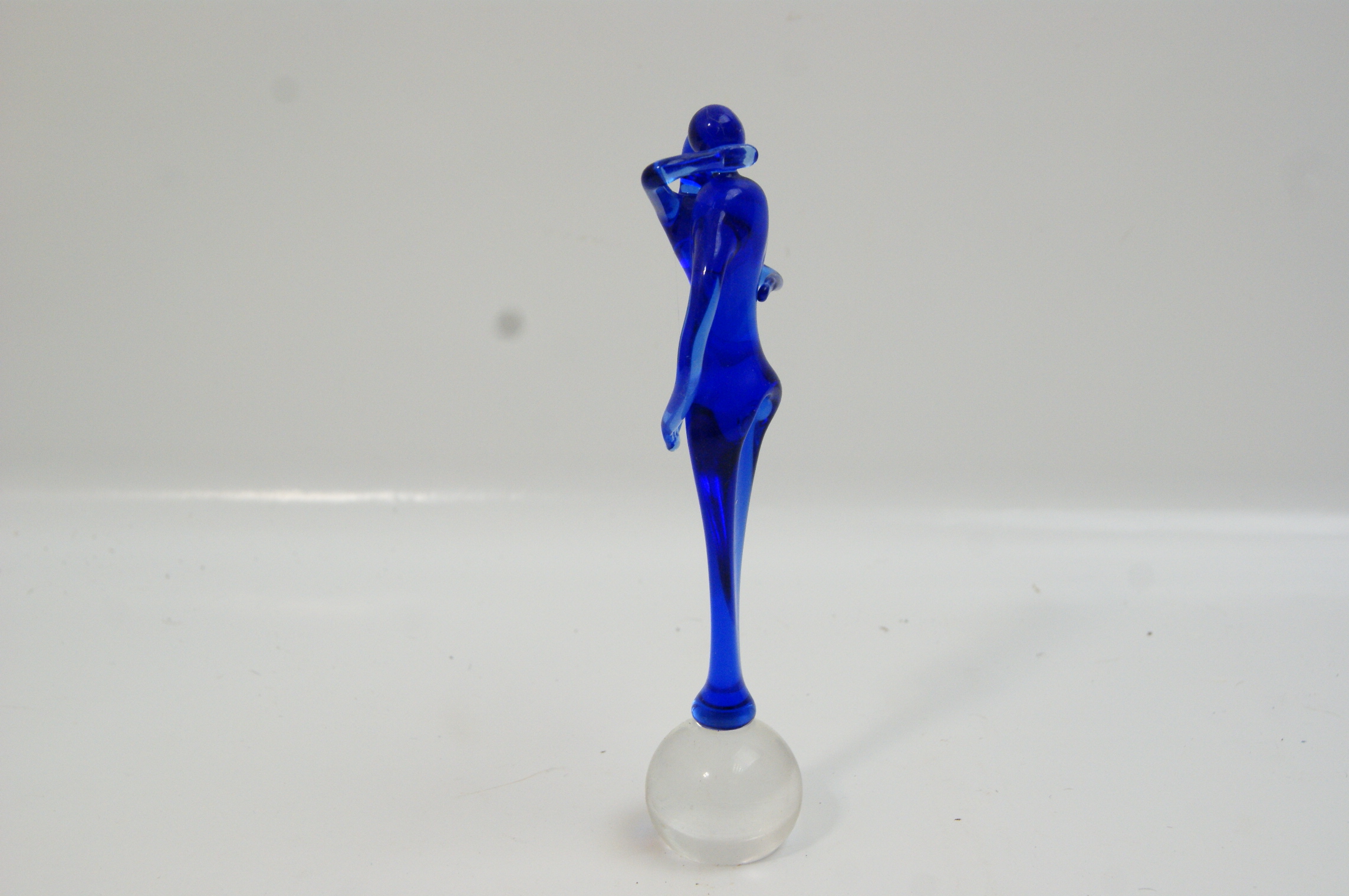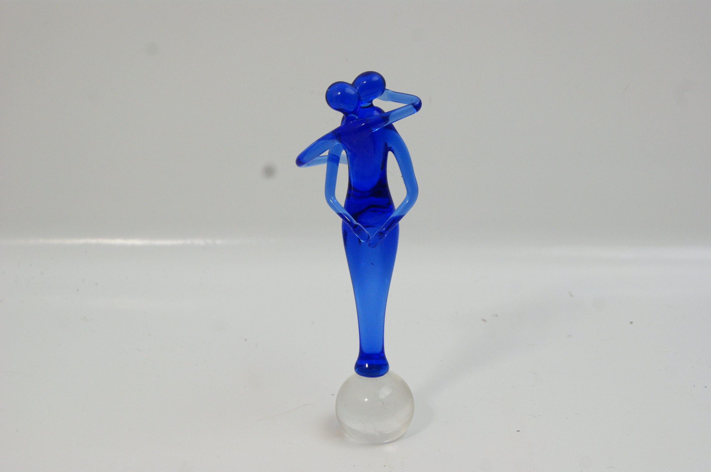 A Murano glass figurine depicting a couple in an embrace, known as the Sweet Lovers model. The minimalist design features two interlocking figures in a dance-like pose. The figurine is constructed from translucent cobalt blue glass and is mounted atop a clear glass spherical base with a polished flat underside for stability. No maker marks, letters, or signatures are present on the base or the body of the piece.