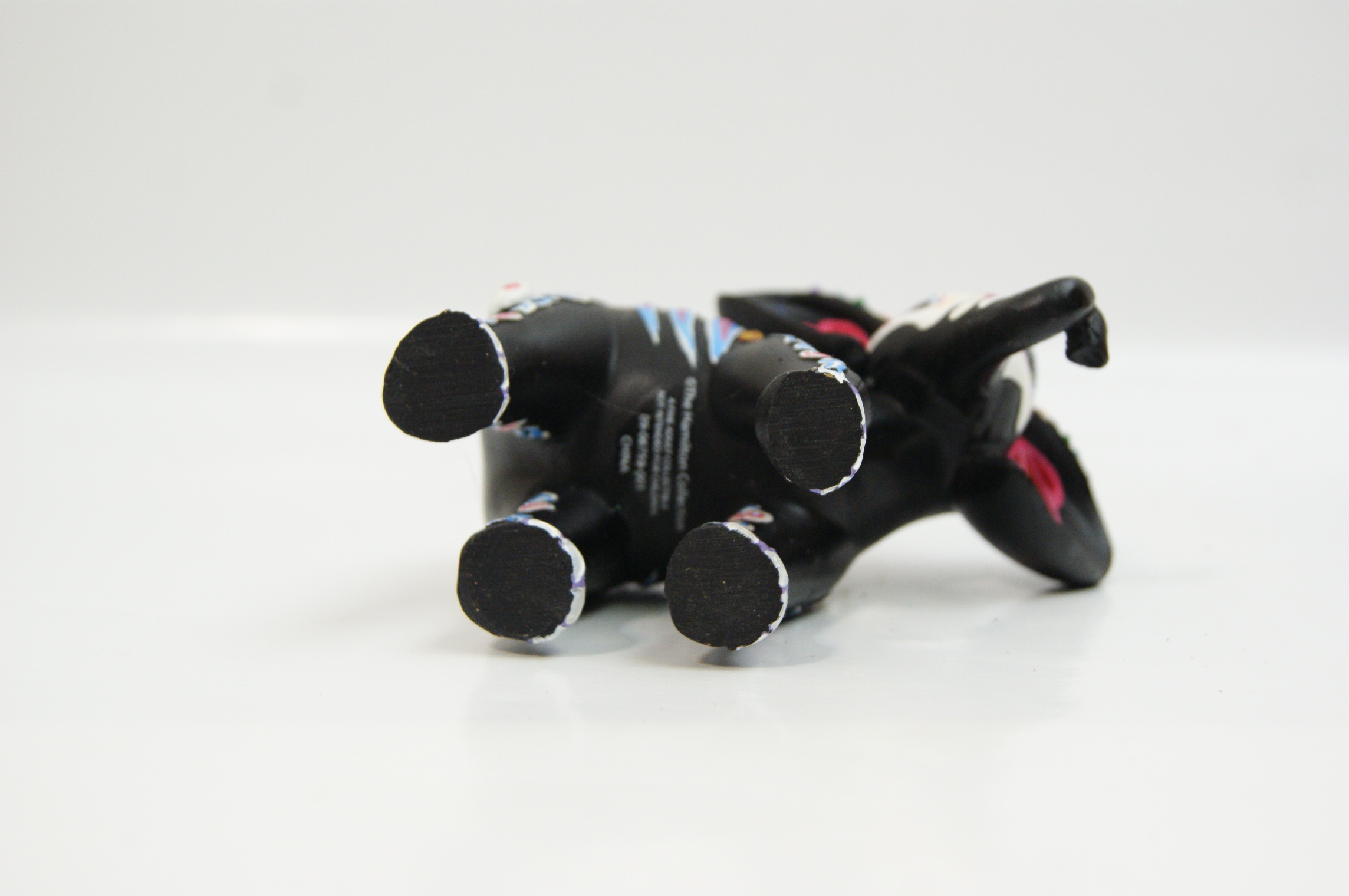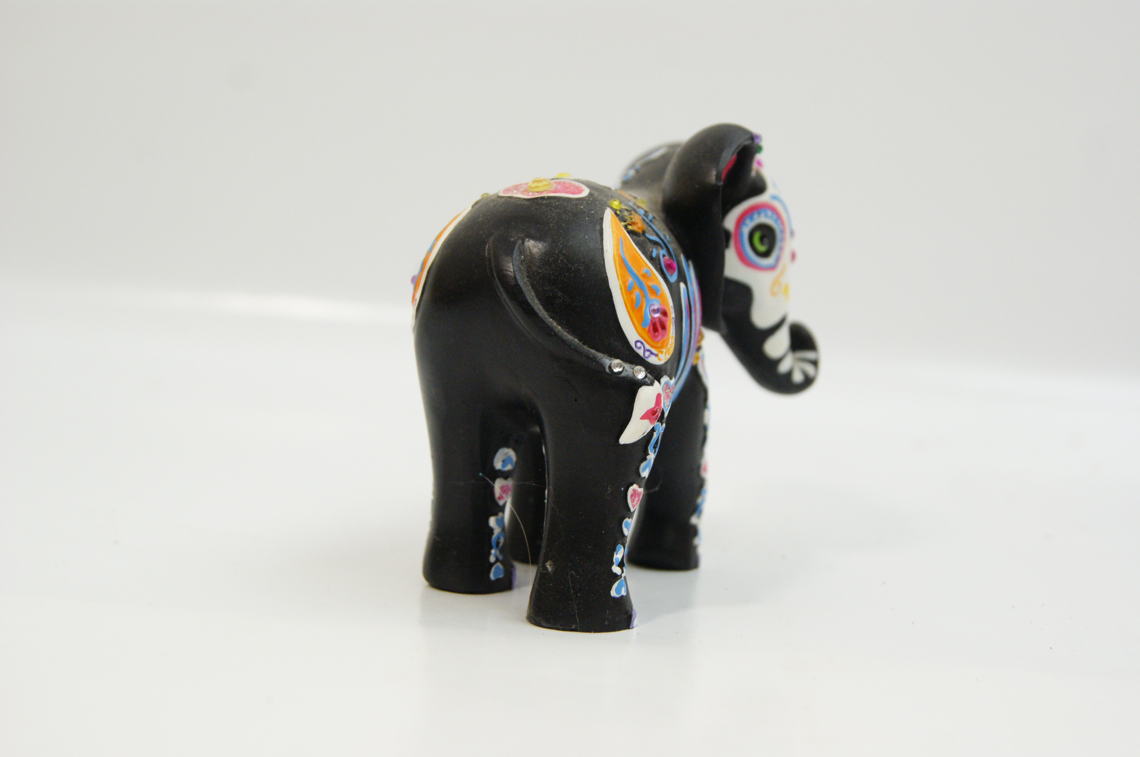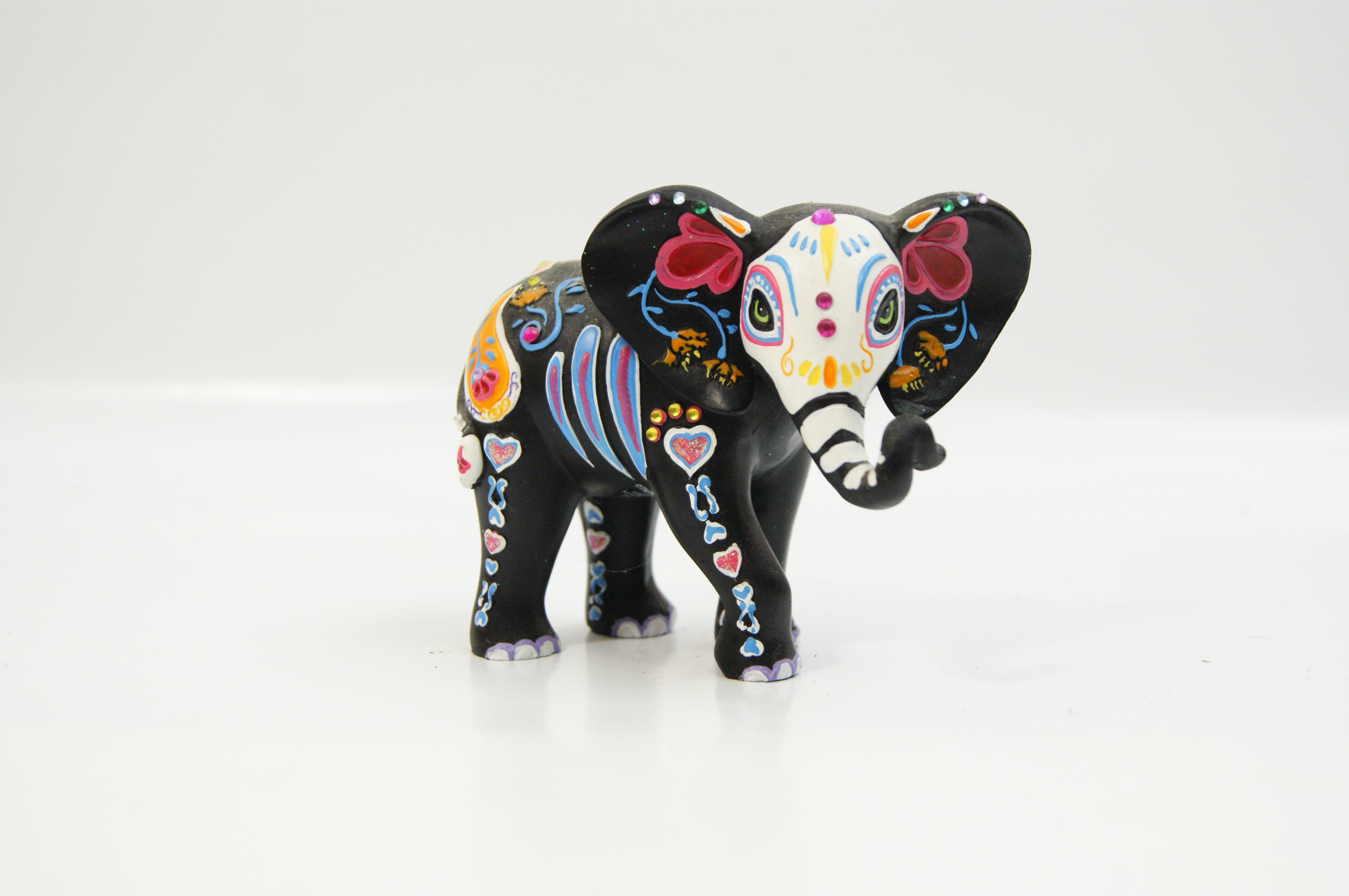 A contemporary decorative elephant figurine produced by The Hamilton Collection, titled A Love Never Forgotten as part of the Traditions of Strength series. The figure is constructed from cast resin with a matte black ground, featuring polychrome decoration inspired by Mexican Dia de los Muertos sugar skull motifs. The design includes a white patterned face with vibrant floral, heart, and scroll patterns in shades of blue, pink, orange, and yellow across the body and limbs. The figure is further embellished with small inset faux-gemstones on the ears and back. The base is printed with the following marks: © The Hamilton Collection, A LOVE NEVER FORGOTTEN, NOT A TOY FOR DECORATION ONLY, 09-08719-001, and CHINA.