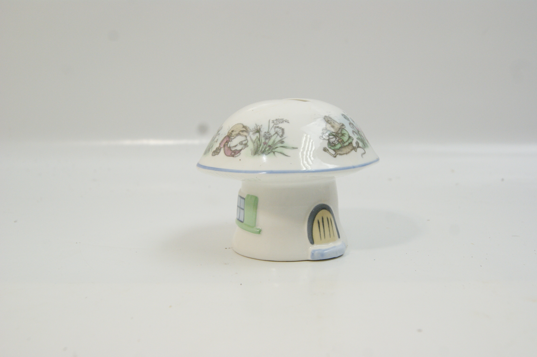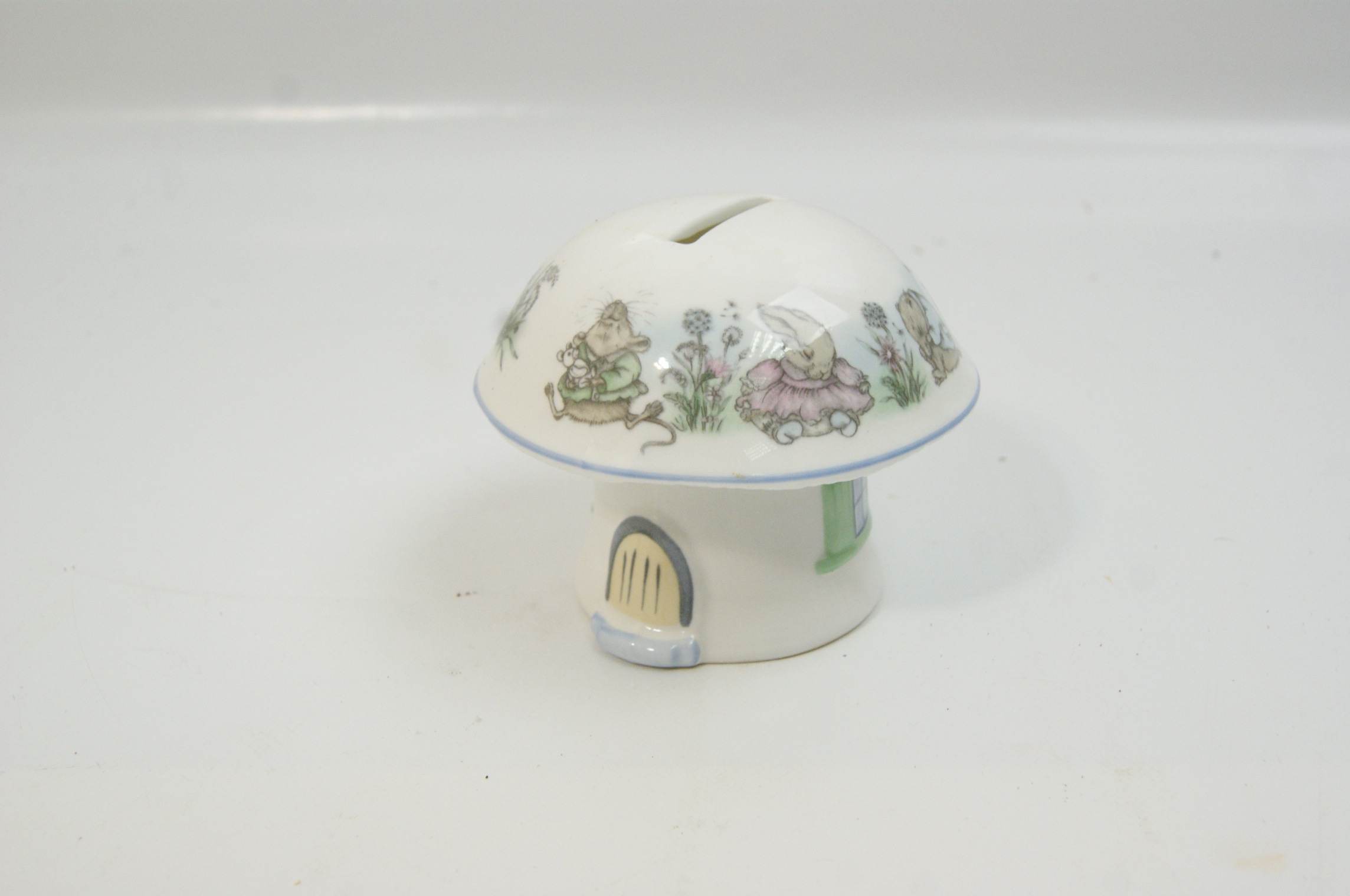 A glazed ceramic money box designed in the form of a toadstool cottage. The base is modelled as a white stalk featuring a moulded arched doorway with a yellow door and a window with green shutters. The mushroom cap serves as the vessel, featuring a coin slot at the apex and a pale blue line around the rim. The cap is decorated with transfer-printed illustrations of anthropomorphic mice in various rural scenes and attire, set amongst wildflowers and grasses. The style of illustration is characteristic of Jill Barklem’s Brambly Hedge series. No factory marks or signatures are visible on the exterior of the item; the base is not shown.