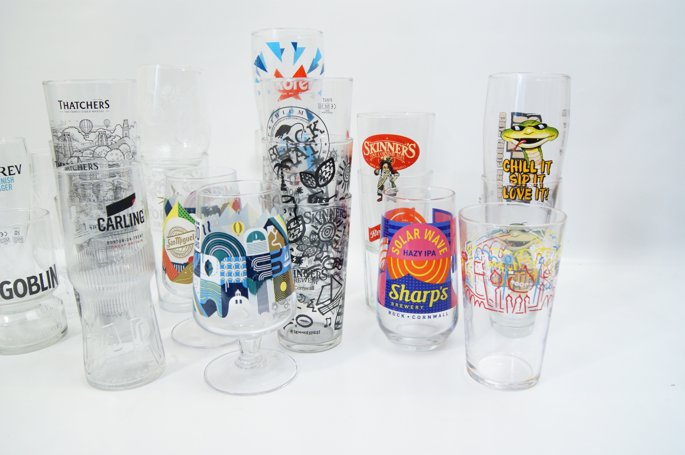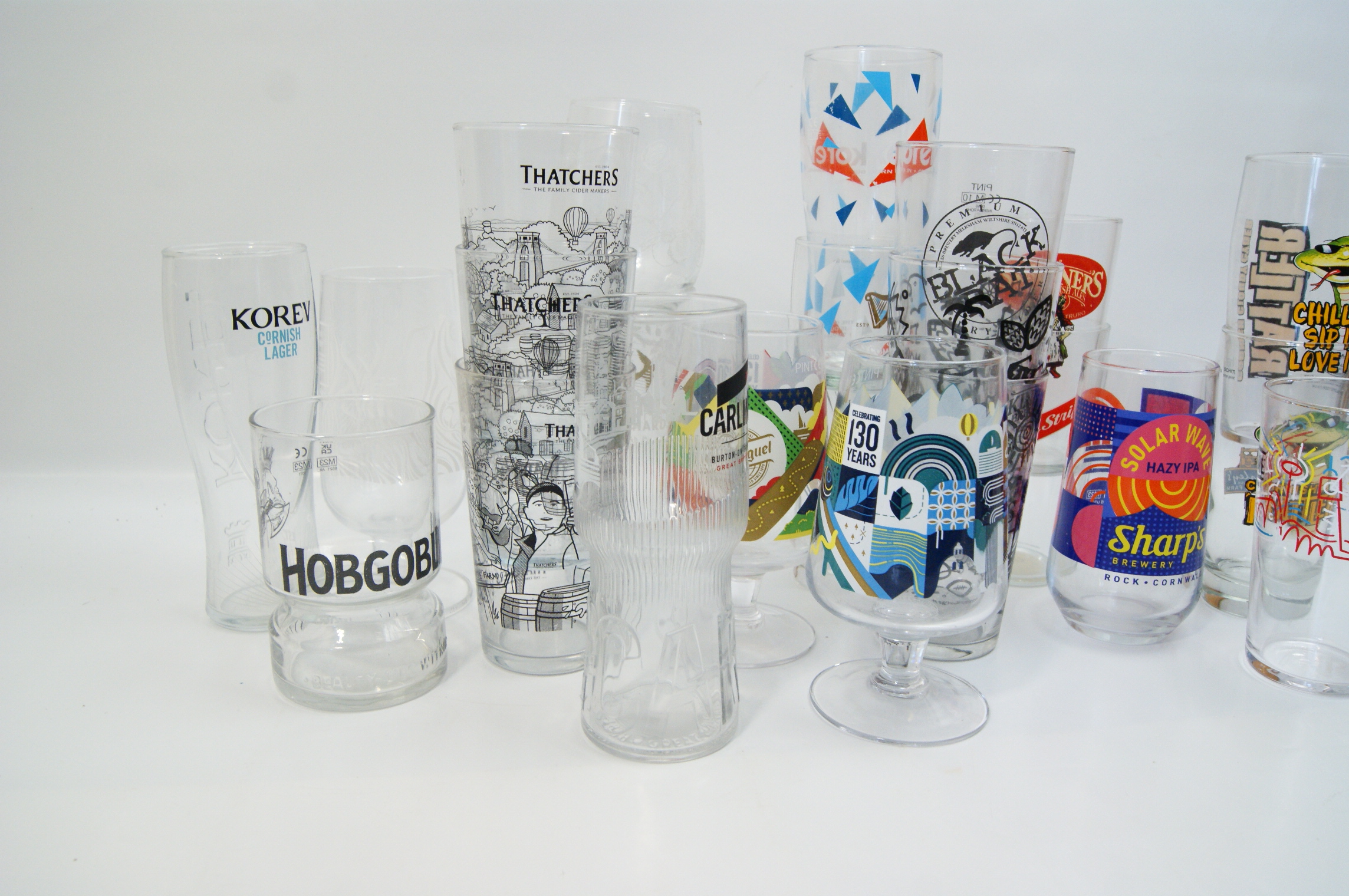 A collection of approximately eighteen contemporary beer and cider glasses with a focus on Cornish and West Country breweries. The lot features a variety of glass styles including pint and half-pint measures, tulip glasses, and stemmed chalices. Notable pieces include Thatchers Cider glasses decorated with monochrome line-art of Somerset landmarks such as the Clifton Suspension Bridge; a Sharp’s Brewery Solar Wave Hazy IPA glass with colourful graphics; and Skinner’s Brewery glasses featuring the Betty Stogs character and nautical illustrations. The collection also contains Healey’s Cornish Cyder Rattler glasses with the green snake mascot, St Austell Brewery Korev and 130-year anniversary glasses, Wychwood Brewery Hobgoblin, a ribbed Carling pint glass, a San Miguel chalice, and Black Sheep Brewery drinkware. Many pieces are marked with UK weights and measures including PINT, 1/2 PINT, and CE marks such as M12 and M19. All items are constructed of glass.