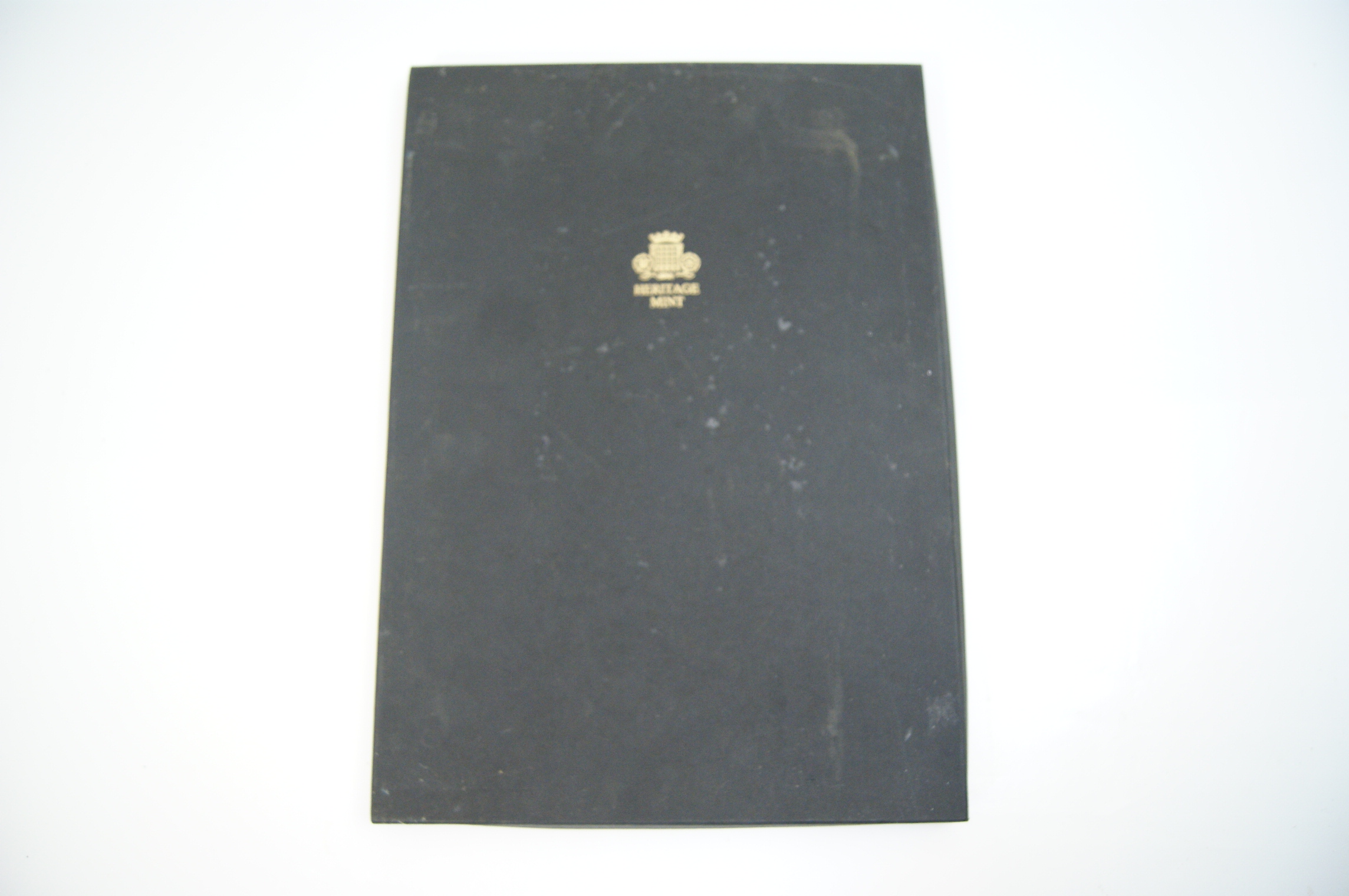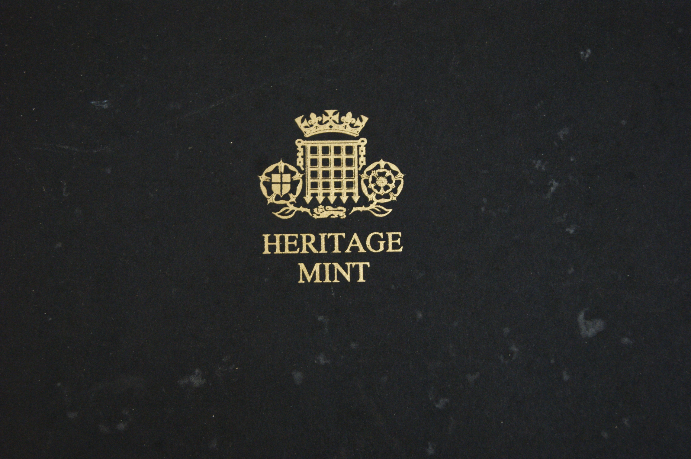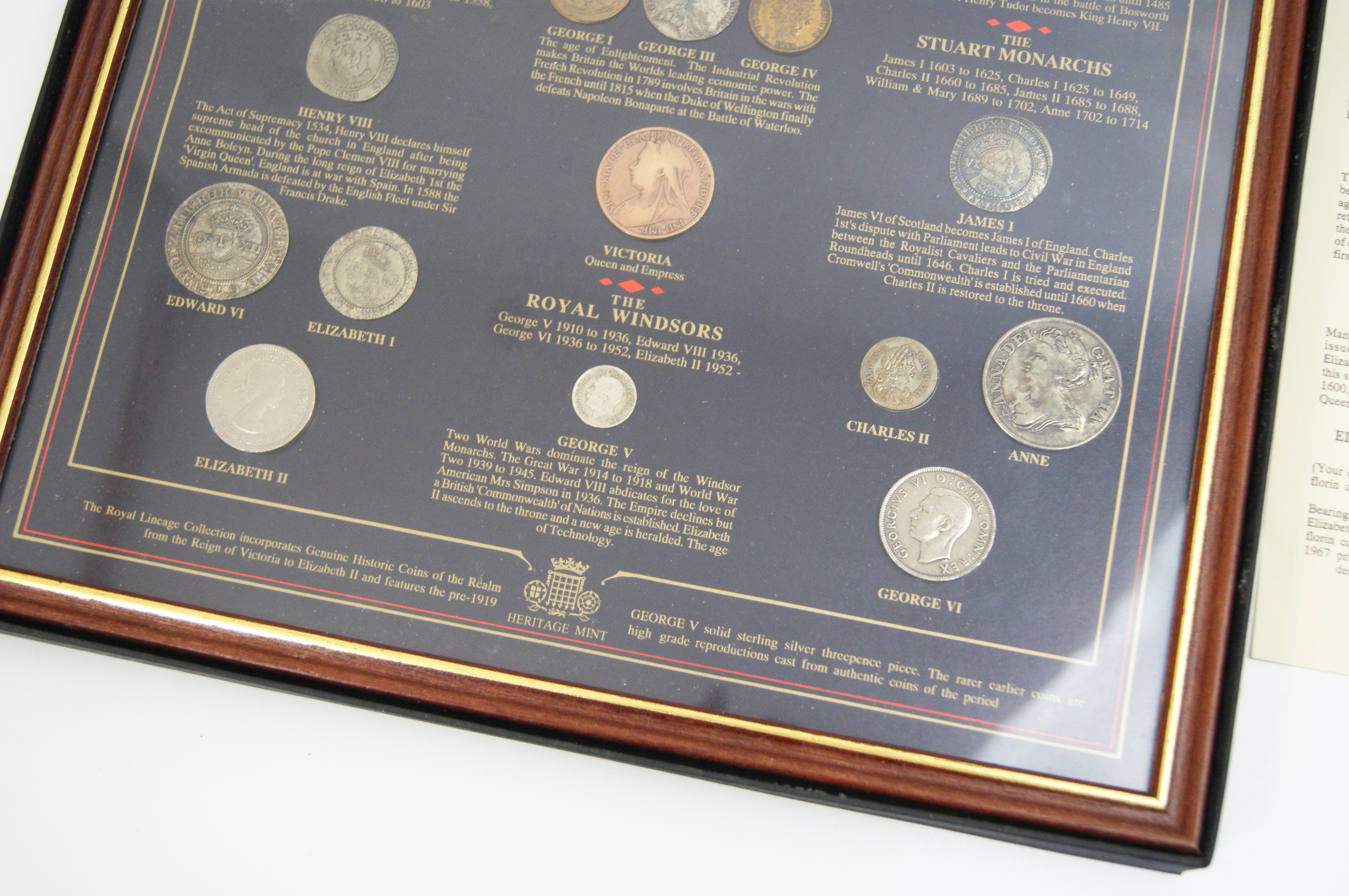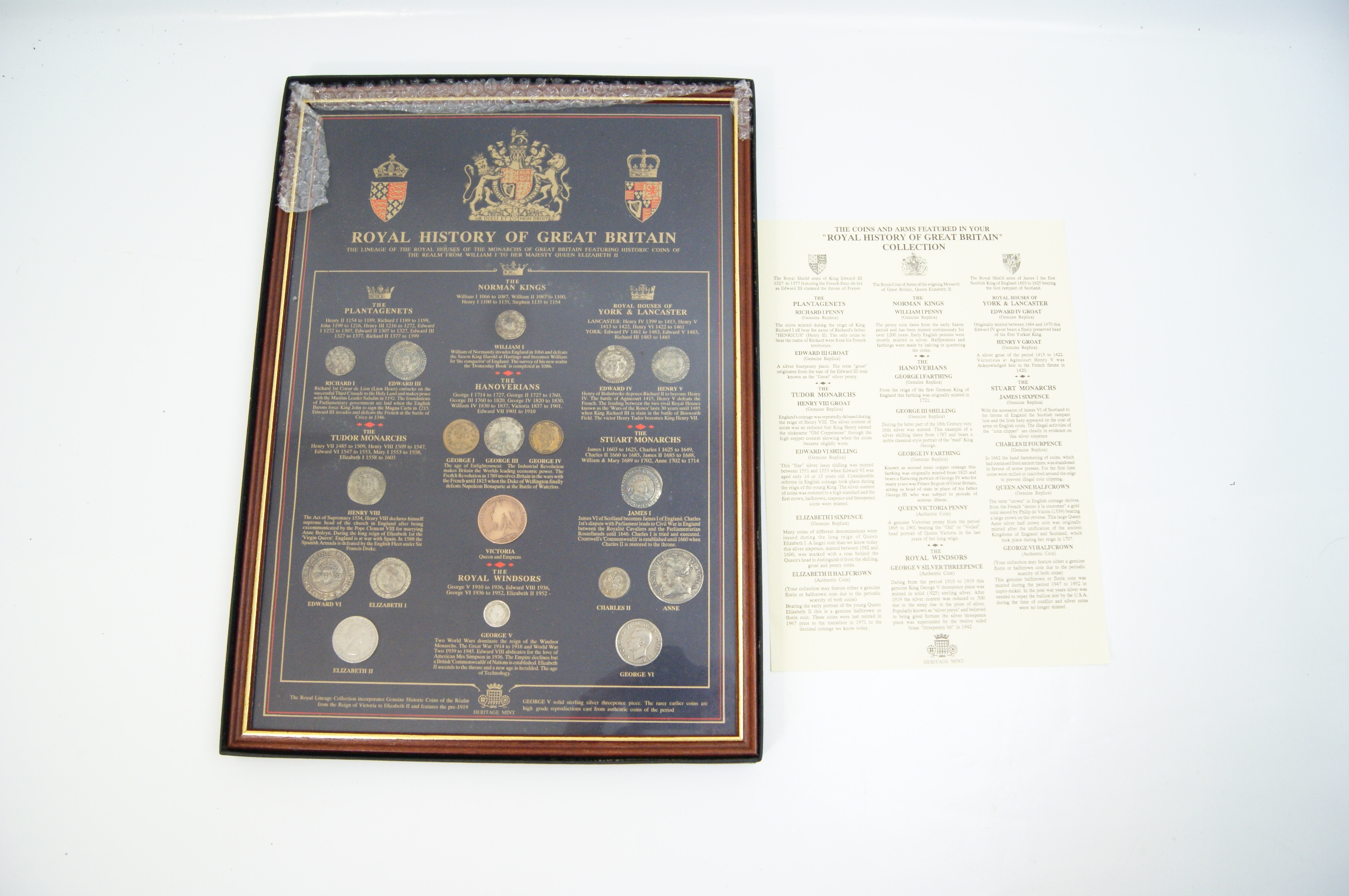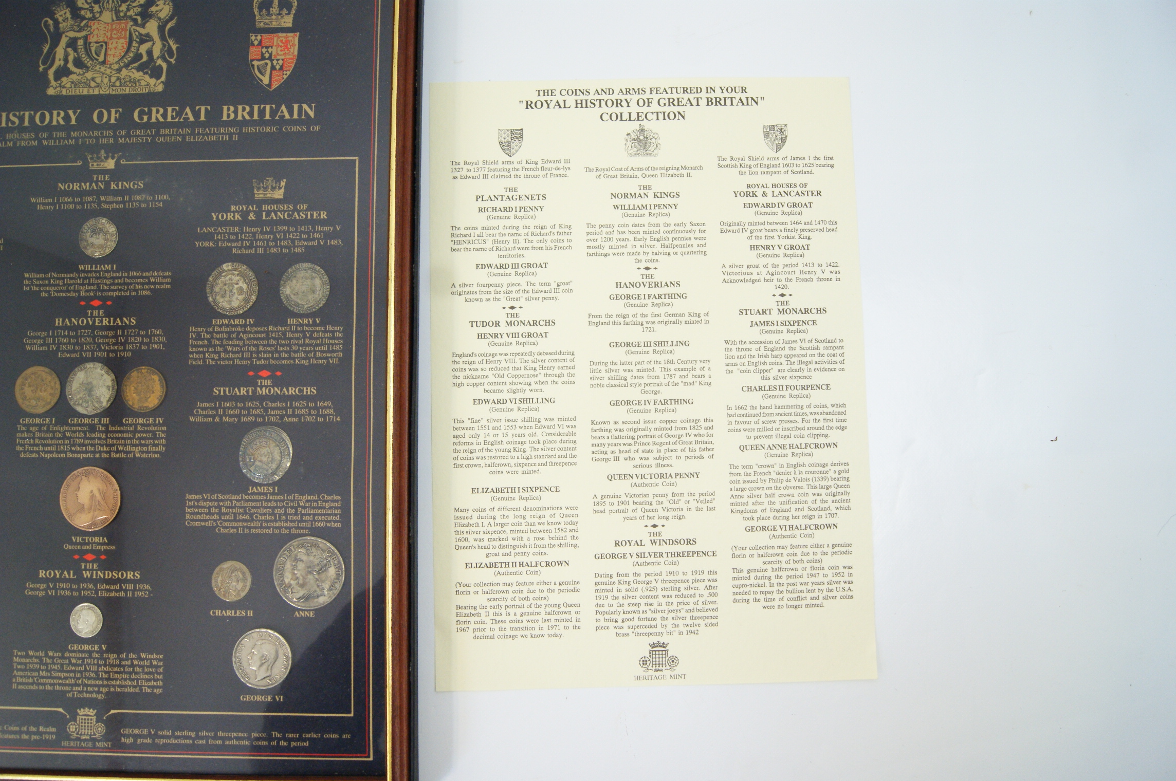 This framed numismatic collection, titled Royal History of Great Britain and issued by Heritage Mint, contains a selection of British coins and reproductions arranged by royal lineage from William I to Elizabeth II. The display incorporates authentic historic coins from the reigns of Queen Victoria to Queen Elizabeth II alongside cast reproductions for earlier periods. Authentic specimens include a bronze Queen Victoria penny featuring the veiled head portrait, a King George V silver threepence minted prior to 1919, and cupro-nickel denominations for King George VI and Queen Elizabeth II. The reproduction pieces represent the Norman, Plantagenet, Tudor, Stuart, and early Hanoverian houses, appearing as silver and copper-coloured casts of historic hammered and early milled coinage. The collection is mounted on a blue card with gold-toned inscriptions and heraldic symbols, housed in a dark wood-effect frame with a gilt inner slip. The lot is accompanied by an original information leaflet titled The Coins and Arms Featured in your Royal History of Great Britain Collection. The reverse of the frame bears the gilt-stamped mark of Heritage Mint beneath a portcullis and rose crest.