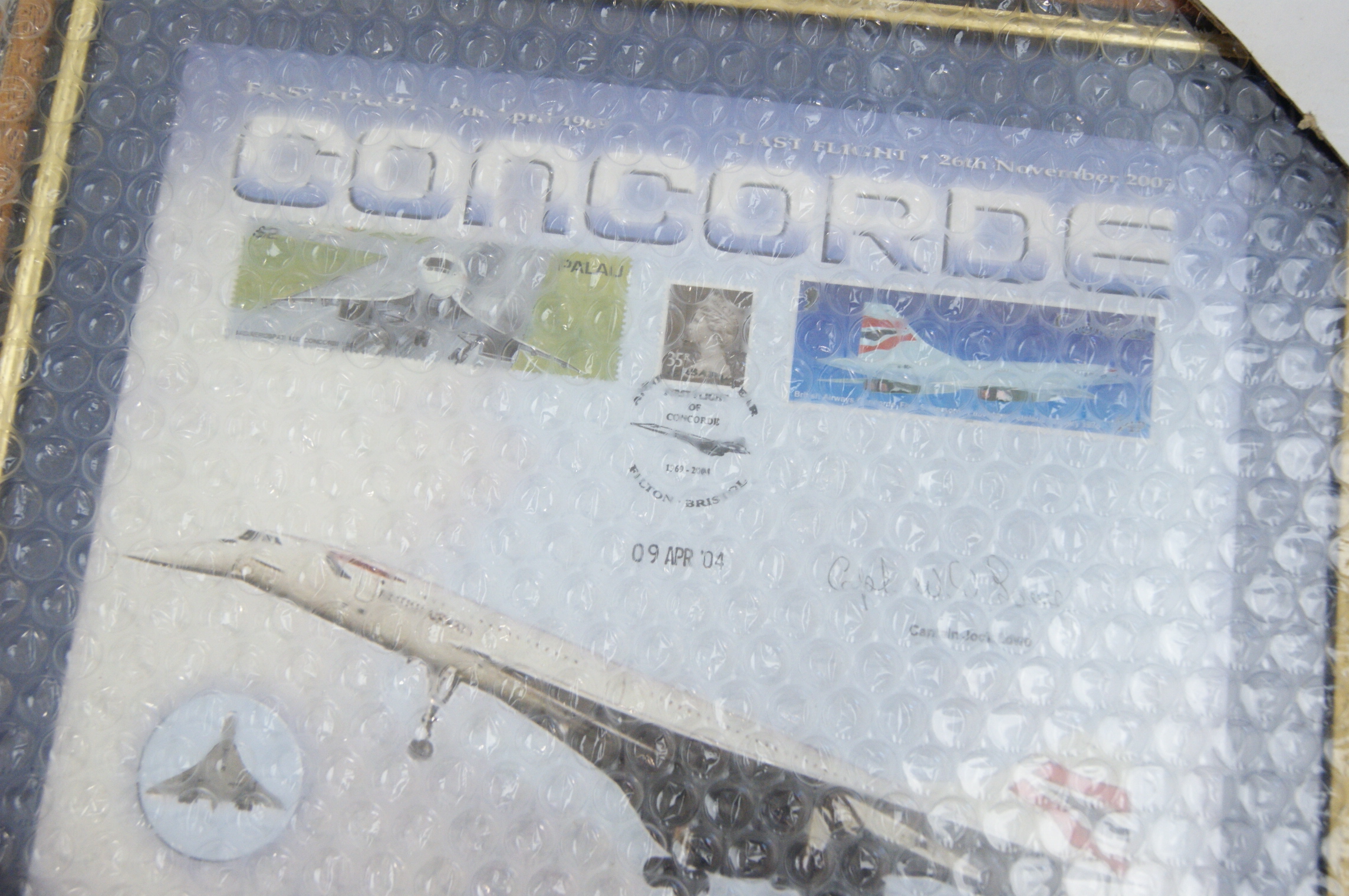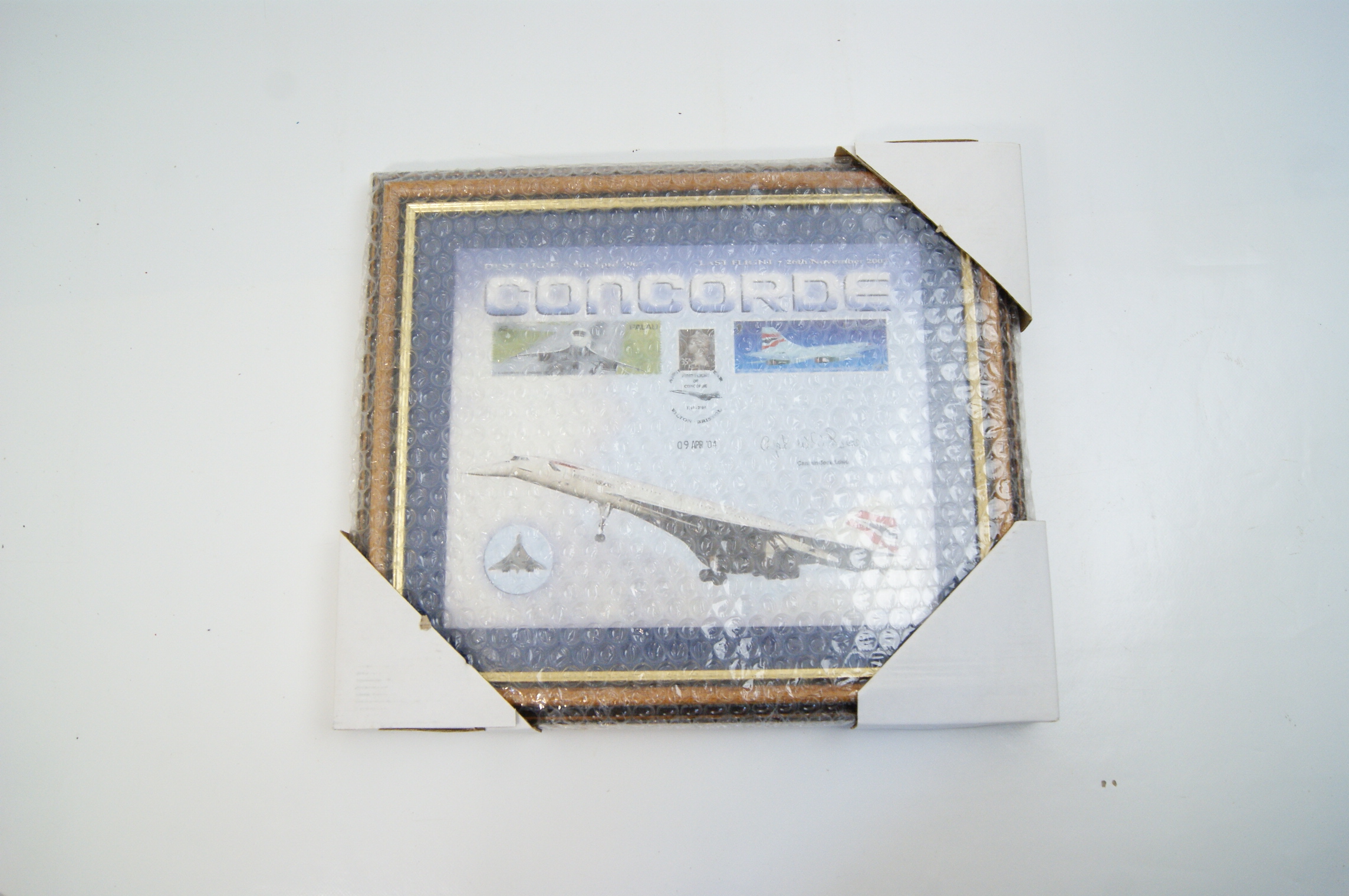 A Concorde Signature Edition commemorative philatelic display produced by The Westminster Collection. The piece features a central graphic of the aircraft under the title CONCORDE, flanked by the dates of its first flight (2nd March 1969) and final flight (26th November 2003). The display incorporates multiple commemorative postage stamps, including a Palau issue and a British stamp cancelled with a special 35th Anniversary First Flight of Concorde pictorial postmark from Filton, Bristol, dated 09 APR ’04. The display is hand-signed in black ink by Captain Jock Lowe, former Chief Pilot for the British Airways Concorde fleet. The arrangement is set within a deep blue mount and housed in a gilt-edged wood-effect frame.