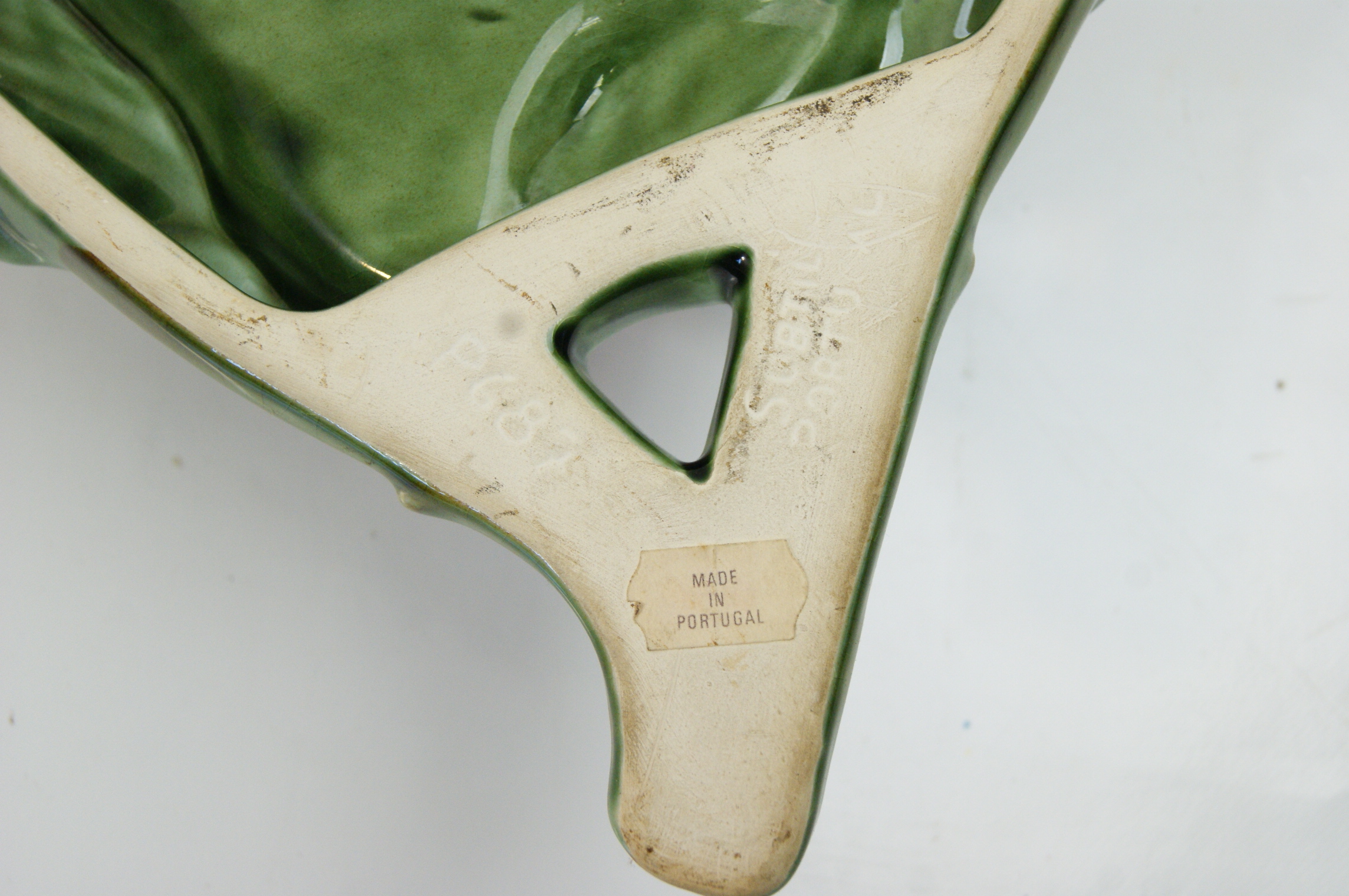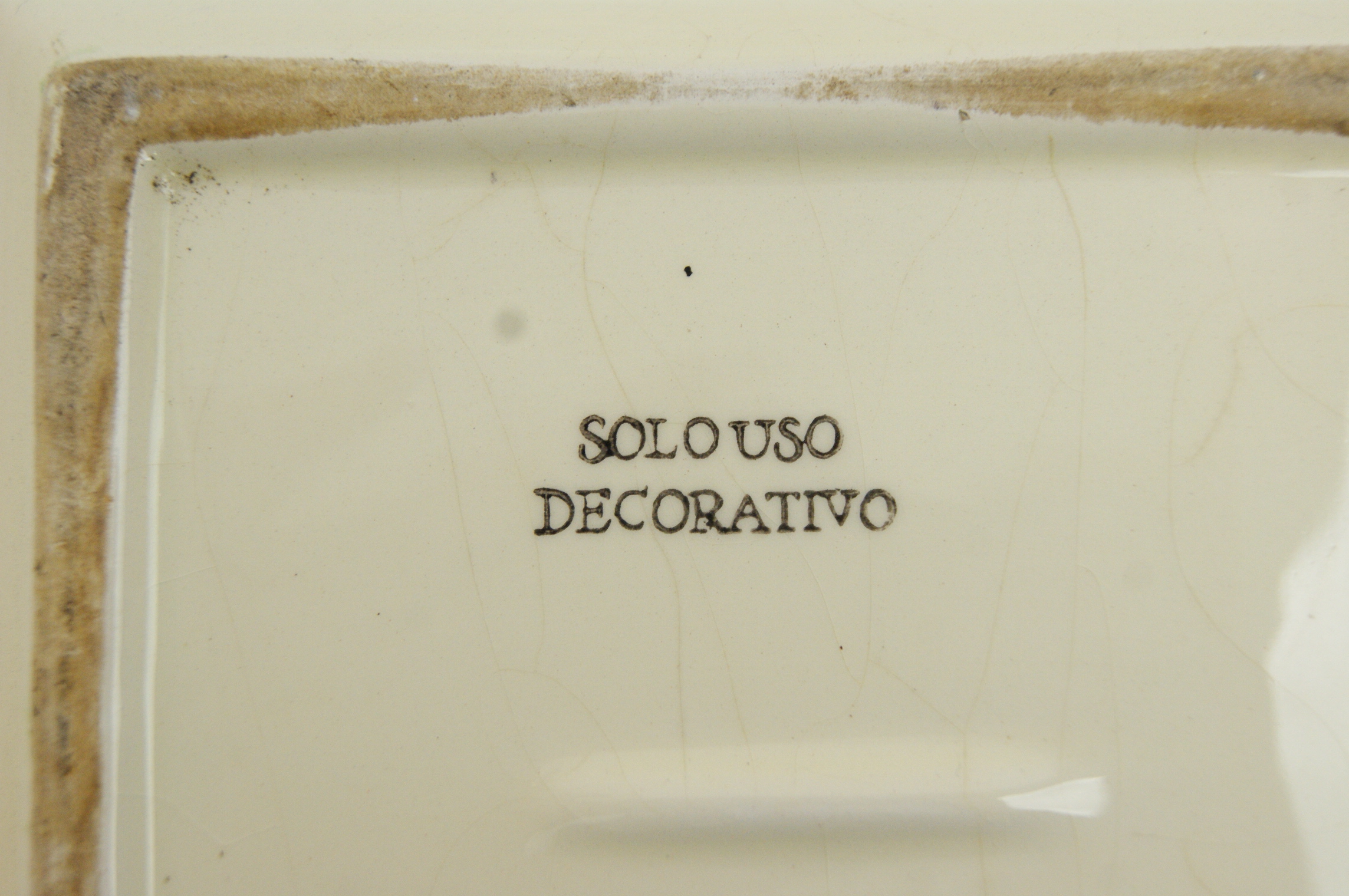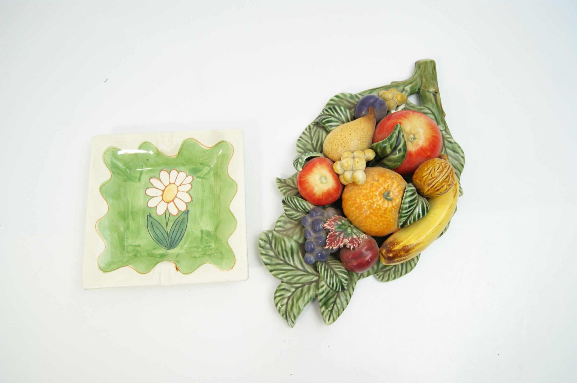 A lot comprising two decorative ceramic pieces. The first is a square glazed earthenware dish featuring a scalloped inner rim and notched corners, decorated with a central daisy motif on a lime green ground with a cream-coloured border. The reverse is stamped in black uppercase letters SOLO USO DECORATIVO. The second item is a high-relief majolica style wall plaque or ornament modelled as a dense cluster of various fruits, including apples, a pear, an orange, grapes, a banana, and a walnut, all resting upon a large green leaf base. This piece is finished in bright multi-coloured glazes. The reverse of the plaque bears incised marks P 6 8 7 and PORTUGAL, with a further faint incised word above. A small paper label is also adhered to the reverse printed MADE IN PORTUGAL.