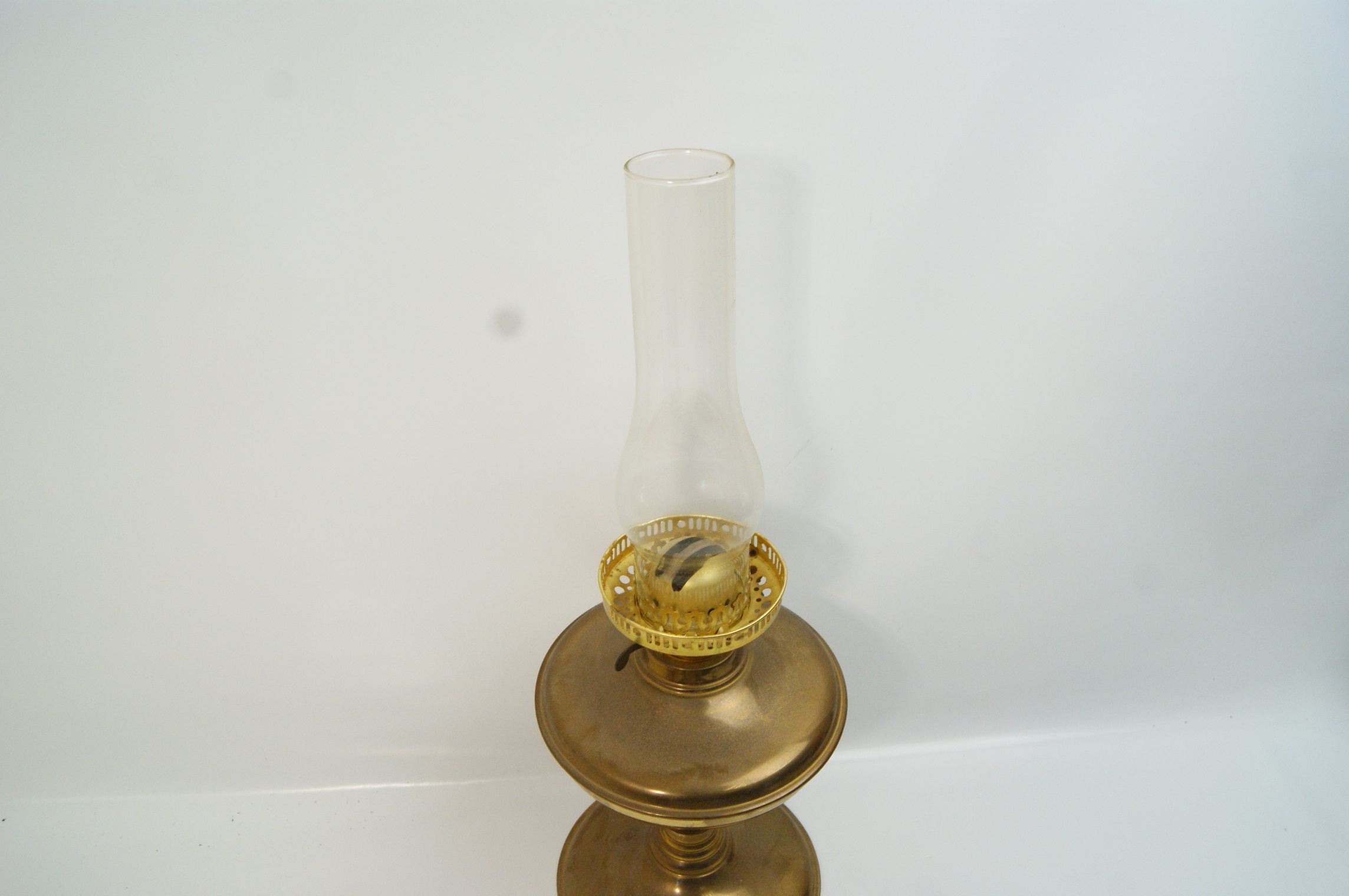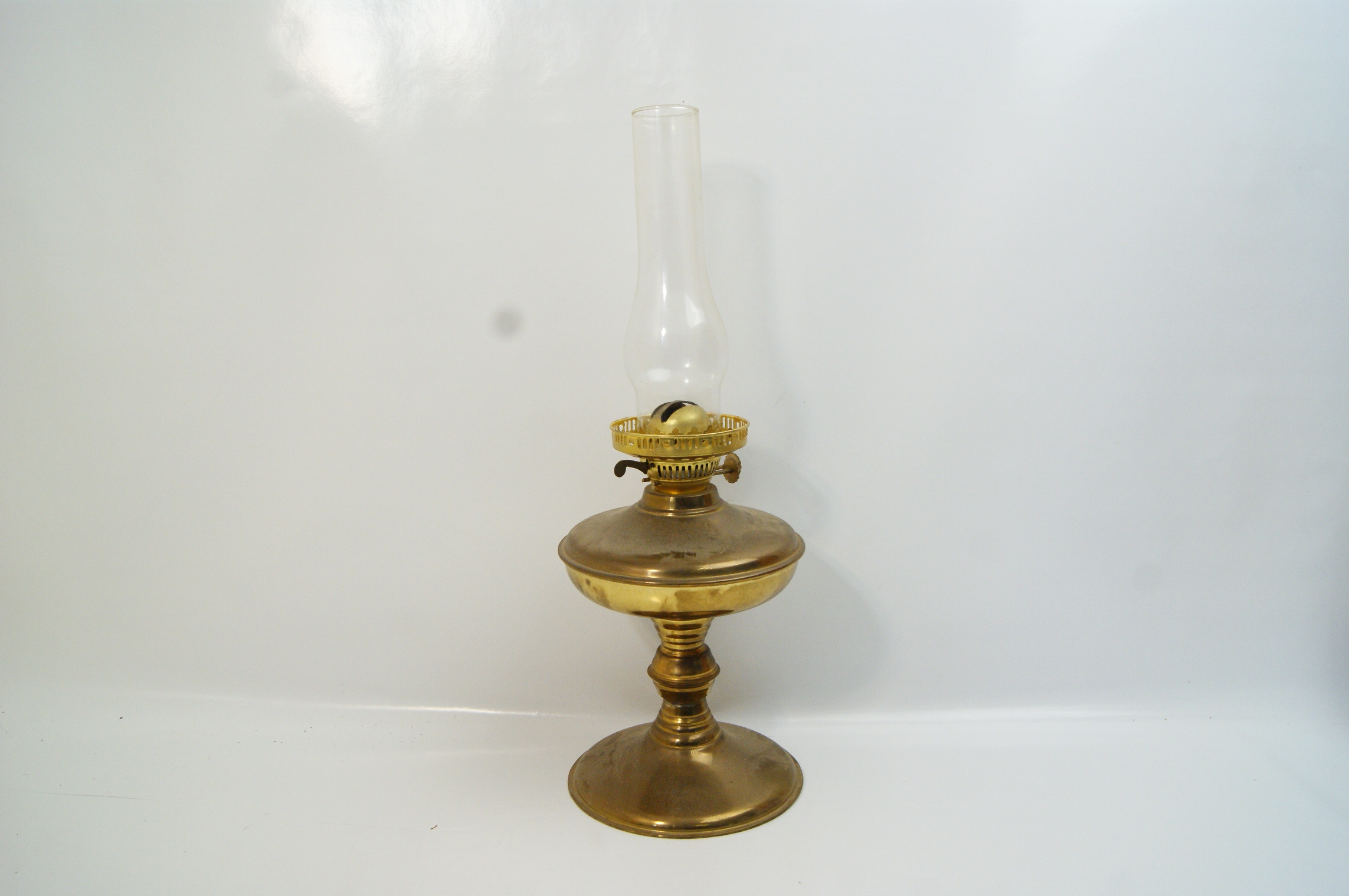 A late 19th or early 20th-century table-top oil or paraffin lamp. The item is constructed from brass-finished metal with a rounded font and a pedestal base on a circular foot. It is fitted with a clear glass chimney. The burner assembly includes a perforated gallery designed to hold a secondary outer glass shade, which is missing. Stamped characters are present on the circular face of the wick-adjustment knob, though they are not clearly legible. The design and form are consistent with lamps produced by manufacturers such as Lempereur and Bernard. The lamp remains in its original non-electric state.