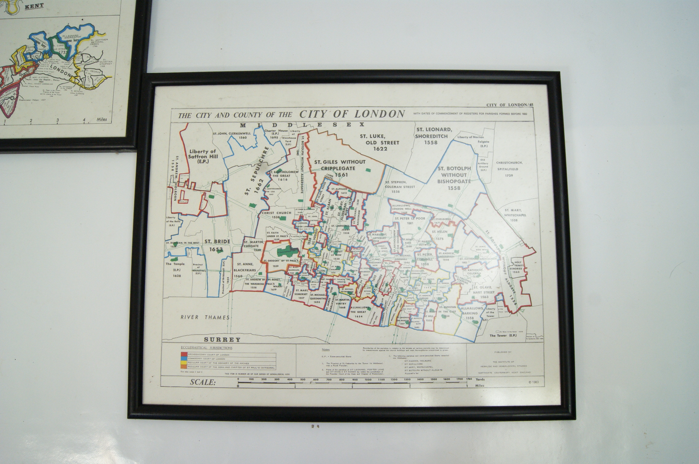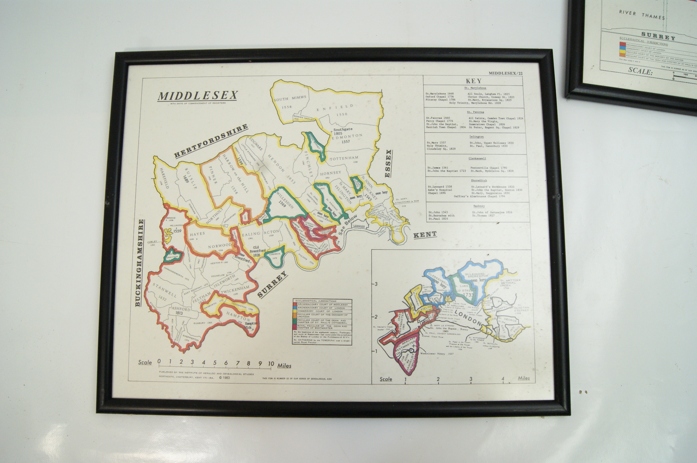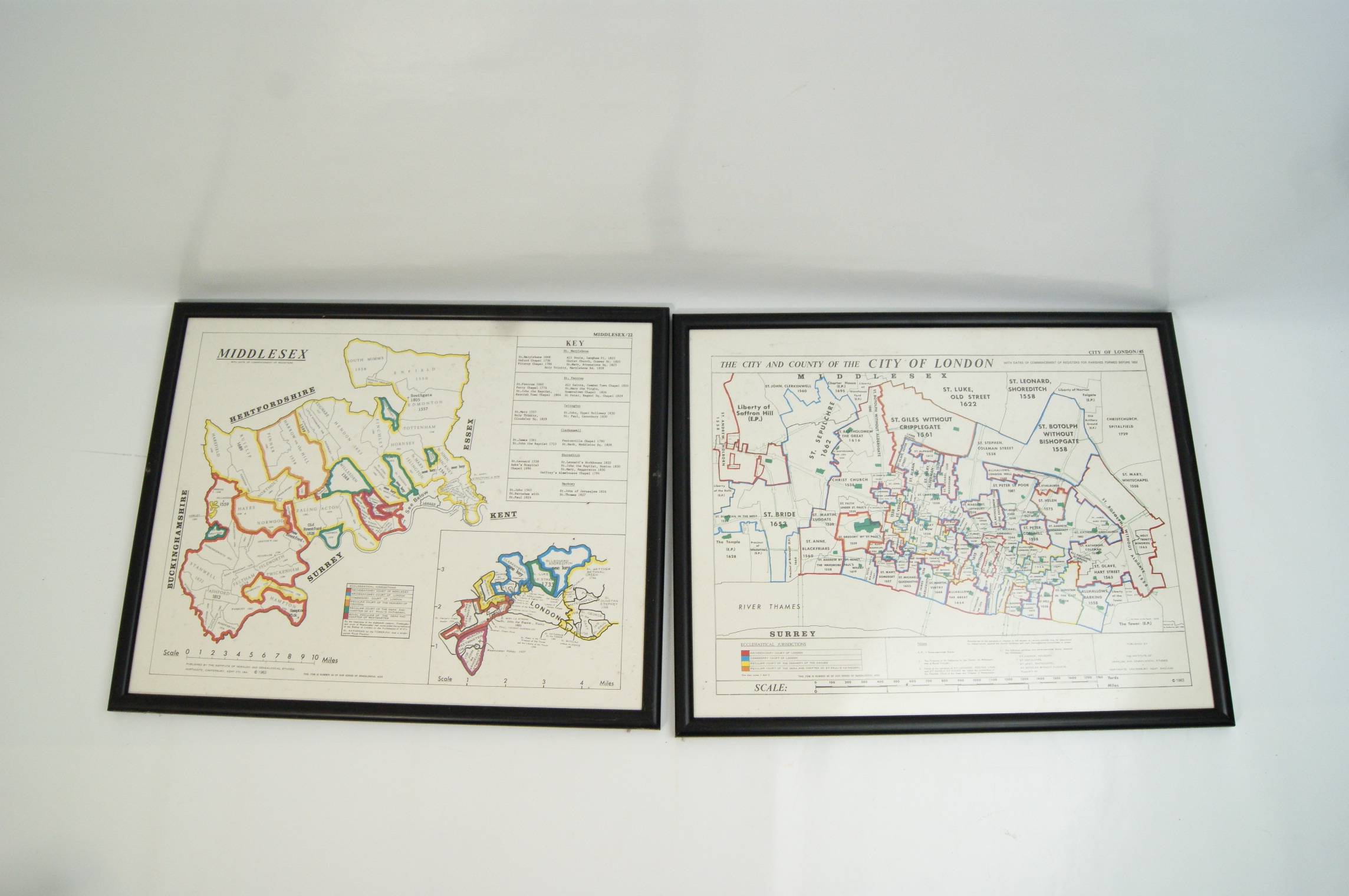 A pair of framed genealogical maps on paper, titled Middlesex and The City and County of the City of London, published in 1983. The maps are printed in colour and serve as genealogical aids, detailing parish boundaries and dates for the commencement of registers for parishes formed before 1832. The Middlesex map, noted as number 22 in a series, includes an inset of London and a key for ecclesiastical jurisdictions. The second map, noted as number 45, provides a detailed layout of the parishes within the City of London. Both prints bear the publication imprint at the lower edge: PUBLISHED BY THE INSTITUTE OF HERALDIC AND GENEALOGICAL STUDIES NORTHGATE, CANTERBURY, KENT ENGLAND and are dated (c) 1983. The works are housed in matching simple black wooden or composite frames under glass.