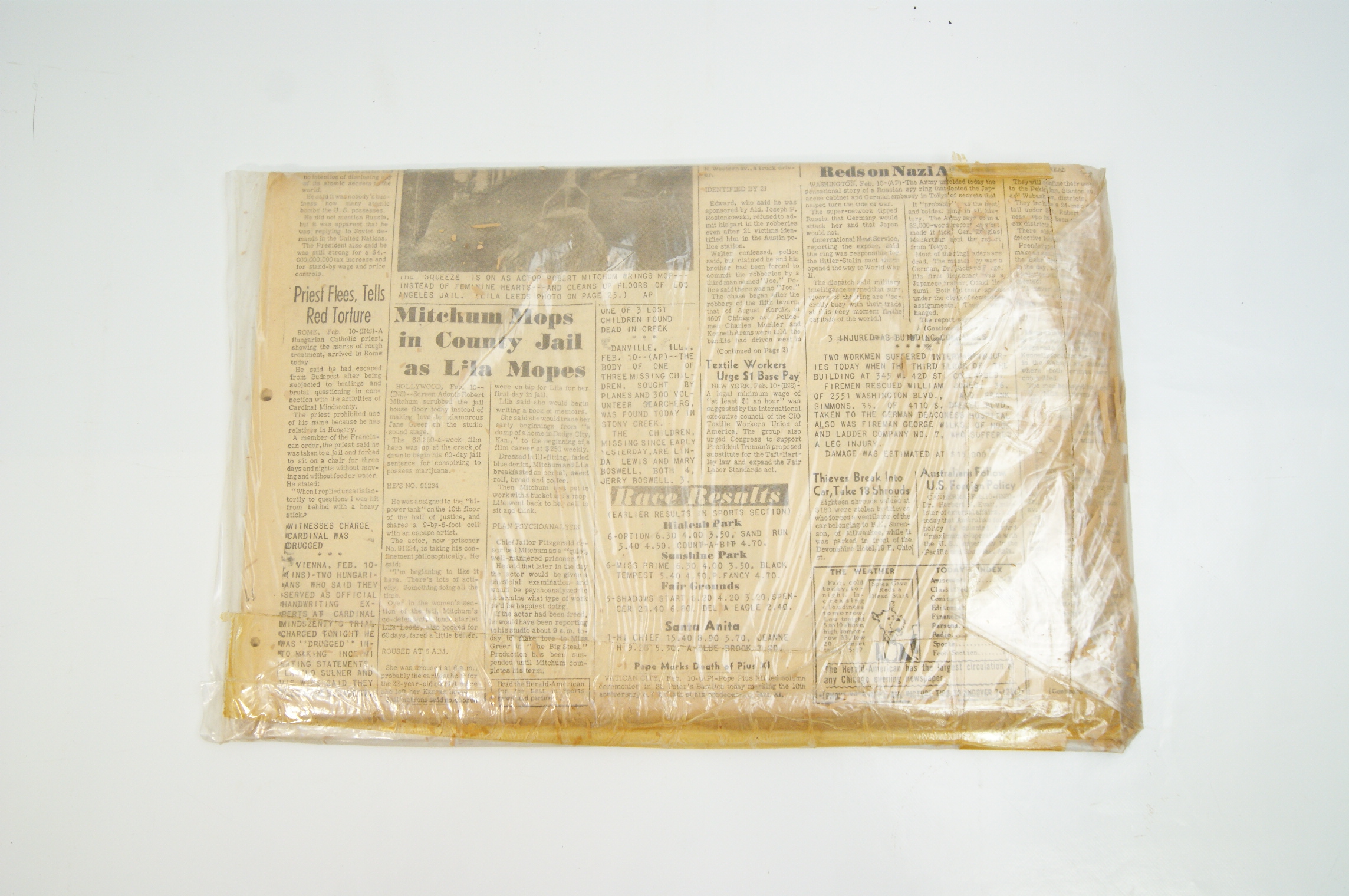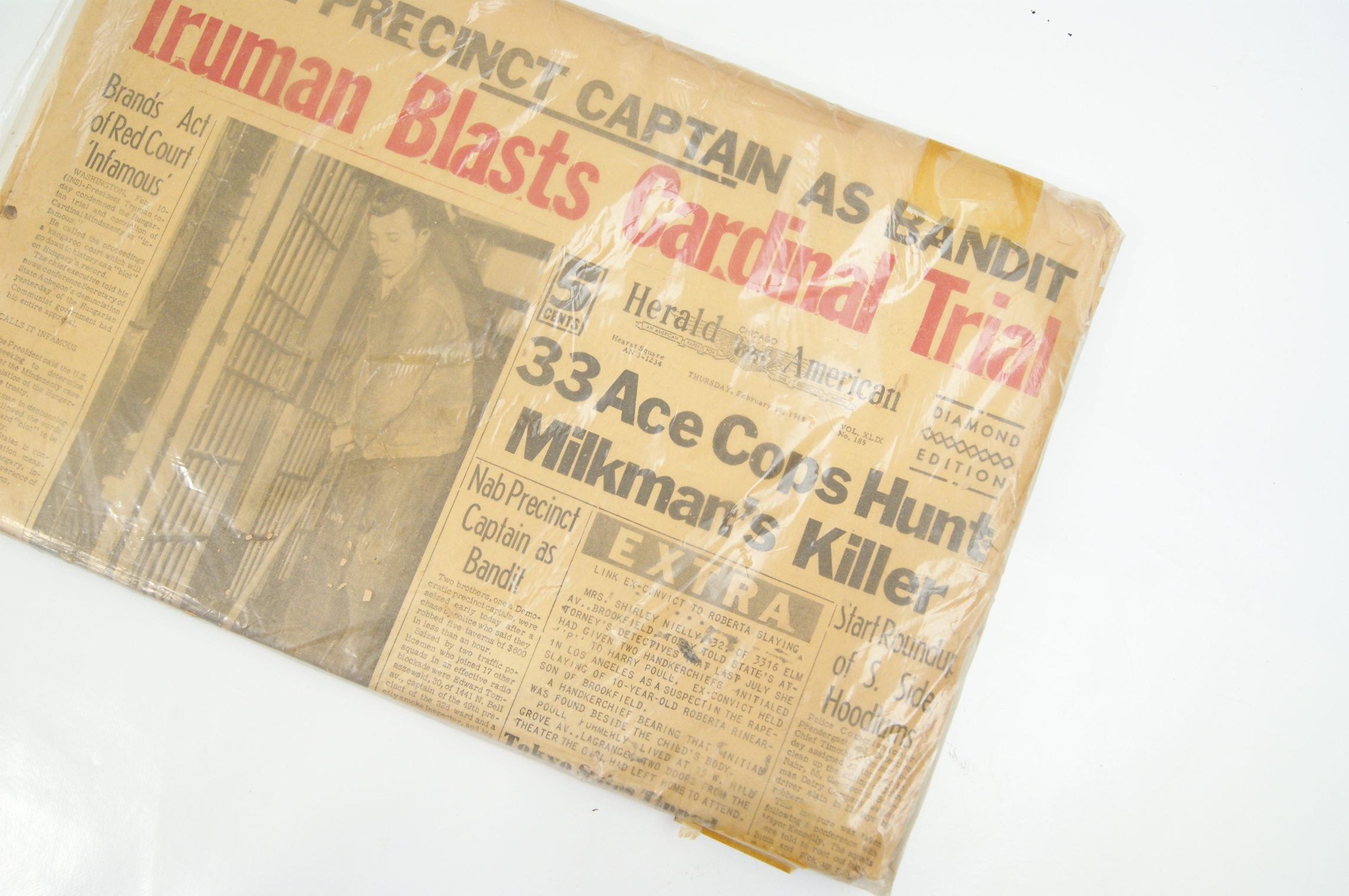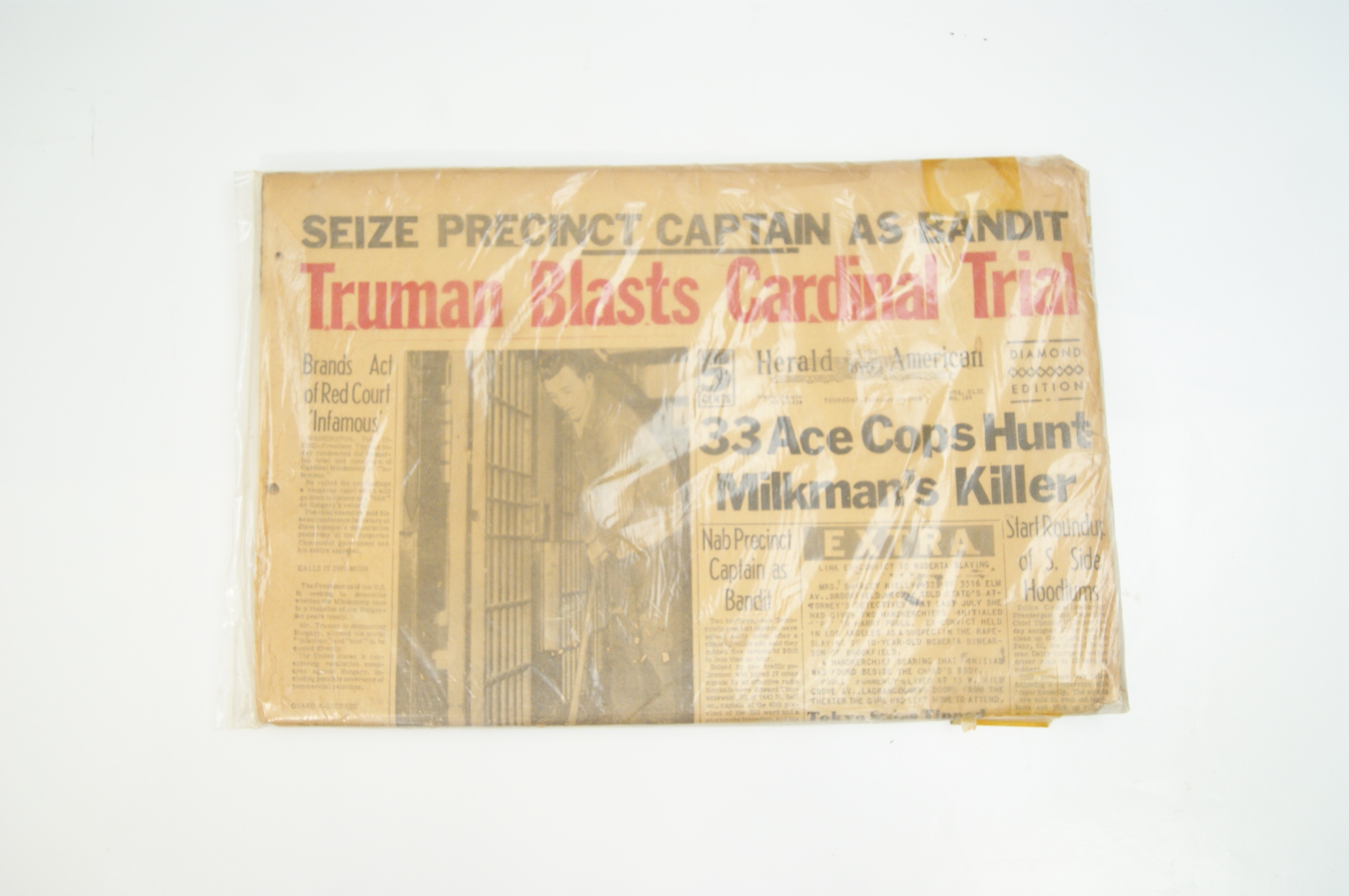 An original broadsheet edition of the Chicago Herald-American newspaper, dated Thursday, 10 February 1949. This Diamond Edition features a prominent two-colour front-page layout with the primary headline Truman Blasts Cardinal Trial printed in bold red ink, reporting on President Truman’s condemnation of the trial of Cardinal Mindszenty in Hungary. Other lead stories on the front page include SEIZE PRECINCT CAPTAIN AS BANDIT, 33 Ace Cops Hunt Milkman’s Killer, and Start Roundup of S. Side Hoodlums. The reverse side, page 3, contains a contemporary celebrity news report titled Mitchum Mops in County Jail as Lila Mopes, concerning the incarceration of actor Robert Mitchum following a marijuana-related conviction. The masthead identifies the publication as An American Paper for the American People, published at Hearst Square.